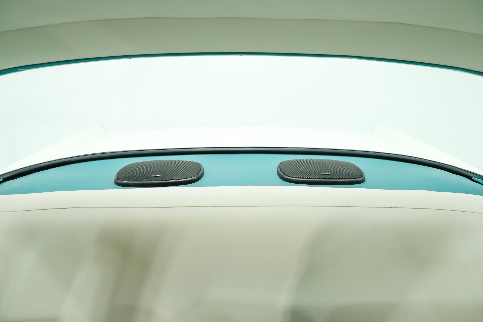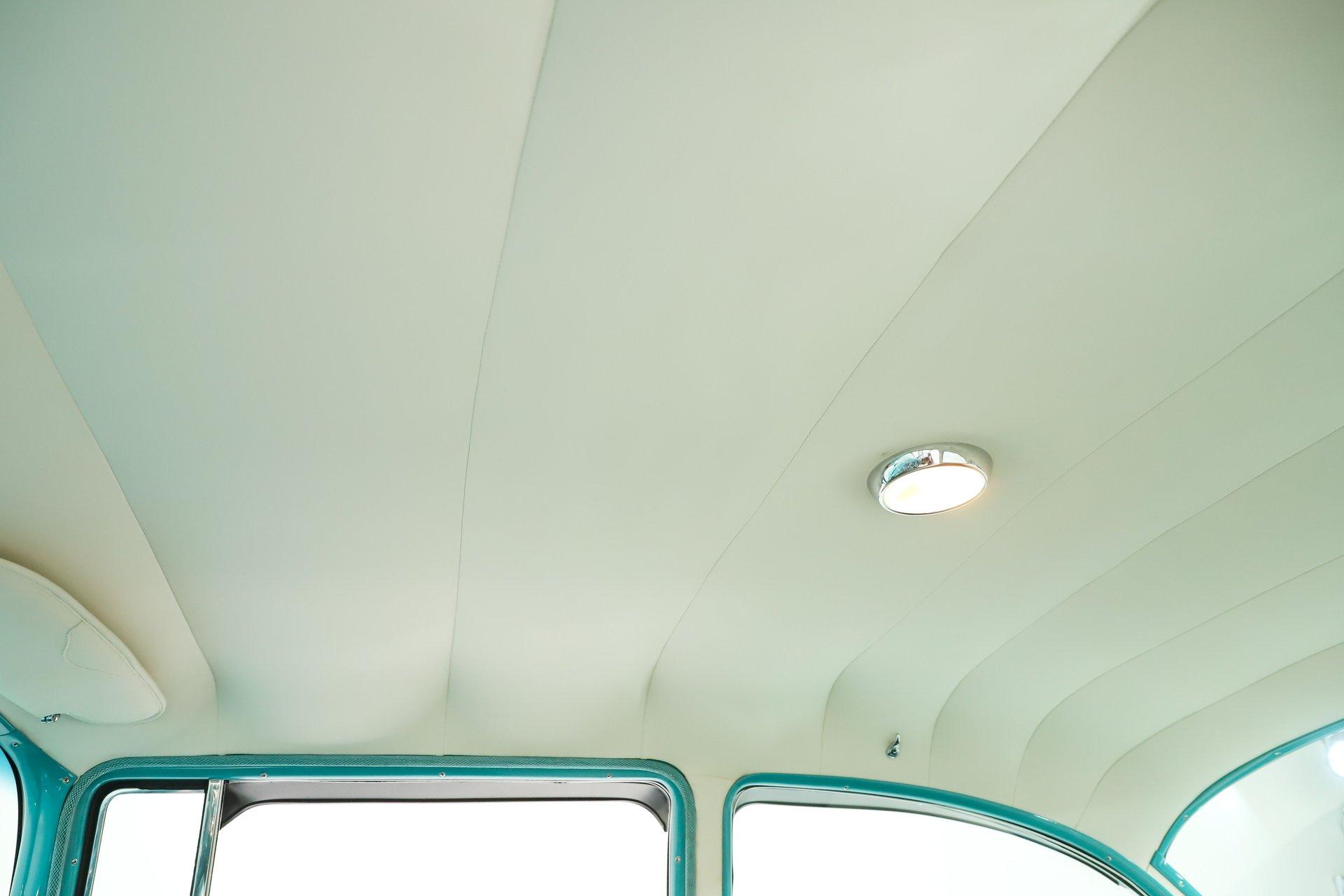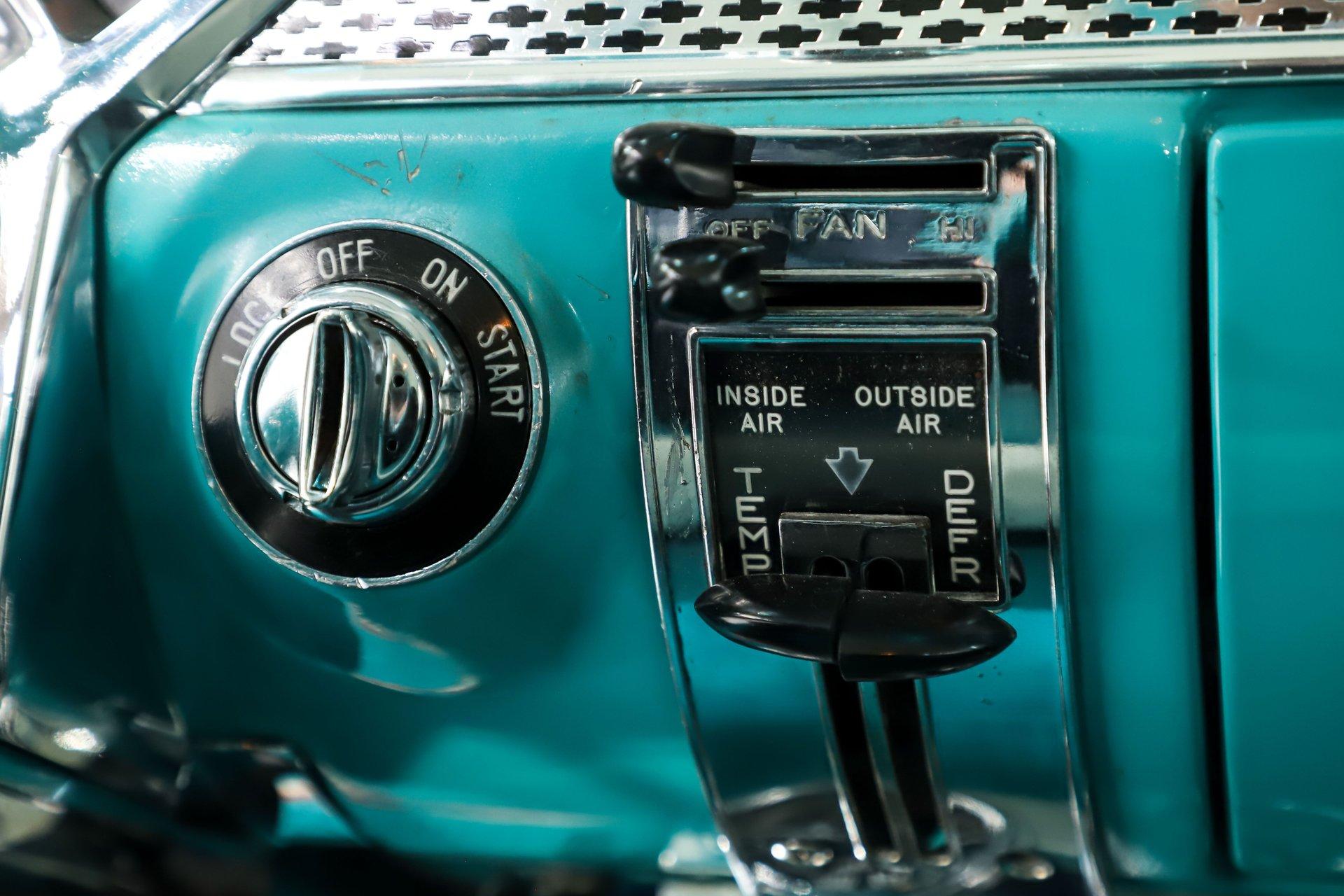 INTERIOR: The same refreshing colors inside and it's vintage charm was preserved although there are some nice modern touches. It's really immaculate inside! It has a full reproduction interior including the door panels, window cranks, handles etc. The seats were recushioned and reupholstered. Down on the floor it has the correct tight weave carpet with reproduction mats. Up above, the headliner and visors are in excellent shape. All the metal trim is painted like the outside of the car, the gauges, knobs and all the dash trim is beautiful. A few updates would be the original looking steering wheel is actually a smaller diameter which makes it easier to get in and out, the shift indicator has been updated to a three speed automatic and that's a retro stereo in the dash with two 6x9 speakers in back. The air conditioning was actually incorporated into the original style heater control panel and the vents are neatly installed under the dash.