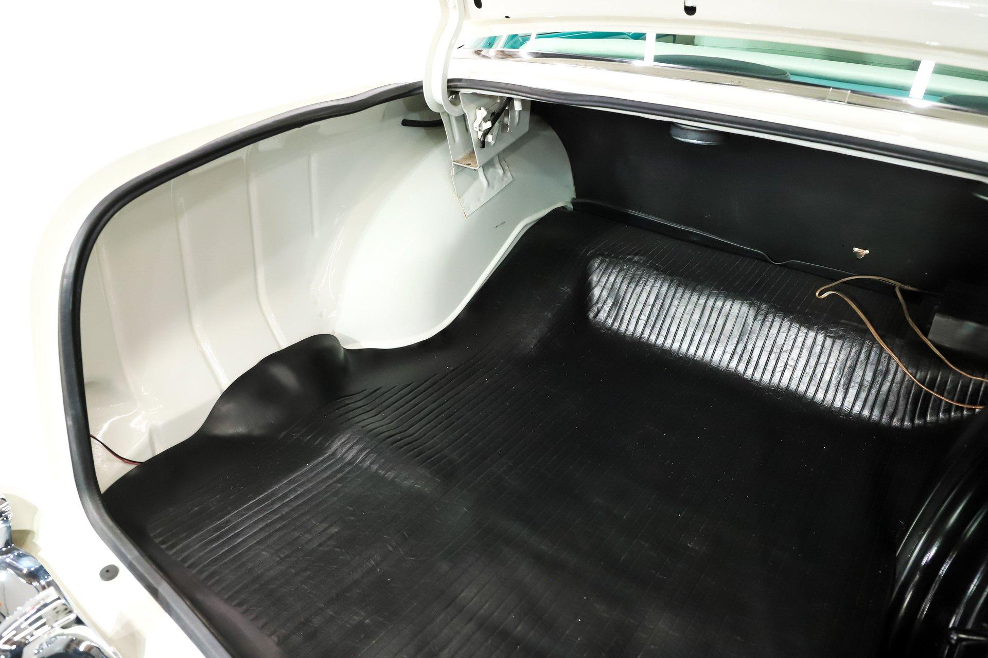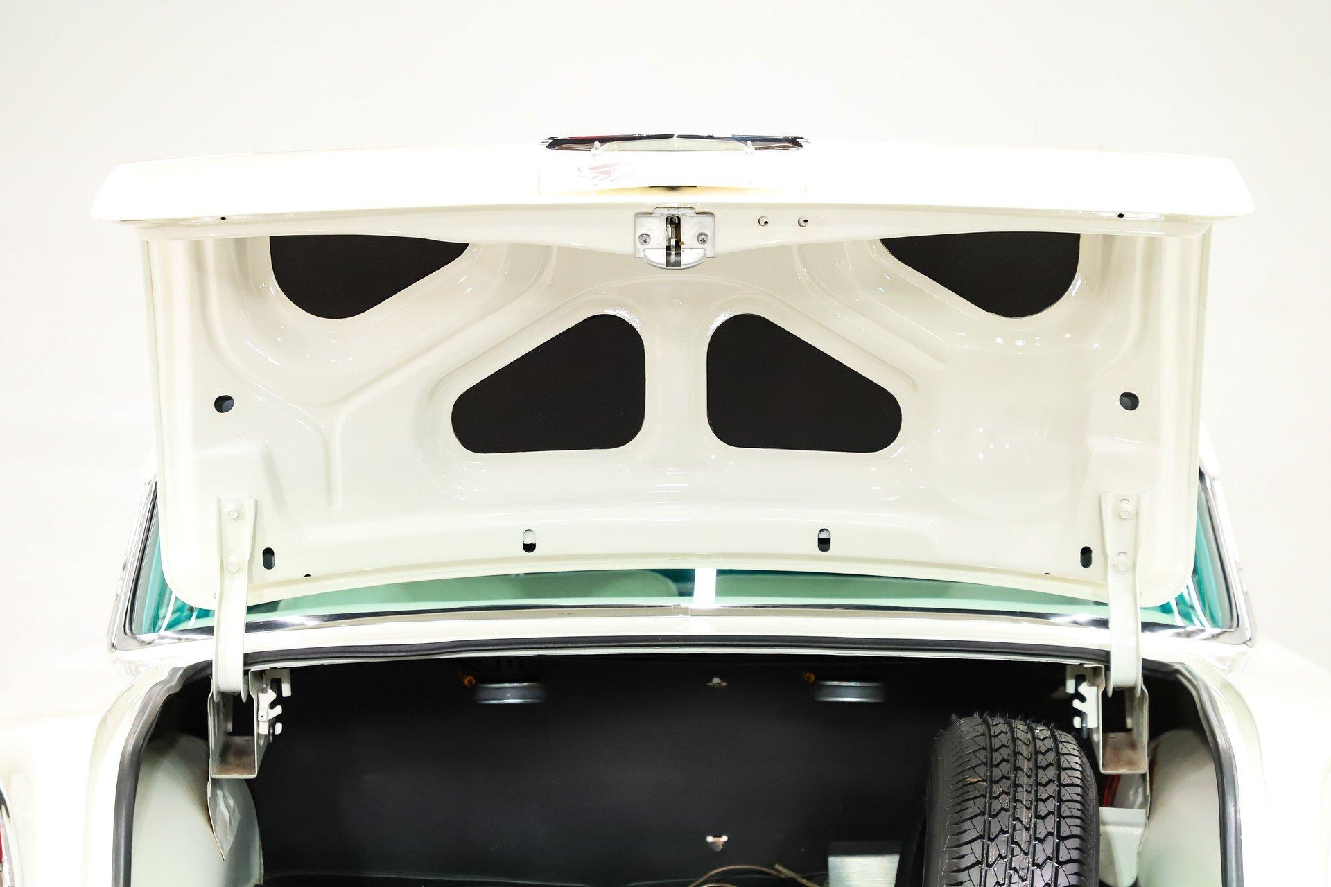 TRUNK COMPARTMENT: It's completely finished off inside! Everything is painted a smooth gloss white and it has a reproduction rubber mat, seat back divider and weatherstrip. It's even complete with a full jack and spare assembly.
