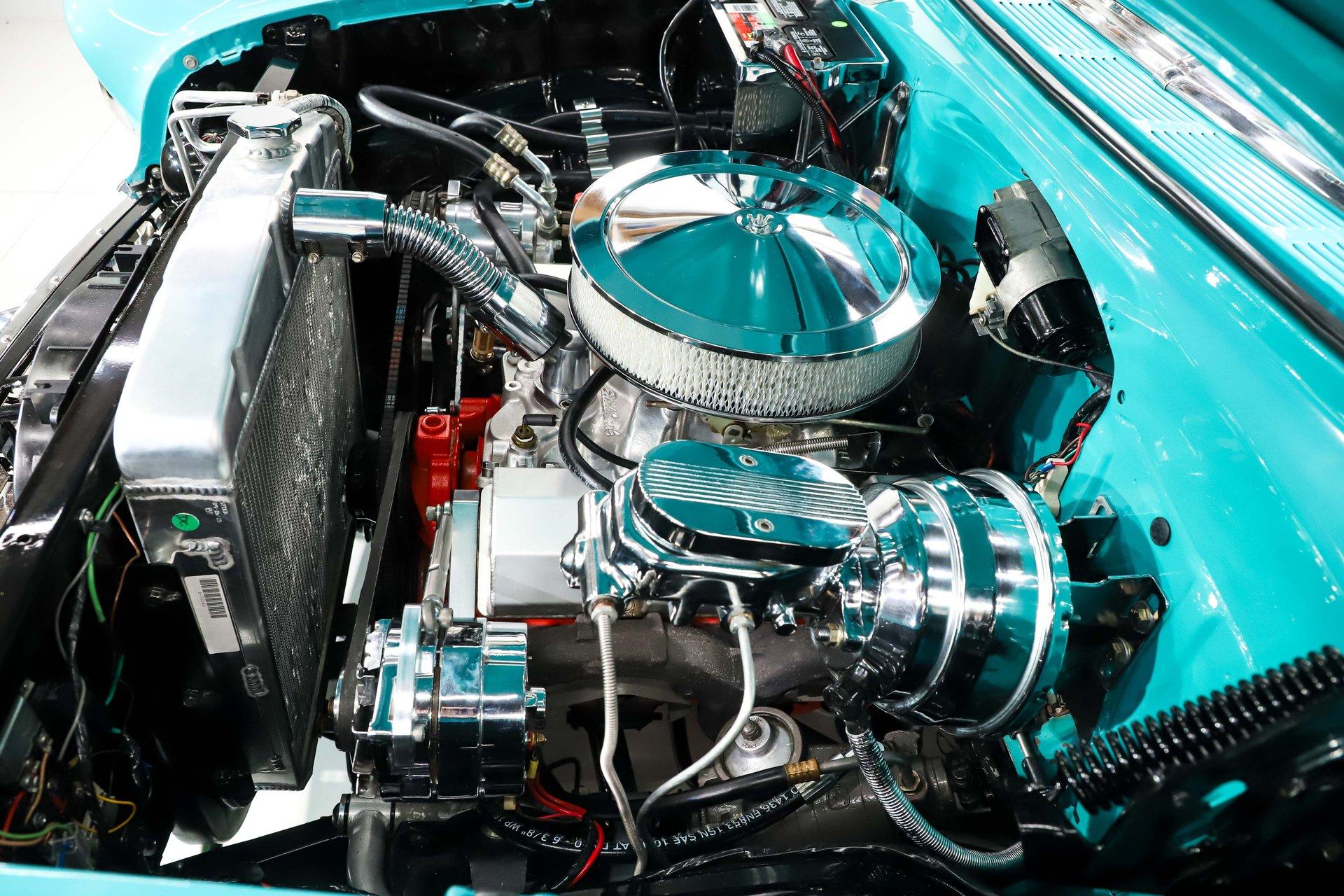 ENGINE COMPARTMENT: It has everything you need under the hood! A modern heat and a/c system keeps you comfortable. Upgraded power steering and brakes make it easy to drive. The mighty 327 packs a punch. It has a nice cam, aluminum intake, Edelbrock carb with electric choke and is cranking out about 300hp. The motor runs cool with an aluminum radiator and a big electric fan. The electric wiper motor looks new. It's a good looking motor compartment with a lot of extra chrome and polished parts, nice Chevrolet valve covers and the metal surfaces are painted very neatly.