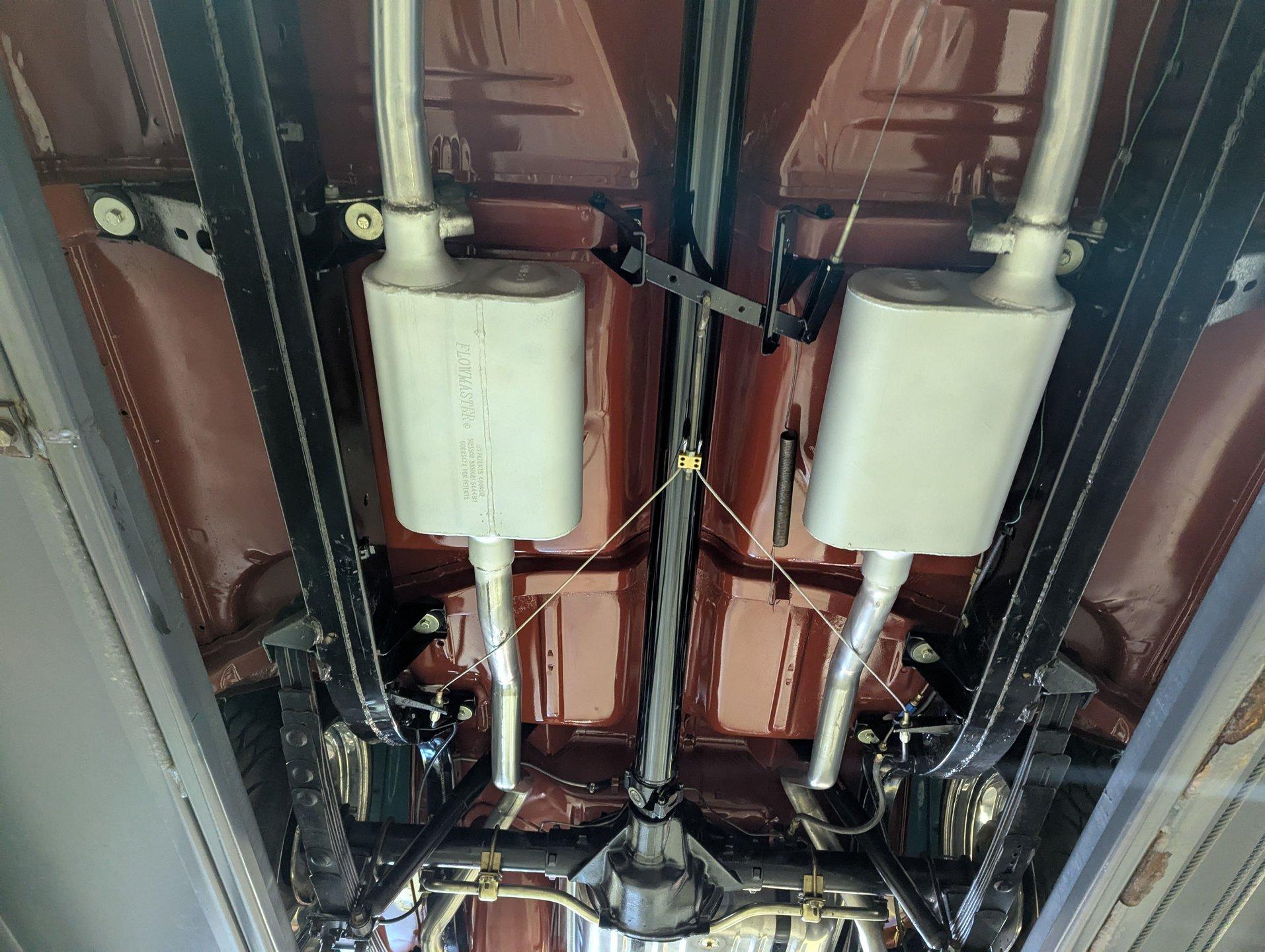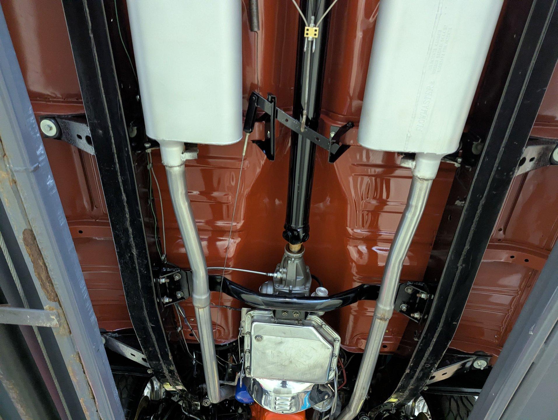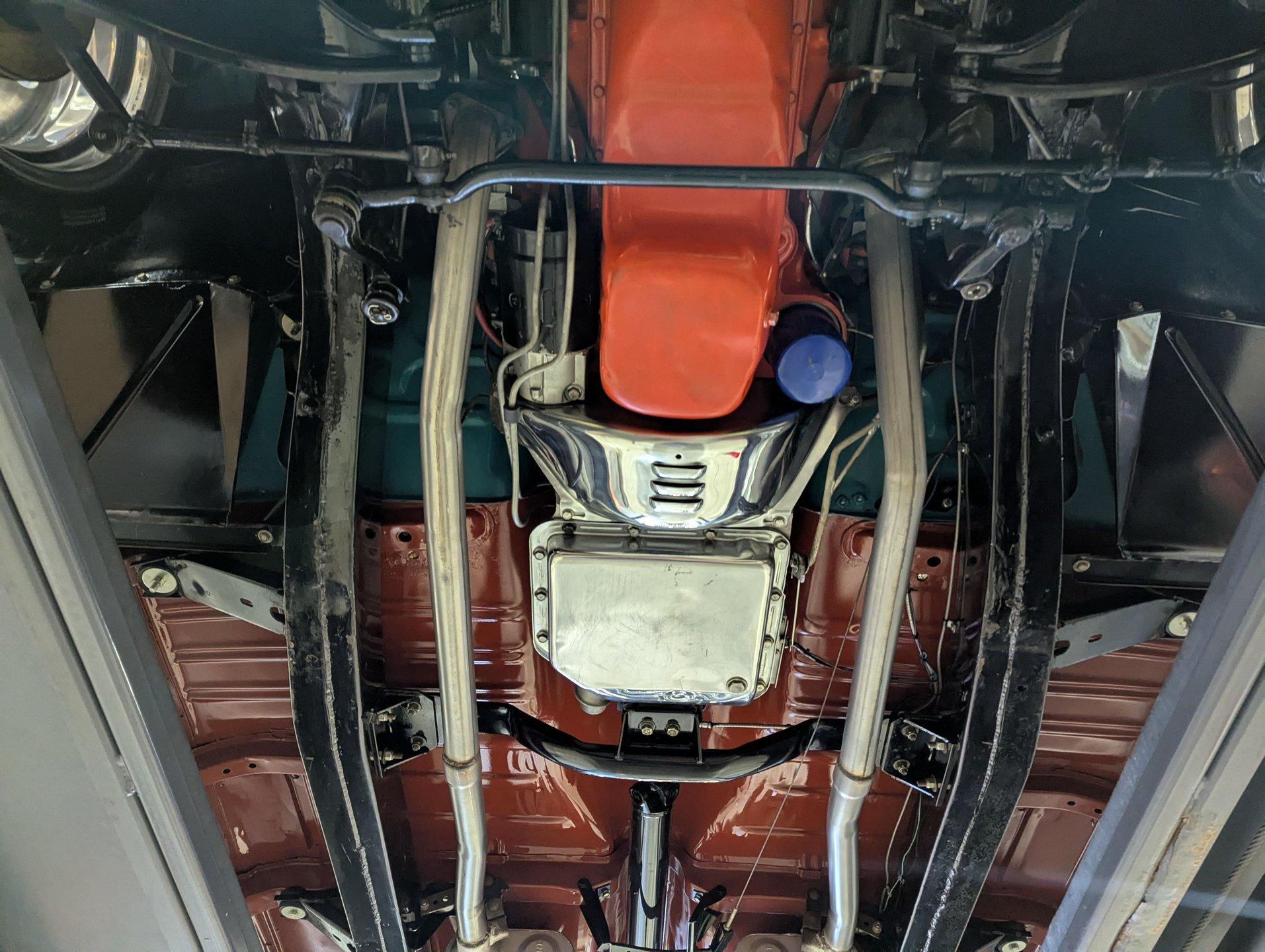 UNDERSIDE: Wow, it's exceptionally nice under here too! The body was removed from the frame during restoration and everything was redone. The chassis was all prepped and painted semi gloss black. The pristine metal floors were sprayed in the factory type red oxide primer and then given some clear coat for protection. The suspension and steering was gone through, front and rear sway bars have been added and lowering blocks. The brake system was completely gone through and it is upgraded with discs at all four wheels and the e-brake assembly is even hooked up. It has a great sounding dual exhaust system with Flowmaster mufflers. The fuel system was replaced including the tank. Looking up at the motor it is clean Chevy orange with a chrome flywheel cover. The upgraded Turbo 350 automatic connects to a rebuilt drive shaft that goes back to a 10 bolt rear end with 3.08 posi gears.