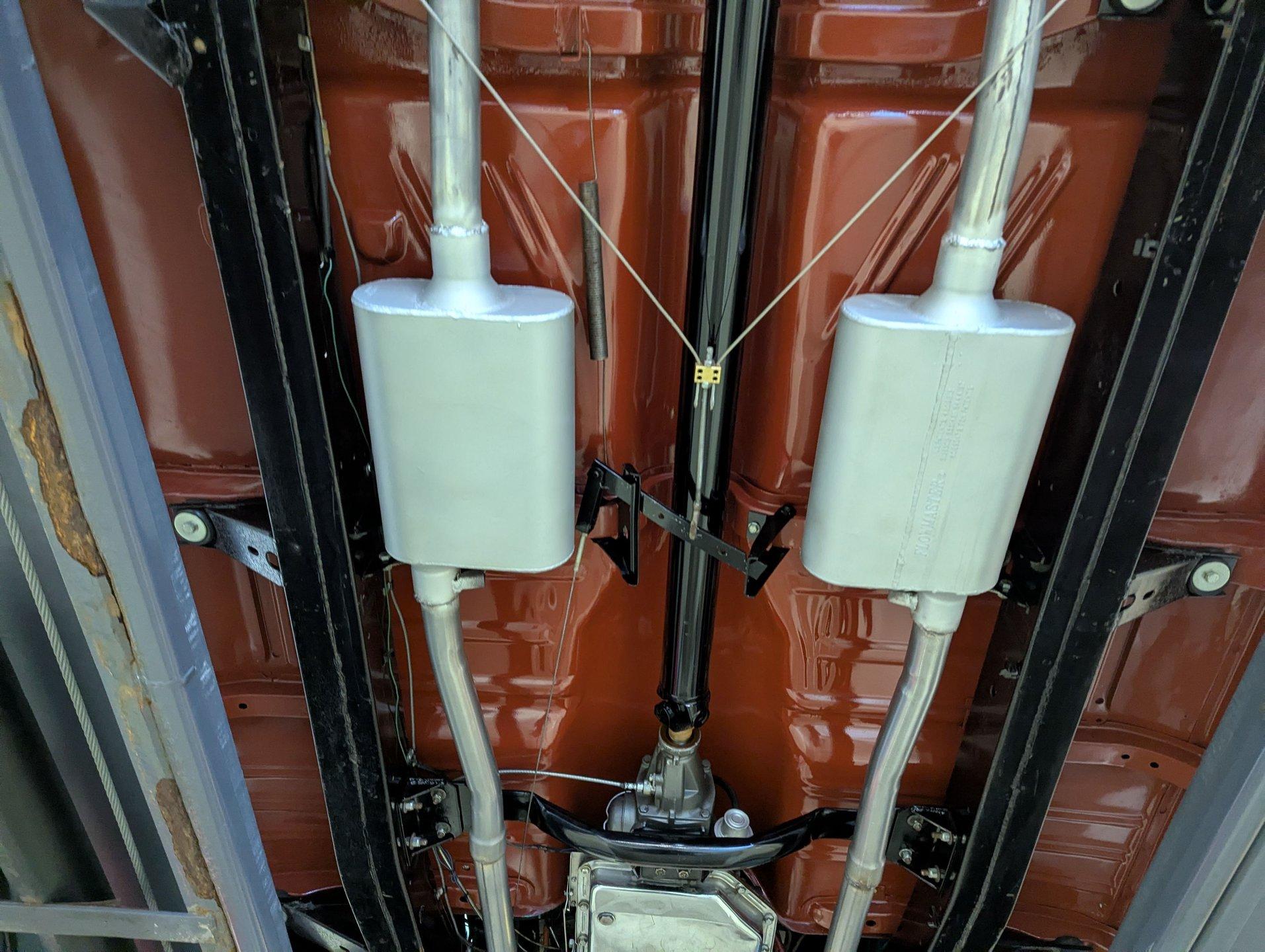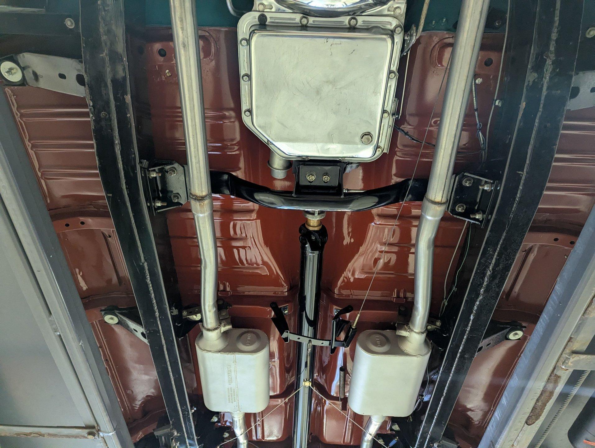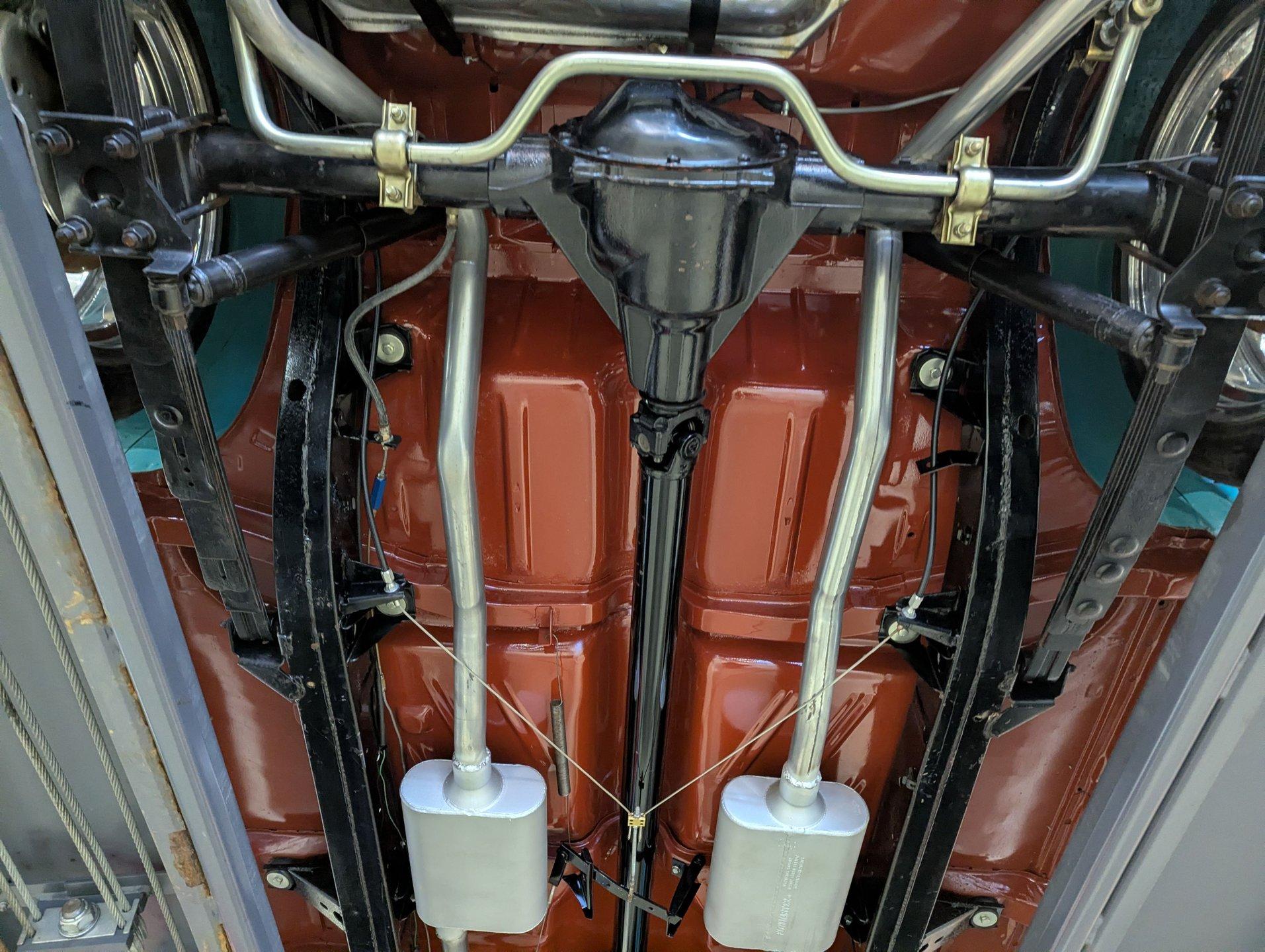 UNDERSIDE: Wow, it's exceptionally nice under here too! The body was removed from the frame during restoration and everything was redone. The chassis was all prepped and painted semi gloss black. The pristine metal floors were sprayed in the factory type red oxide primer and then given some clear coat for protection. The suspension and steering was gone through, front and rear sway bars have been added and lowering blocks. The brake system was completely gone through and it is upgraded with discs at all four wheels and the e-brake assembly is even hooked up. It has a great sounding dual exhaust system with Flowmaster mufflers. The fuel system was replaced including the tank. Looking up at the motor it is clean Chevy orange with a chrome flywheel cover. The upgraded Turbo 350 automatic connects to a rebuilt drive shaft that goes back to a 10 bolt rear end with 3.08 posi gears.