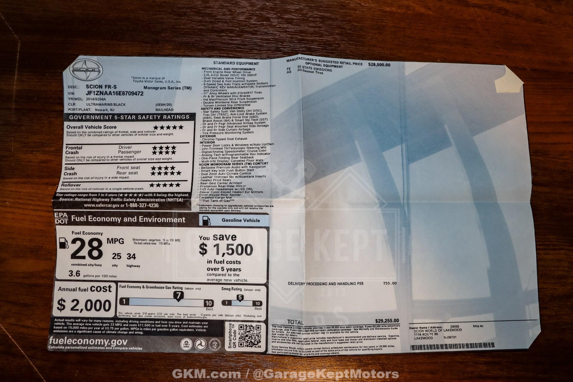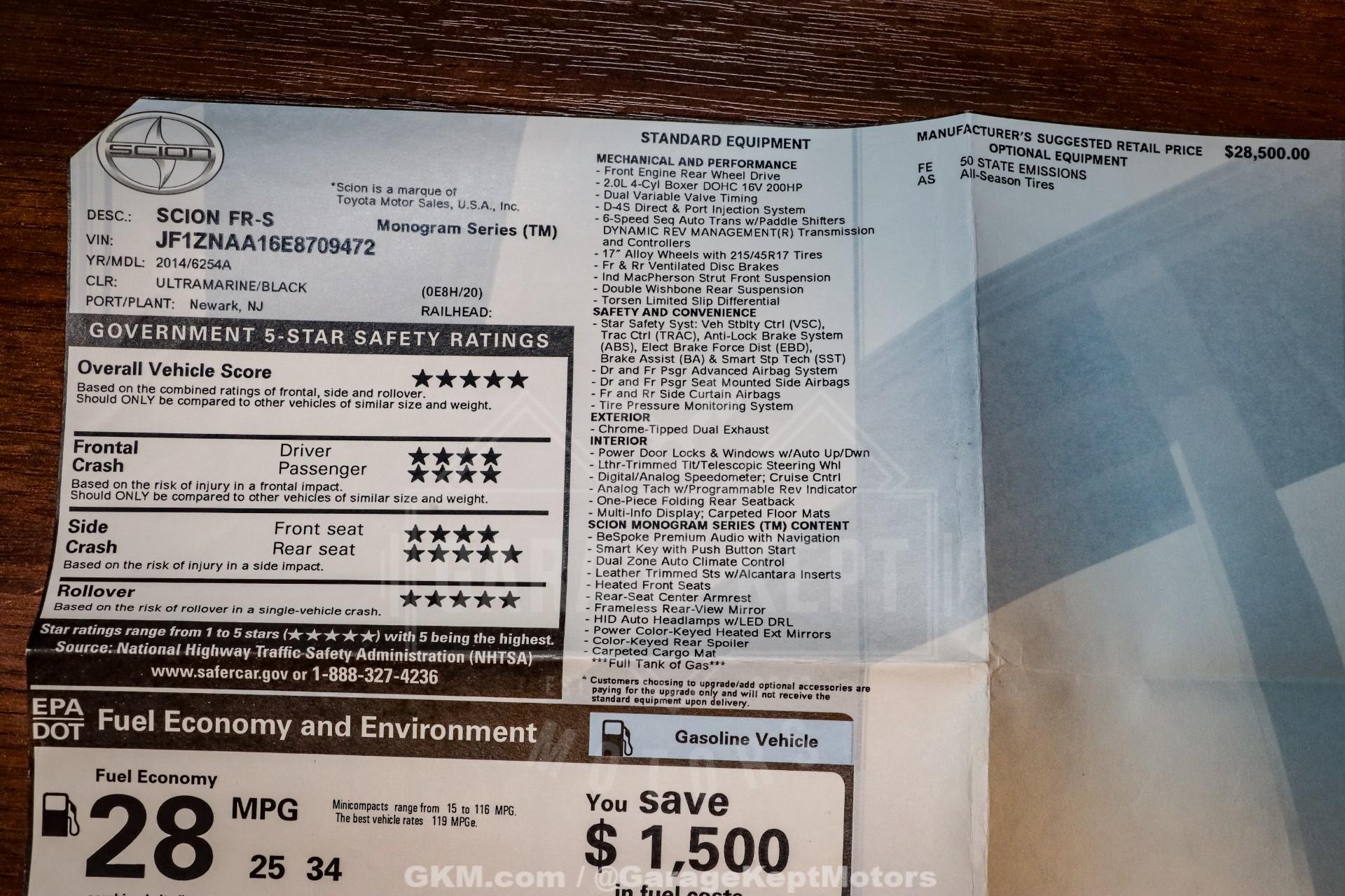 2014 Scion FR-S Monogram- One Owner - 68,684 Miles- Ultramarine Blue Exterior- Black Interior- 2" Lift- 17" Method Wheels Wrapped In 235/55 Hankook Tires- Original Window Sticker And Owners ManualsThis one-owner 2014 Scion FR-S Monogram is a standout example of Toyota's lightweight, driver-focused sports coupe, finished in the highly desirable Ultramarine Blue. With 68,684 miles, this FR-S has been well cared for and retains the sharp handling and engaging driving experience that made the platform so popular among enthusiasts. Its clean lines, balanced proportions, and low-slung stance give it a timeless, purpose-built look.The Monogram trim adds premium touches to the black interior, elevating the cabin with upgraded materials and features while still keeping the focus on the driver. The interior remains sporty and functional, offering supportive seating and a simple, intuitive layout that emphasizes connection to the road. Included with the car are the original window sticker and owner's manuals, further highlighting its well-documented, single-owner history.What truly sets this FR-S apart is its unique setup. A 2-inch lift combined with 17-inch Method wheels wrapped in 235/55 Hankook tires gives the car a distinctive rally-inspired presence while adding extra versatility and road confidence. This setup not only makes the car visually striking but also opens the door for light off-road or all-weather fun, setting it apart from typical FR-S builds.If you're looking for an FR-S that blends proven sports car dynamics with a unique and adventurous twist, this 2014 Scion FR-S Monogram delivers. With its one-owner background, tasteful modifications, and eye-catching color combination, it's a fun, uncommon take on a modern enthusiast favorite that's ready to be enjoyed.