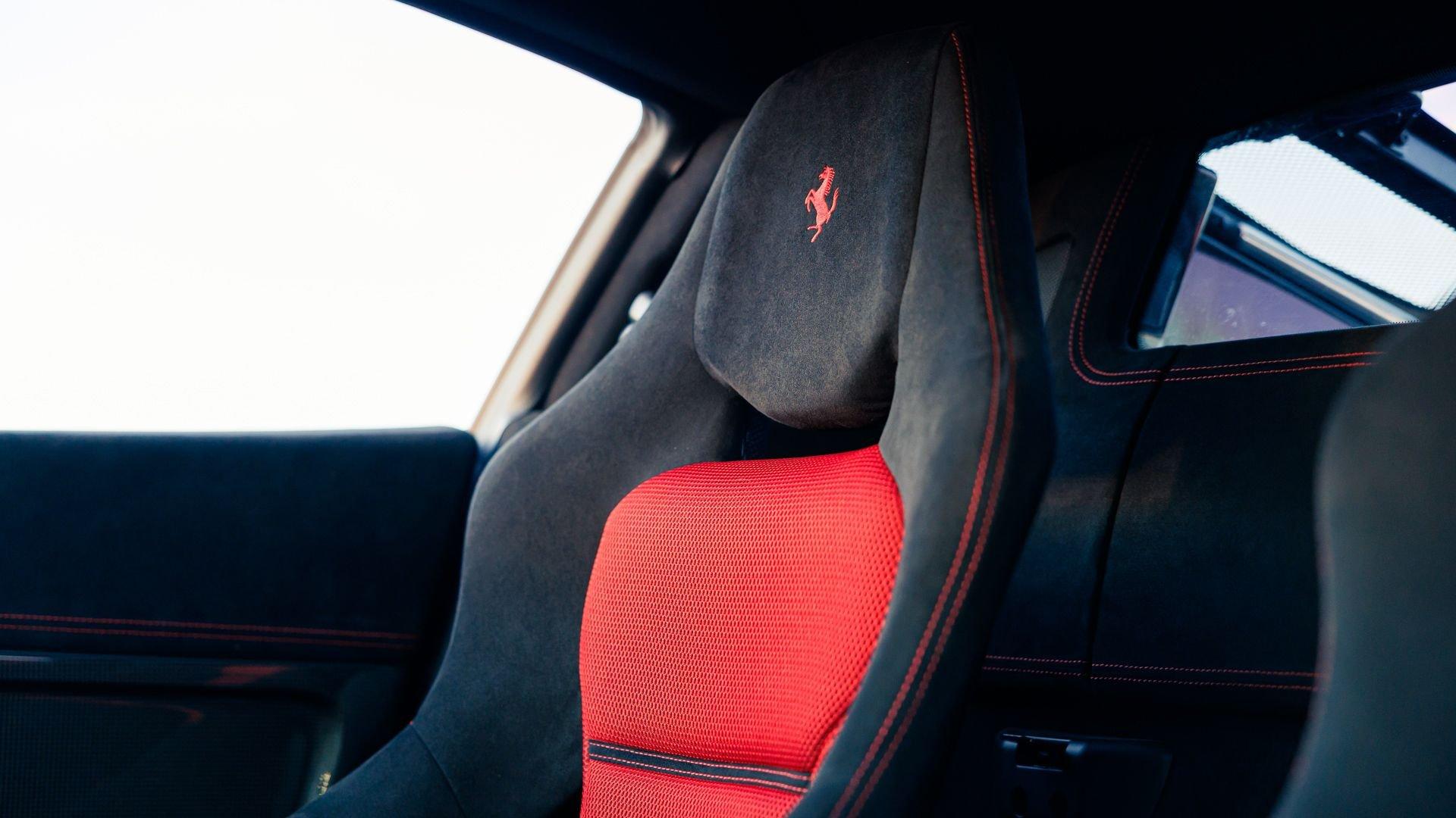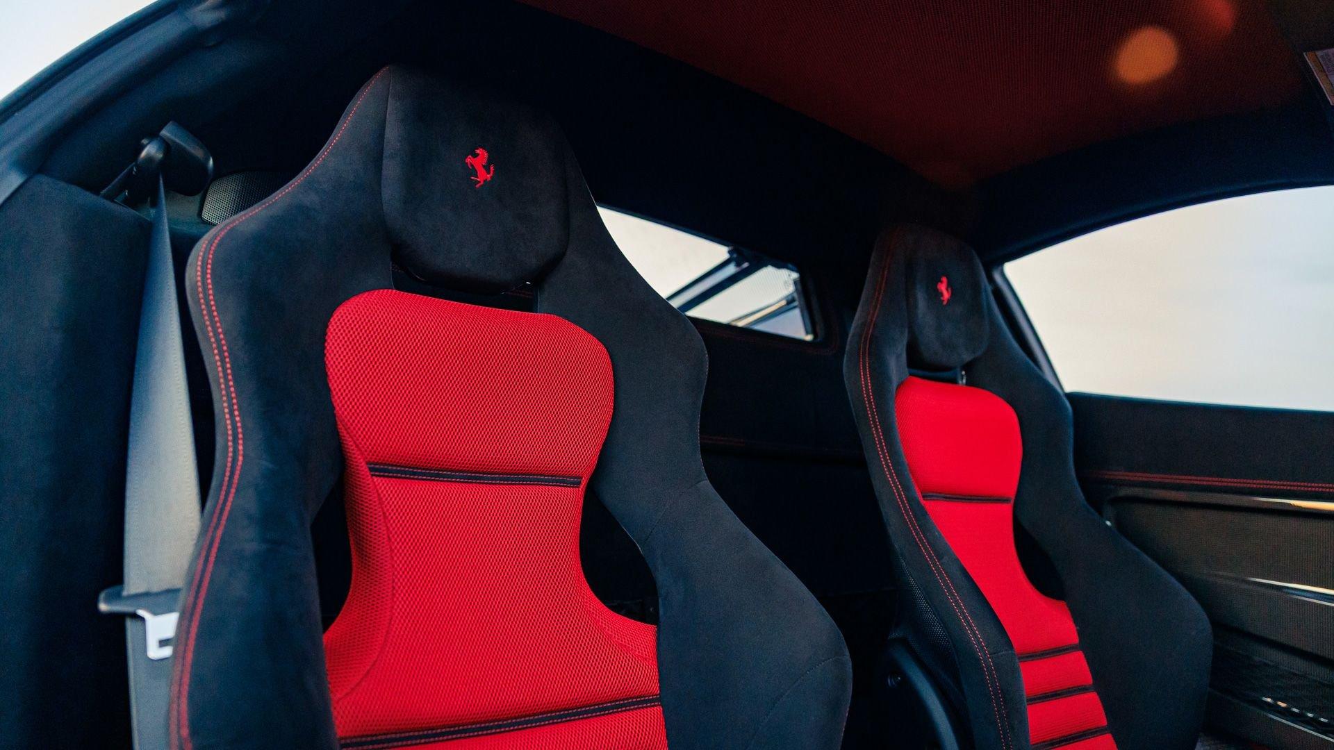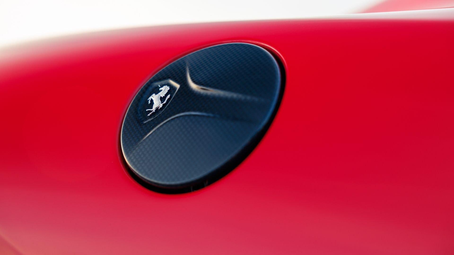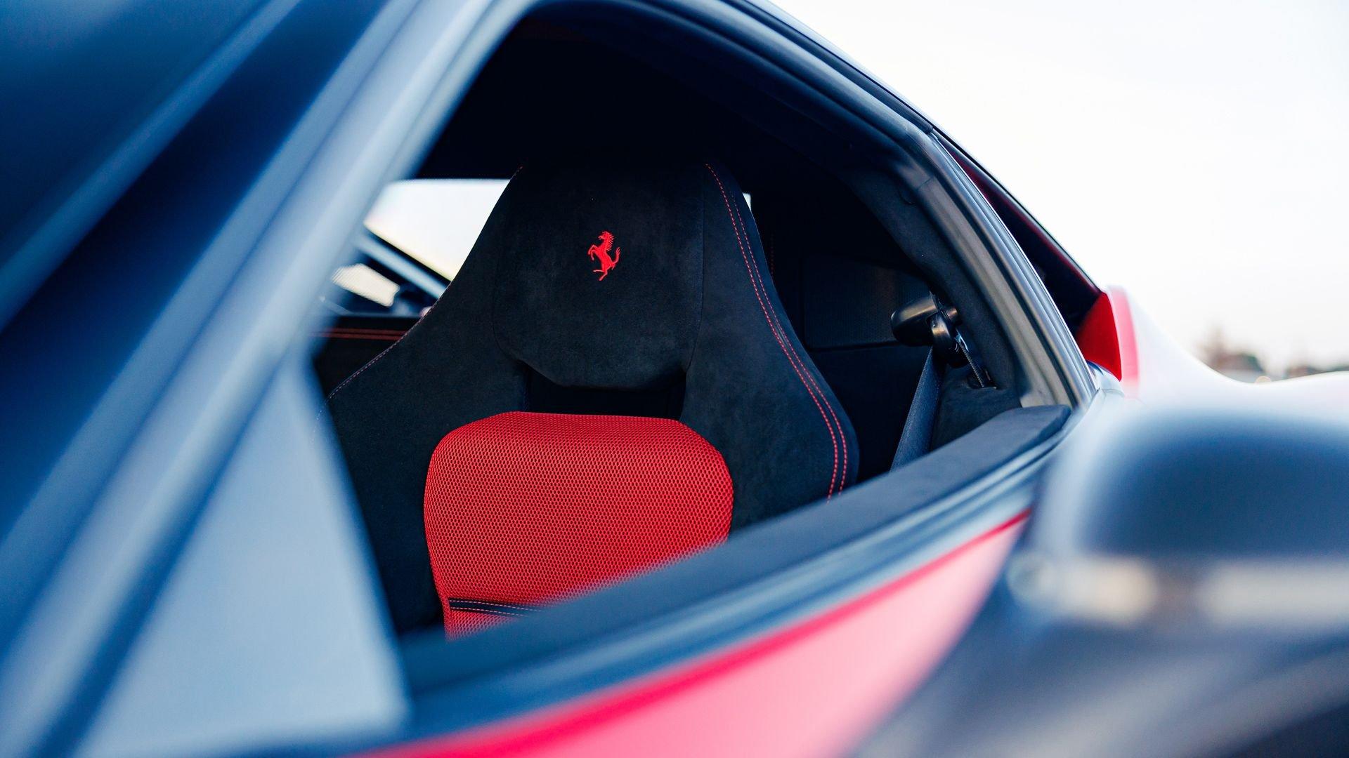 Chassis number 211323 was delivered new via Boardwalk Ferrari (now Ferrari Dallas), as confirmed by a digital copy of its original window sticker. It was strikingly specified in Rosso Corsa with an optional Nero (Black) roof-a $11,811 selection-over Alcantara Nera upholstery with Rosso seat inserts. Notably, it was ordered without the launch livery's familiar NART racing stripe, a subtle “stripe delete” that lends the car a more understated appearance. Desirable factory options included extensive exterior carbon fiber, comprising the front flaps, engine cover, and rear diffuser, as well as yellow brake calipers, titanium exhaust pipes, Adaptive Frontlighting System (AFS), and the must-have Suspension Lifter. The cockpit was similarly well appointed with Cavallino Rampante stitching on the headrests, an Alcantara-trimmed central tunnel and wheel arches, and a handy fire extinguisher.