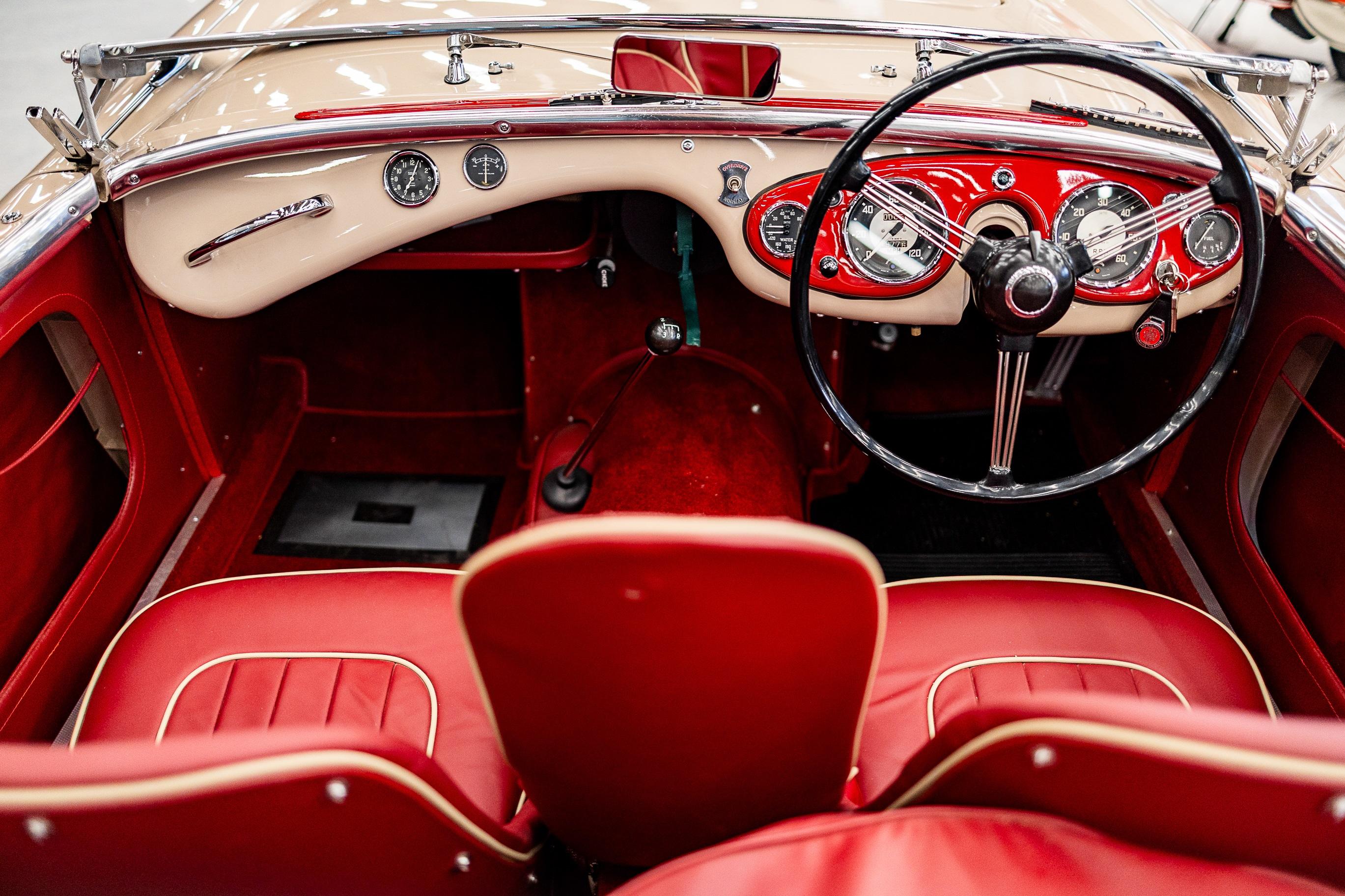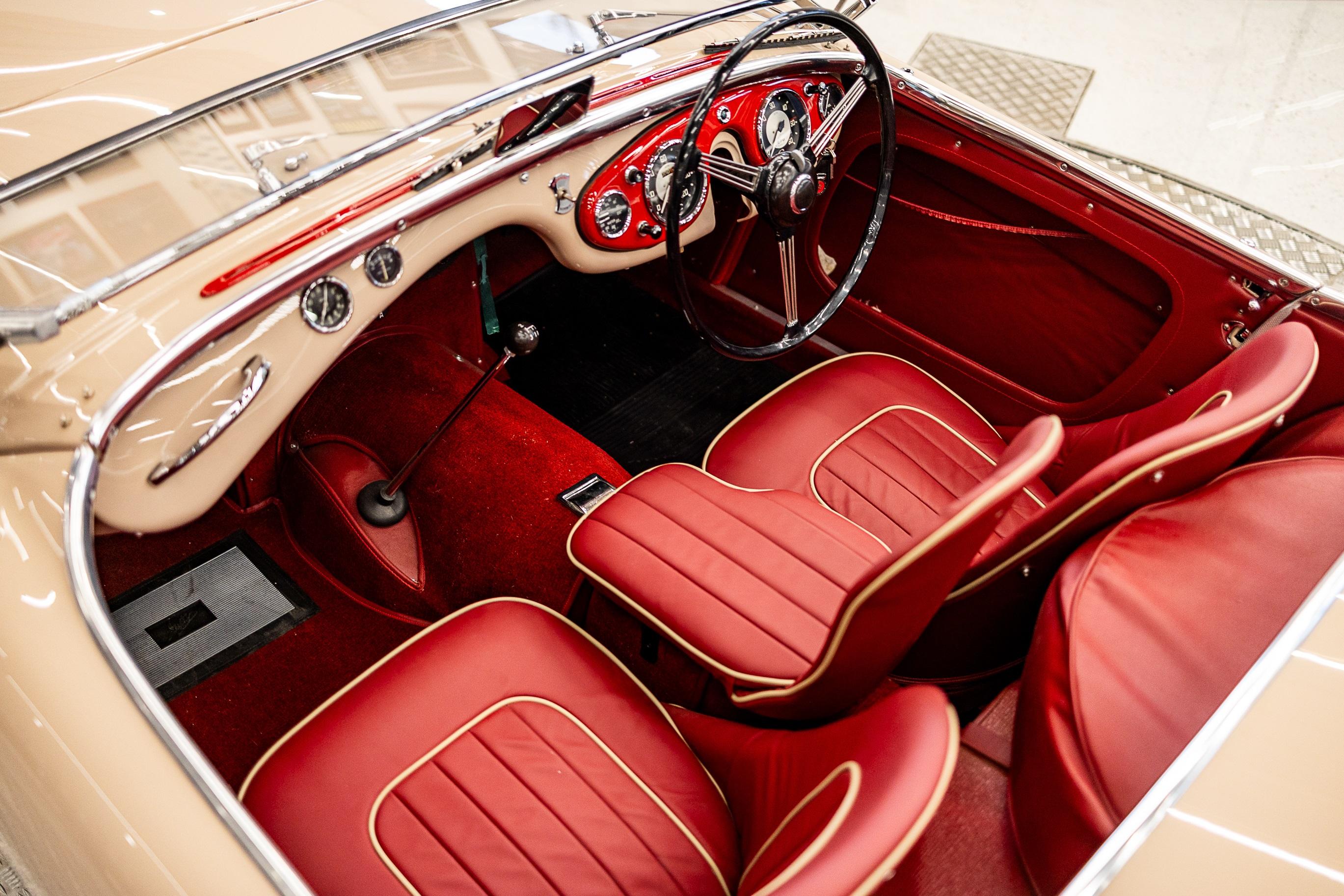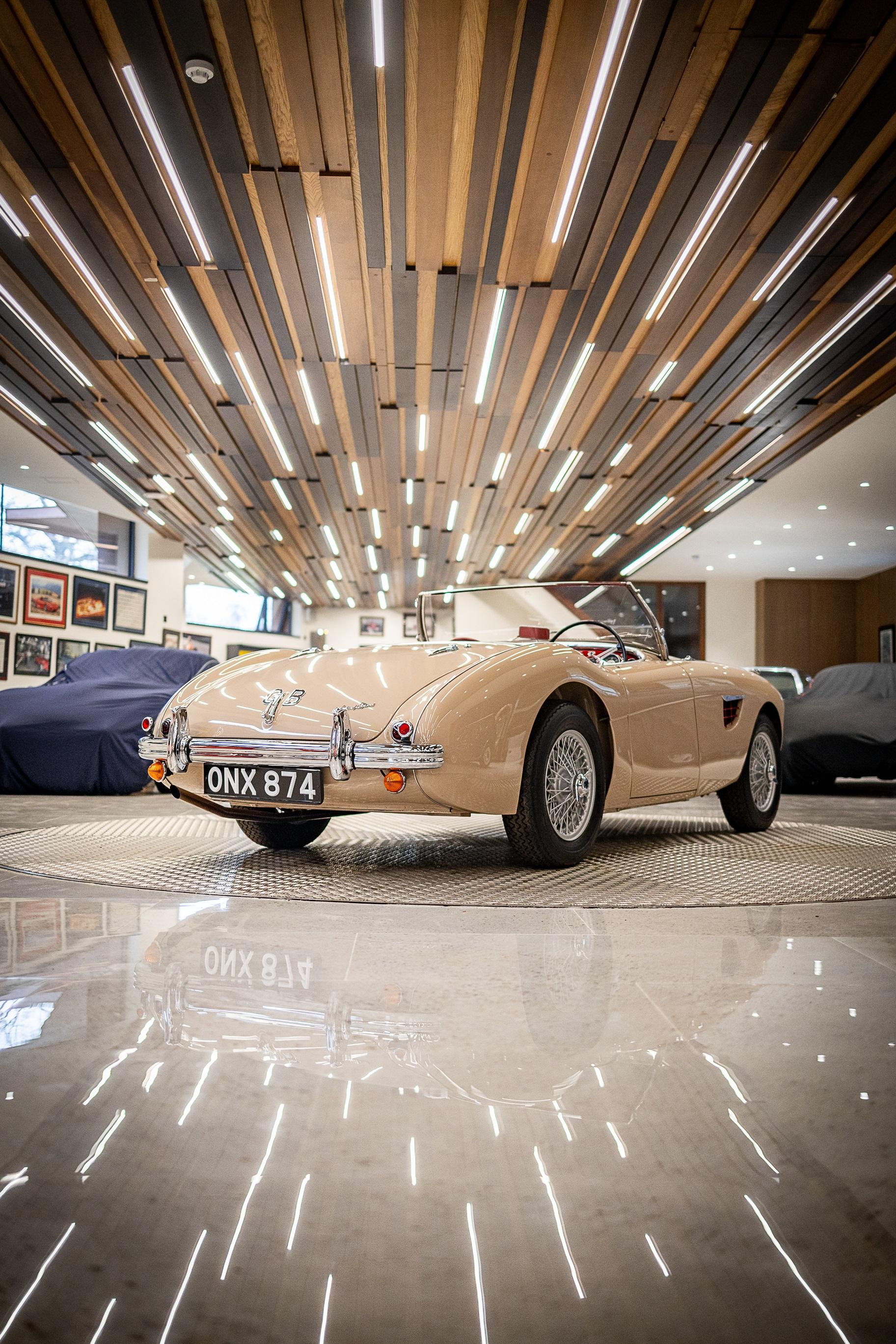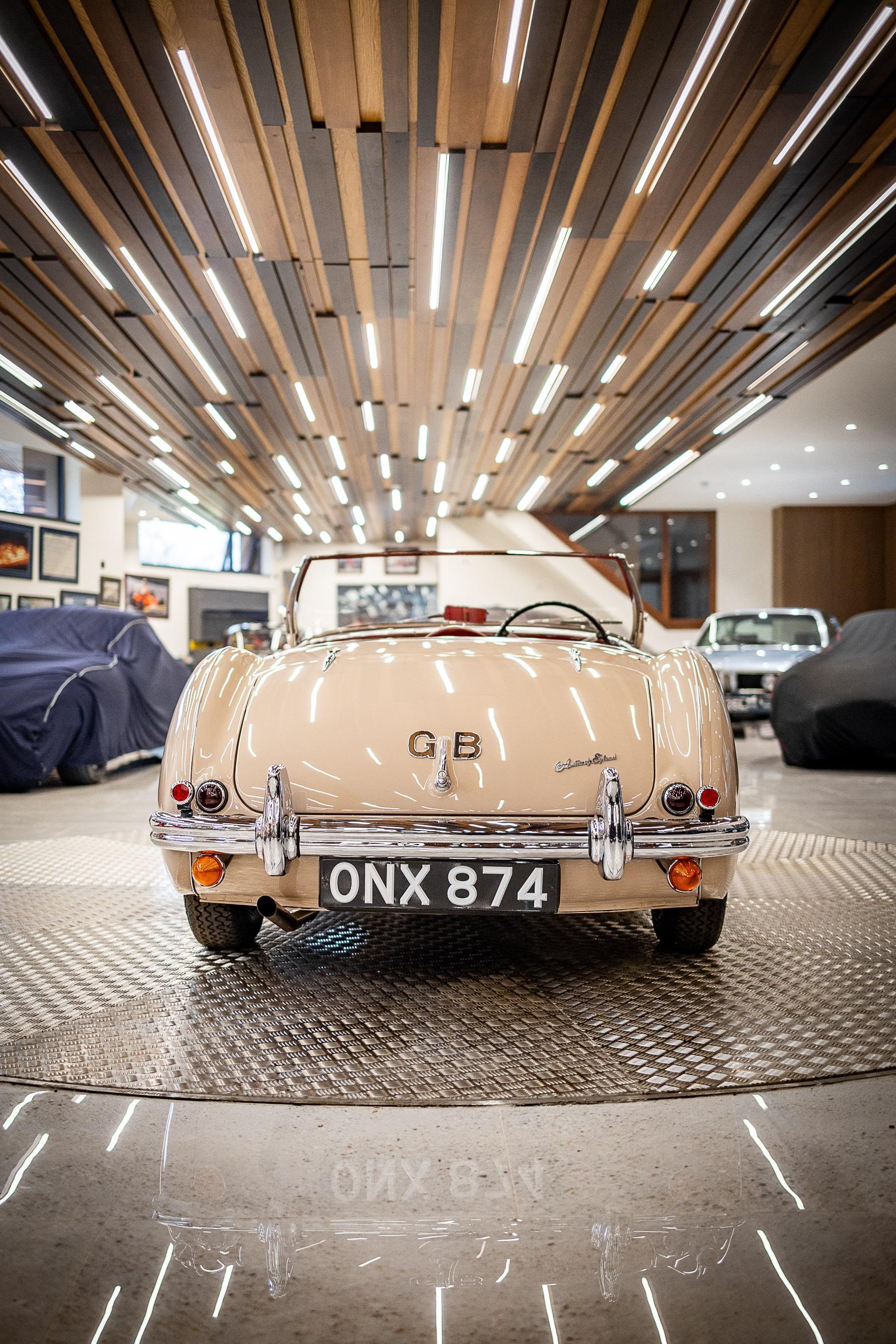 This impeccable 1954 Austin Healey presents in immaculate Coronet Cream coachwork with a contrasting red leather interior. The car had been off the road for several years before work was undertaken by a well-respected marque specialist who was well known in Healey circles as both a leading authority and restorer of several concourse winning examples. This handsome example benefitted from a meticulous and complete ground up restoration back to original specification including a bare metal respray and full retrimming. It is easy to see that no expense was spared in the work completed on this car. The shut lines and panel gaps are of an award-winning standard. It is believed this car was a works car as the number plate ONX was used by the Healey Motor Co for their test cars, the small child seat and the air intakes on the wings indicate an experimental car possibly. Consigned by Dominic Lake