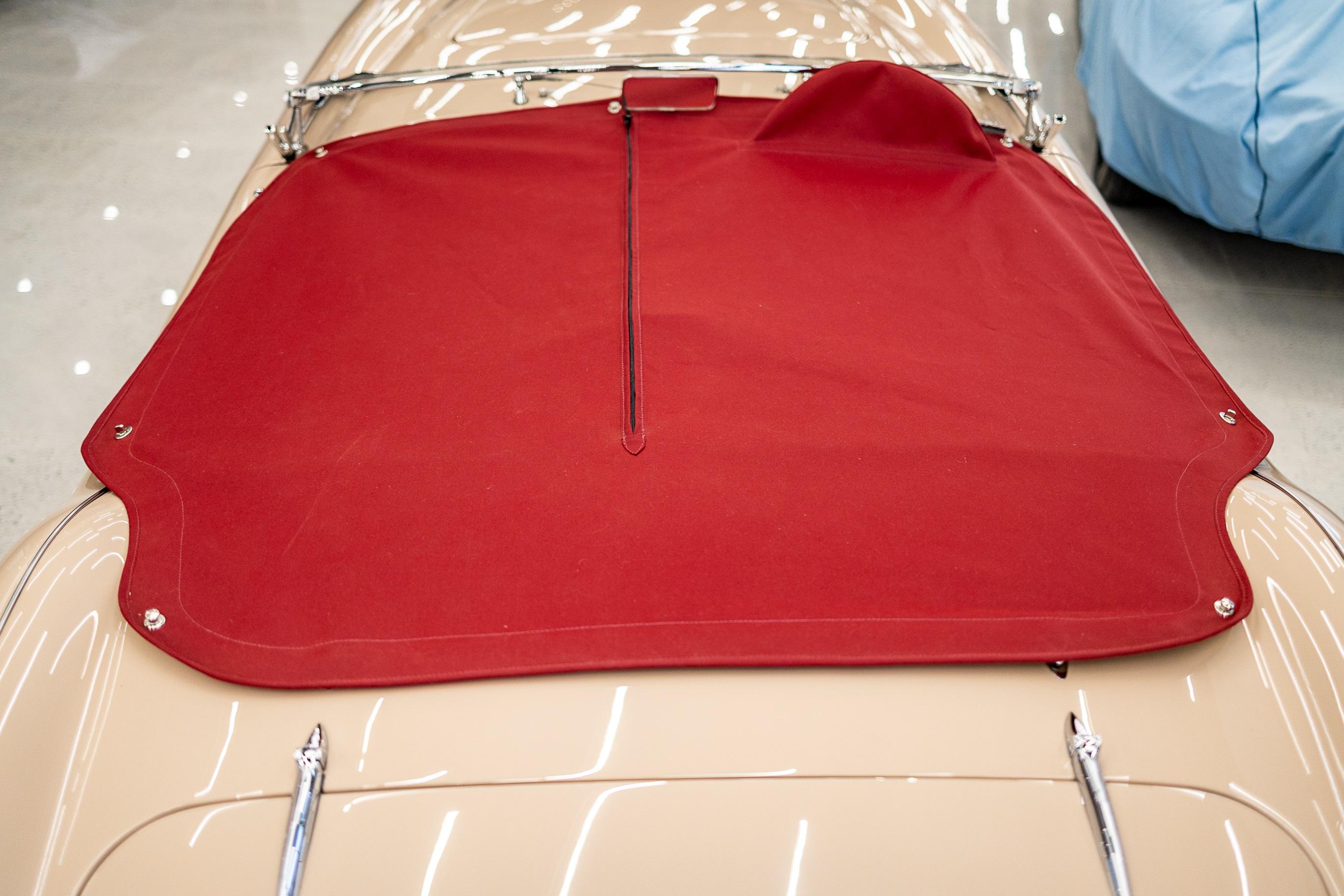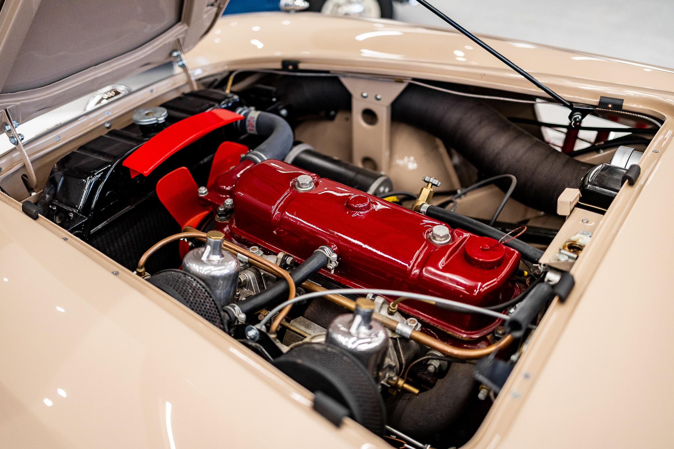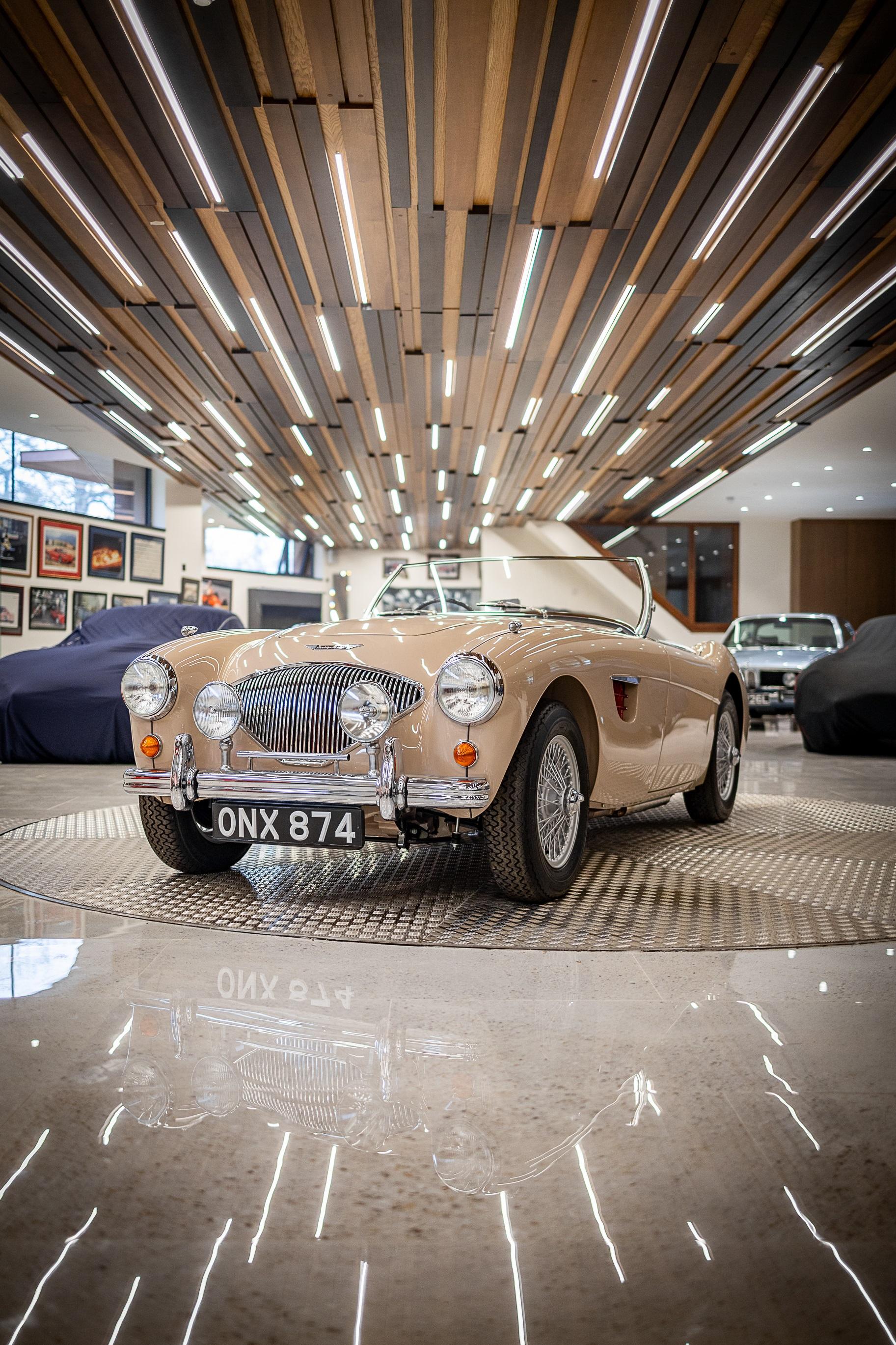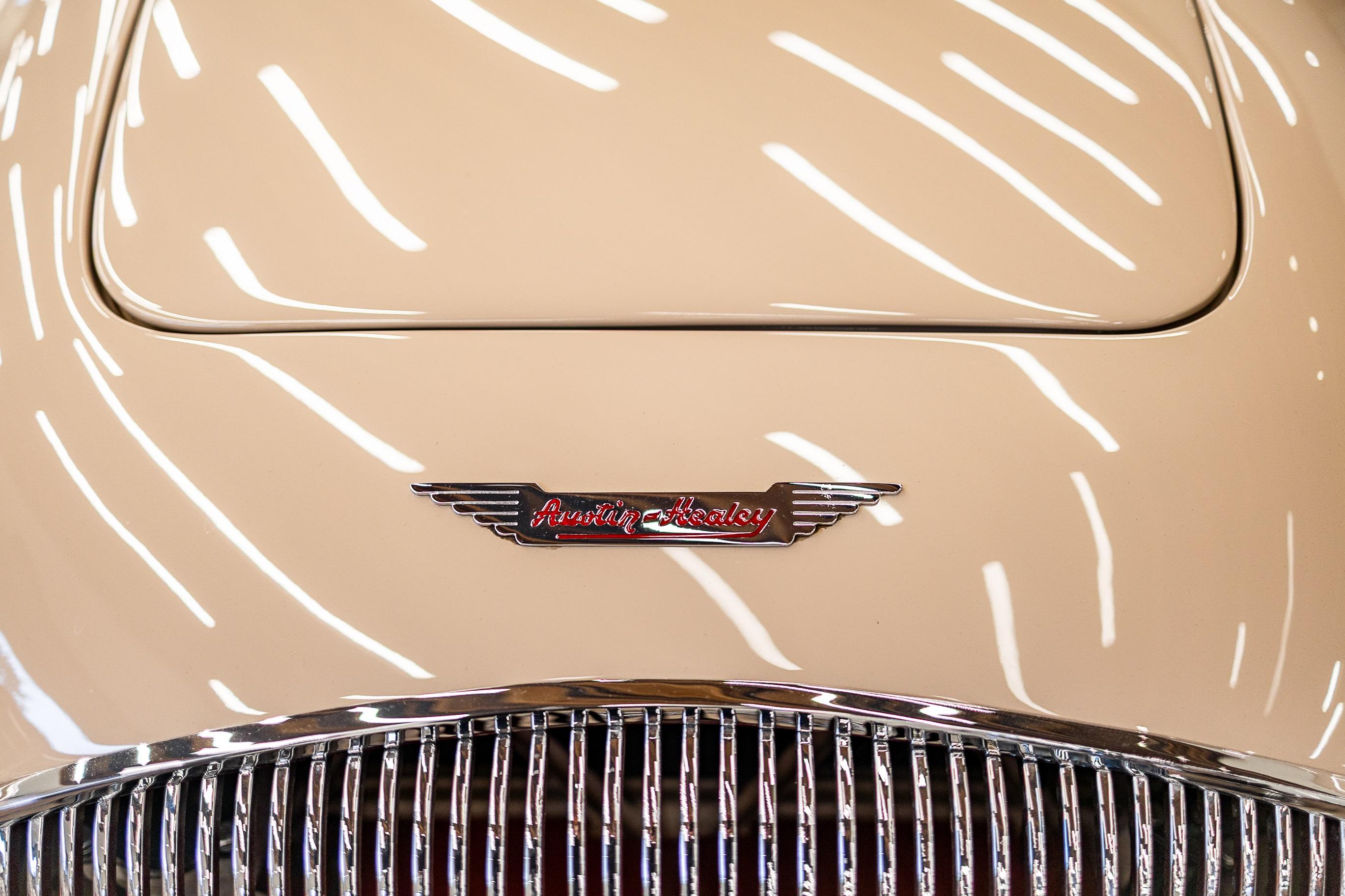 This impeccable 1954 Austin Healey presents in immaculate Coronet Cream coachwork with a contrasting red leather interior. The car had been off the road for several years before work was undertaken by a well-respected marque specialist who was well known in Healey circles as both a leading authority and restorer of several concourse winning examples. This handsome example benefitted from a meticulous and complete ground up restoration back to original specification including a bare metal respray and full retrimming. It is easy to see that no expense was spared in the work completed on this car. The shut lines and panel gaps are of an award-winning standard. It is believed this car was a works car as the number plate ONX was used by the Healey Motor Co for their test cars, the small child seat and the air intakes on the wings indicate an experimental car possibly. Consigned by Dominic Lake