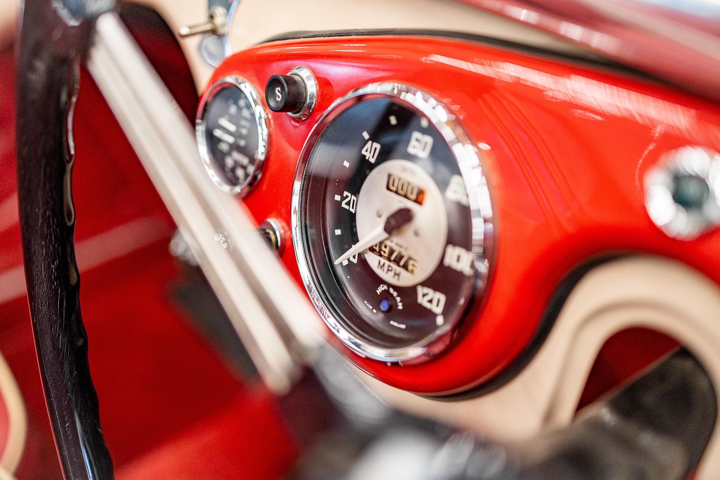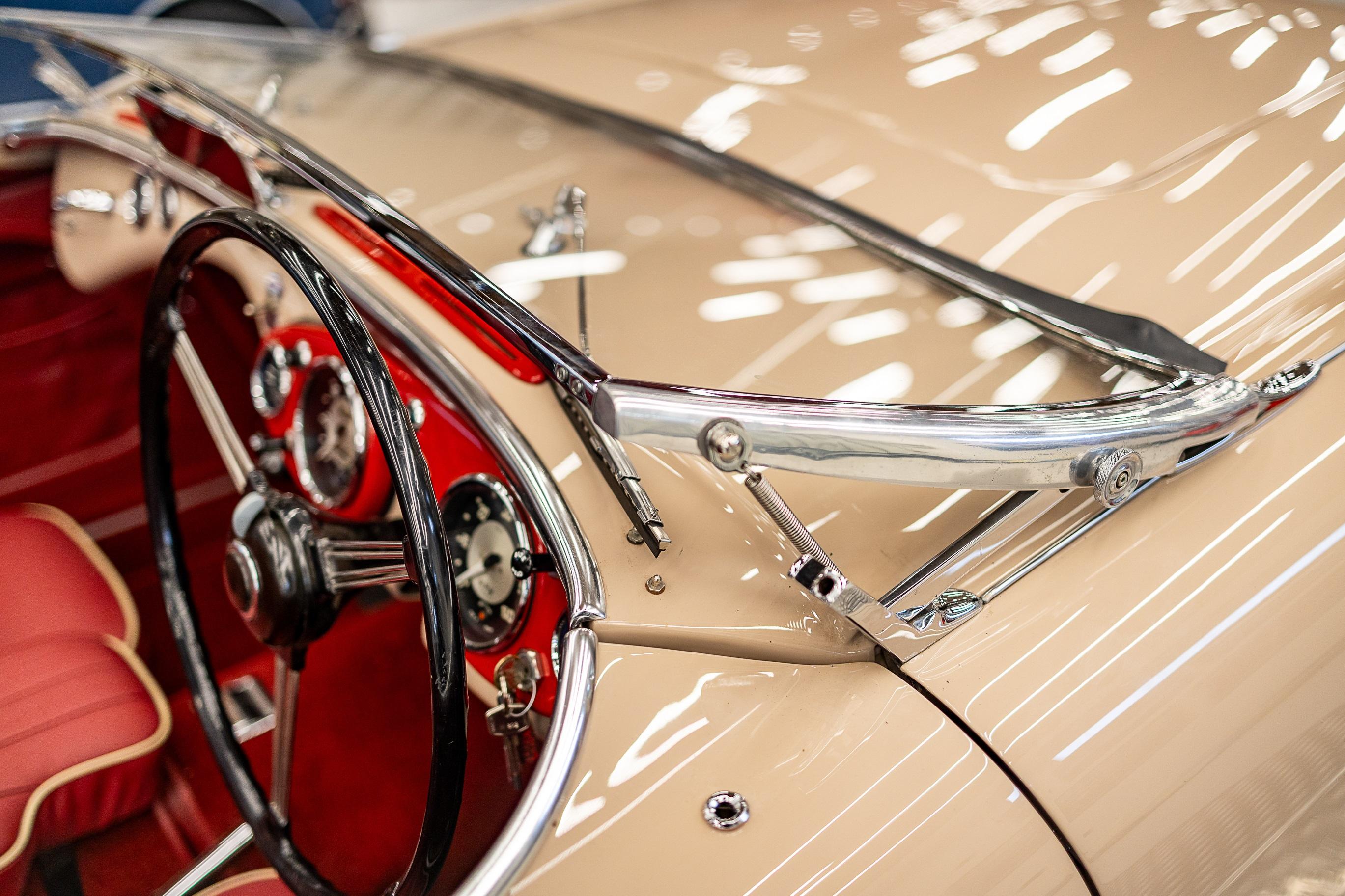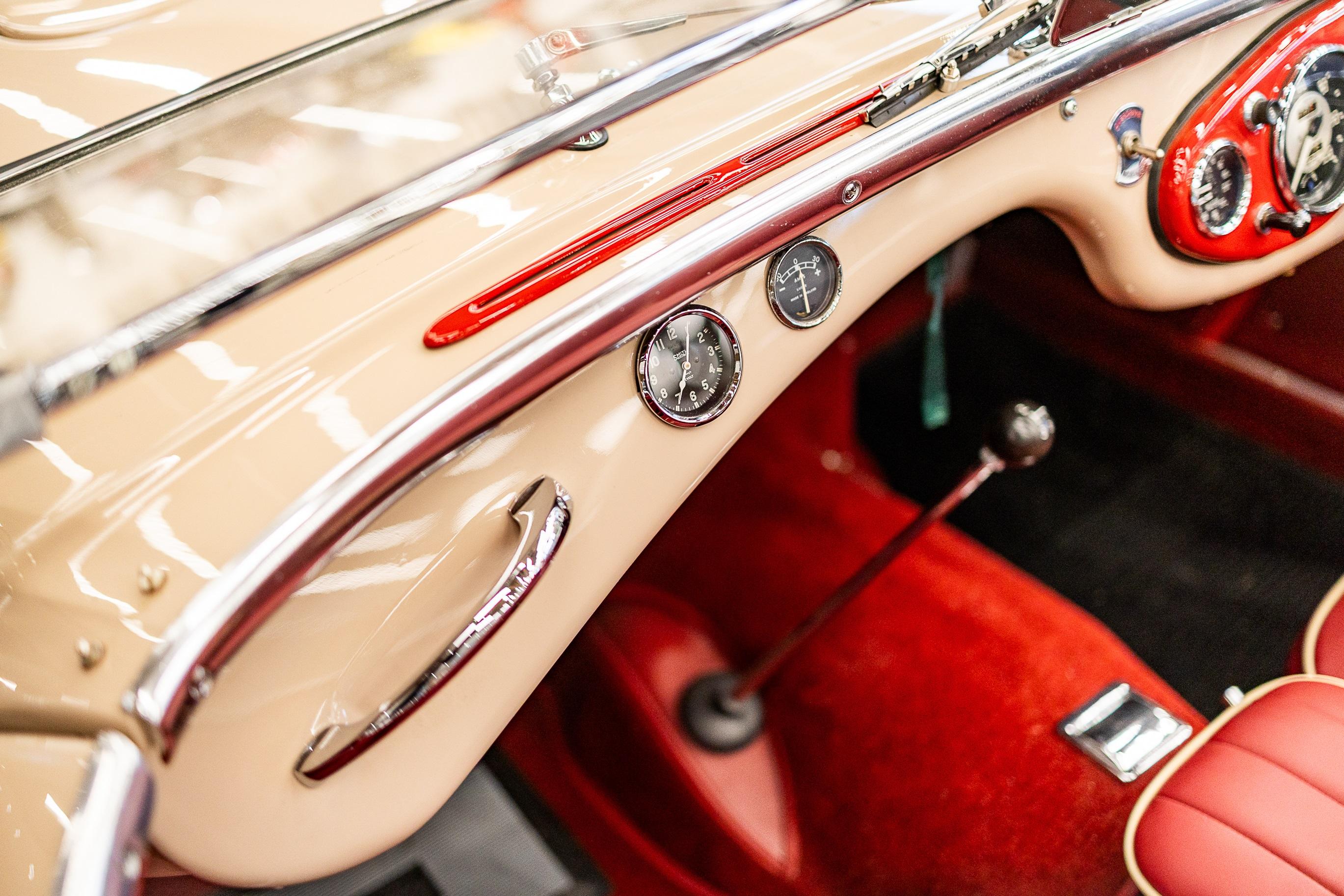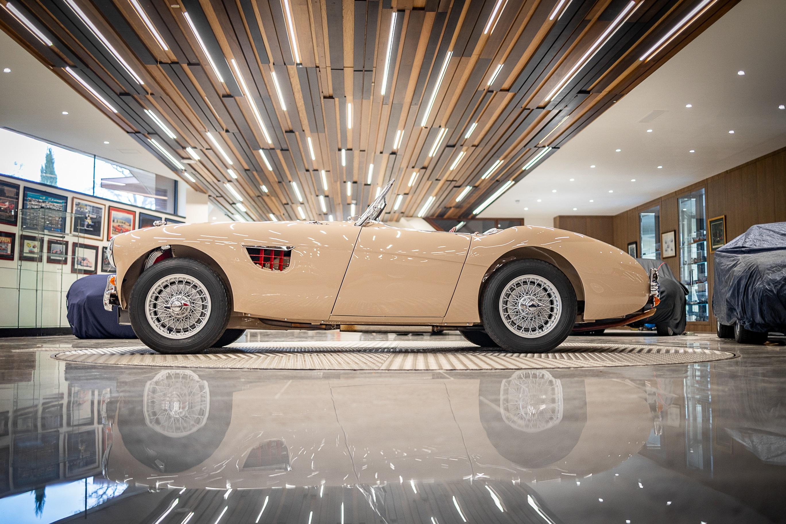 This impeccable 1954 Austin Healey presents in immaculate Coronet Cream coachwork with a contrasting red leather interior. The car had been off the road for several years before work was undertaken by a well-respected marque specialist who was well known in Healey circles as both a leading authority and restorer of several concourse winning examples. This handsome example benefitted from a meticulous and complete ground up restoration back to original specification including a bare metal respray and full retrimming. It is easy to see that no expense was spared in the work completed on this car. The shut lines and panel gaps are of an award-winning standard. It is believed this car was a works car as the number plate ONX was used by the Healey Motor Co for their test cars, the small child seat and the air intakes on the wings indicate an experimental car possibly. Consigned by Dominic Lake
