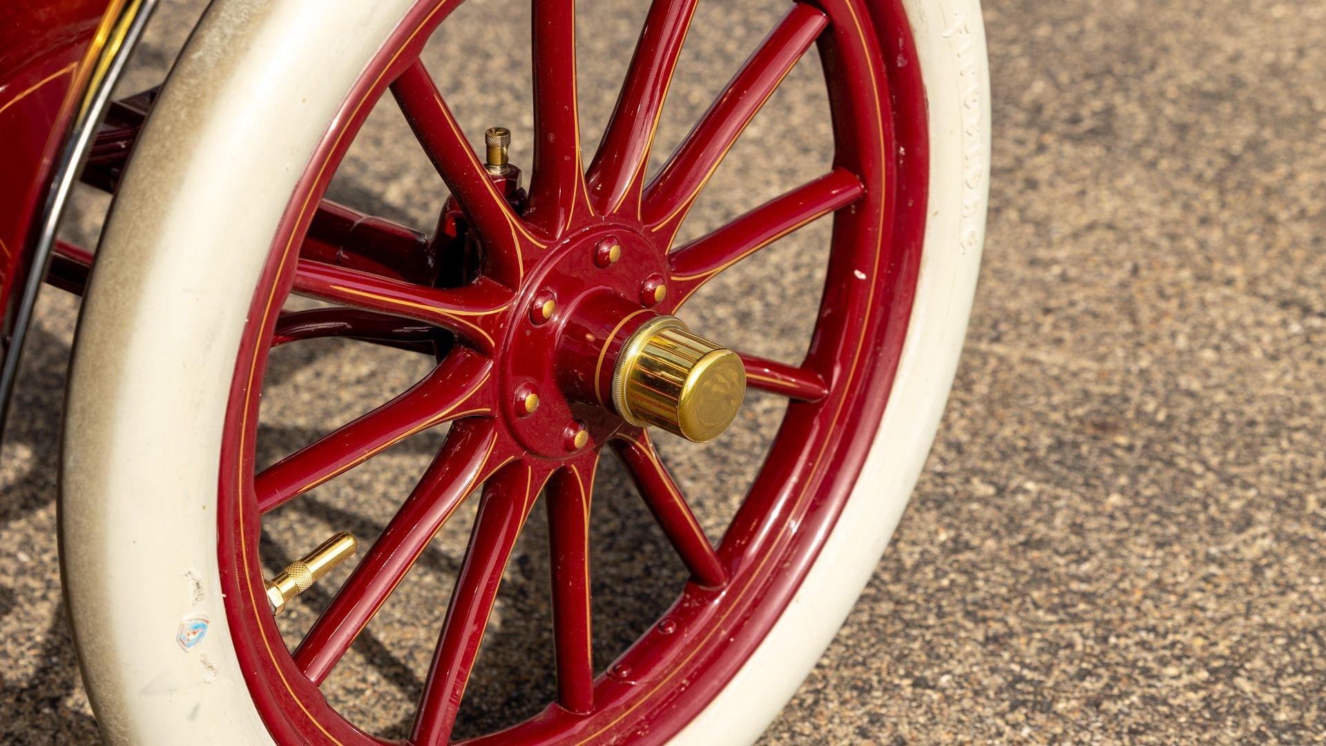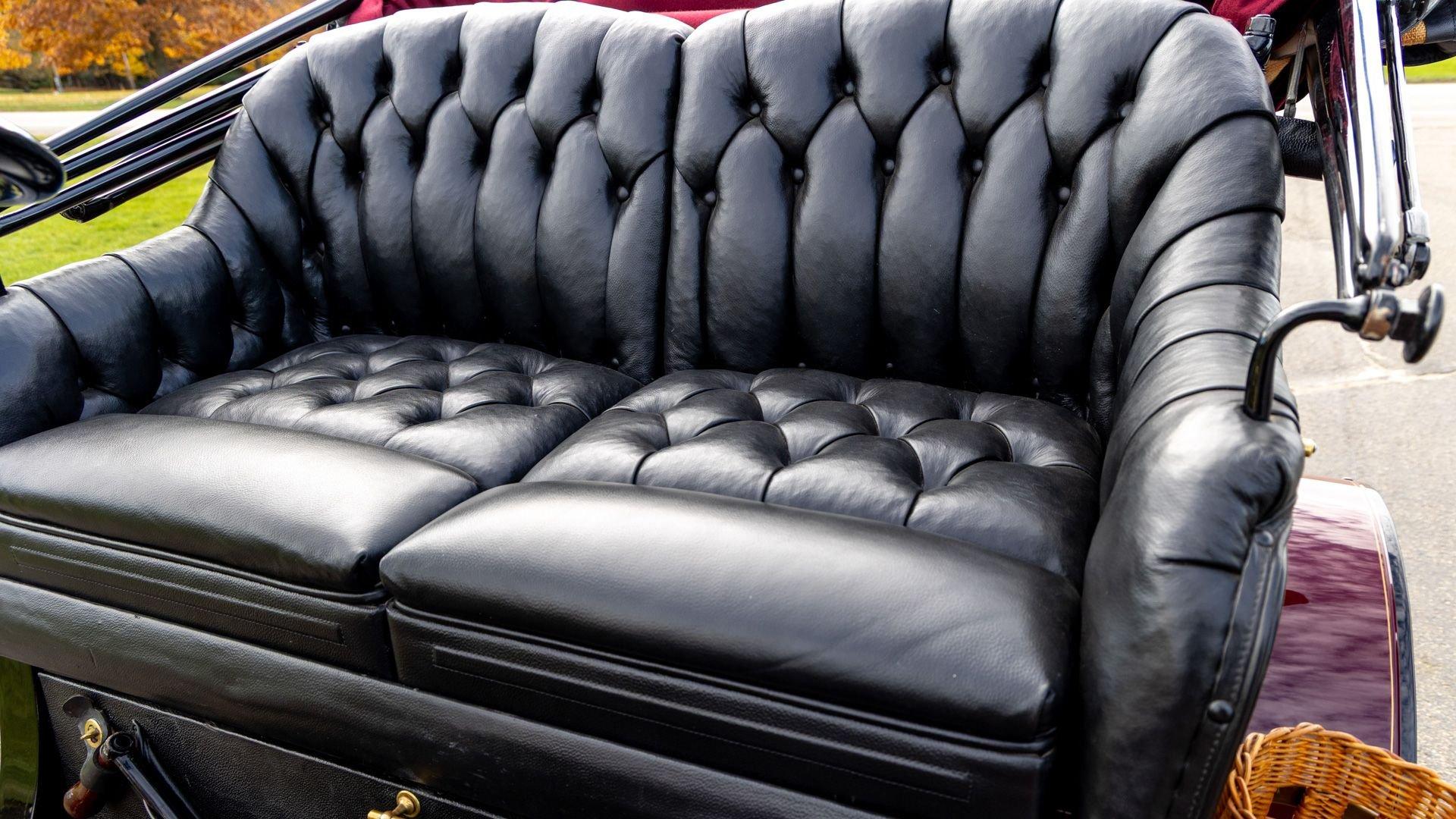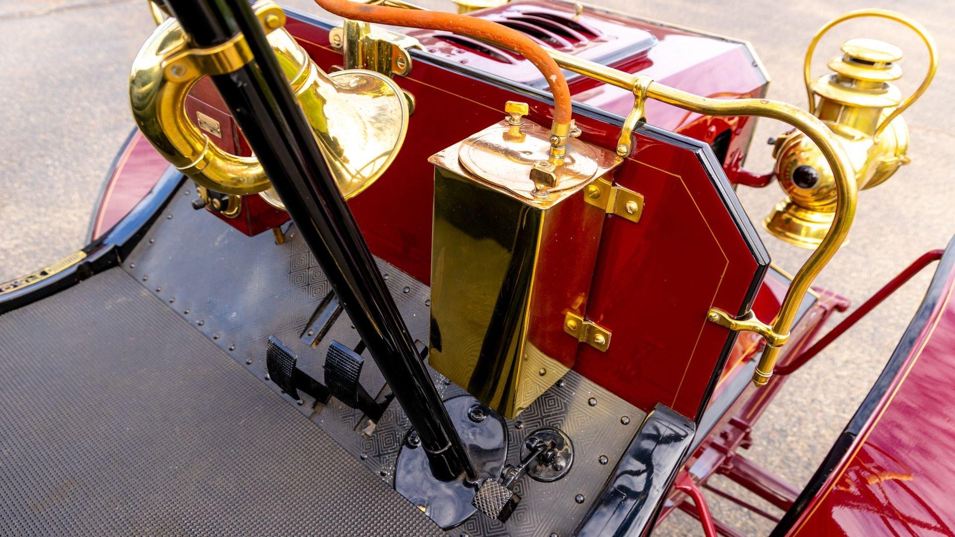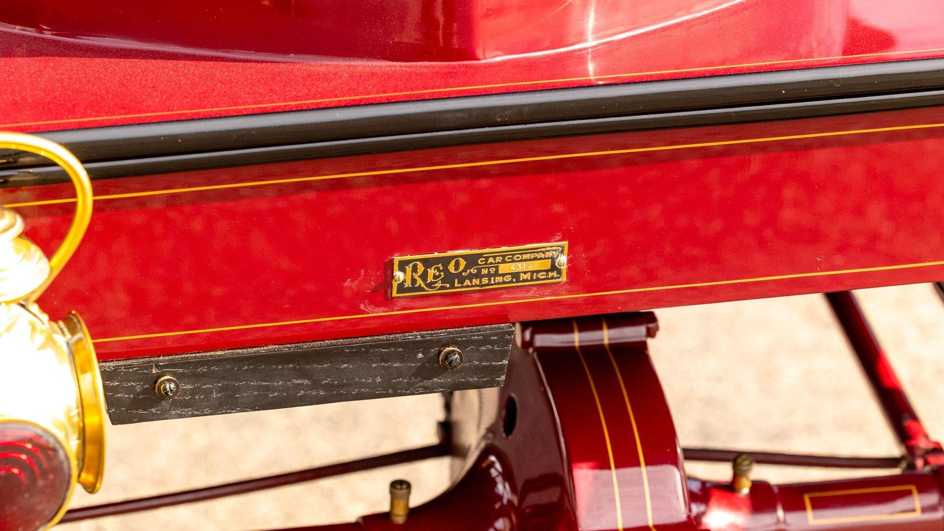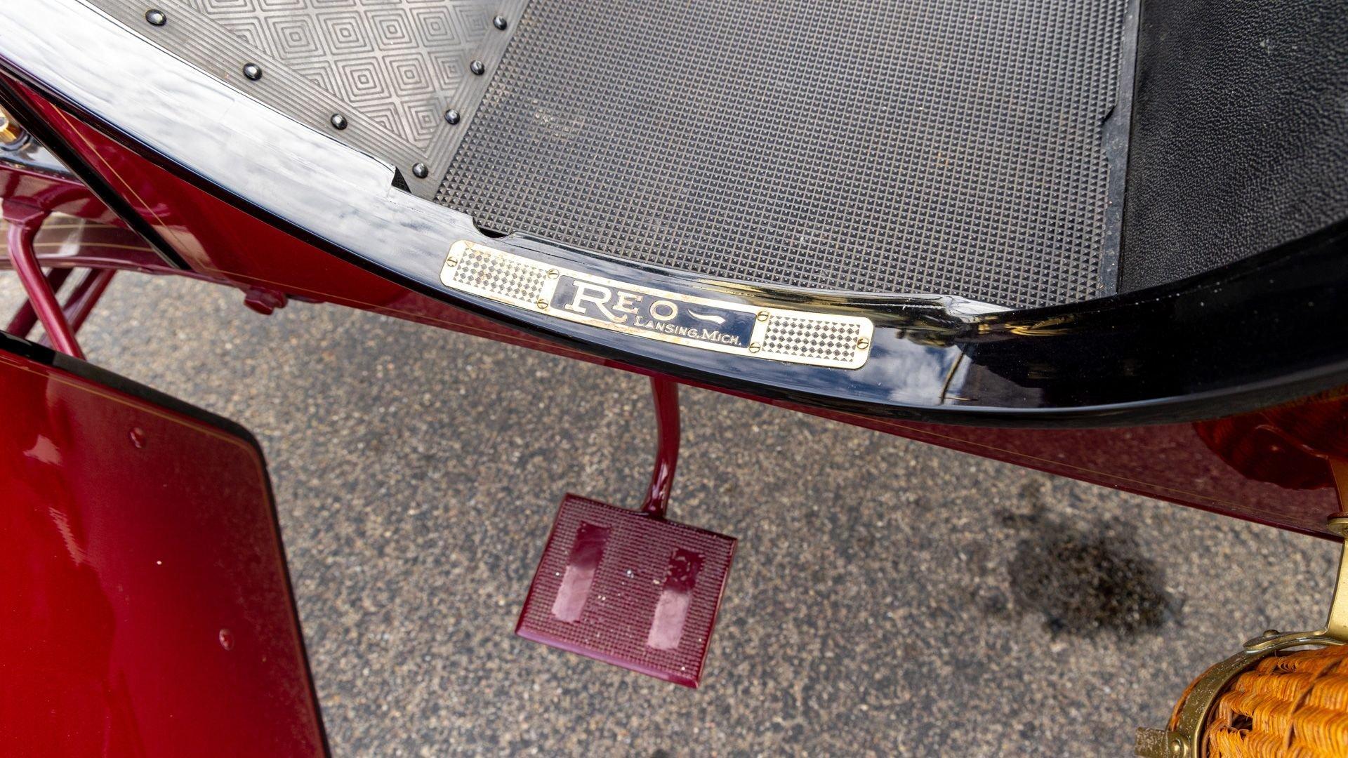 Reo's marketing called the Runabout a “pure and simple” design and this fully restored example in maroon with black trim and gold pinstriping certainly is that! The body's delicate, hand-painted pinstriping carries onto rear axle, leaf springs, fenders, and wood spoke body-color wheels and hub rivets shod with Firestone grey natural “Gum Dipped” rubber tires. Designed and built firmly in the middle of the Brass Era, The Reo's wood body is adorned with Dietz kerosene headlamps, a single Saxon carbide headlamp, kerosene taillamp, bulb horn, hand brake, and trim and hardware in brass. The individual curved back bench seat is trimmed in black button-tufted leather upholstery. A folding convertible top with a color-matched maroon wool headliner, along with an accessory wicker cone umbrella basket held by brass hardware is hung at the ready on the passenger side for use during foul weather. The Runabout's single-cylinder eight-horsepower chain-drive engine is fired by a hand crank held within a leather pouch.