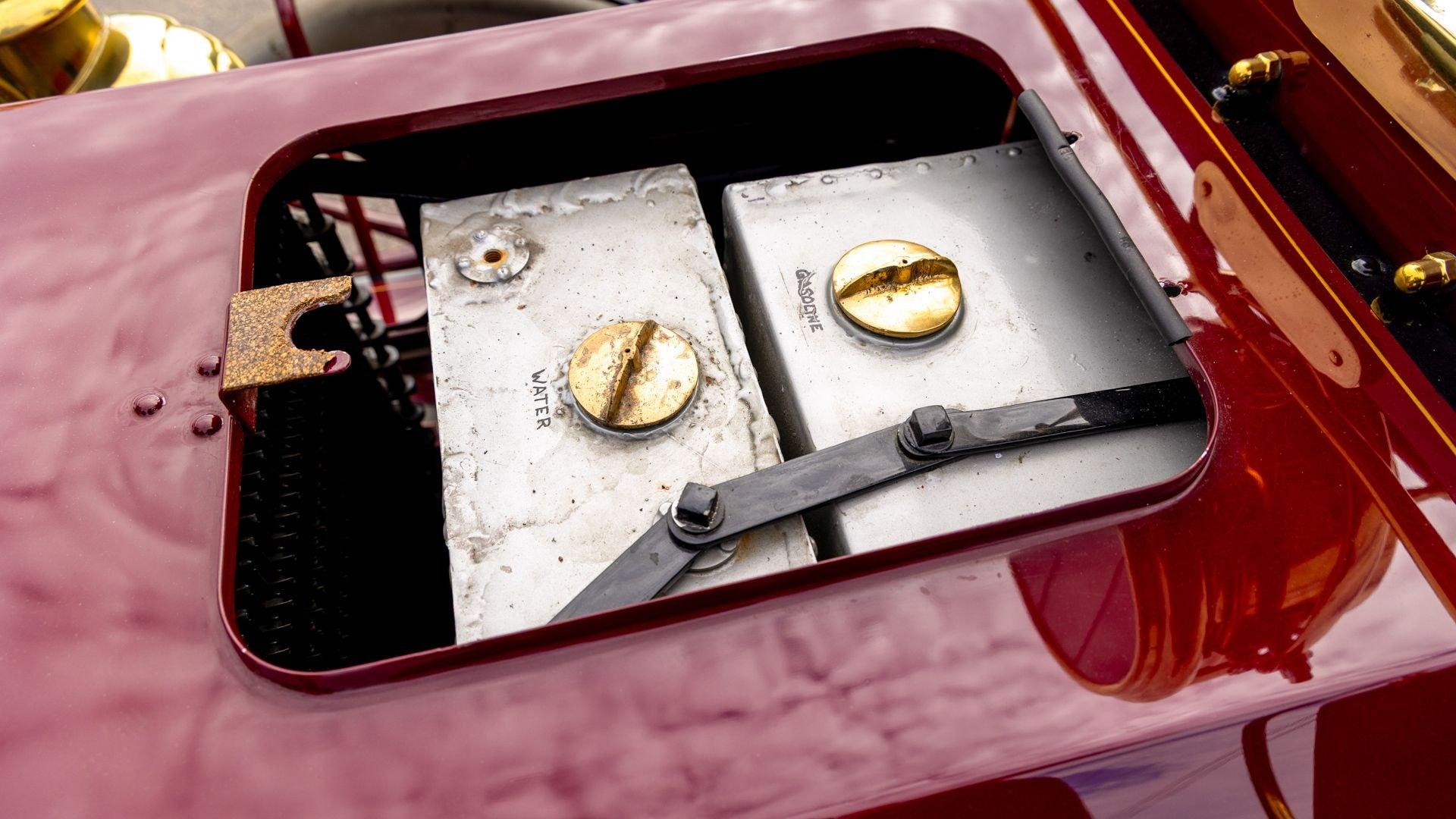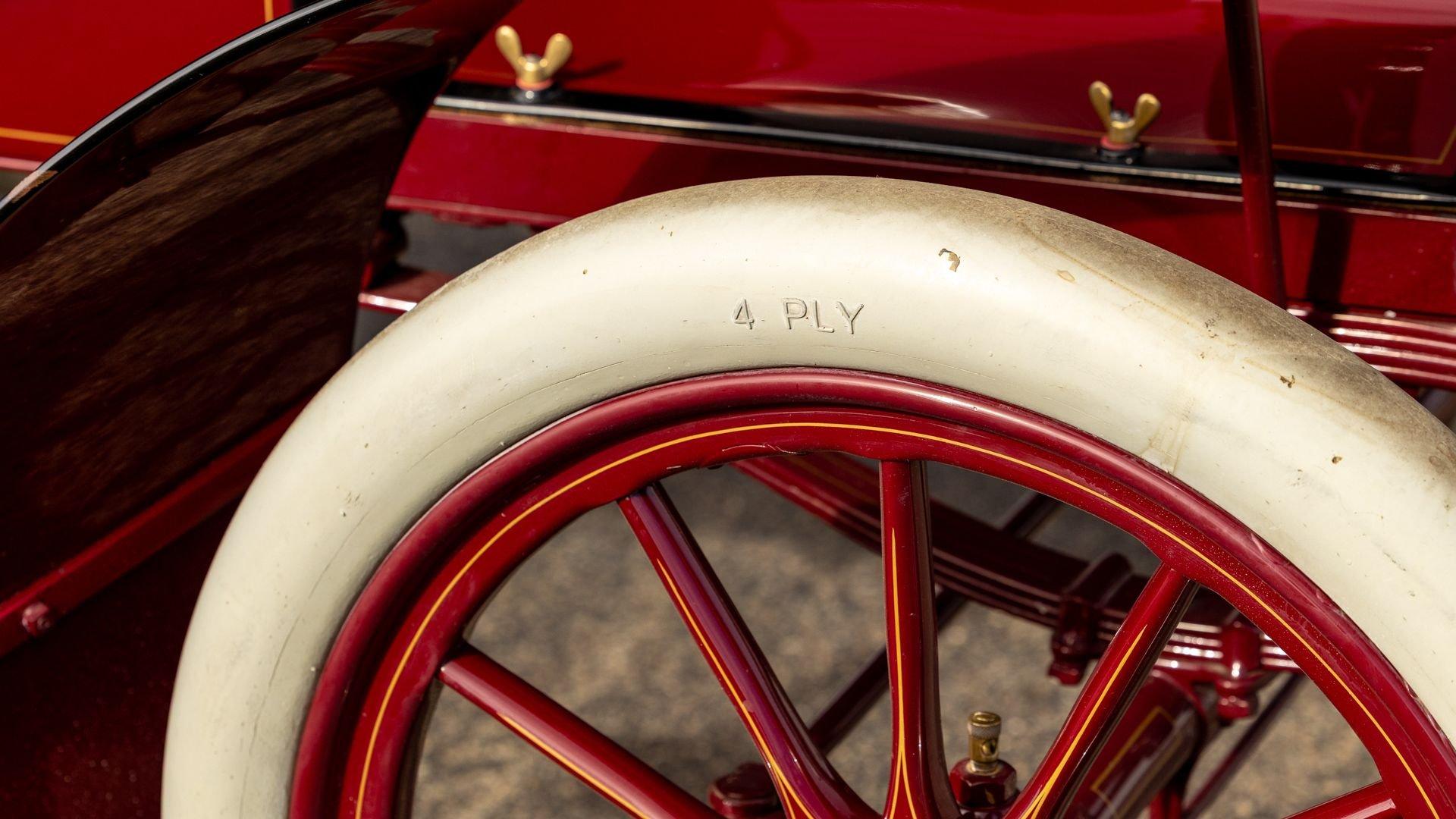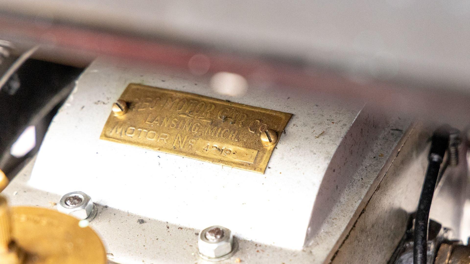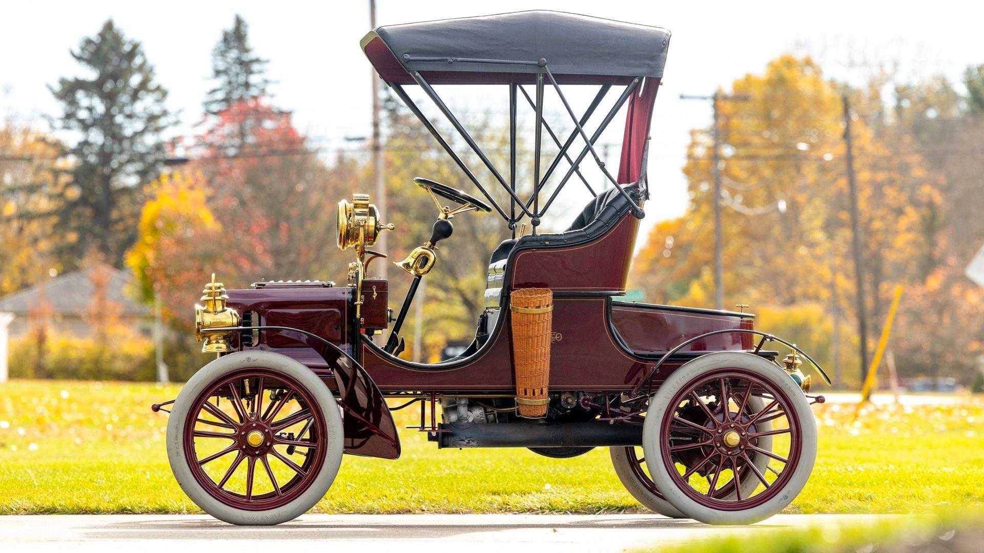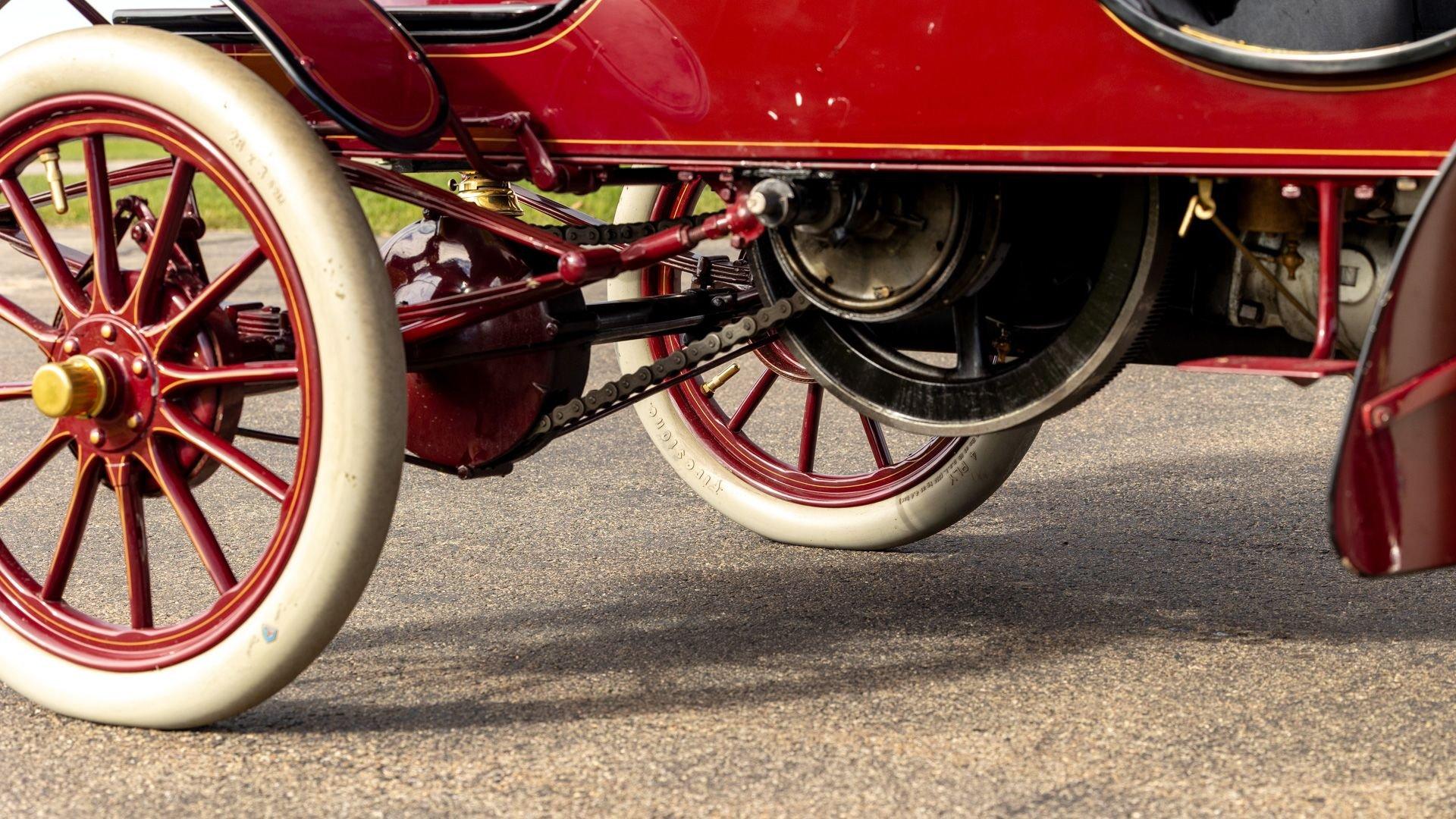 Reo's marketing called the Runabout a “pure and simple” design and this fully restored example in maroon with black trim and gold pinstriping certainly is that! The body's delicate, hand-painted pinstriping carries onto rear axle, leaf springs, fenders, and wood spoke body-color wheels and hub rivets shod with Firestone grey natural “Gum Dipped” rubber tires. Designed and built firmly in the middle of the Brass Era, The Reo's wood body is adorned with Dietz kerosene headlamps, a single Saxon carbide headlamp, kerosene taillamp, bulb horn, hand brake, and trim and hardware in brass. The individual curved back bench seat is trimmed in black button-tufted leather upholstery. A folding convertible top with a color-matched maroon wool headliner, along with an accessory wicker cone umbrella basket held by brass hardware is hung at the ready on the passenger side for use during foul weather. The Runabout's single-cylinder eight-horsepower chain-drive engine is fired by a hand crank held within a leather pouch.