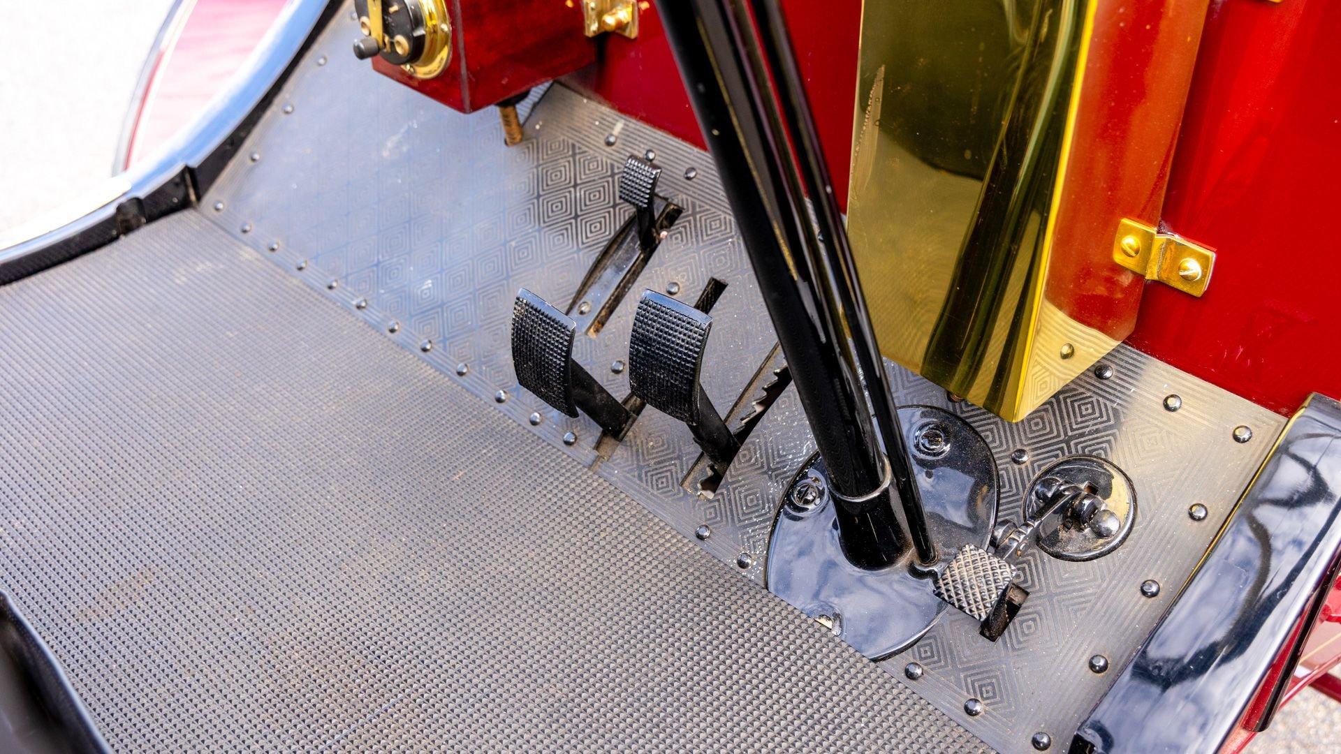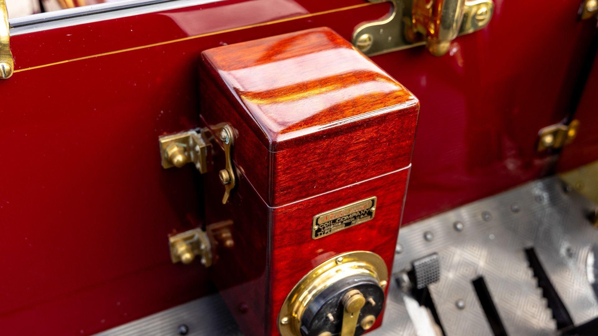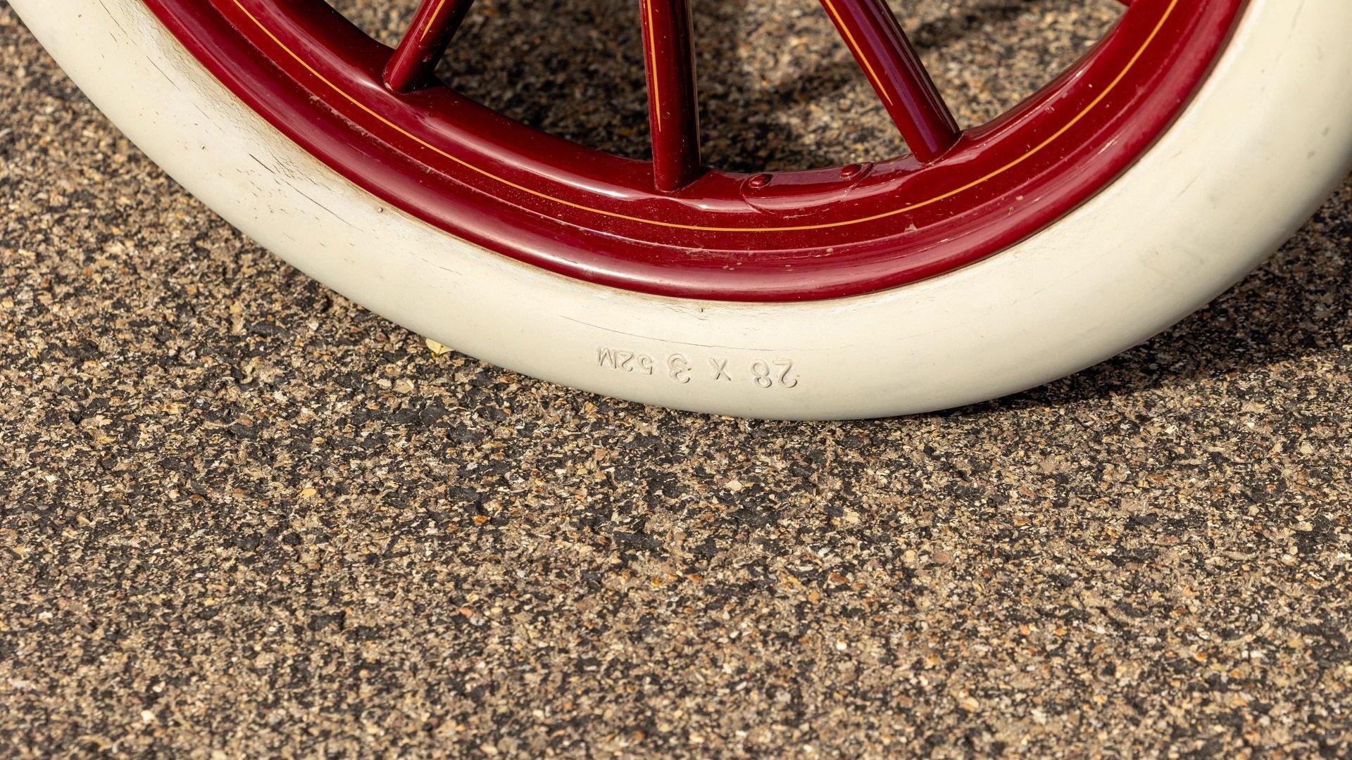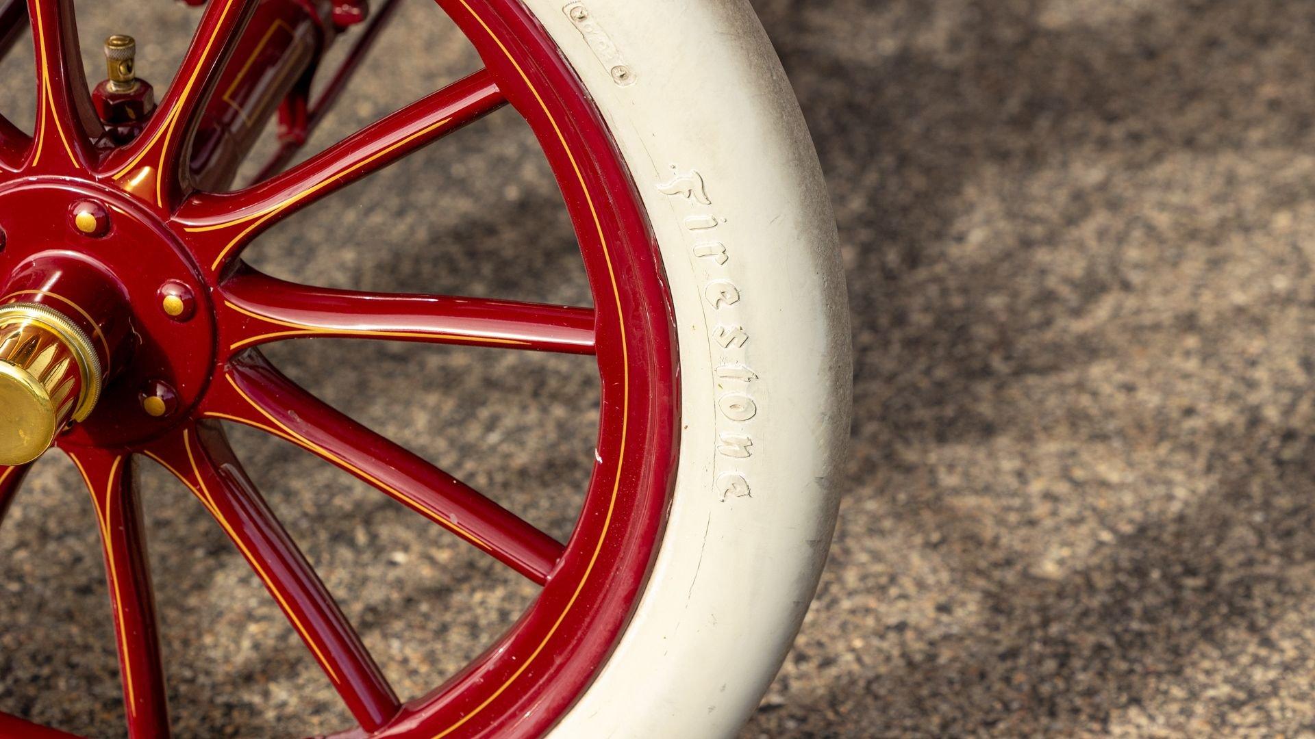 Reo's marketing called the Runabout a “pure and simple” design and this fully restored example in maroon with black trim and gold pinstriping certainly is that! The body's delicate, hand-painted pinstriping carries onto rear axle, leaf springs, fenders, and wood spoke body-color wheels and hub rivets shod with Firestone grey natural “Gum Dipped” rubber tires. Designed and built firmly in the middle of the Brass Era, The Reo's wood body is adorned with Dietz kerosene headlamps, a single Saxon carbide headlamp, kerosene taillamp, bulb horn, hand brake, and trim and hardware in brass. The individual curved back bench seat is trimmed in black button-tufted leather upholstery. A folding convertible top with a color-matched maroon wool headliner, along with an accessory wicker cone umbrella basket held by brass hardware is hung at the ready on the passenger side for use during foul weather. The Runabout's single-cylinder eight-horsepower chain-drive engine is fired by a hand crank held within a leather pouch.