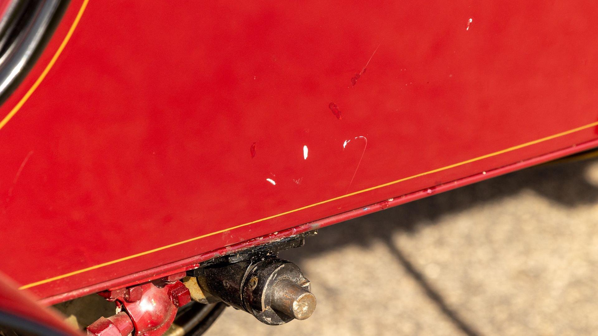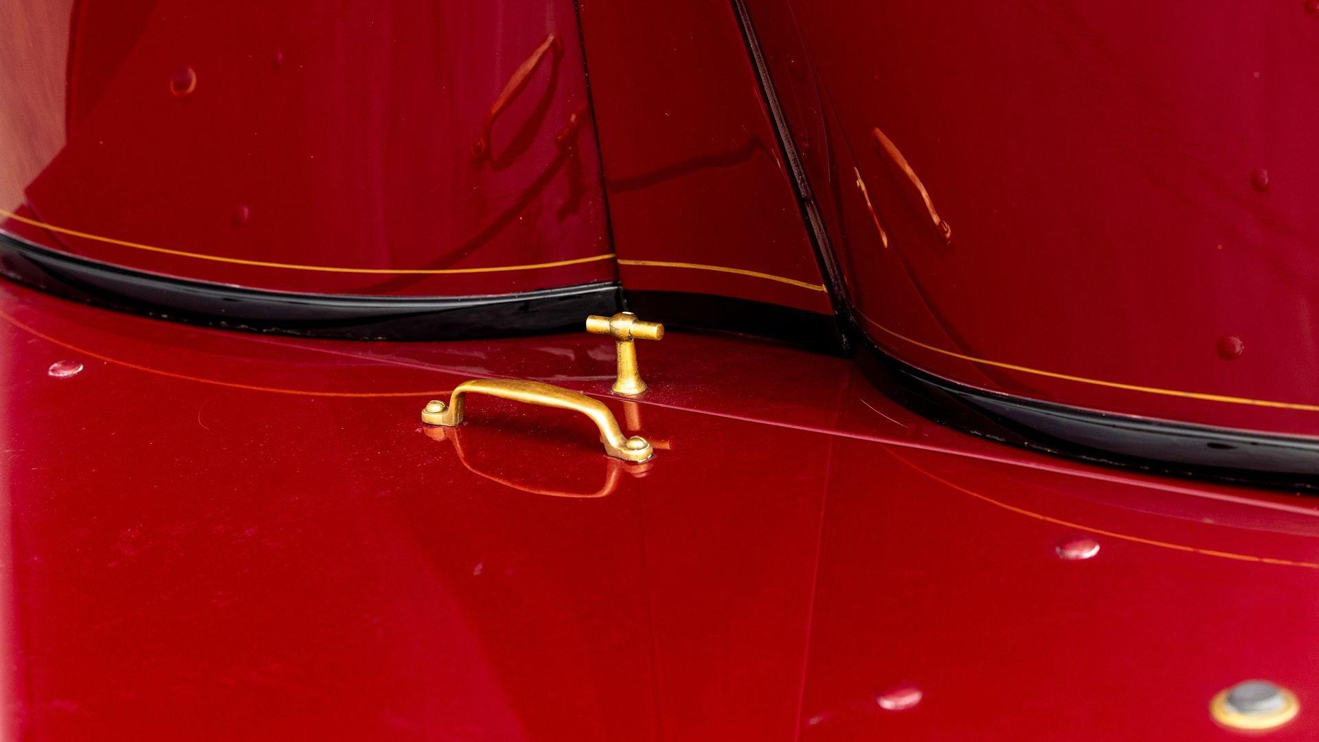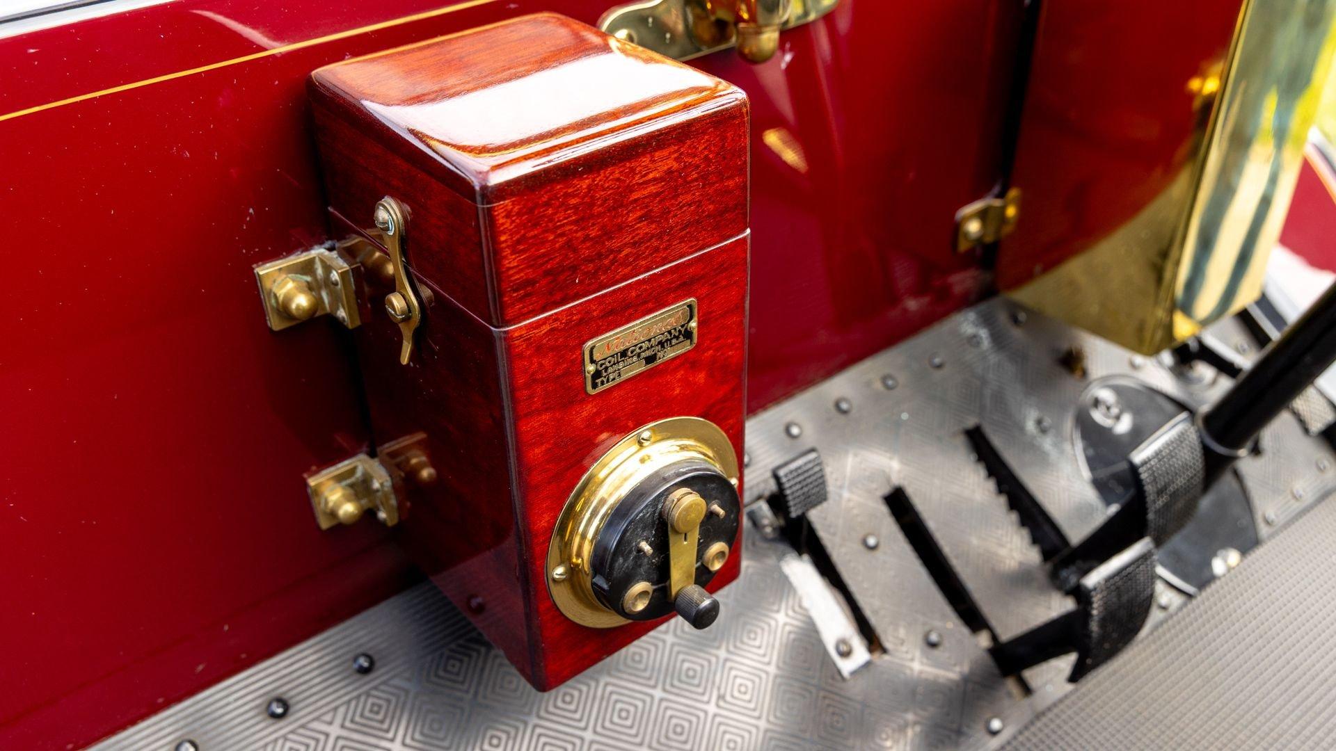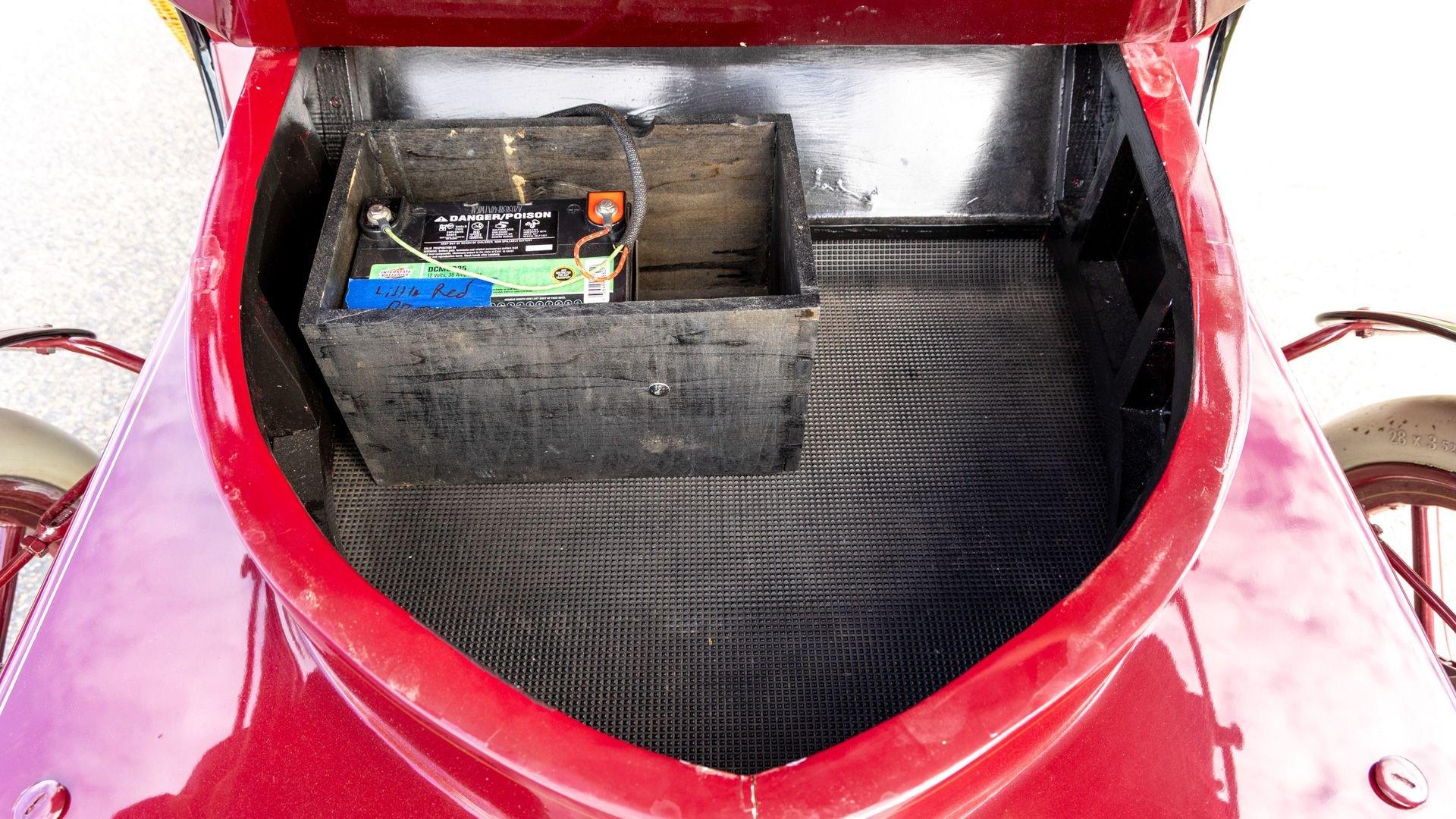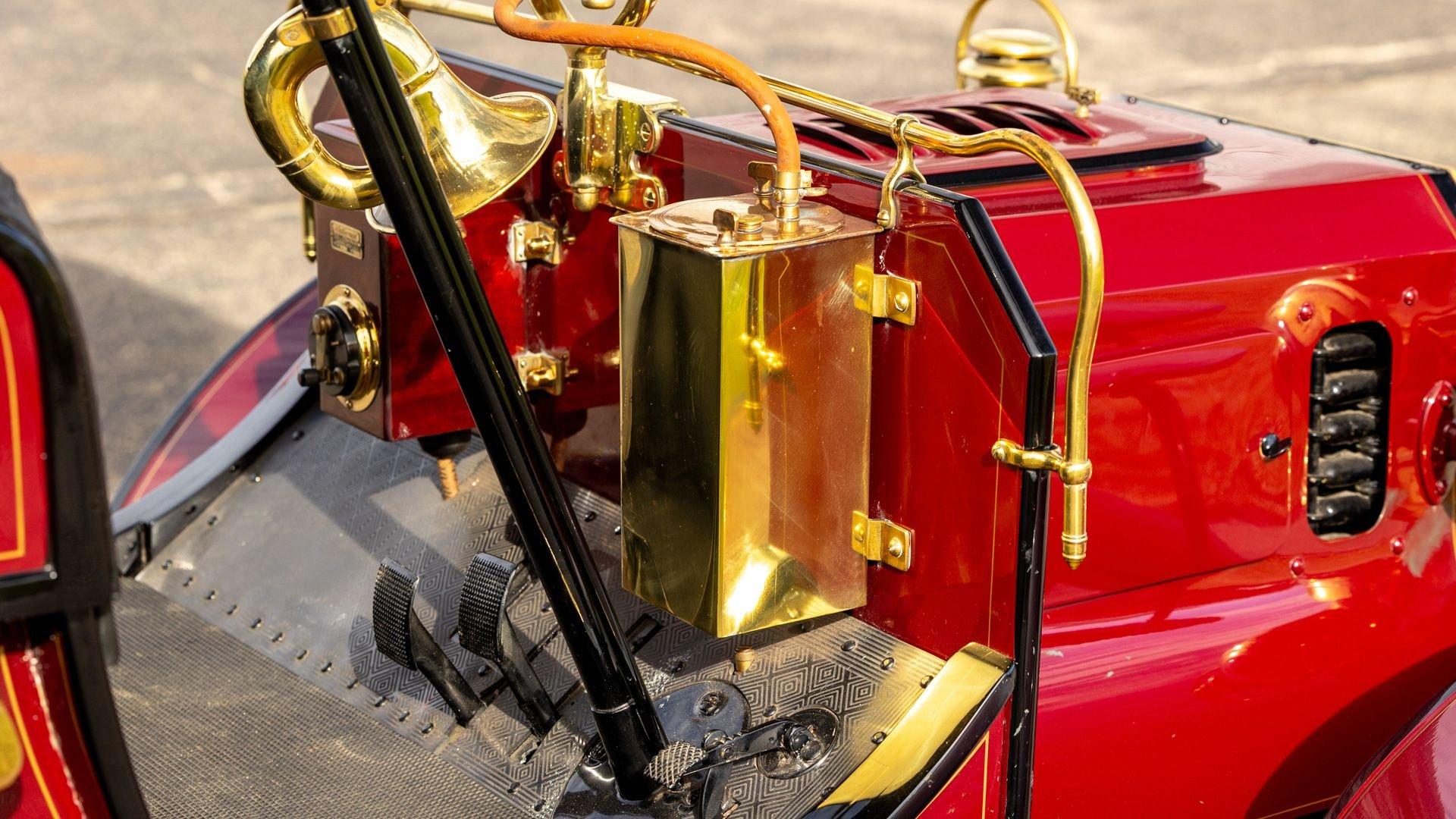 Reo's marketing called the Runabout a “pure and simple” design and this fully restored example in maroon with black trim and gold pinstriping certainly is that! The body's delicate, hand-painted pinstriping carries onto rear axle, leaf springs, fenders, and wood spoke body-color wheels and hub rivets shod with Firestone grey natural “Gum Dipped” rubber tires. Designed and built firmly in the middle of the Brass Era, The Reo's wood body is adorned with Dietz kerosene headlamps, a single Saxon carbide headlamp, kerosene taillamp, bulb horn, hand brake, and trim and hardware in brass. The individual curved back bench seat is trimmed in black button-tufted leather upholstery. A folding convertible top with a color-matched maroon wool headliner, along with an accessory wicker cone umbrella basket held by brass hardware is hung at the ready on the passenger side for use during foul weather. The Runabout's single-cylinder eight-horsepower chain-drive engine is fired by a hand crank held within a leather pouch.