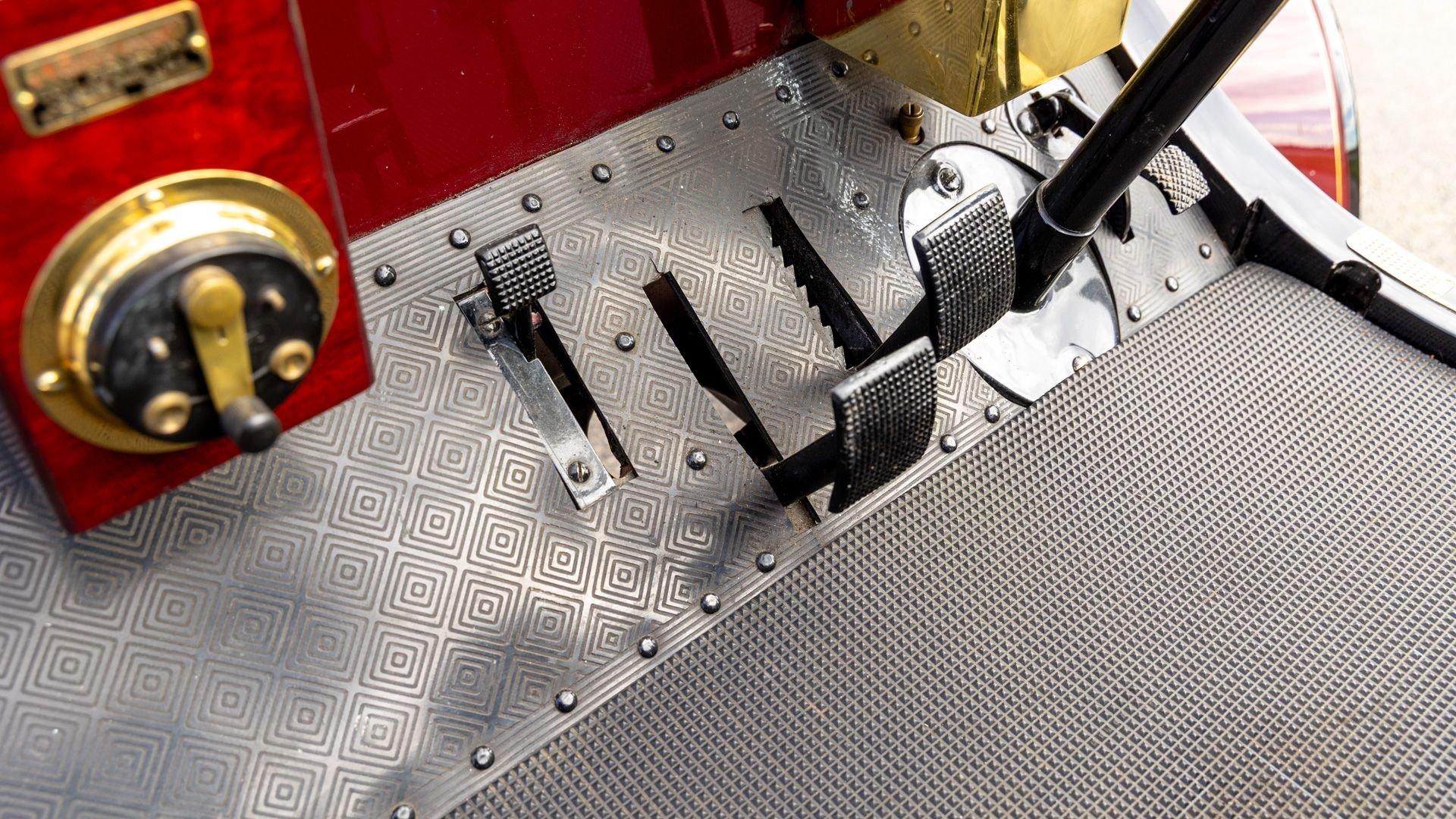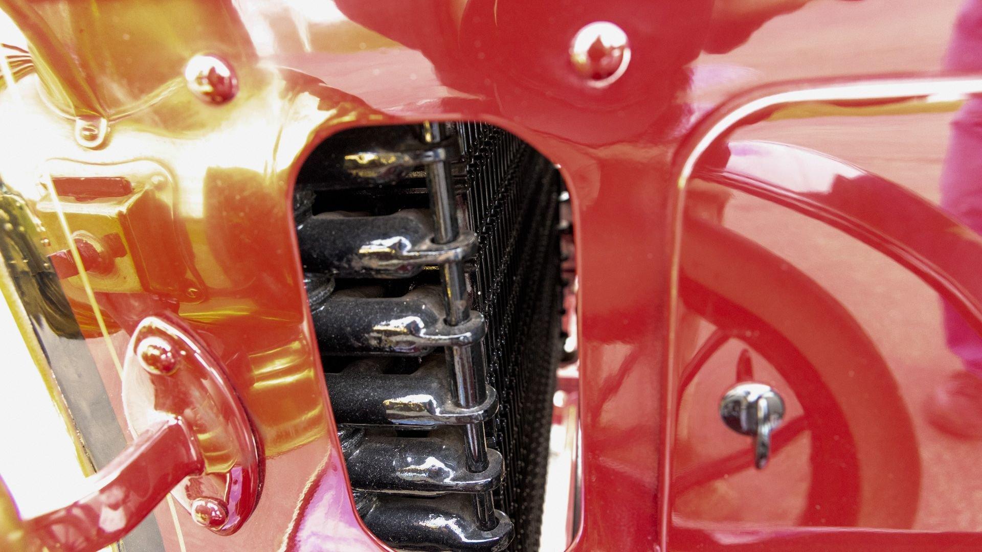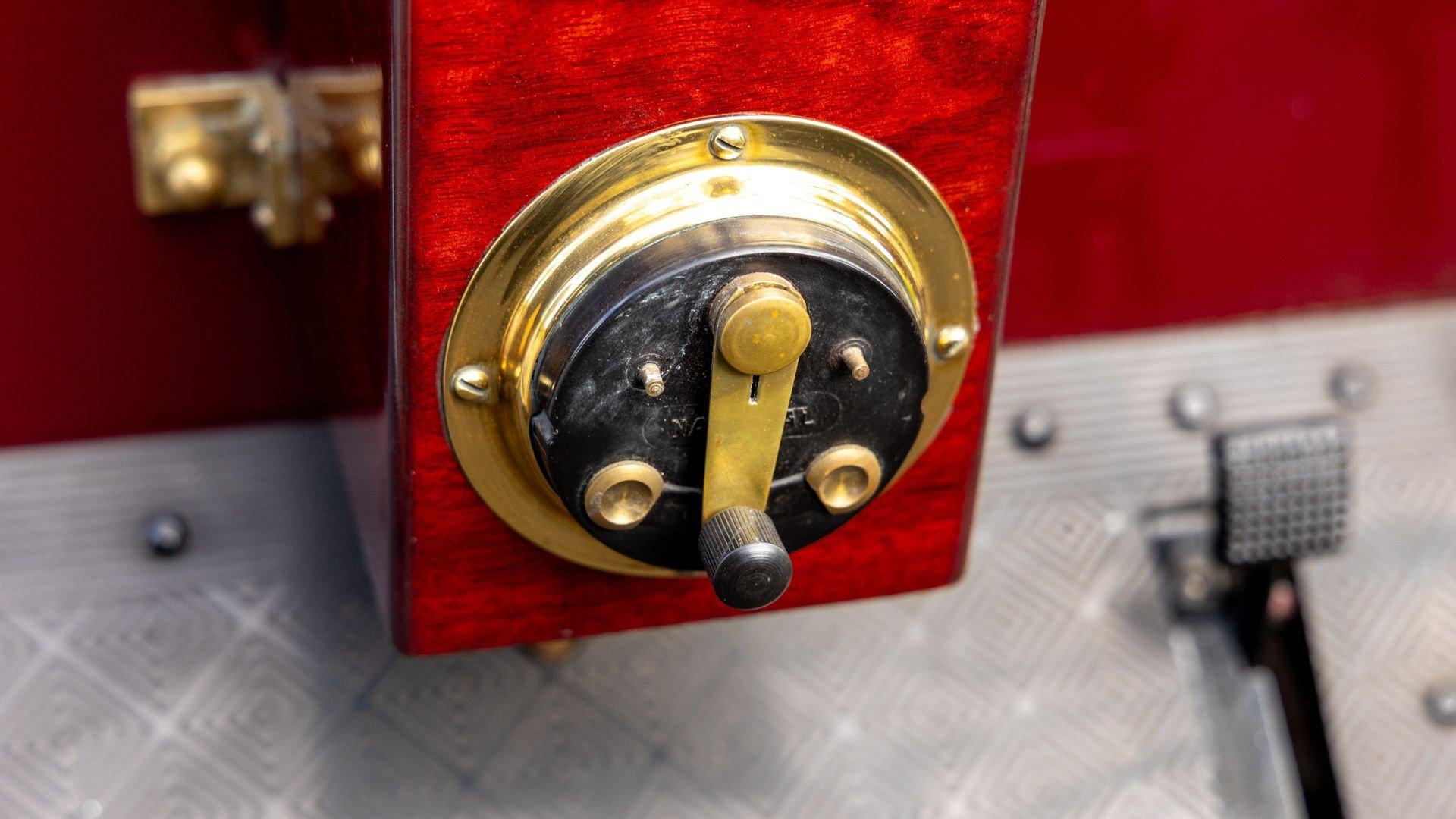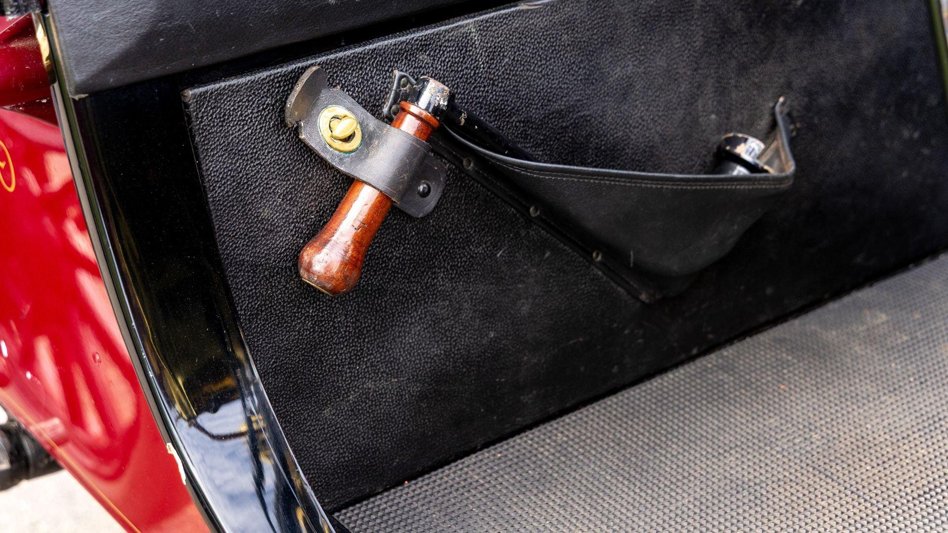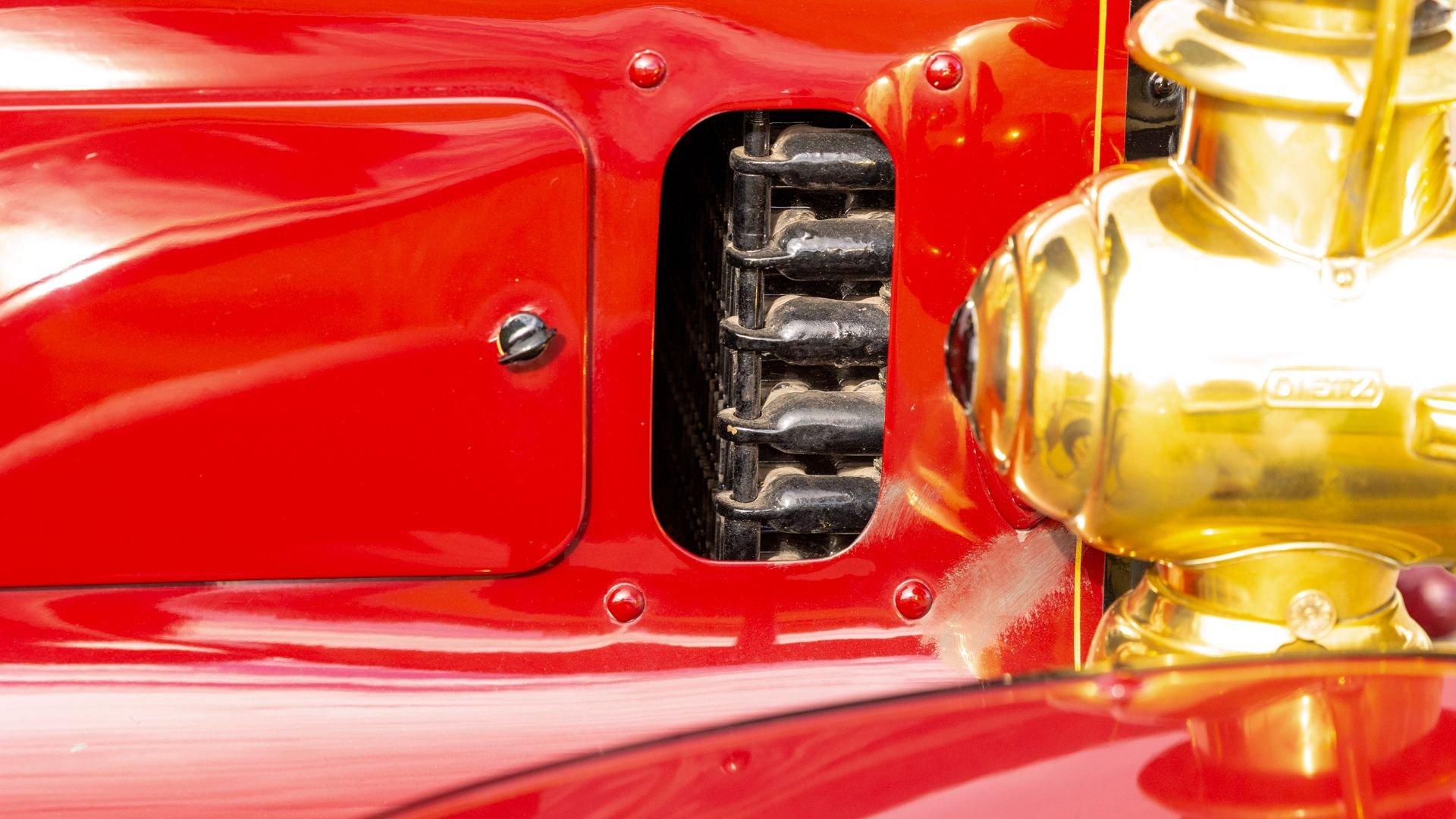 Reo's marketing called the Runabout a “pure and simple” design and this fully restored example in maroon with black trim and gold pinstriping certainly is that! The body's delicate, hand-painted pinstriping carries onto rear axle, leaf springs, fenders, and wood spoke body-color wheels and hub rivets shod with Firestone grey natural “Gum Dipped” rubber tires. Designed and built firmly in the middle of the Brass Era, The Reo's wood body is adorned with Dietz kerosene headlamps, a single Saxon carbide headlamp, kerosene taillamp, bulb horn, hand brake, and trim and hardware in brass. The individual curved back bench seat is trimmed in black button-tufted leather upholstery. A folding convertible top with a color-matched maroon wool headliner, along with an accessory wicker cone umbrella basket held by brass hardware is hung at the ready on the passenger side for use during foul weather. The Runabout's single-cylinder eight-horsepower chain-drive engine is fired by a hand crank held within a leather pouch.