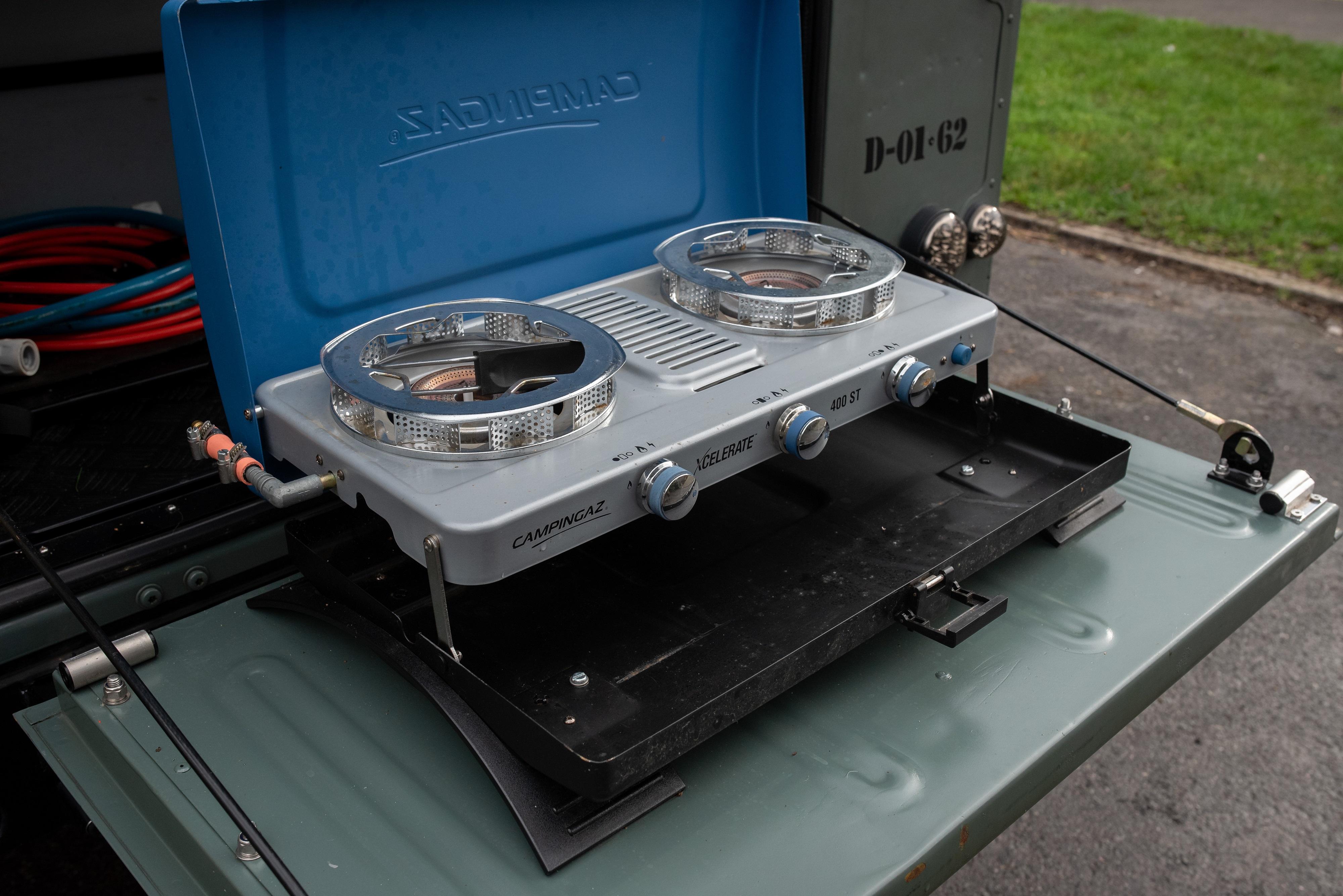 Camping cooker with 2 gas rings which provides for outdoor cooking convenience.