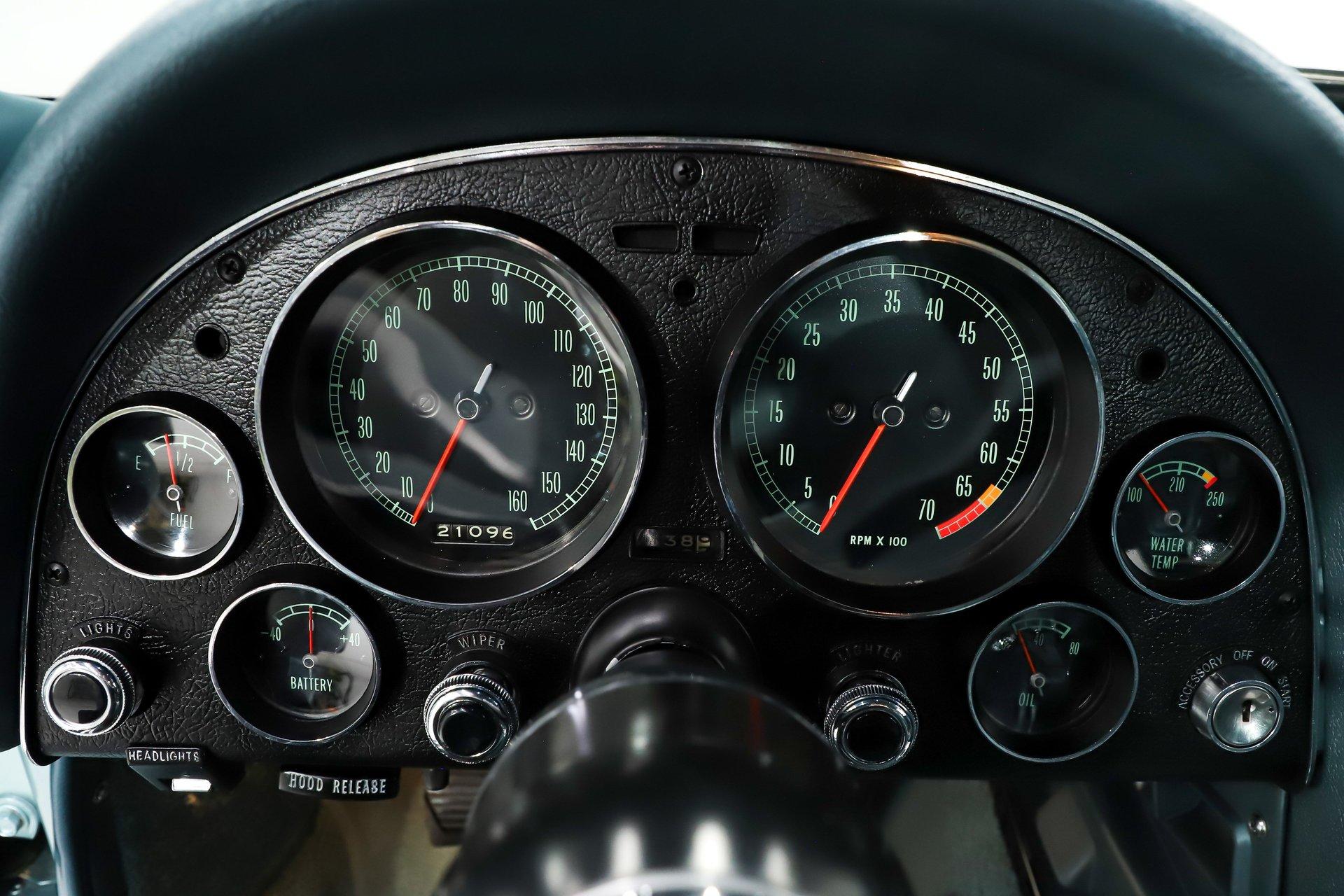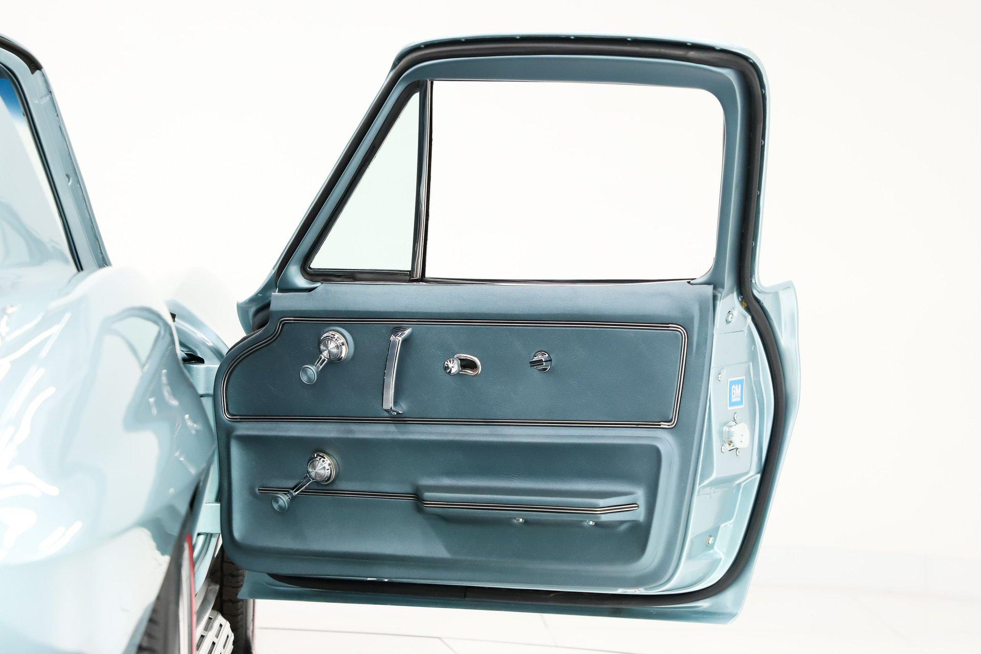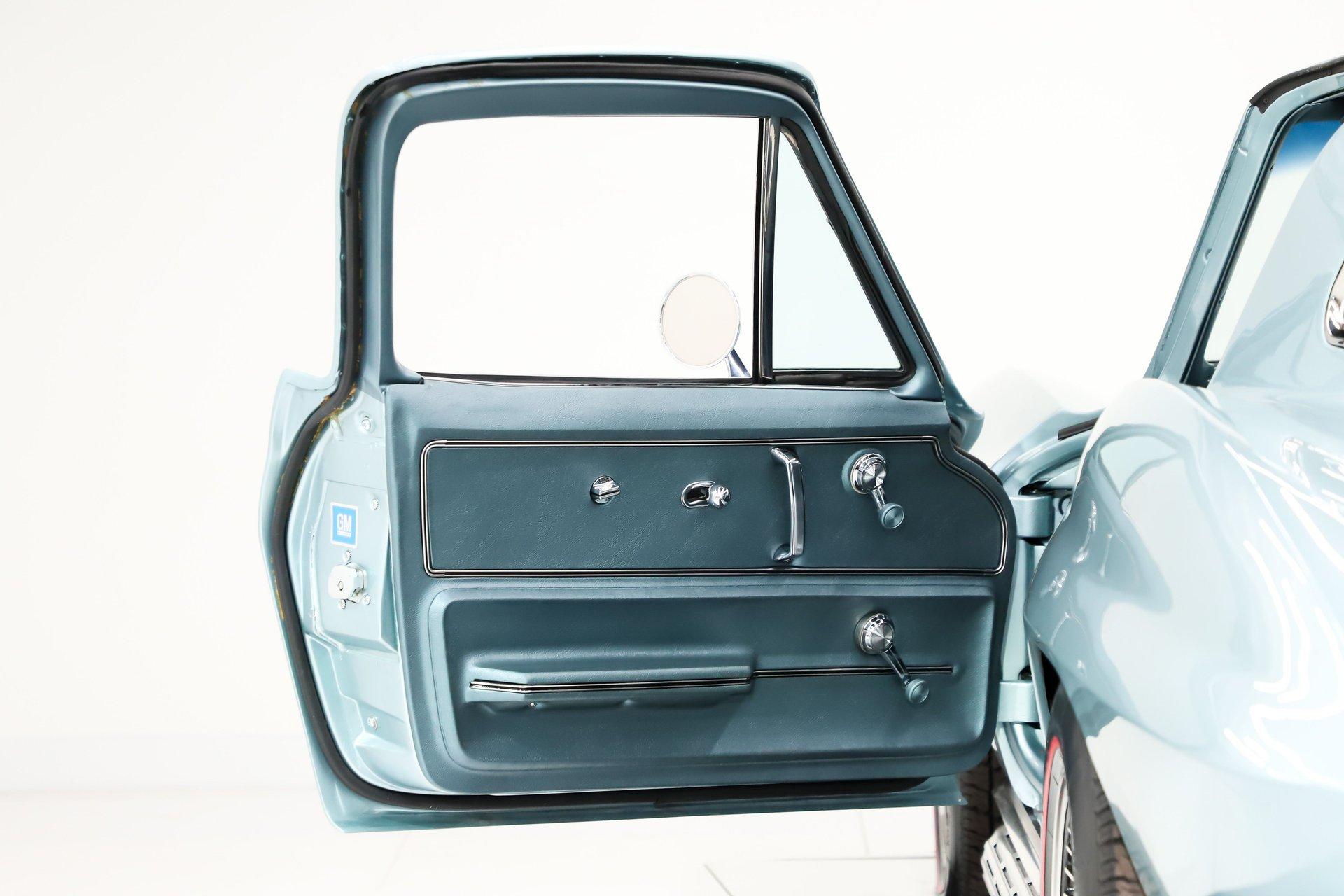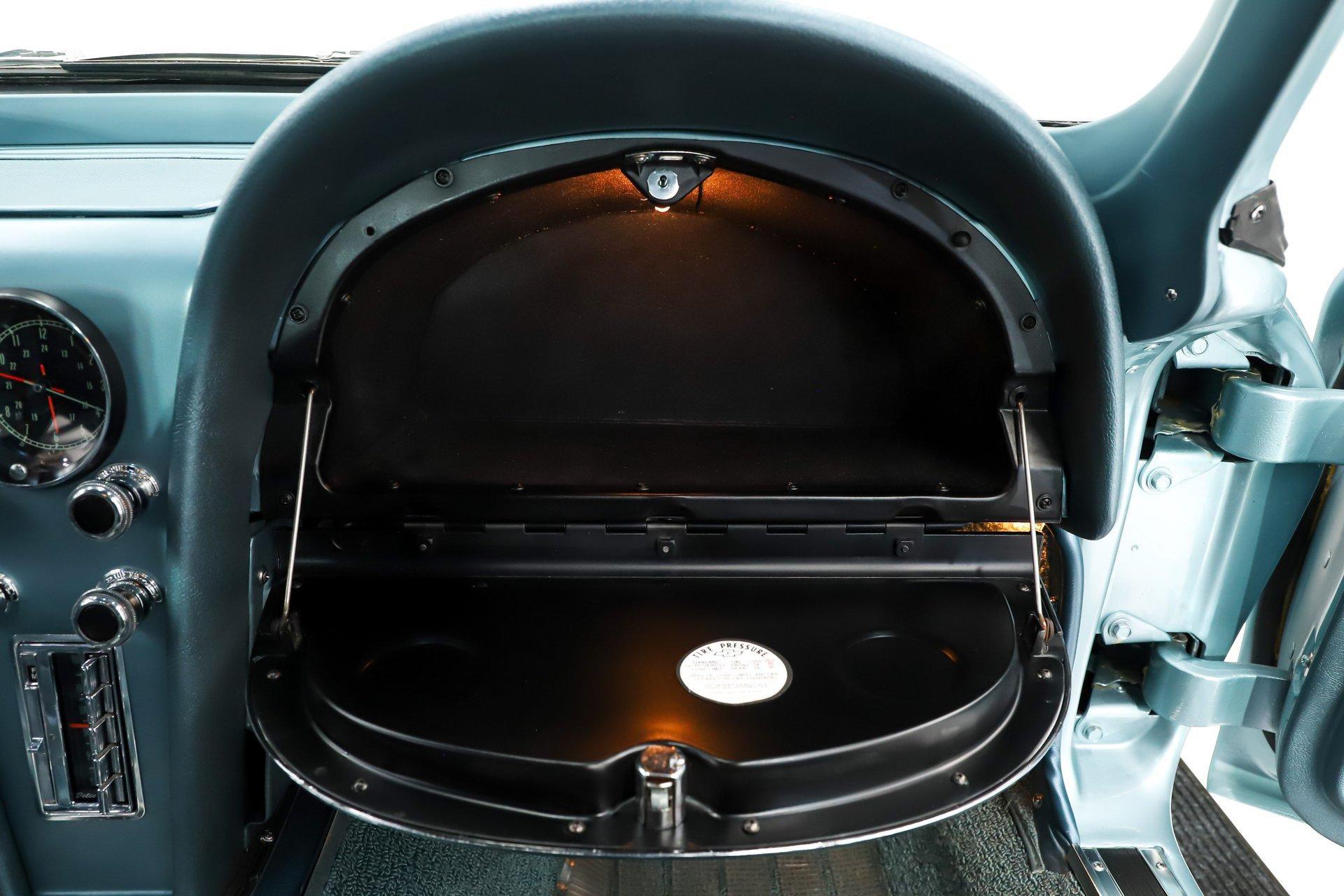 EXTERIOR: I'm in love! This incredible Corvette coupe design with the boattail rear and stinger hood is further enhanced in its original Elkhart Blue color. It's absolutely gorgeous, the color shimmers showing off the beautiful curves. The Lynndale Blue stinger stripe is first class. The body is in pristine shape, I didn't find any damage or cracking and everything fits square and flush. You can close the doors with one finger, the headlights open and close properly. All of the chrome was replaced, the stainless trim is polished like chrome. It has all new date coded and tinted reproduction glass. The jambs are even detailed with new latches, weatherstrips and sill plates. The side exhaust looks great and sounds even greater! It's rolling on a set of 15 inch aluminum bolt-on wheels wrapped in Coker radial red line tires.