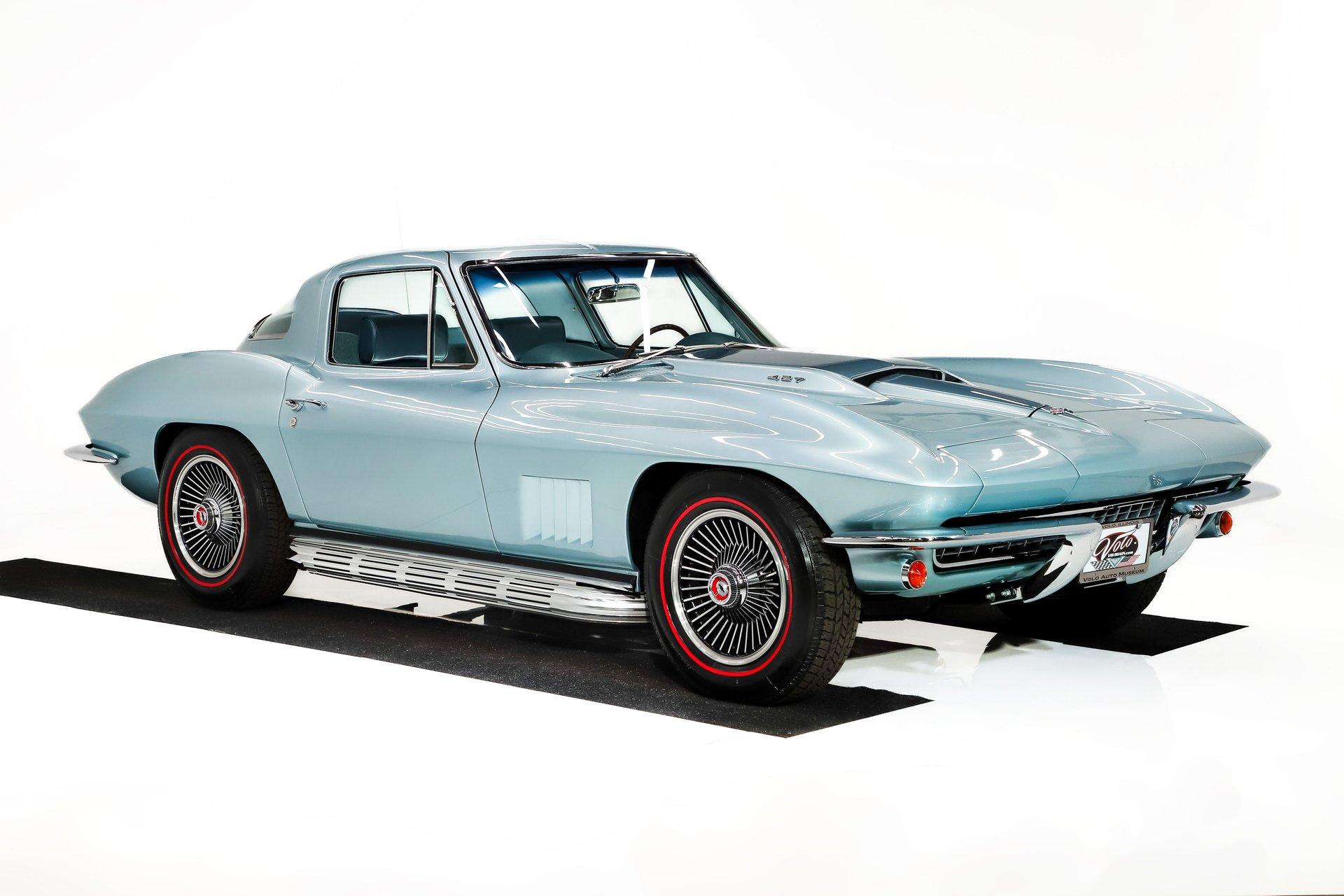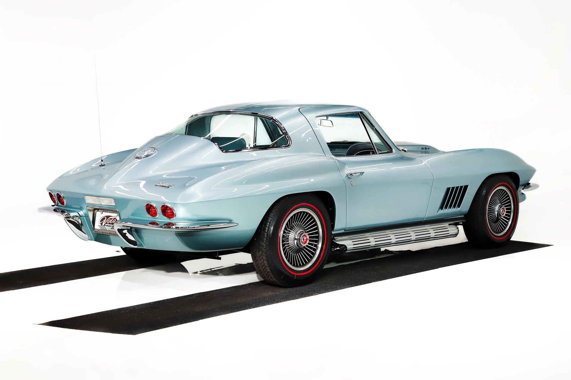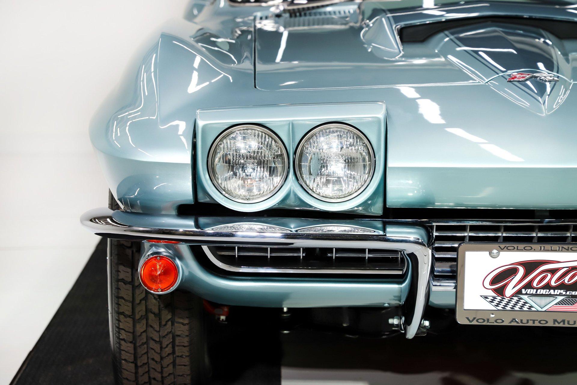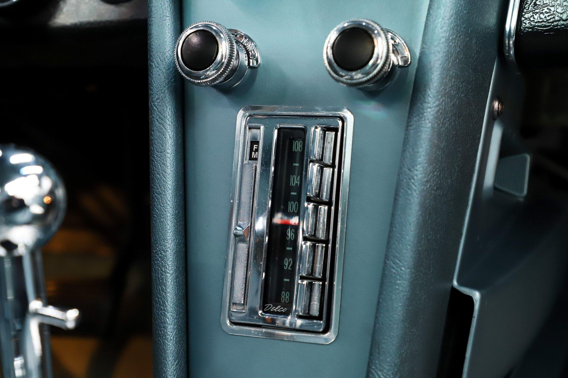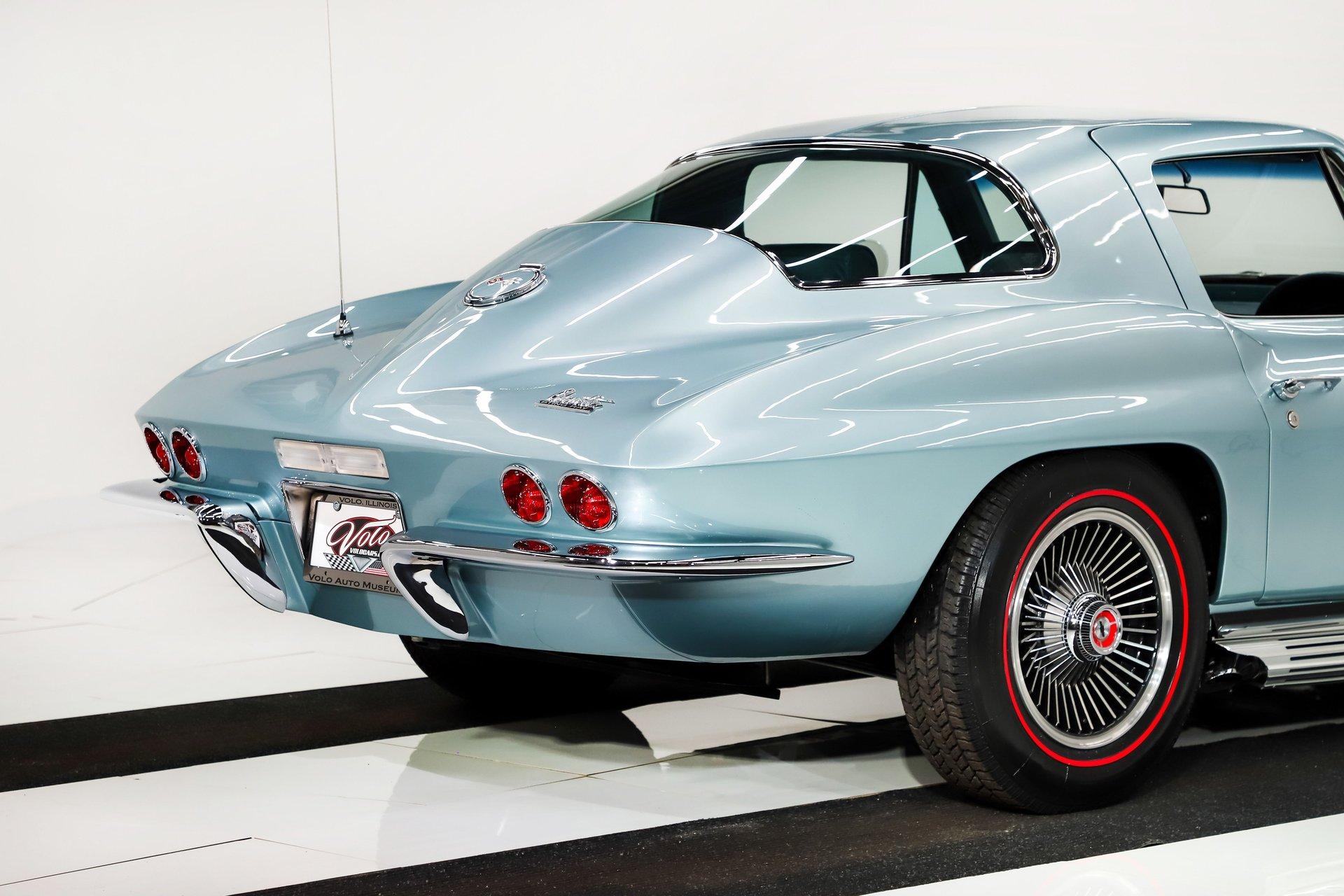 EXTERIOR: I'm in love! This incredible Corvette coupe design with the boattail rear and stinger hood is further enhanced in its original Elkhart Blue color. It's absolutely gorgeous, the color shimmers showing off the beautiful curves. The Lynndale Blue stinger stripe is first class. The body is in pristine shape, I didn't find any damage or cracking and everything fits square and flush. You can close the doors with one finger, the headlights open and close properly. All of the chrome was replaced, the stainless trim is polished like chrome. It has all new date coded and tinted reproduction glass. The jambs are even detailed with new latches, weatherstrips and sill plates. The side exhaust looks great and sounds even greater! It's rolling on a set of 15 inch aluminum bolt-on wheels wrapped in Coker radial red line tires.