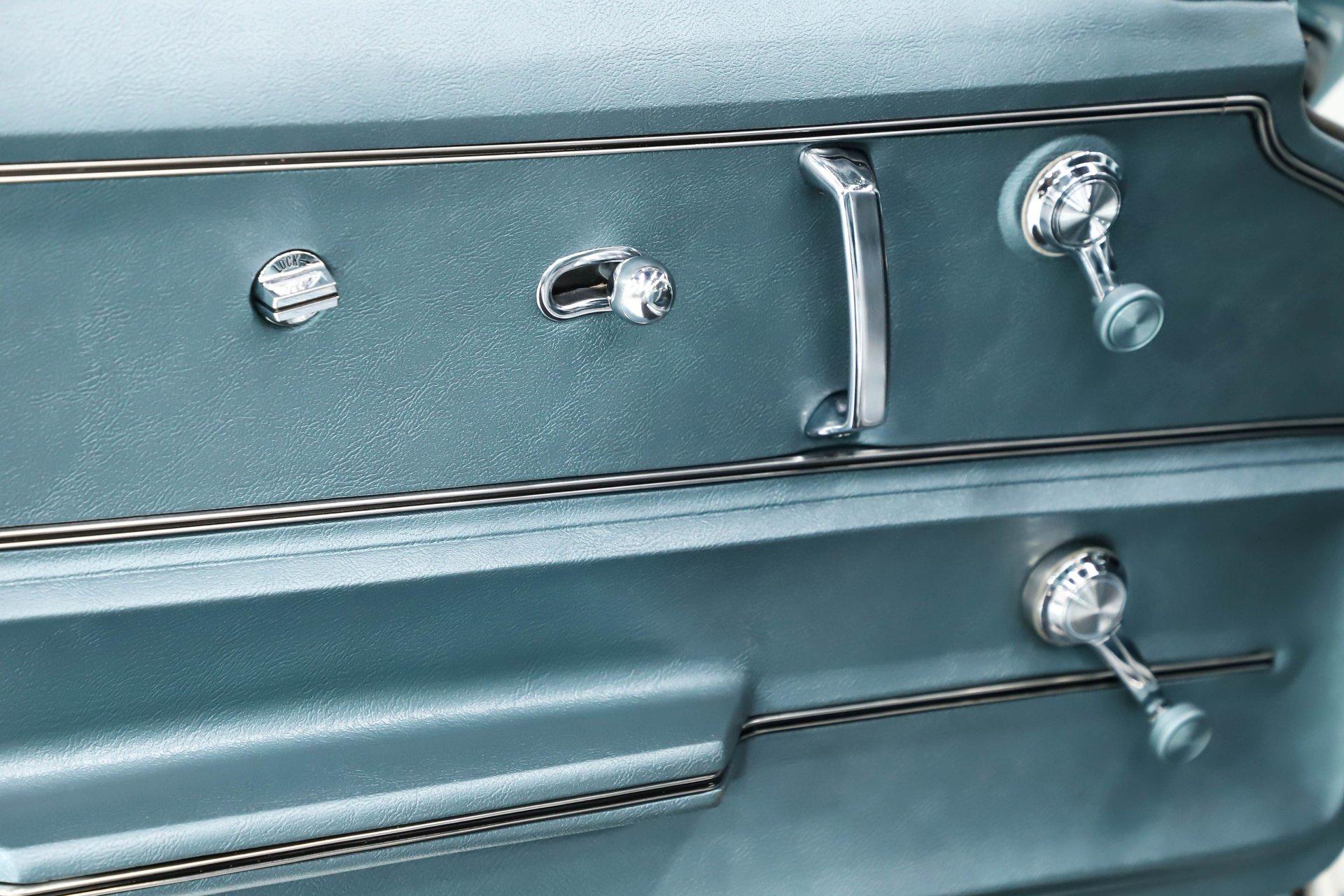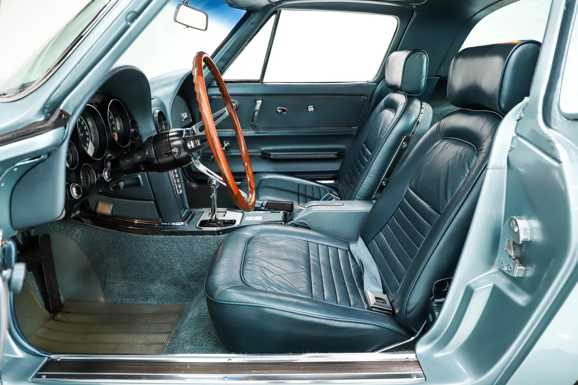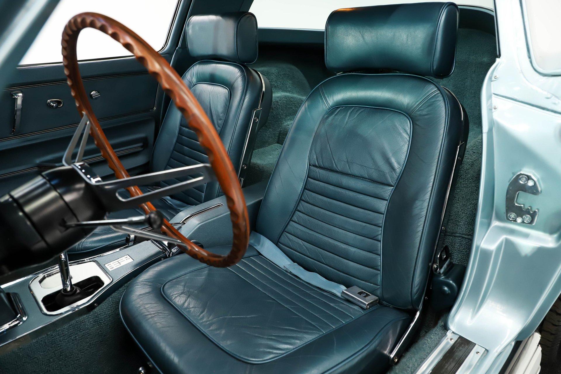 INTERIOR: The interior lives up to the exterior! Beautiful factory teal blue color, the seats were upgraded to genuine leather including on the optional headrests. The carpet looks fresh front to back and has reproduction mats. It even has reproduction seat belts dated 1967. The door panels, knobs and handles look new. The entire dash area is mint! Dash pads, glovebox door, and gauges all look like new. It has the correct 6,500 redline tachometer and quartz movement in the clock. Everything works including the factory AM/FM radio and interior lights. The console is mint and is home to the correct 4-speed shifter. It has an optional teakwood steering wheel and the glovebox is complete with the pouch and manuals. Overhead the headliner, visors and mirror look new.