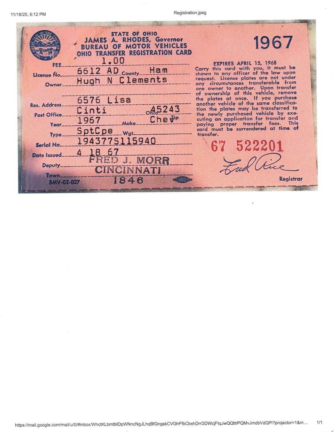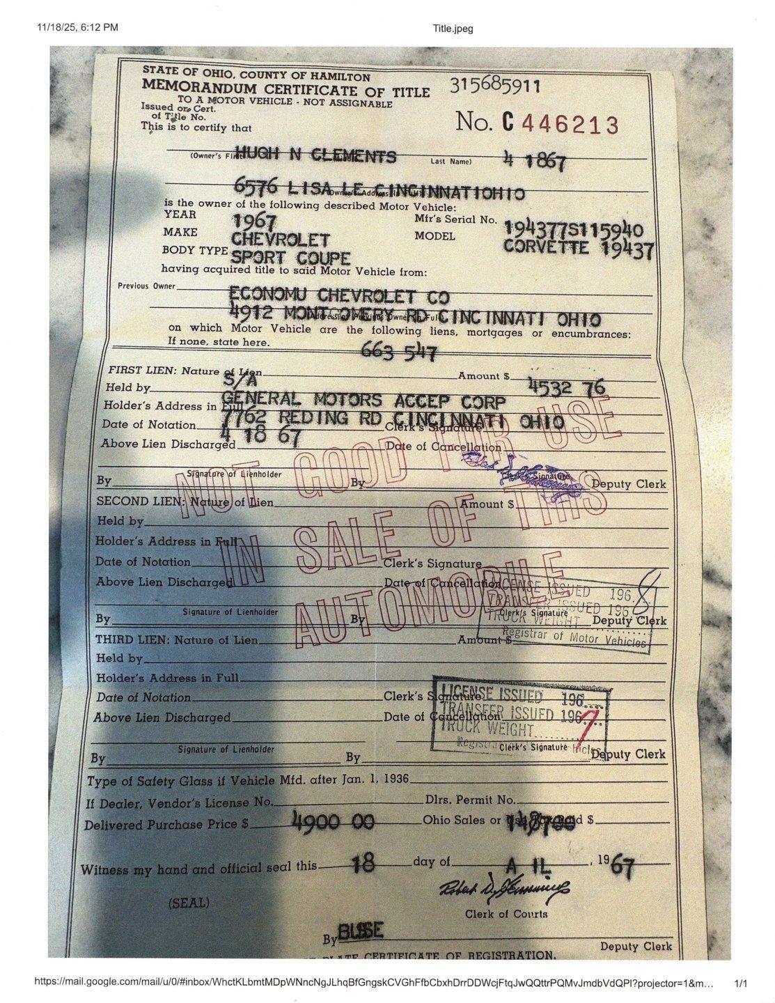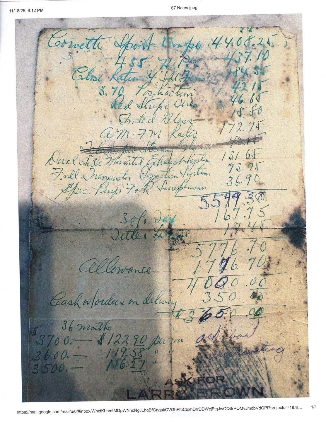 INTRODUCTION: #s match and documented by the original owner's family! $120,000 frame off restoration. A very interesting story: the family posted this car's VIN on CorvetteForum in 2005 looking for their father's car. They stated they “have the original paperwork including the retail installment contract, certificate of title and other paperwork”. The other paperwork included a handwritten order form listing the options and pricing for this car. I was searching the internet, researching this car and I ran across their post. I made contact with them and we were all very excited to talk to each other. The children verified that the car was born a 435 hp car. They have vintage pictures of the car and the original paperwork. We have copies of the paperwork shown in our pictures and we have contact info to the original owner's family!
