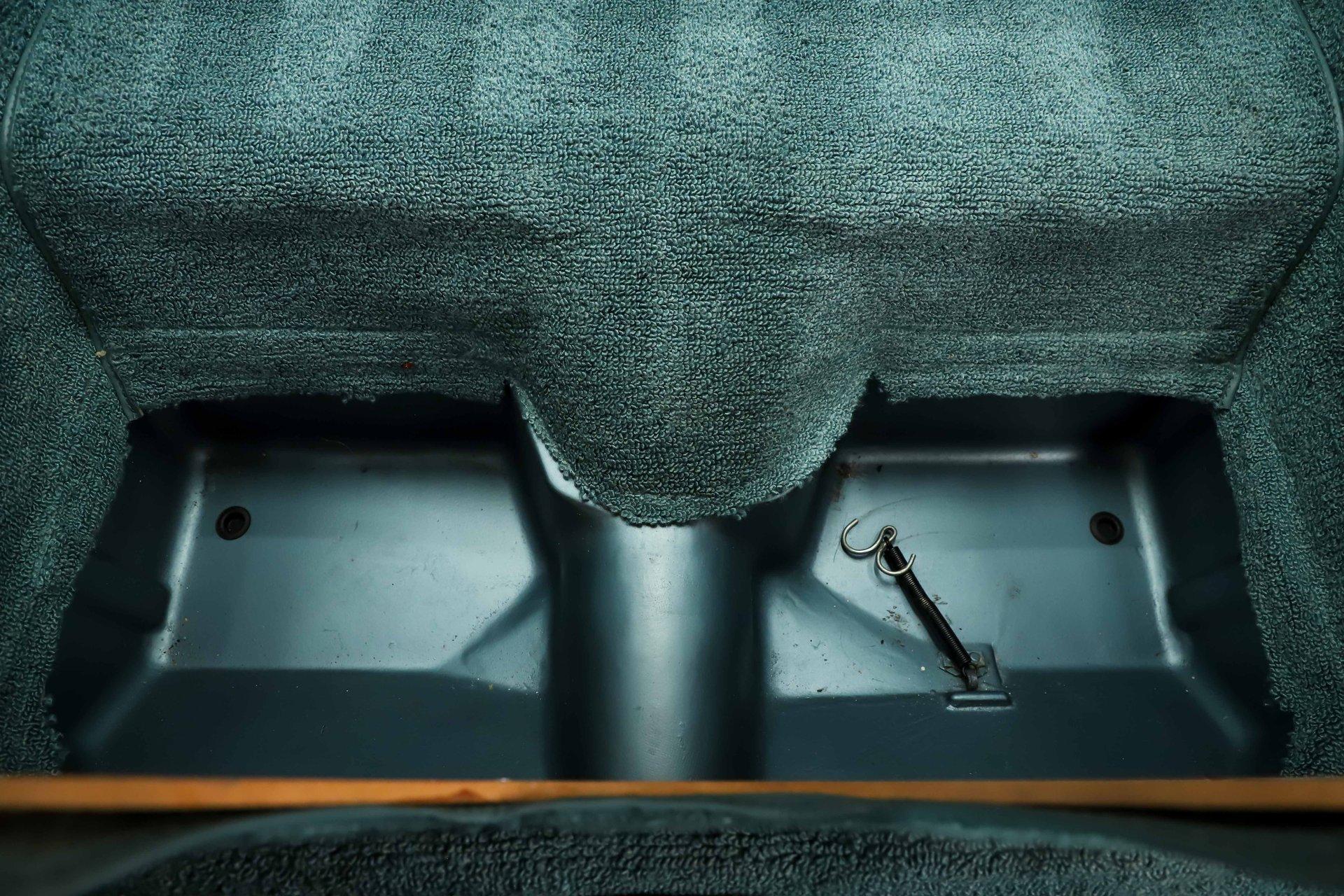 Looking up from below, the engine is spotless in correct Chevy Orange, fitted with the proper starter and canister-style oil filter. The car retains its original VIN-matching, correctly dated Muncie close-ratio 4-speed transmission, along with a rebuilt driveshaft leading back to the rebuilt original rear end. It features a 3.73 Posi with correct dates and codes. Every finish underneath is show-quality, right down to recreated assembly-line markings. The fiberglass floors are pristine and the spare tire carrier is complete.