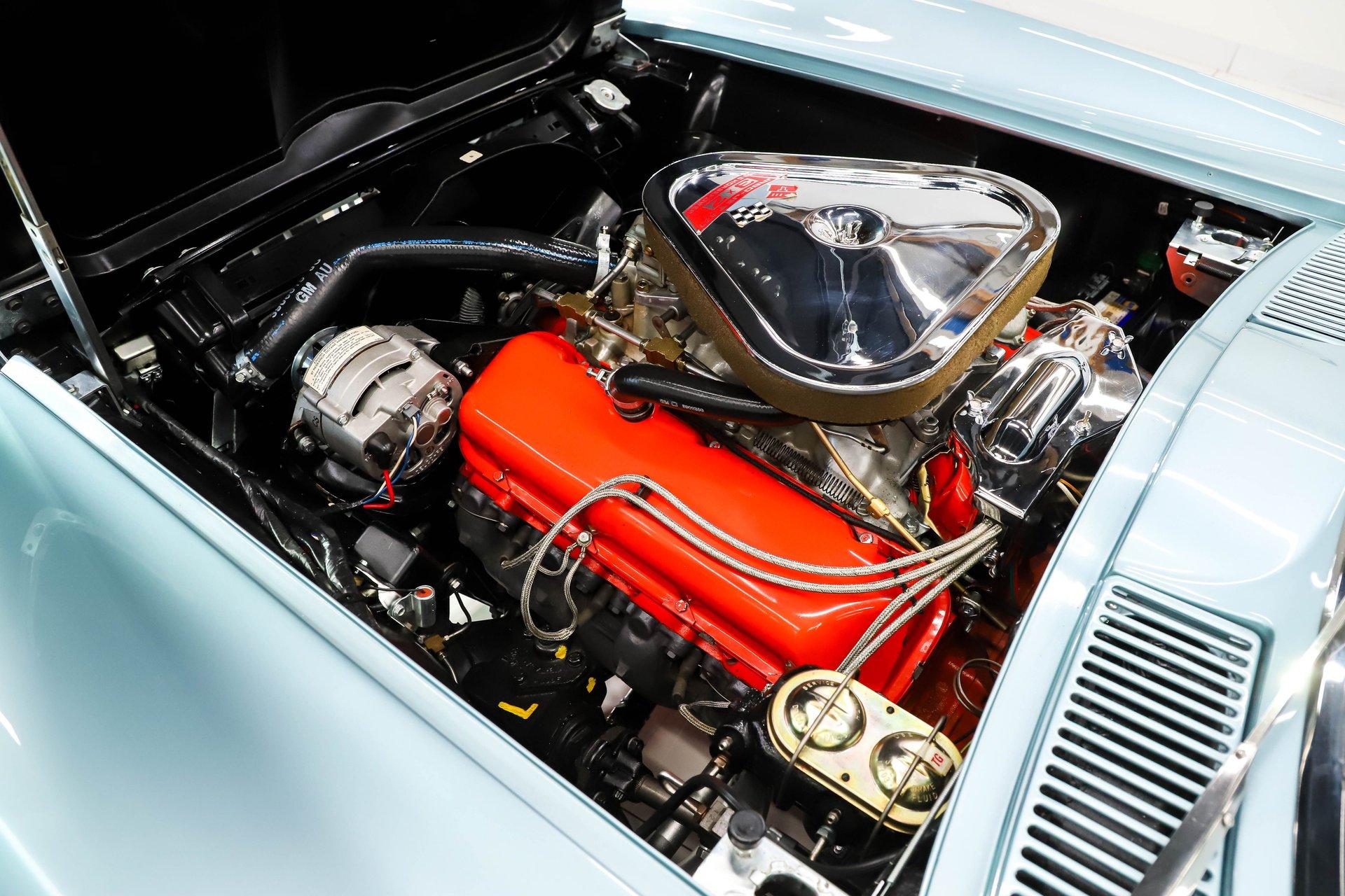 ENGINE COMPARTMENT: #s-matching and restored to like-new condition. Extensive research and cross-referencing were performed on the engine dates, codes, and casting numbers, all of which align correctly. The VIN stamping on the engine pad matches the car, the broach marks and stampings appear authentic, and the vehicle's production build date corresponds properly with the component dates. Power comes from the legendary 427ci/435 HP engine featuring high compression, solid lifters, square-port heads, and an aluminum intake topped with three Holley carburetors. Correct valve covers with dimples, factory ignition shielding, and deep-groove pulleys designed for high-RPM operation are all in place. Correct reproduction hoses and clamps have been used, finishes throughout are fresh, the wiring has been replaced, and the car is equipped with power steering.