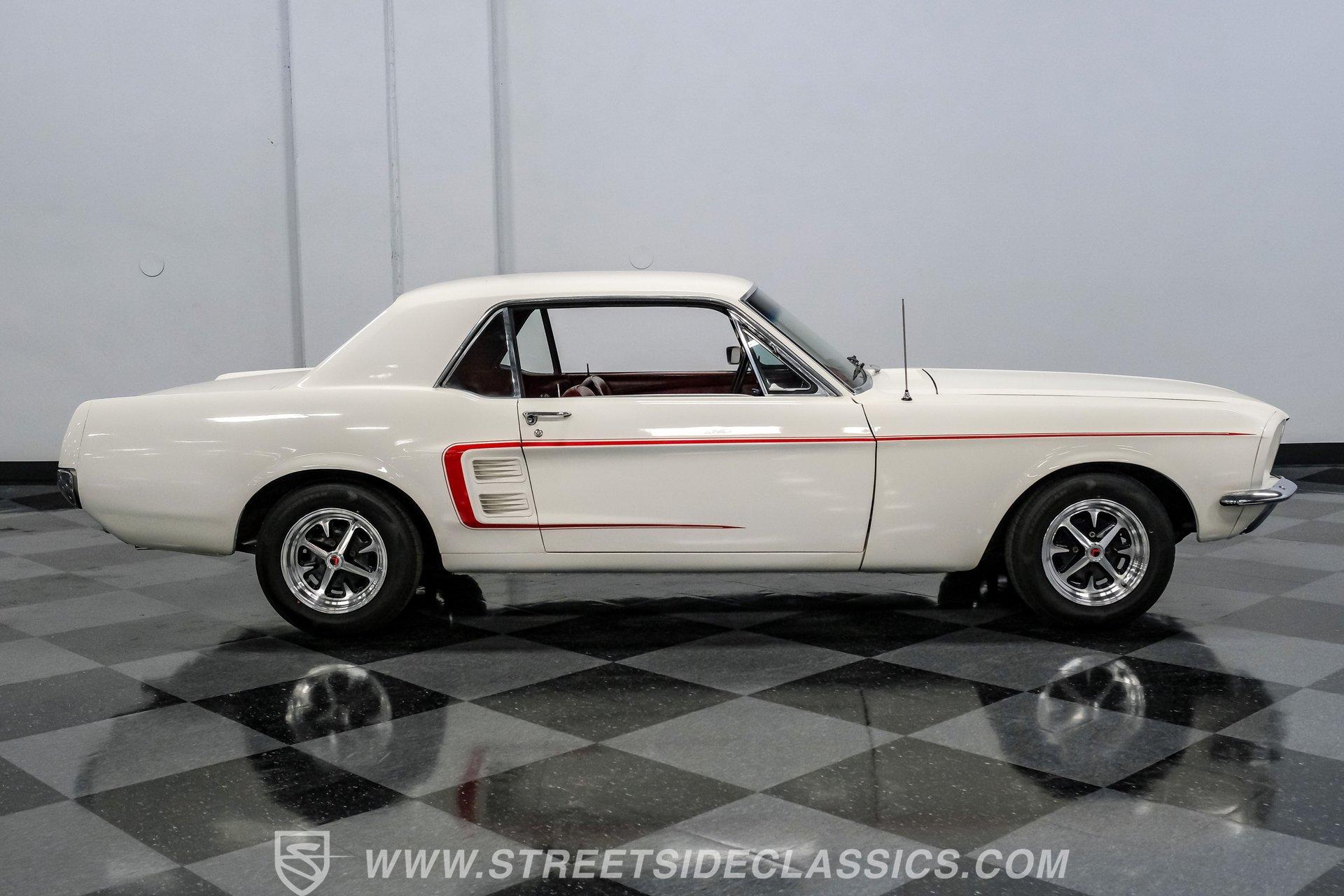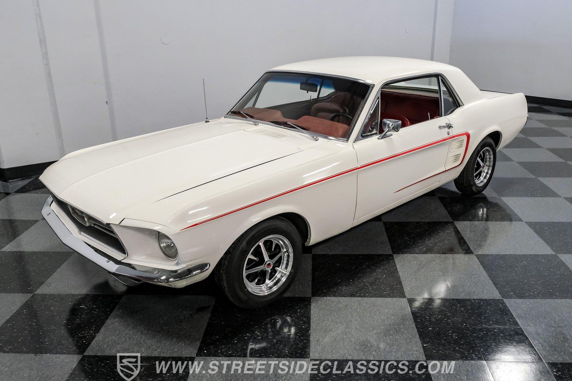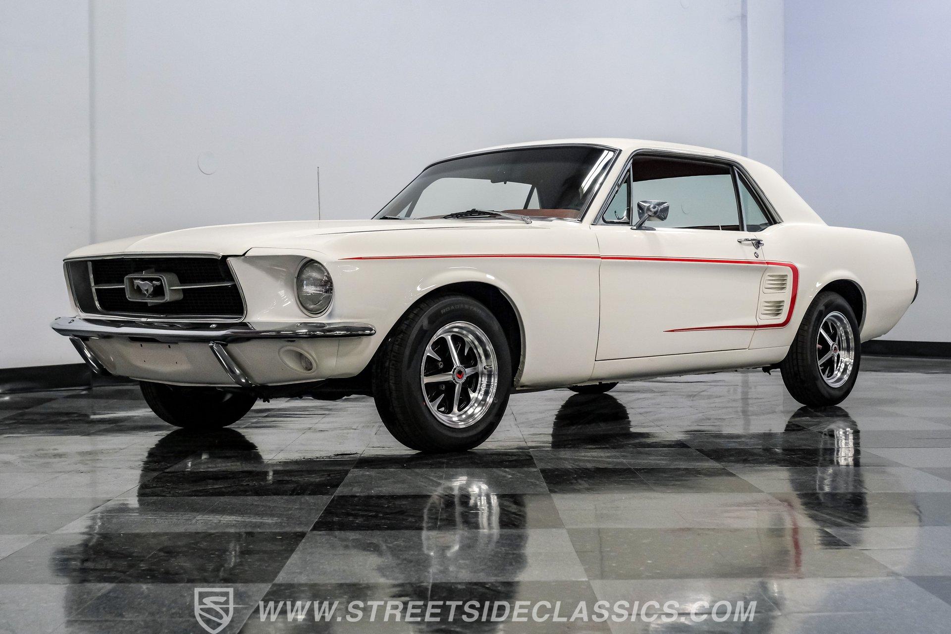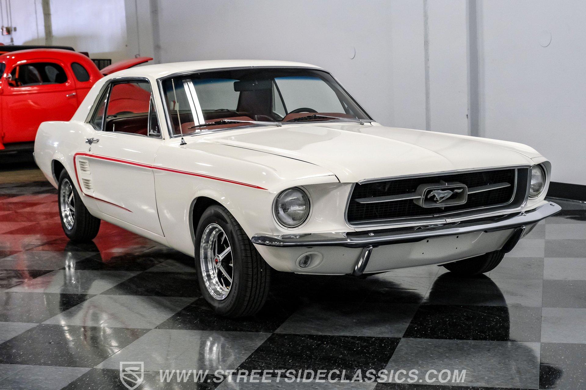 The 1967 Ford Mustang is a timeless icon known for its distinctive style and lasting appeal. This example is finished in a factory correct Wimbledon White repaint with red side accent stripes, chrome bumpers and trim, and modern 14 inch Magnum wheels. It's a classic American car built to turn heads and deliver an authentic driving experience.