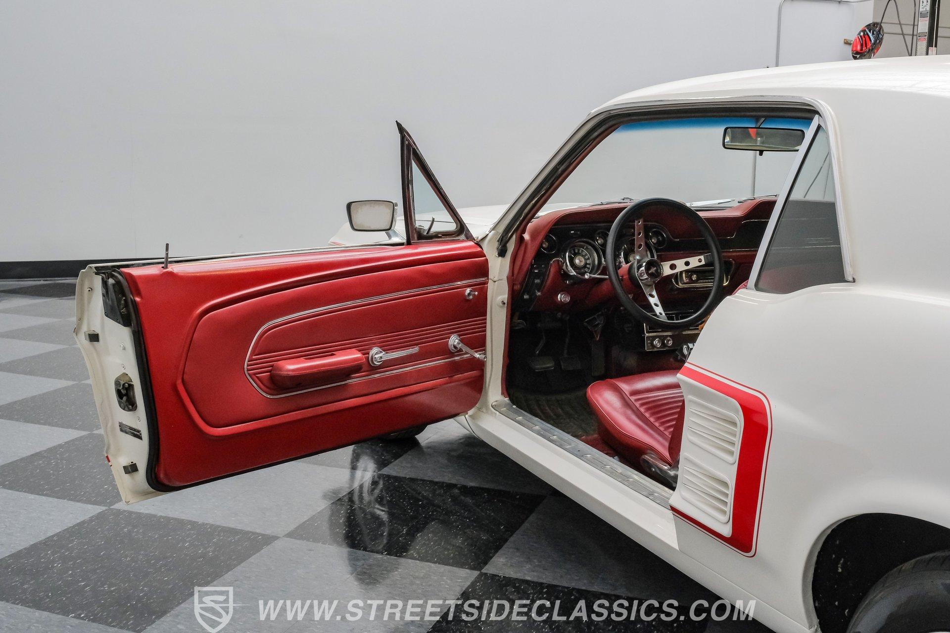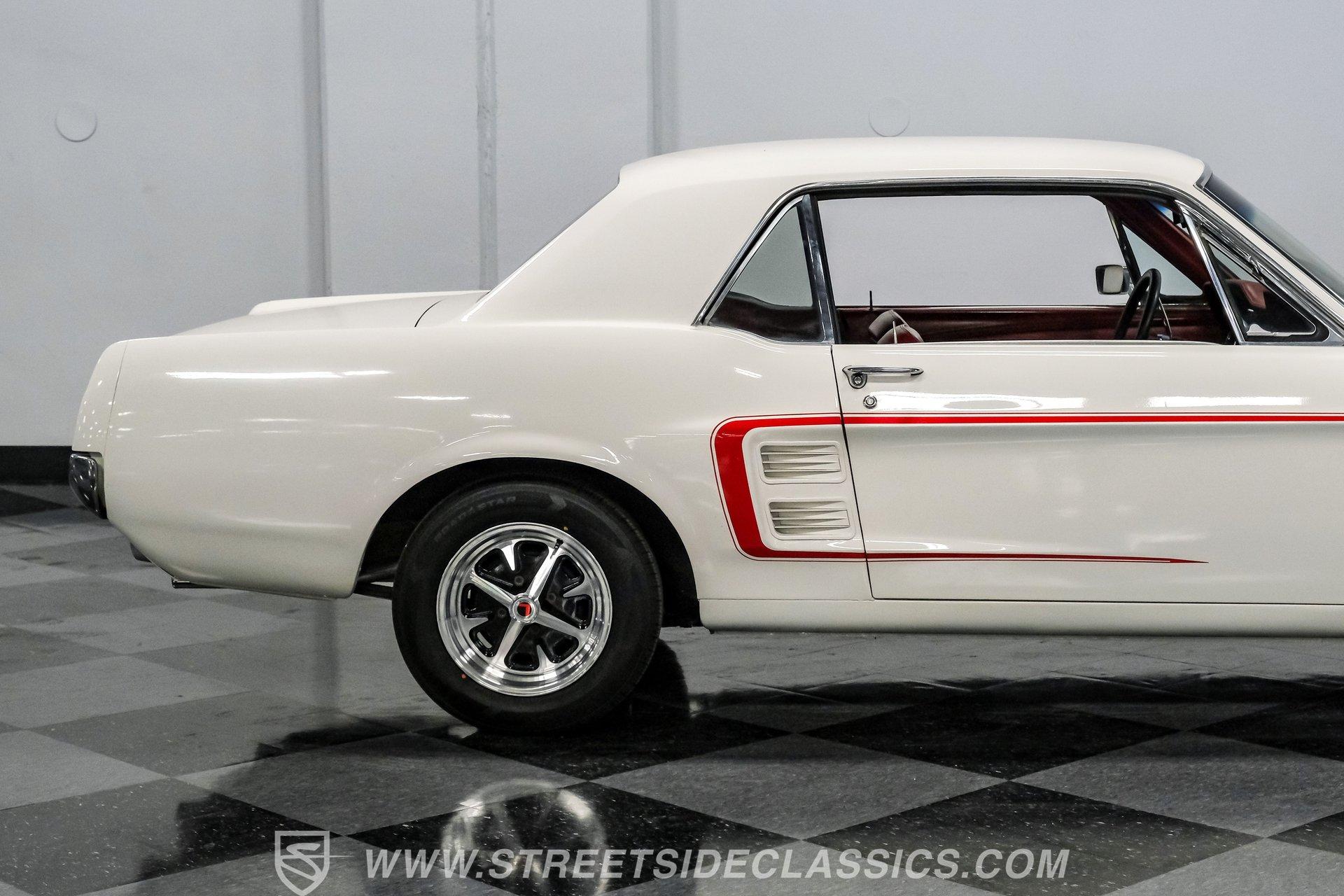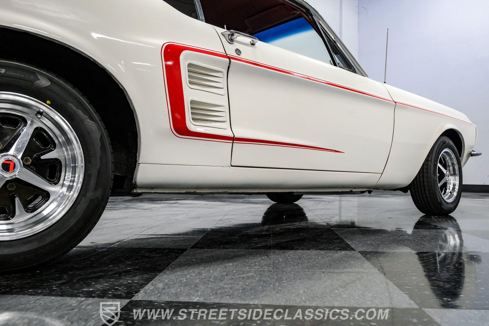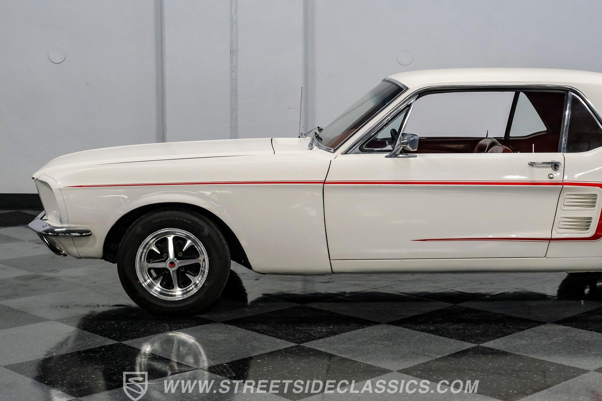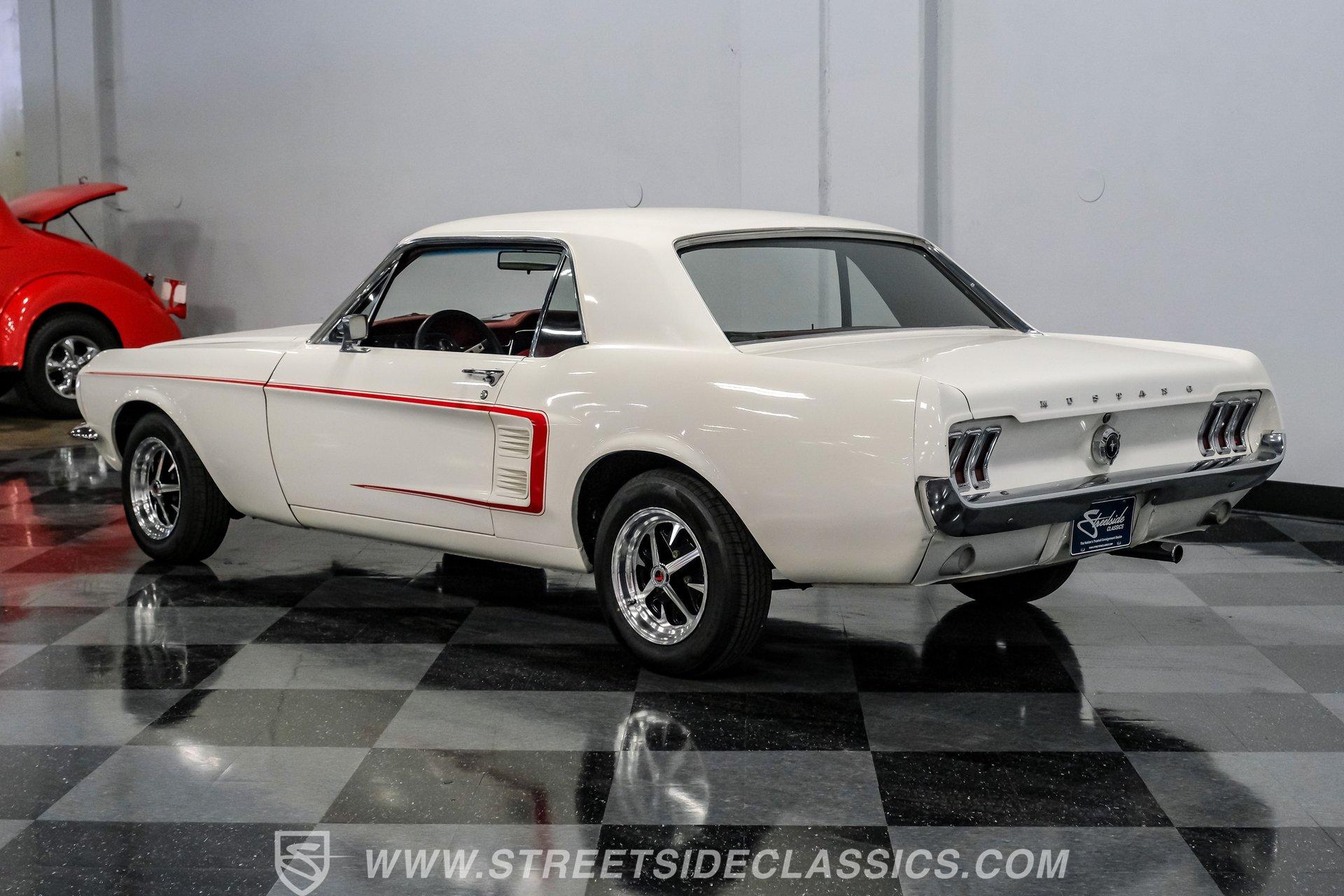 The 1967 Ford Mustang is a timeless icon known for its distinctive style and lasting appeal. This example is finished in a factory correct Wimbledon White repaint with red side accent stripes, chrome bumpers and trim, and modern 14 inch Magnum wheels. It's a classic American car built to turn heads and deliver an authentic driving experience.