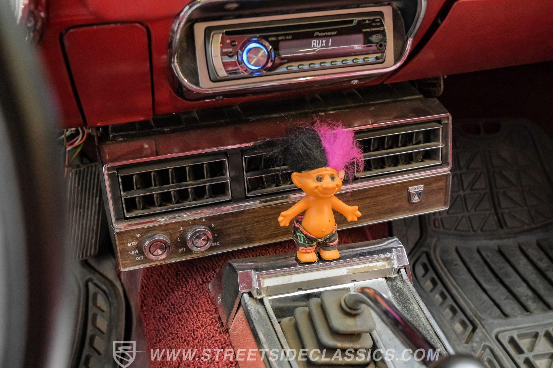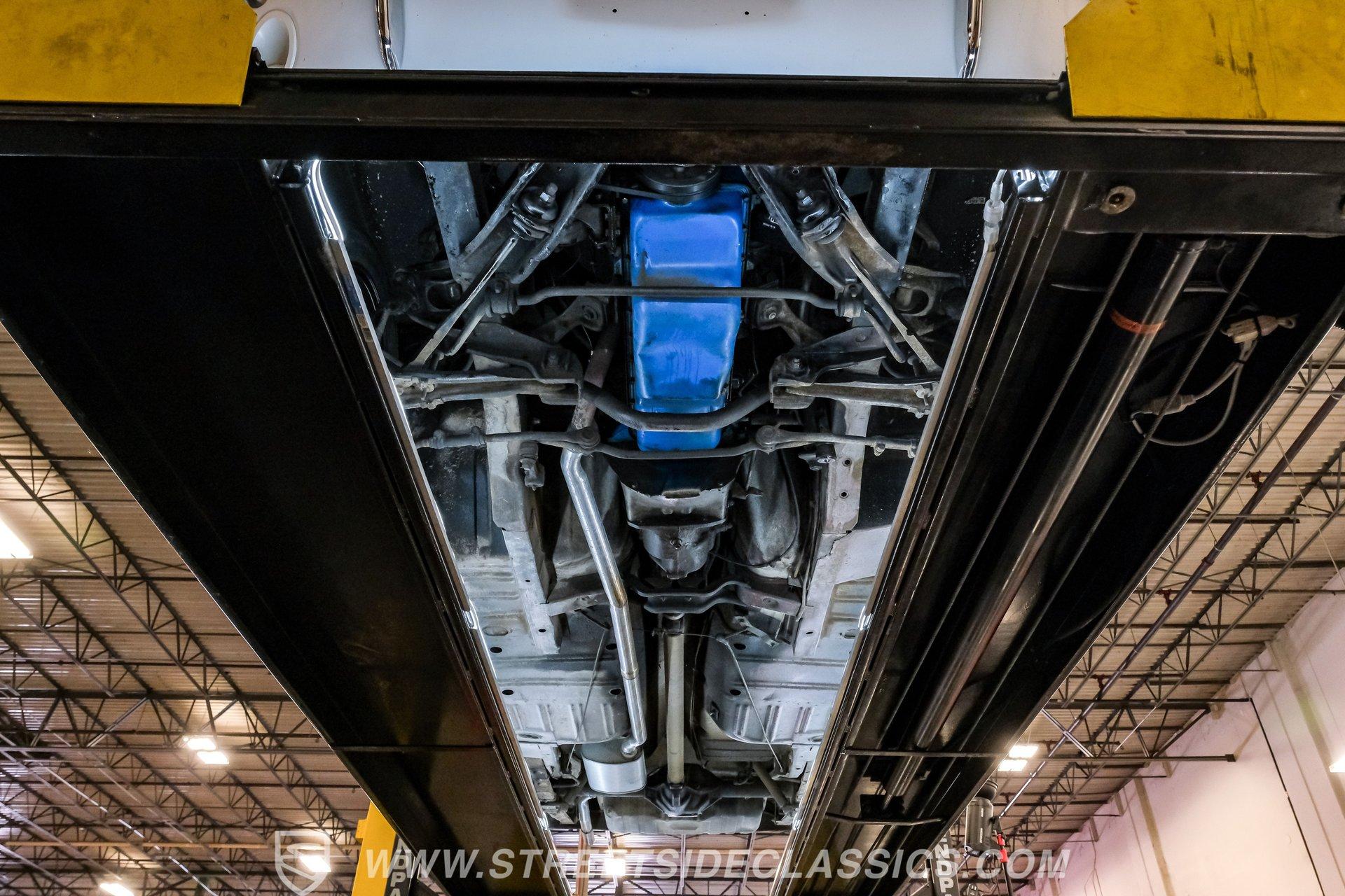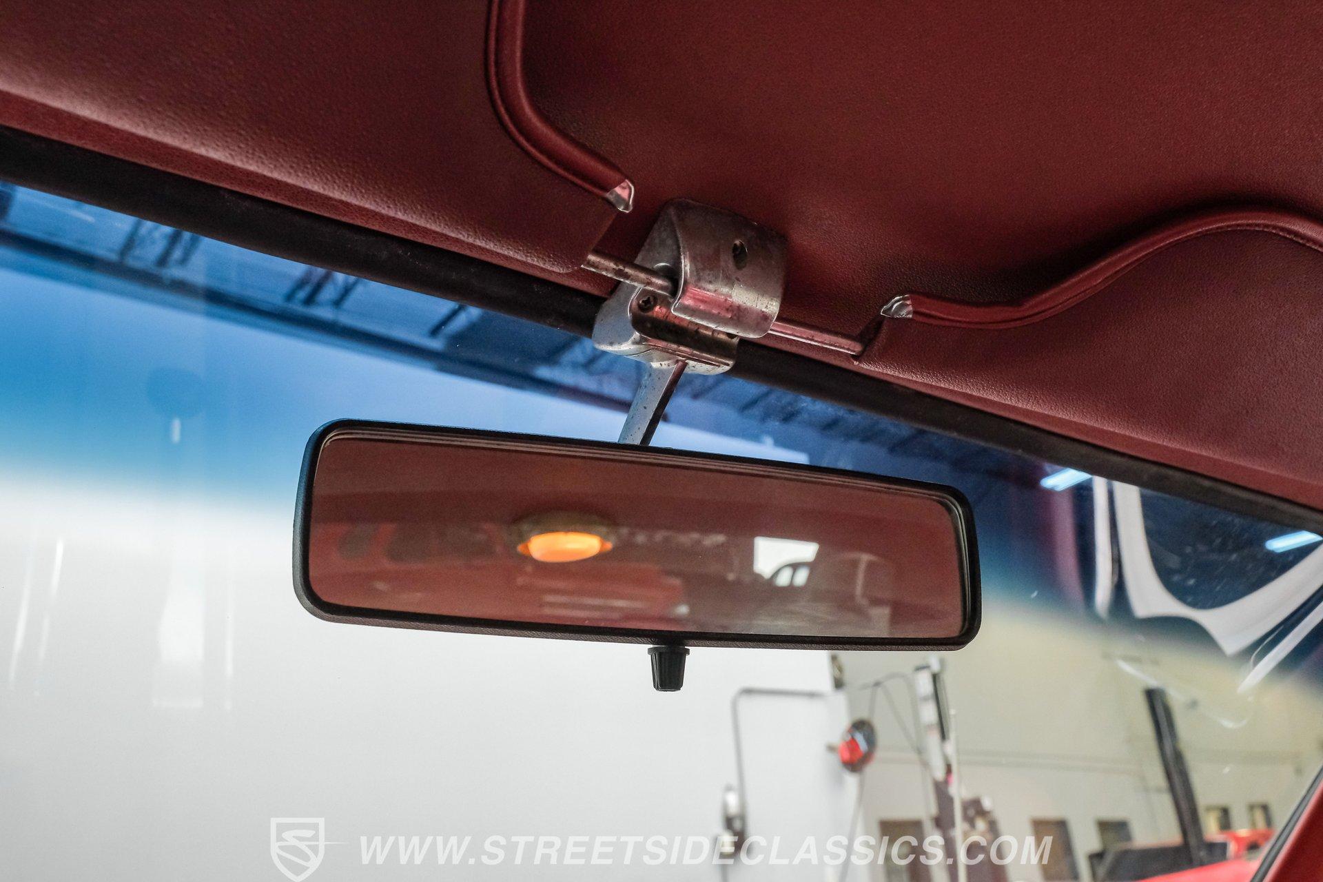 Step inside and experience the vintage-inspired red vinyl interior, complete with bucket seats and matching door panels that capture the spirit of the era. The cabin features a factory-style center console and shifter, a clean dash with clear gauges, and an under-dash A/C unit for added comfort. The headliner, carpets, and door panels all coordinate for a cohesive look, while a Pioneer AM/FM/CD radio with aux input and Sony speakers blend classic style with modern convenience.