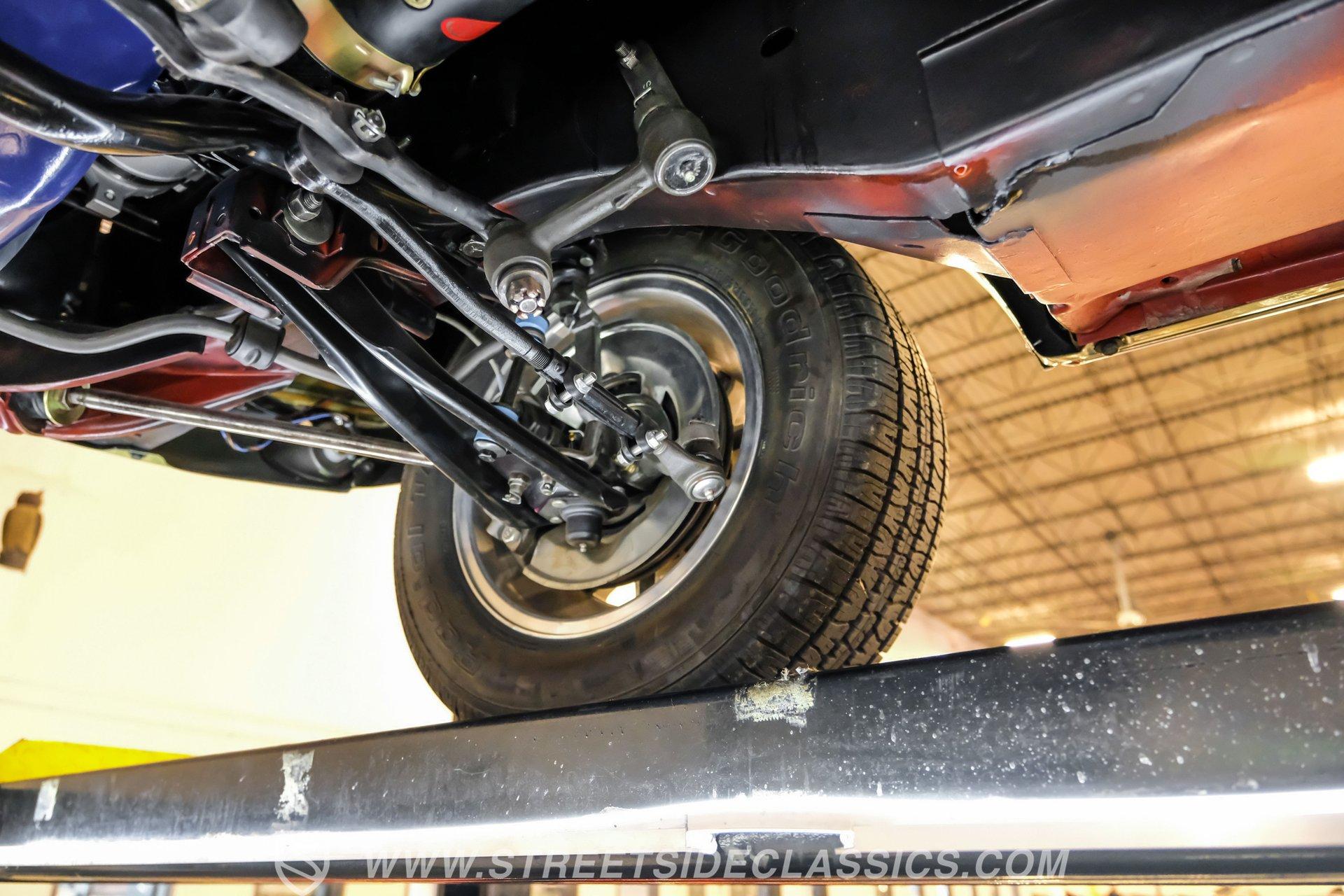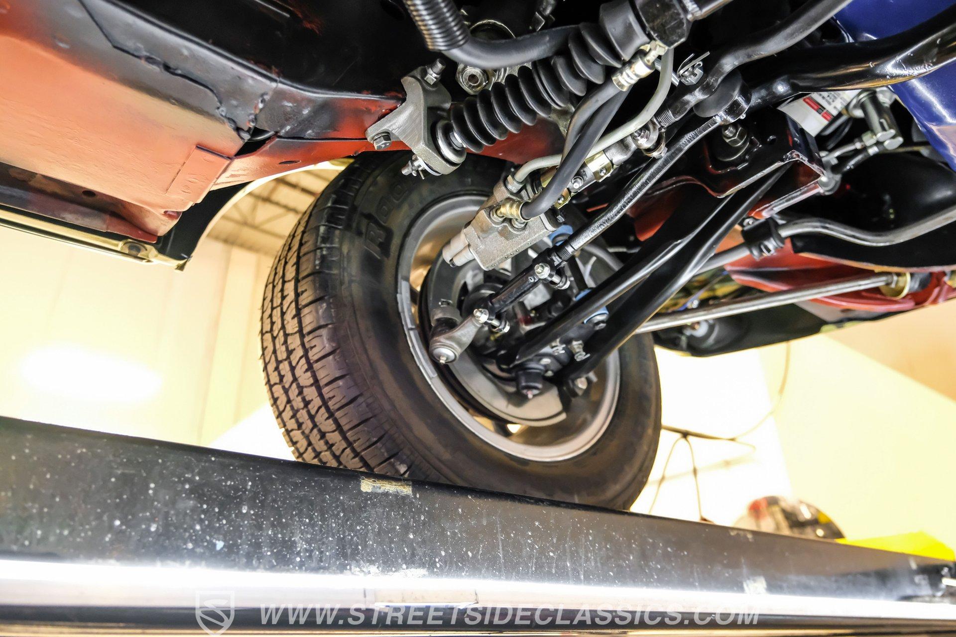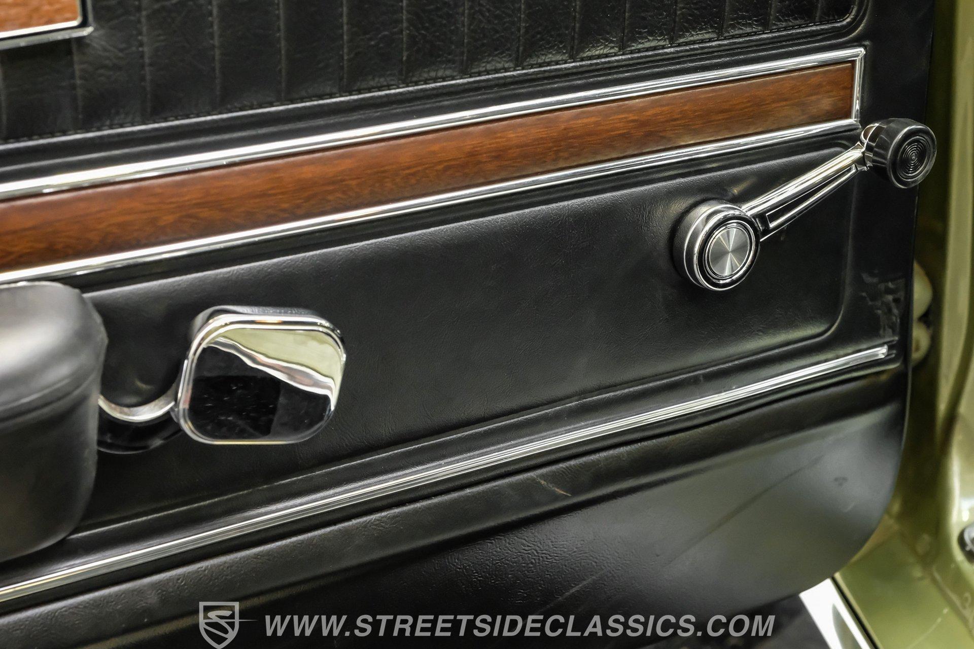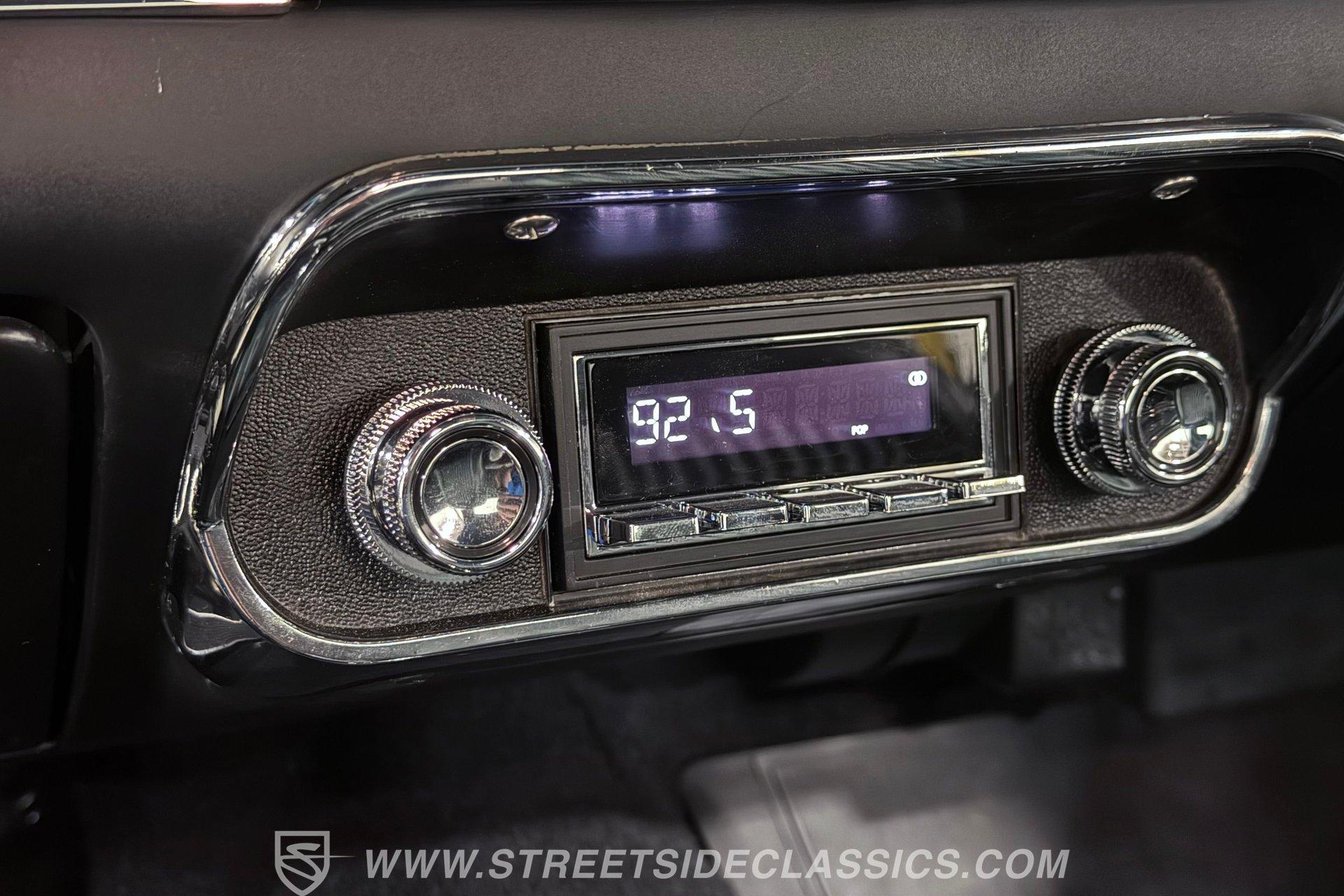 Inside, we find a factory-correct black vinyl interior. A pair of front bucket seats gives way to an upgraded aftermarket wood-rimmed, power-assisted steering wheel. A factory-correct dashboard and five-pod gauge cluster are outlined in woodgrain trim, which coordinates nicely with the door panels, while a RetroSounds AM/FM/AUX radio subtly offers Bluetooth connectivity, providing far more soundtrack options than the unit it replaces. Originally fitted with factory air conditioning, this car has been upgraded with an Old Air A/C and heat setup, which, when combined with the new window seals, makes a world of difference in HVAC efficiency compared to the factory units.