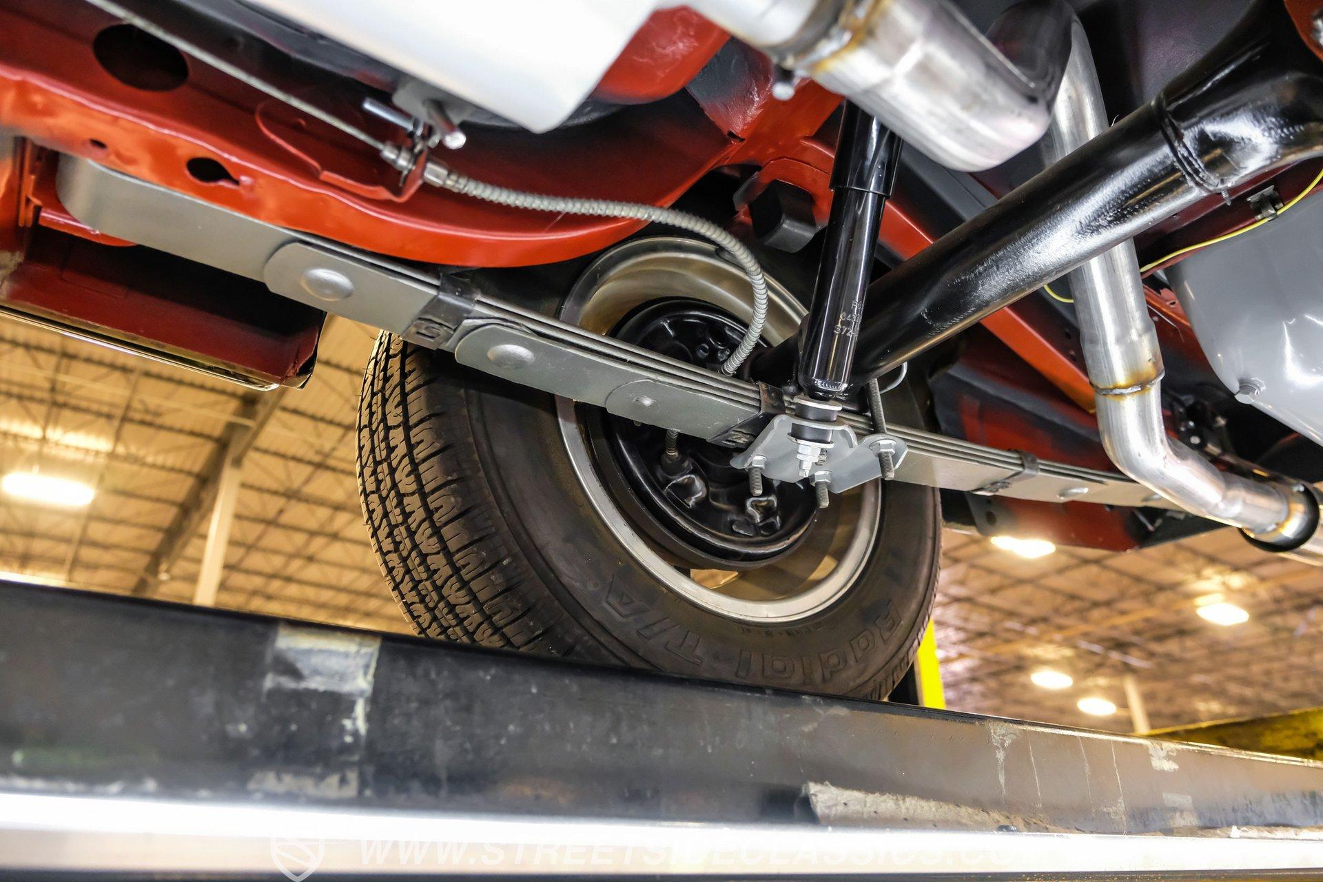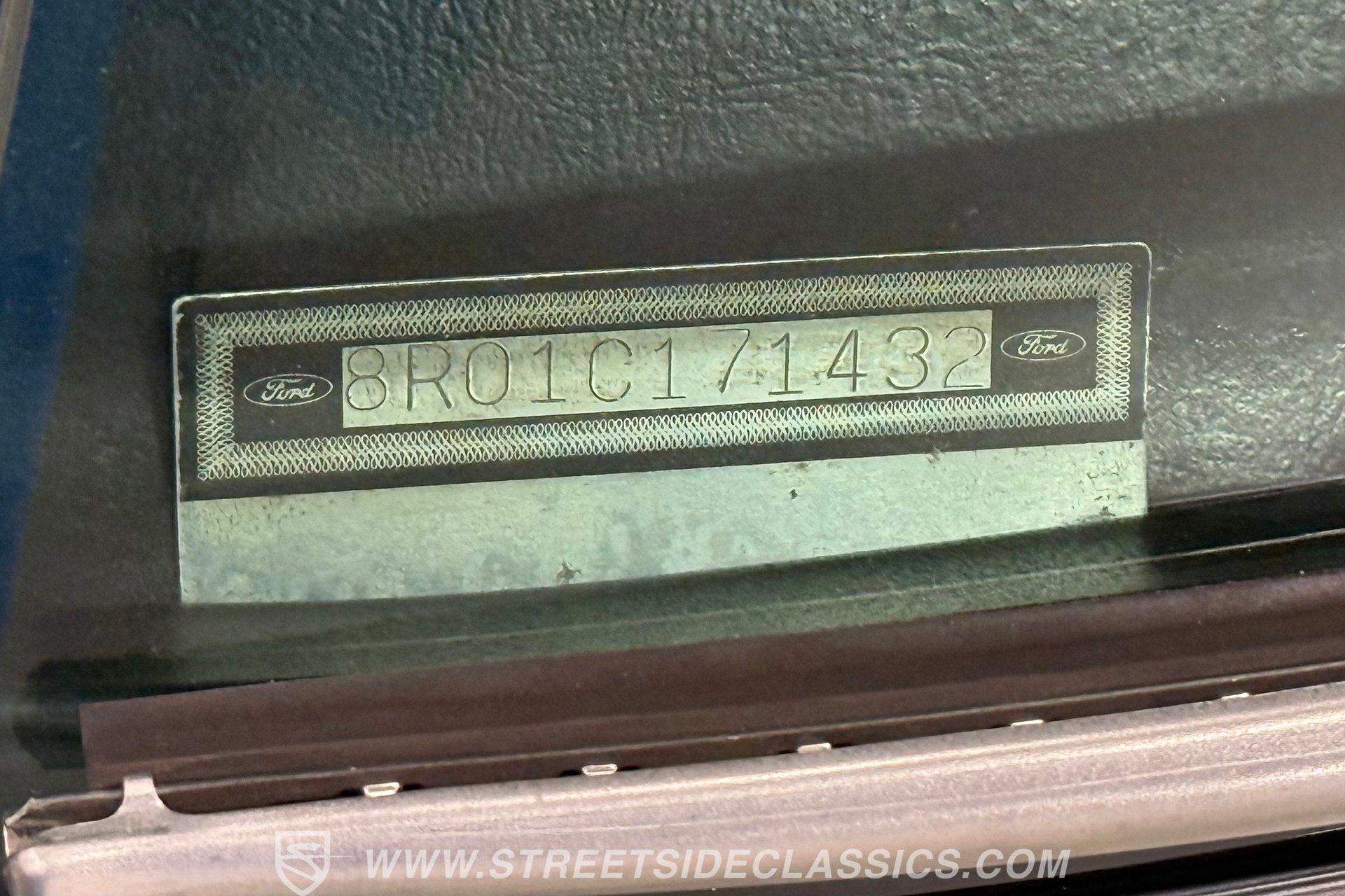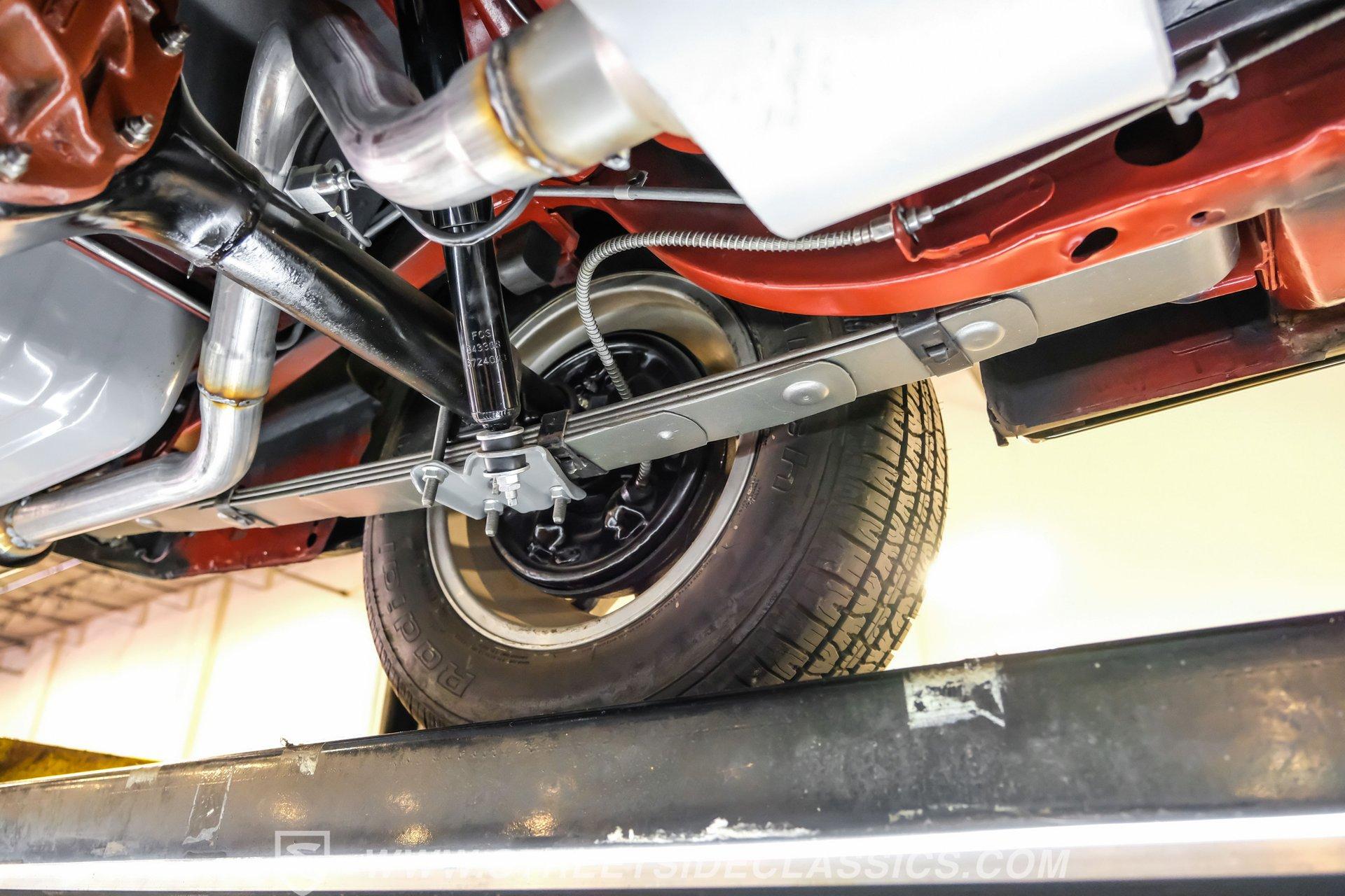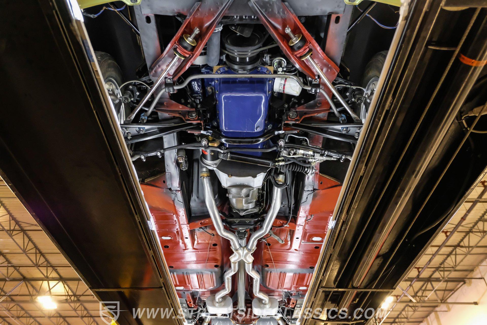 Inside, we find a factory-correct black vinyl interior. A pair of front bucket seats gives way to an upgraded aftermarket wood-rimmed, power-assisted steering wheel. A factory-correct dashboard and five-pod gauge cluster are outlined in woodgrain trim, which coordinates nicely with the door panels, while a RetroSounds AM/FM/AUX radio subtly offers Bluetooth connectivity, providing far more soundtrack options than the unit it replaces. Originally fitted with factory air conditioning, this car has been upgraded with an Old Air A/C and heat setup, which, when combined with the new window seals, makes a world of difference in HVAC efficiency compared to the factory units.