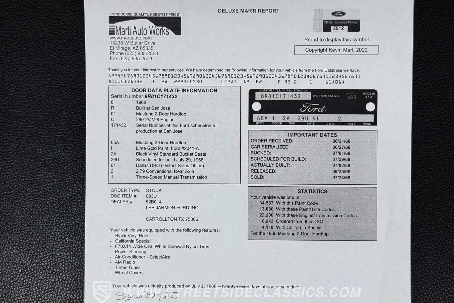 This 1968 Ford Mustang California Special rides on a fully restored factory-style suspension, while power brakes featuring a pair of front discs stand ready to scrub off speed at a moment's notice. This highly collectible Mustang comes with its owner's manual and a confidence-inspiring Marti Report, providing all the provenance any collector would need to feel reassured that this car is the Real McCoy. If you love first-generation Mustangs as much as we do, then odds are you'll be smiling Joker-style the same way we do whenever we are around this extra special, California Special. But don't wait because it won't last long. Call today!