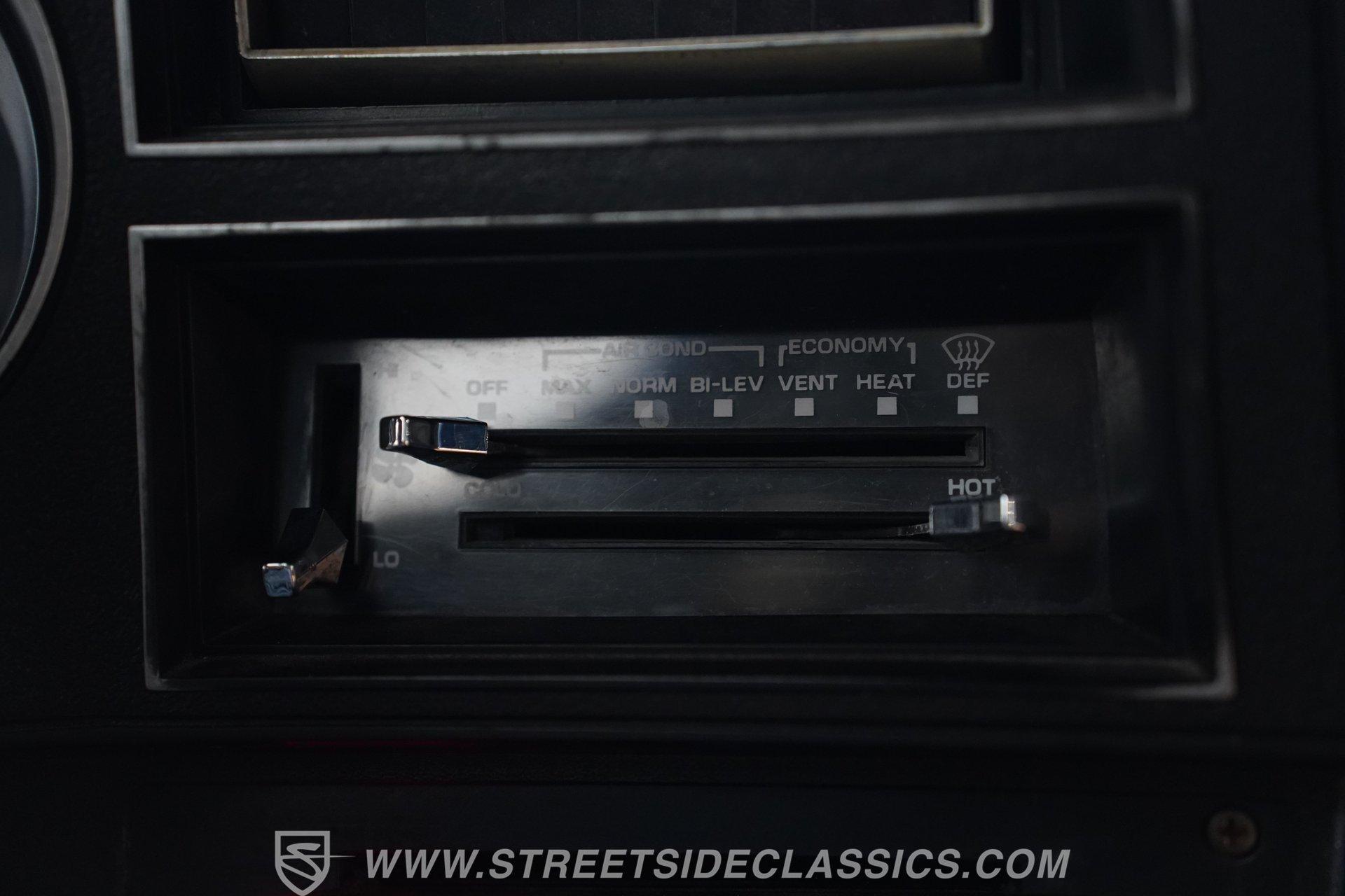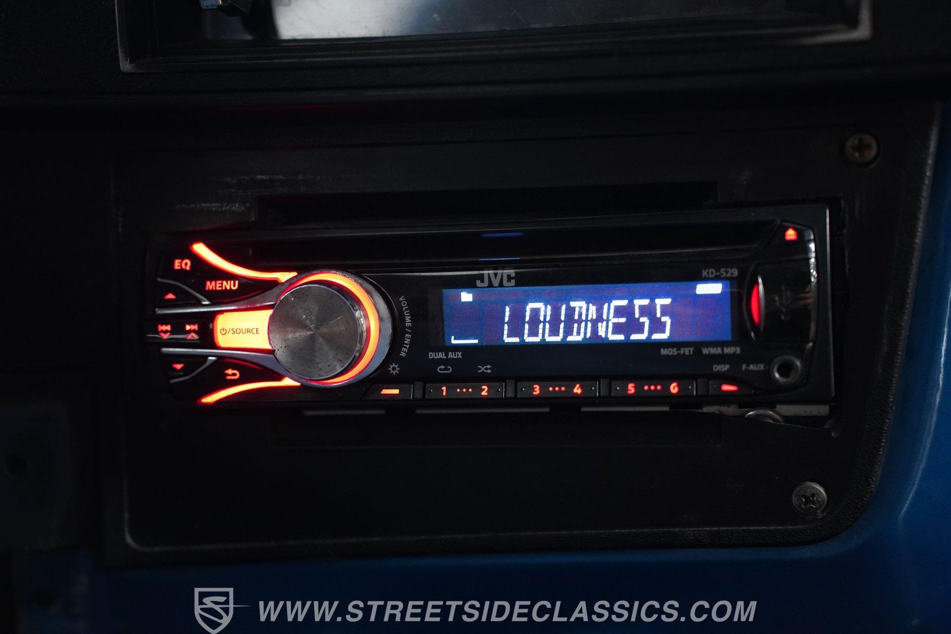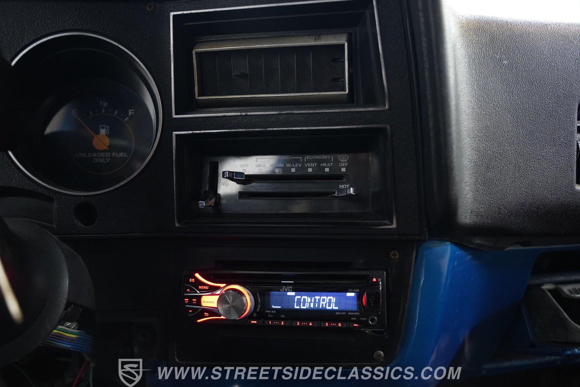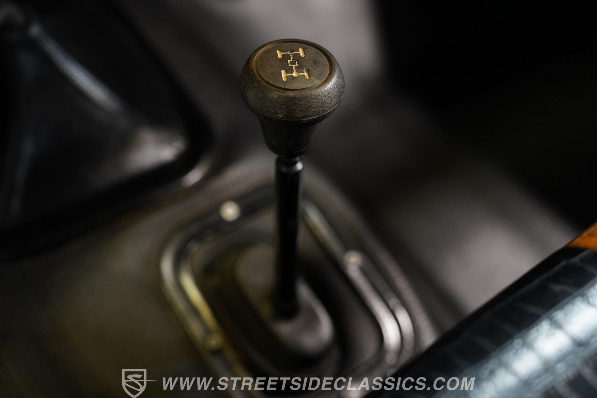 The interior is quite interesting. Mostly black, it features gator-skin-covered bench seats, very nice door panels, and what appears to be a stock dash and gauge cluster, also in good shape. An aftermarket GT Grant steering wheel sits in front of a steering console-mounted Autogage tachometer, while aftermarket Summit oil pressure and water temperature gauges are mounted under the dashboard. For audio entertainment, there is a JVC head unit with AM/FM/Aux radio and a CD player. Below that are the climate controls, and not far from there are the easy-to-reach 4-speed floor shifter and four-wheel-drive engagement shifter.