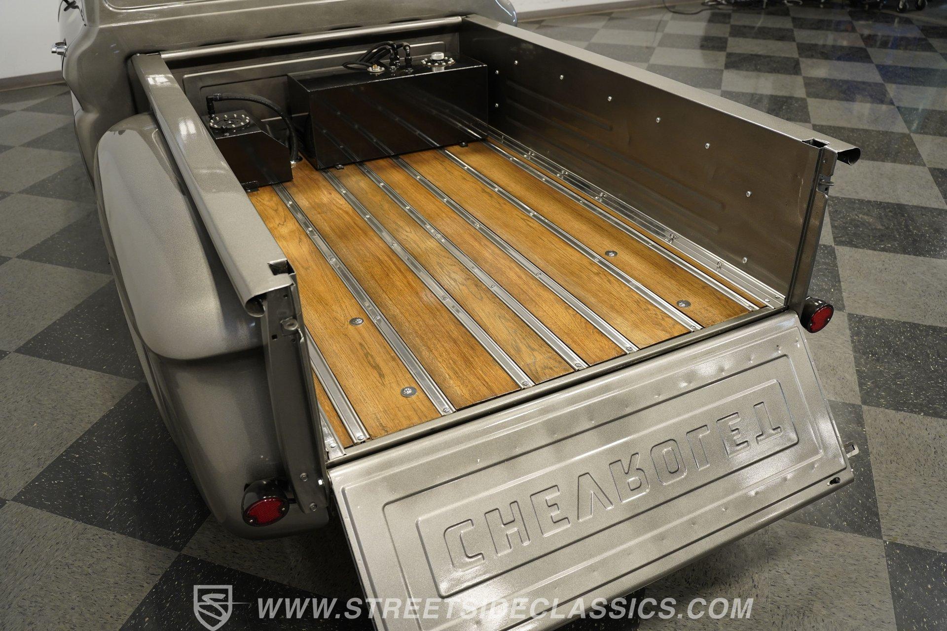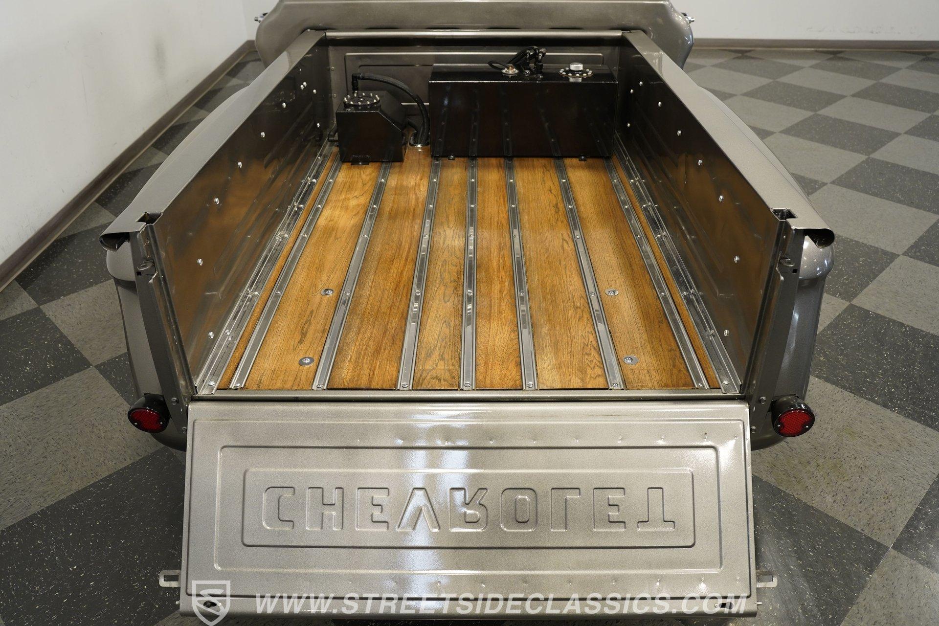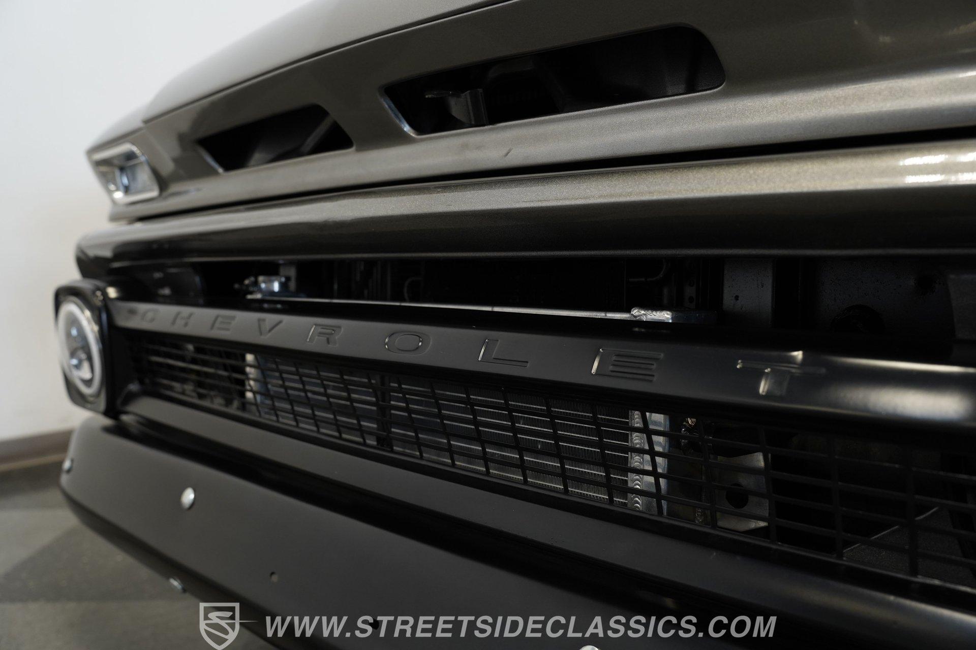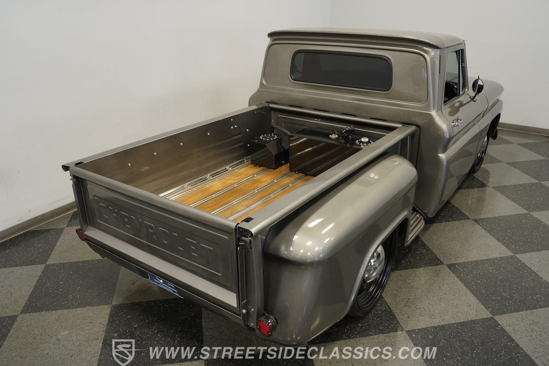 You won't find a better-looking truck than this 1964 Chevrolet C10 Supercharged LS Restomod short bed. It's finished in Charcoal Gray Metallic with black accents, including the front bumper. Instead of a chrome rear bumper, a body-colored roll pan cleans up the rear profile for a sleek custom look. Subtle brightwork appears on the dog dish center caps mounted on the 22-inch black steel wheels. The body is straight throughout, panel gaps are even, and the blacked-out front grille gives the truck a compact, stout face. Out back, a beautifully finished wood-planked bed houses a pair of fuel cells mounted against the cab for a true performance-inspired touch.