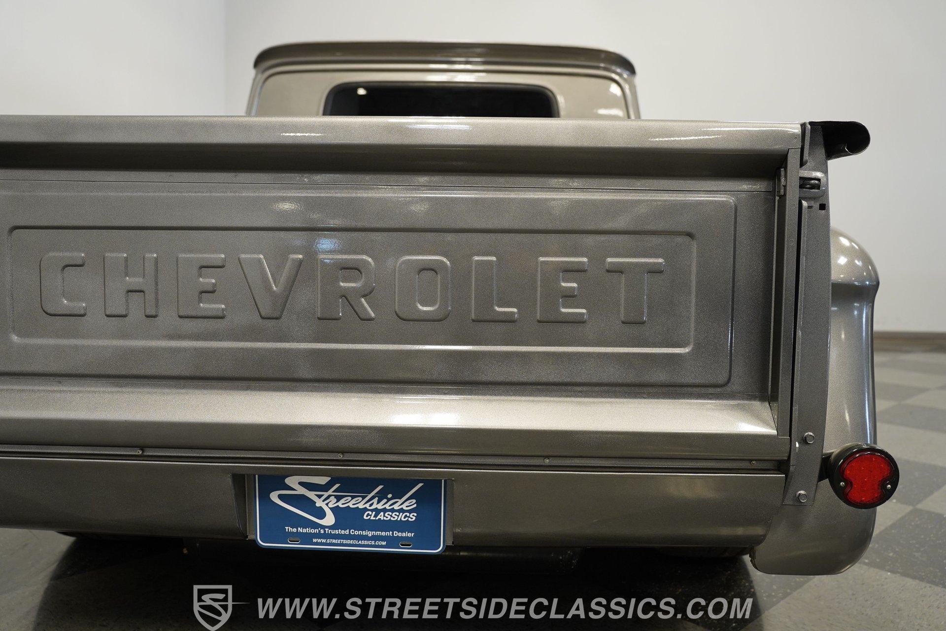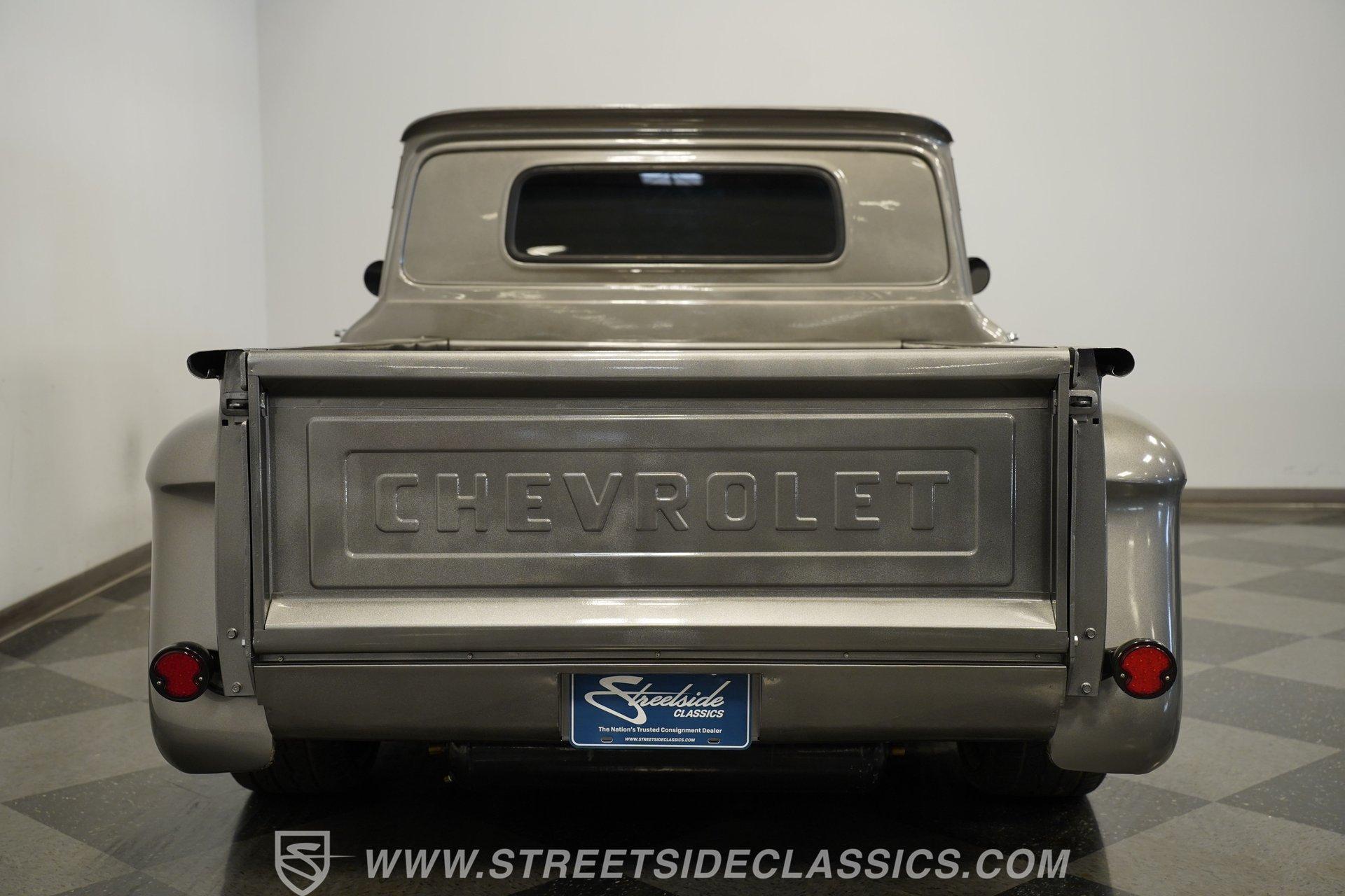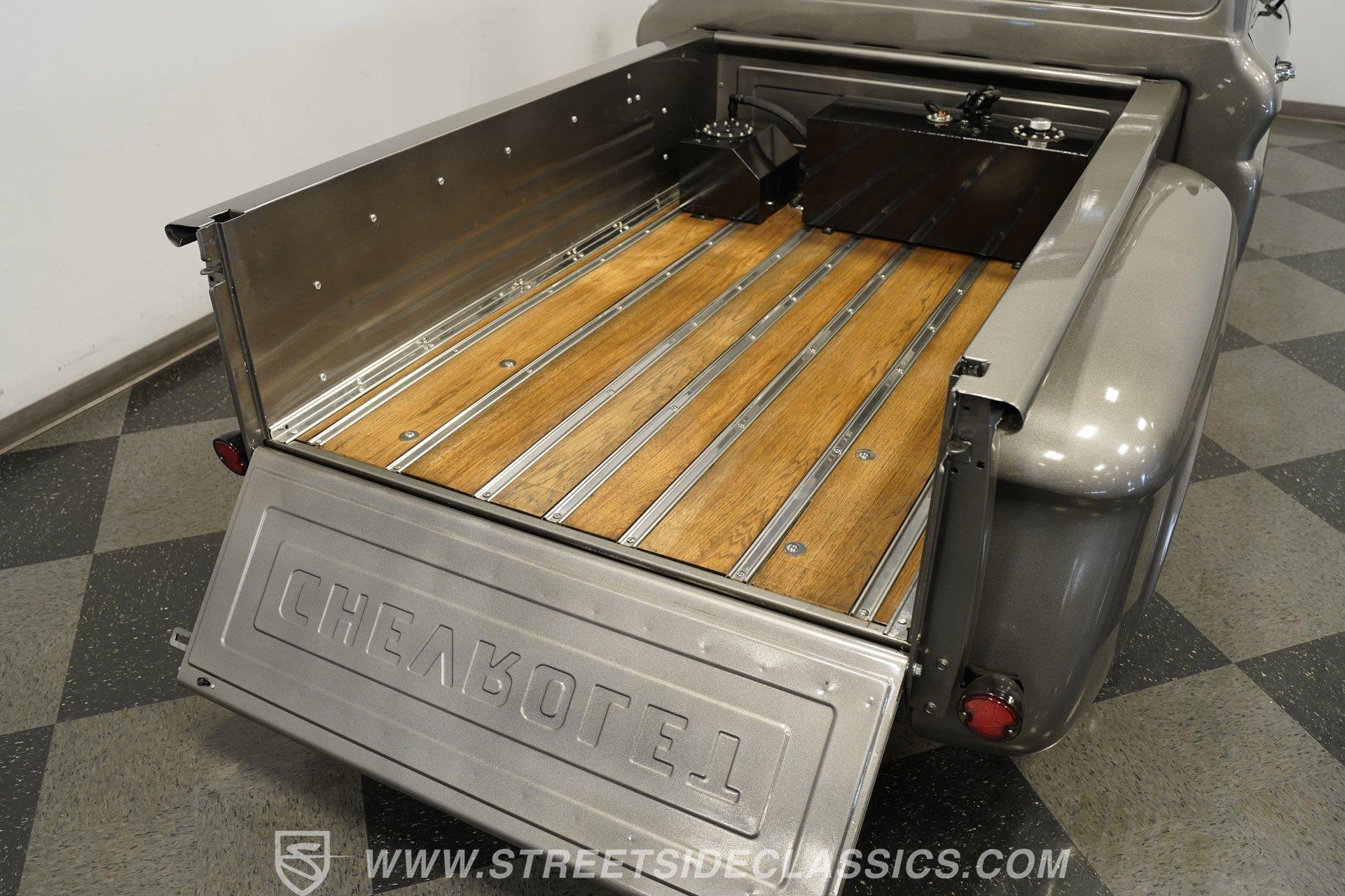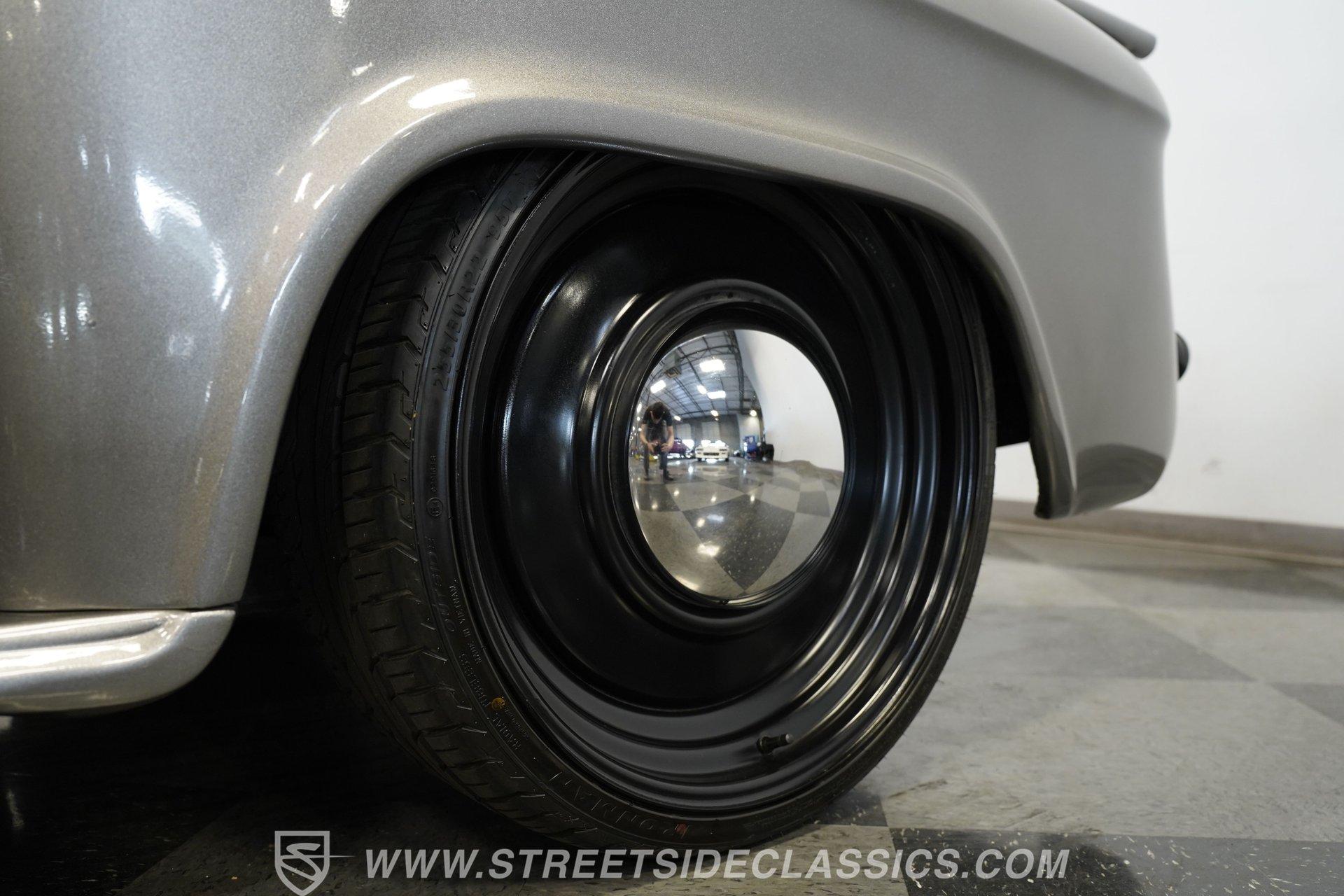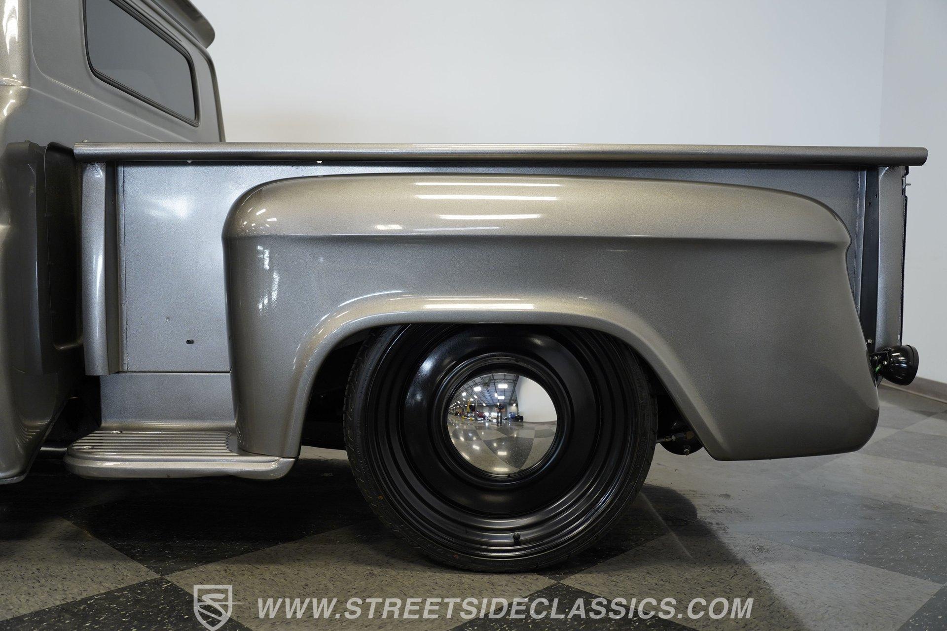 You won't find a better-looking truck than this 1964 Chevrolet C10 Supercharged LS Restomod short bed. It's finished in Charcoal Gray Metallic with black accents, including the front bumper. Instead of a chrome rear bumper, a body-colored roll pan cleans up the rear profile for a sleek custom look. Subtle brightwork appears on the dog dish center caps mounted on the 22-inch black steel wheels. The body is straight throughout, panel gaps are even, and the blacked-out front grille gives the truck a compact, stout face. Out back, a beautifully finished wood-planked bed houses a pair of fuel cells mounted against the cab for a true performance-inspired touch.