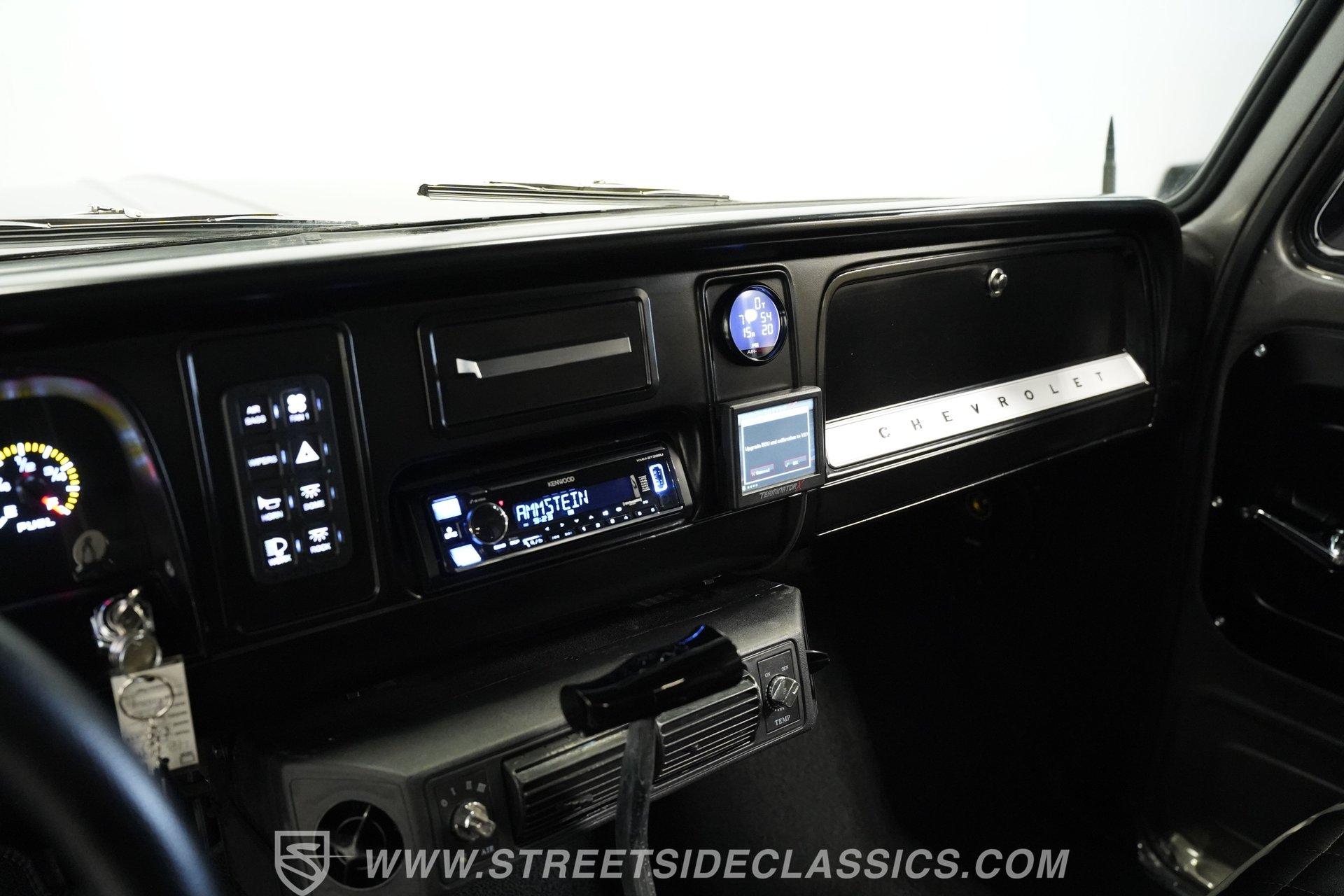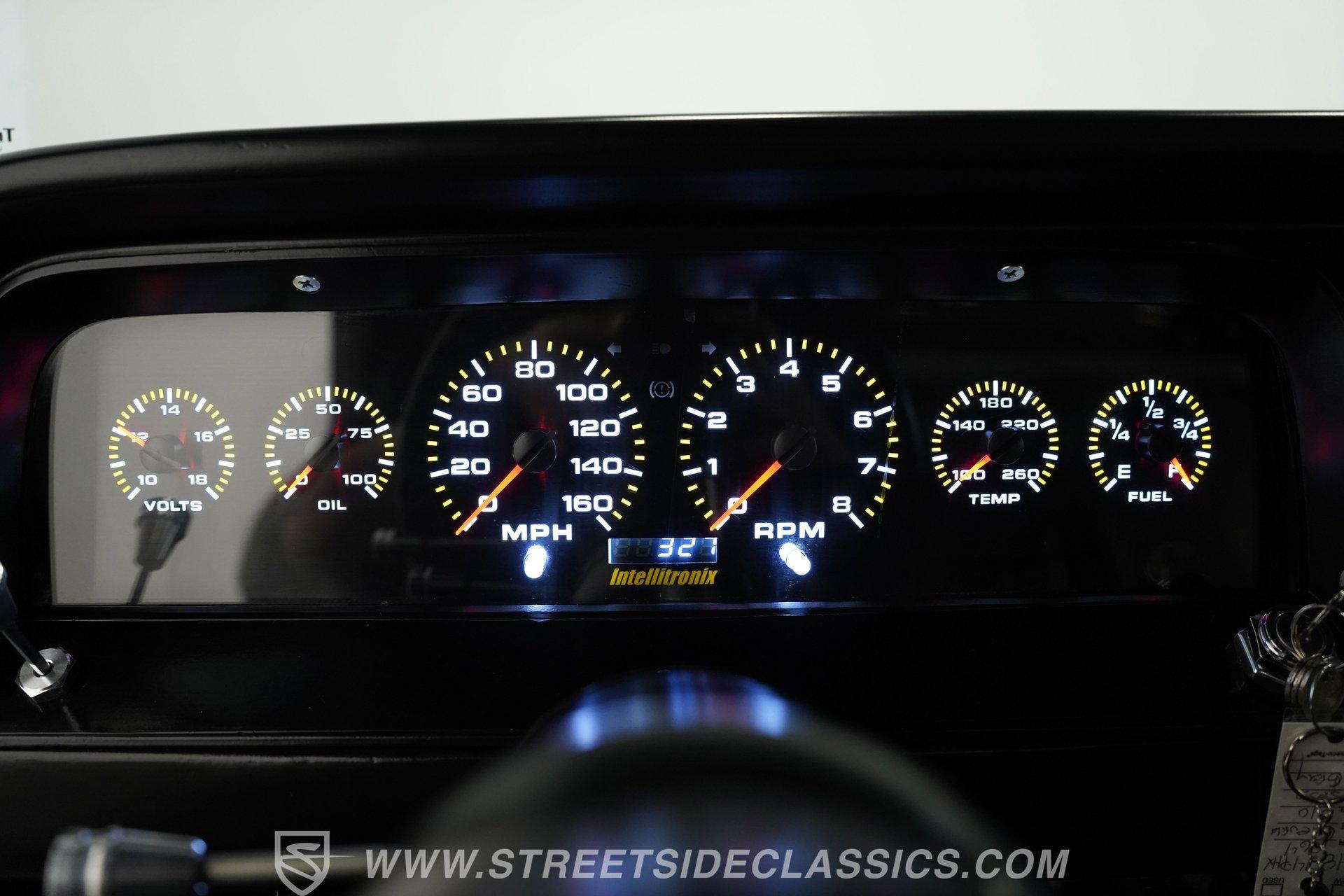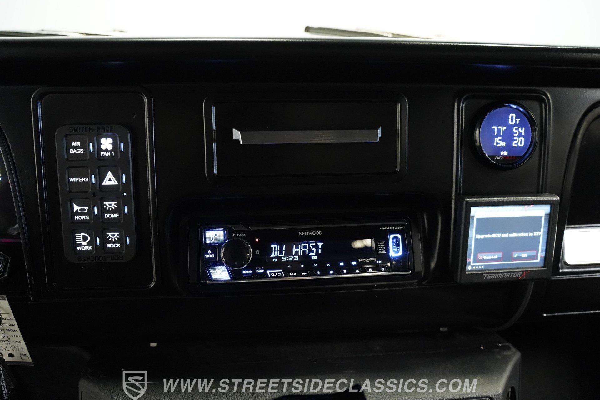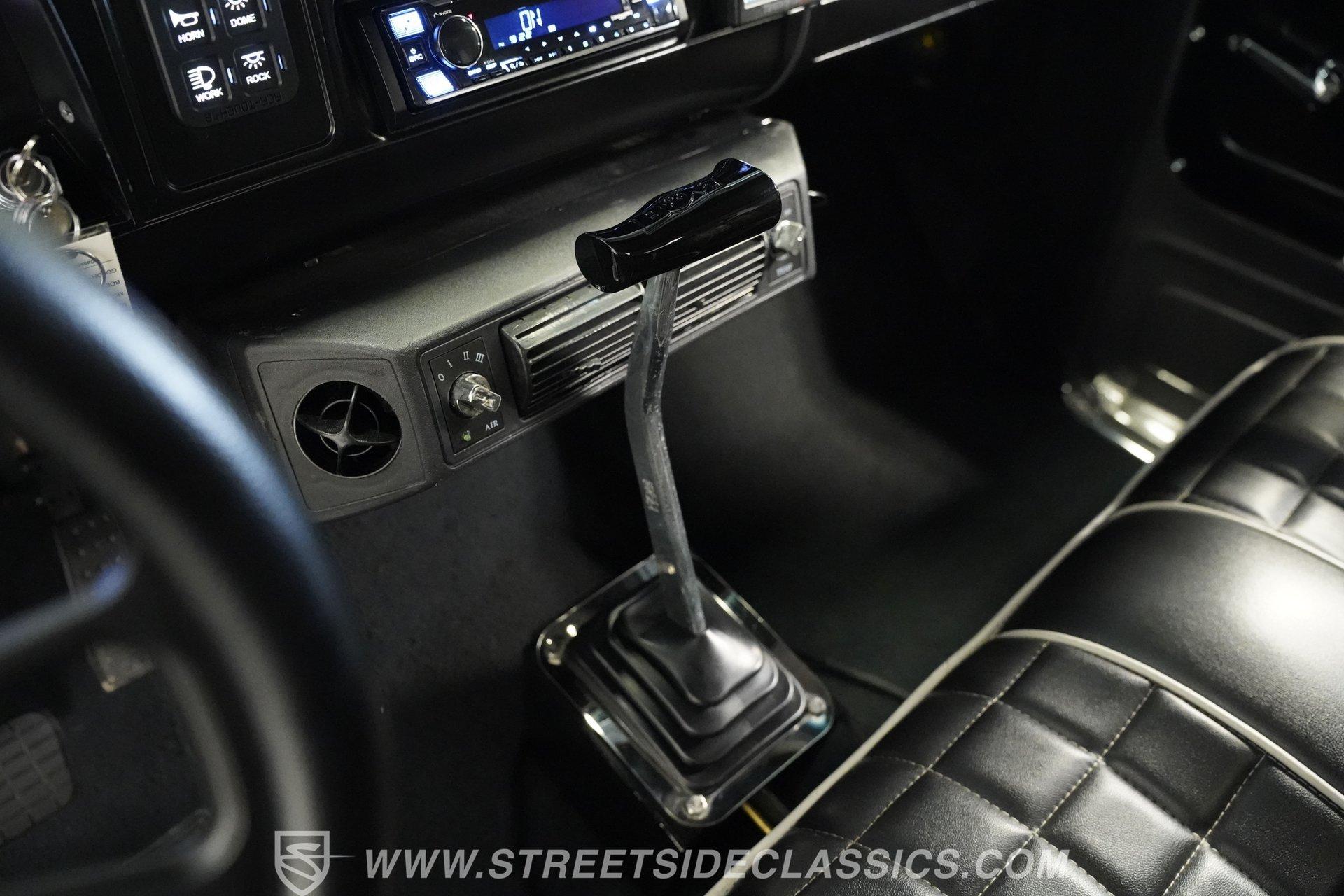 The interior is fully customized and just as impressive as the exterior. The small black door cards are in great shape, while the rest of both doors and the area where the headliner would normally be are painted to match the exterior color. The black vinyl bench seat features gray piping and diamond-stitched inserts and is presented in excellent condition. A blacked-out steering wheel continues the theme, paired with a black T-handle shifter on a B&M setup. The dash is clean, highlighted by a bright and easy-to-read Intellitronix digital gauge cluster. A Switch-Pros auxiliary switch panel is installed to the right of the steering wheel, with an aftermarket Kenwood stereo further over. Mounted under the radio is an aftermarket air conditioning unit, while a Holley EFI controller sits on the dash for quick tuning access. The result is a cabin that blends classic style with modern performance technology.