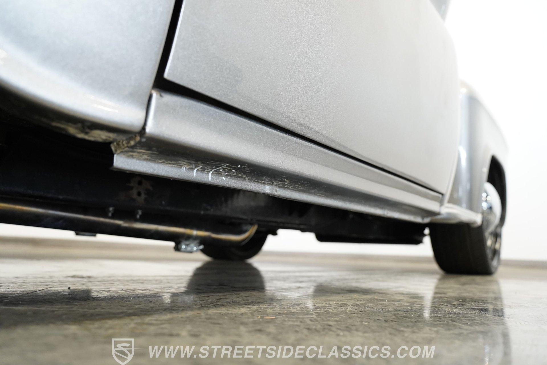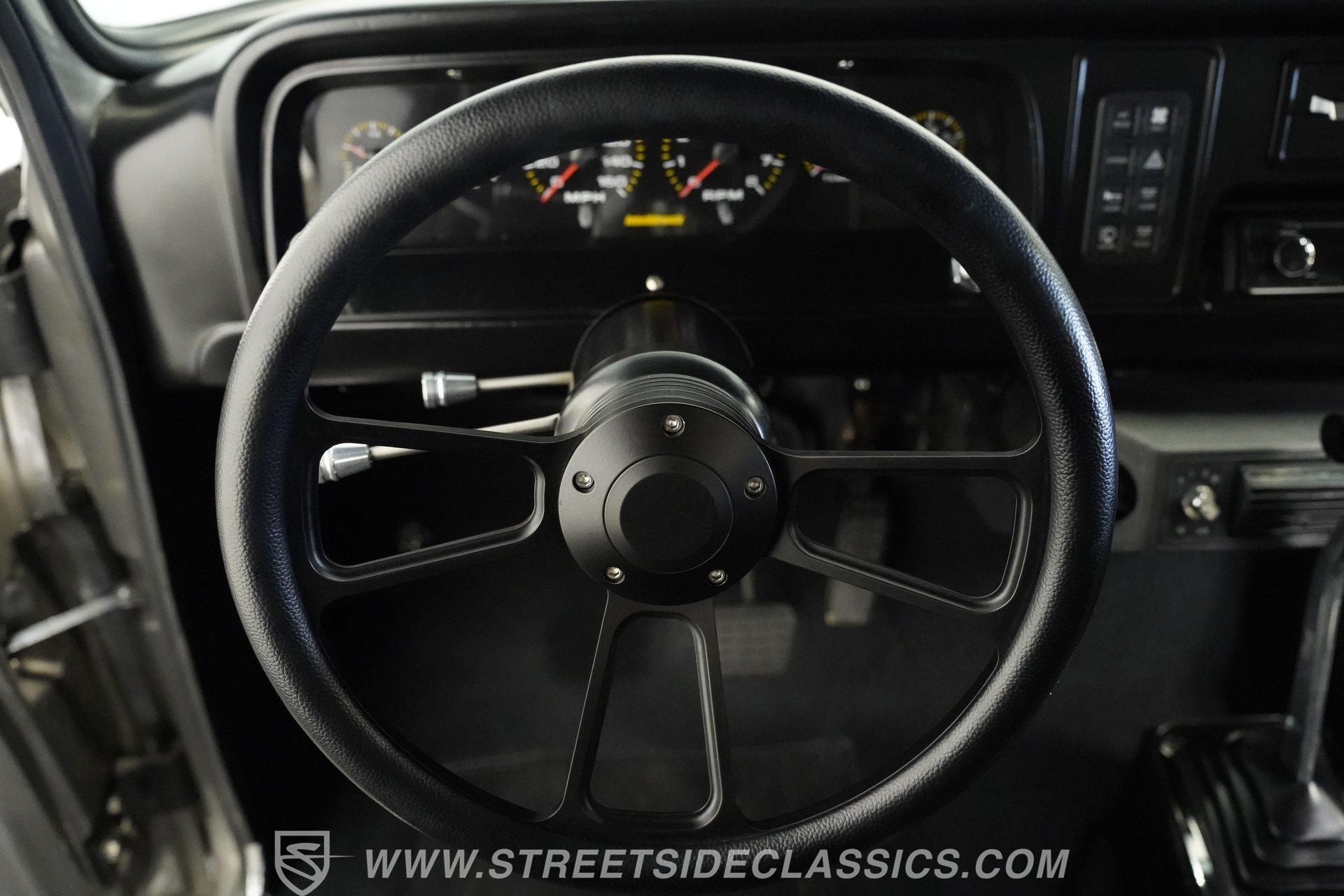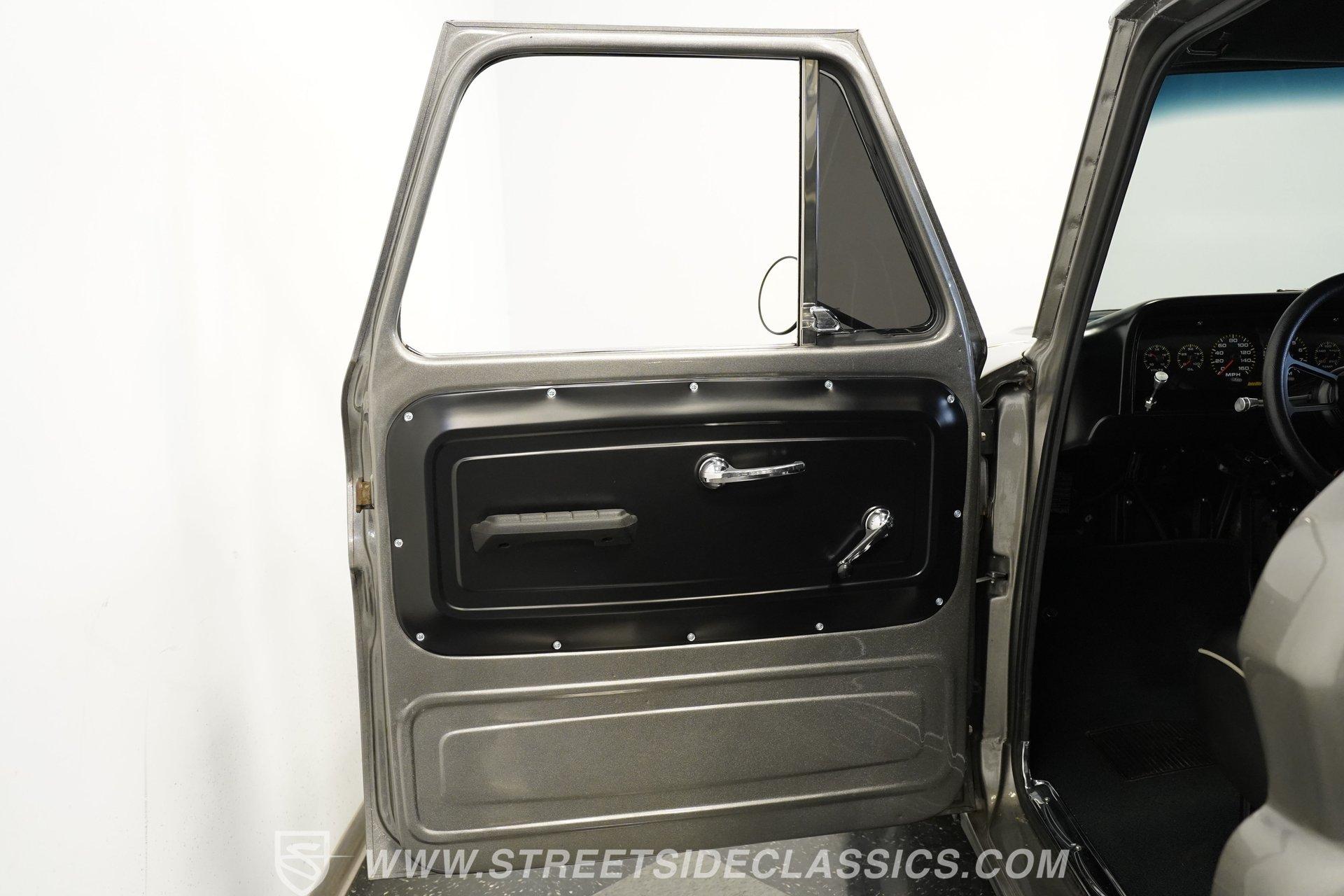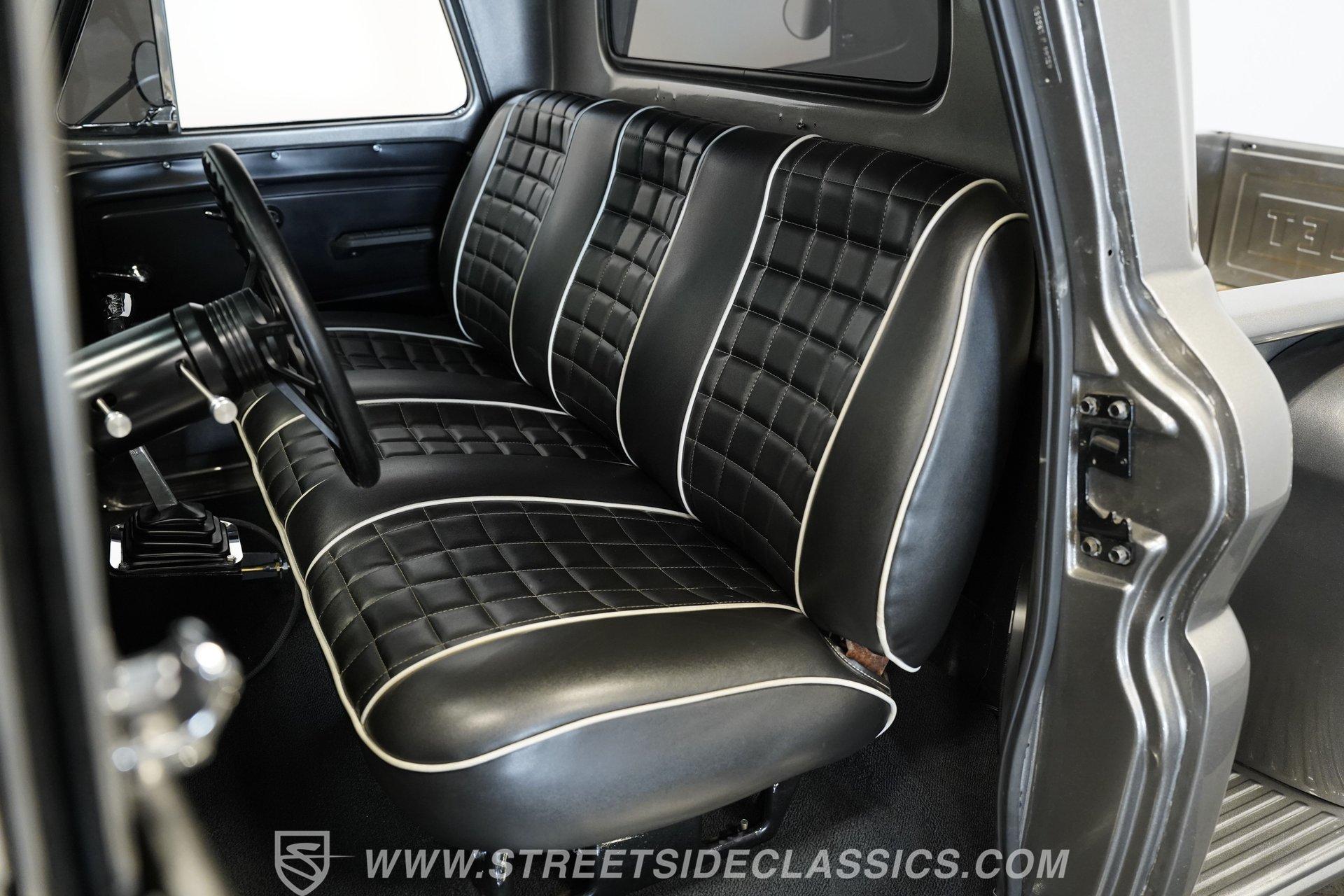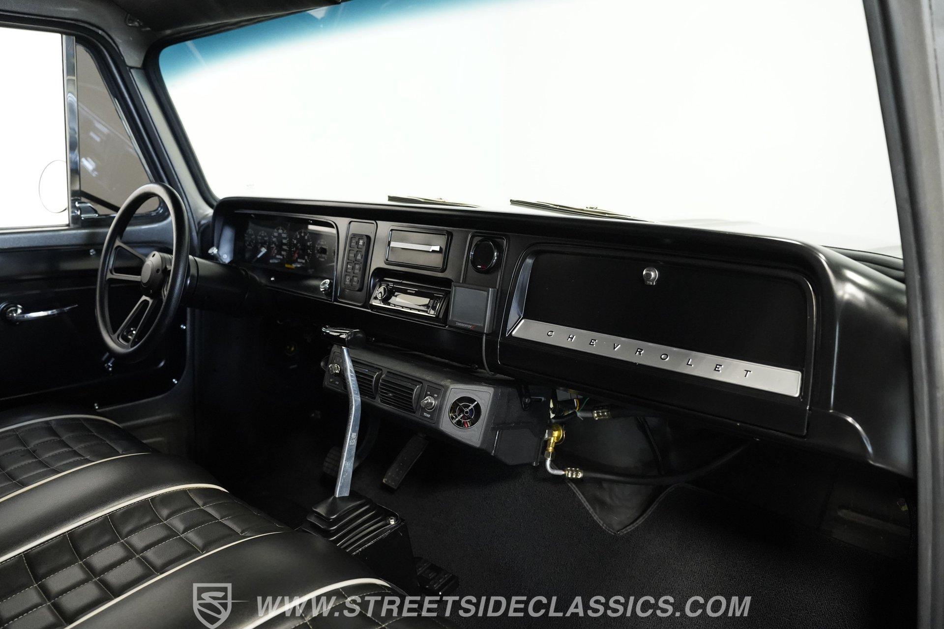 The interior is fully customized and just as impressive as the exterior. The small black door cards are in great shape, while the rest of both doors and the area where the headliner would normally be are painted to match the exterior color. The black vinyl bench seat features gray piping and diamond-stitched inserts and is presented in excellent condition. A blacked-out steering wheel continues the theme, paired with a black T-handle shifter on a B&M setup. The dash is clean, highlighted by a bright and easy-to-read Intellitronix digital gauge cluster. A Switch-Pros auxiliary switch panel is installed to the right of the steering wheel, with an aftermarket Kenwood stereo further over. Mounted under the radio is an aftermarket air conditioning unit, while a Holley EFI controller sits on the dash for quick tuning access. The result is a cabin that blends classic style with modern performance technology.