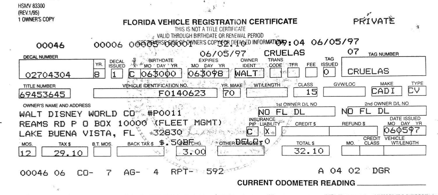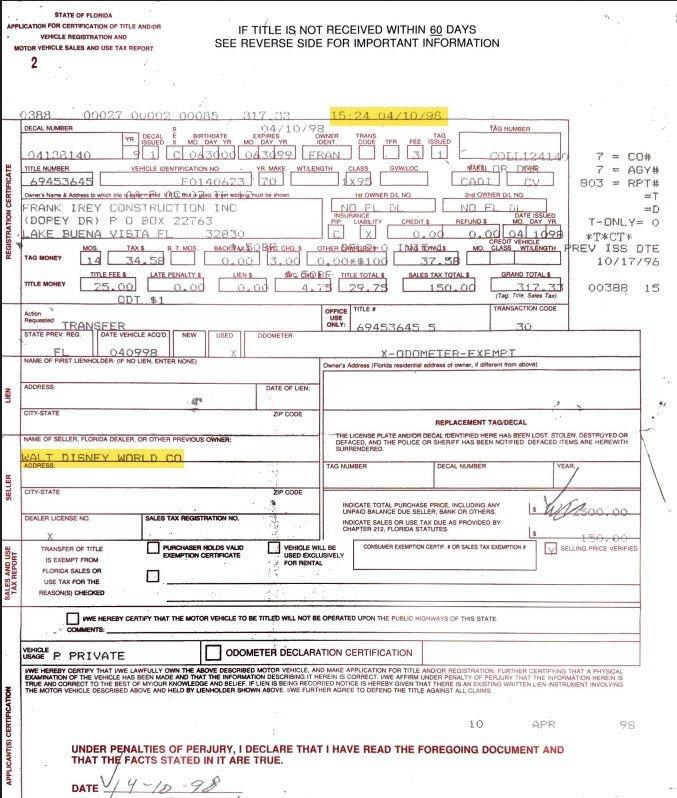 Original Florida registration listing Walt Disney World as the owner, with matching VIN
