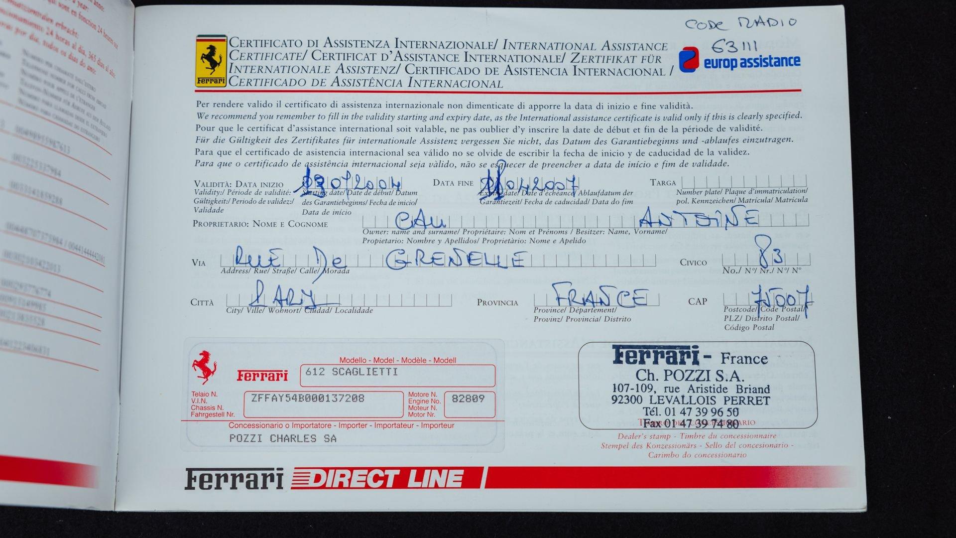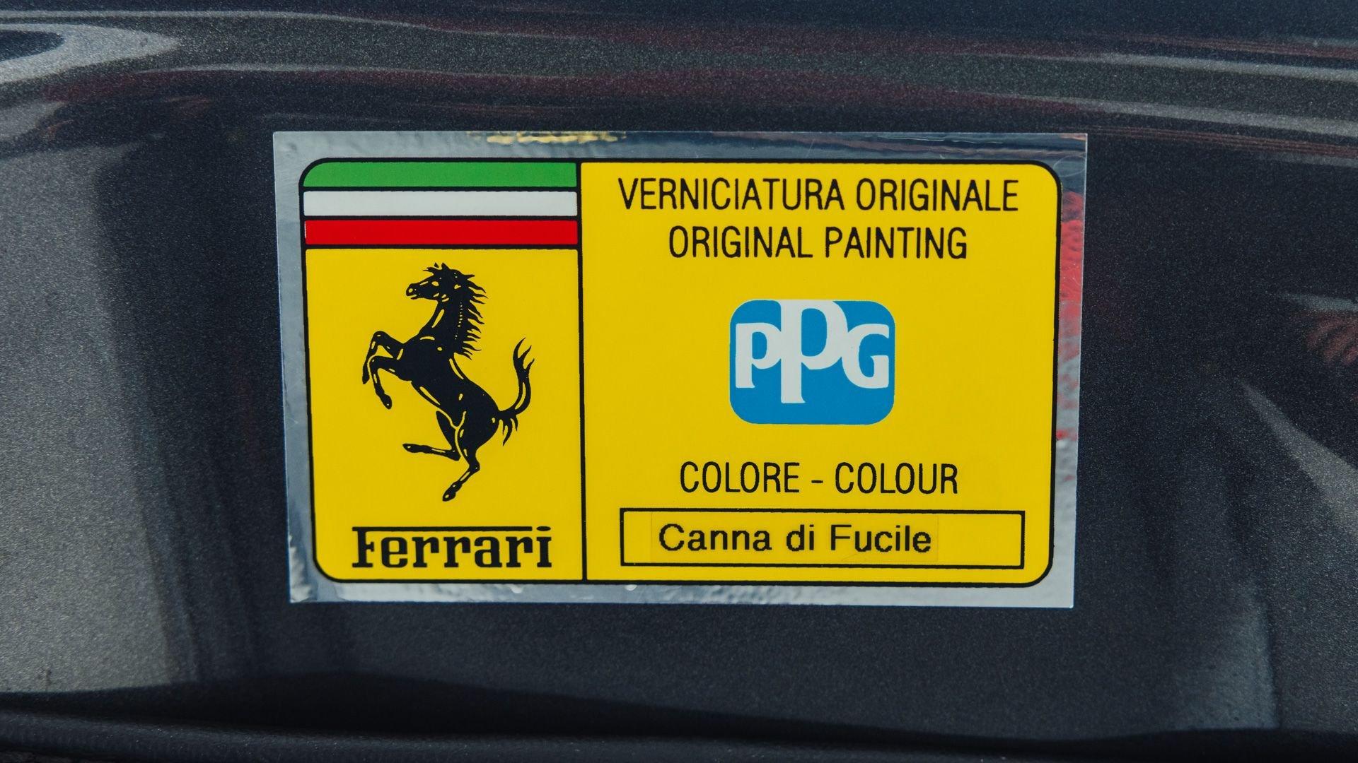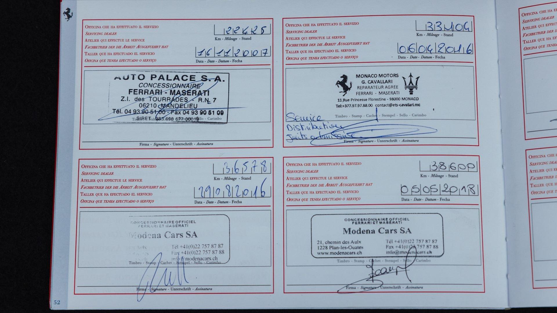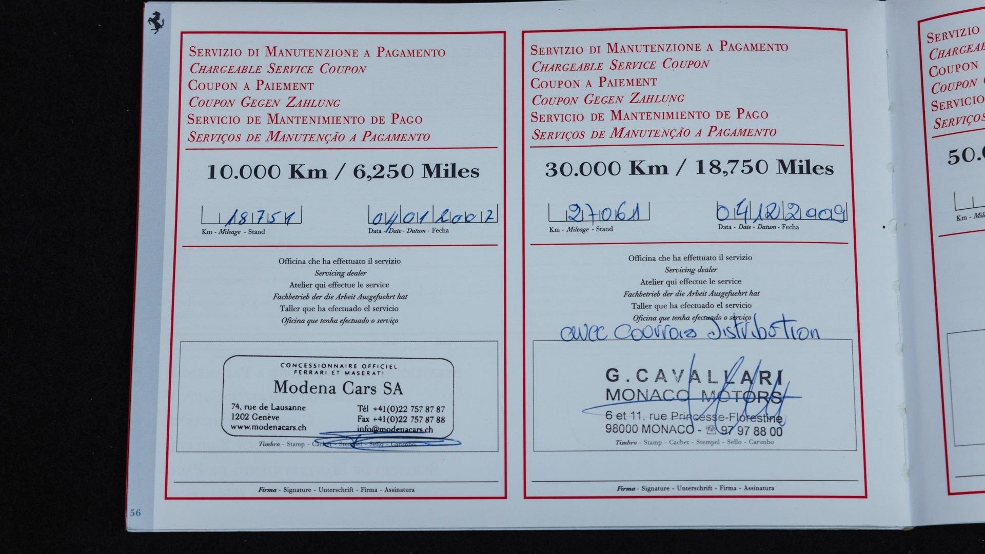 Accompanied by its manuals, stamped service book, and a file of invoices attesting to consistent and regular maintenance, the car spent many years on the French Riviera. It was primarily serviced by official Ferrari dealers Cavallari in Monaco and Modena Cars SA in Geneva, where it notably benefited from refurbishment work between 36,000 and 38,000 kilometers, including attention to the cooling system, suspension, cosmetic touch-ups, and the replacement of 'sticky buttons'.