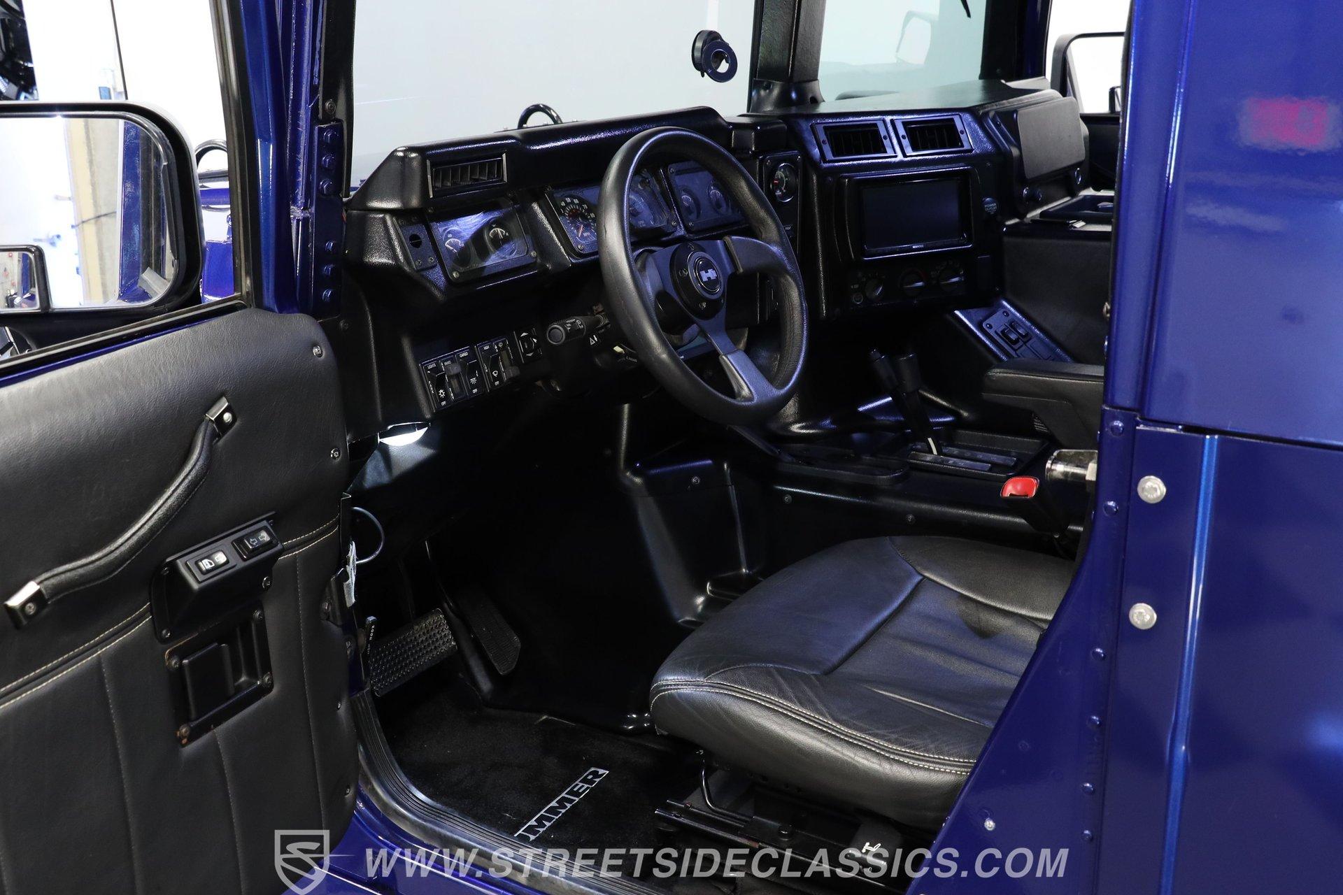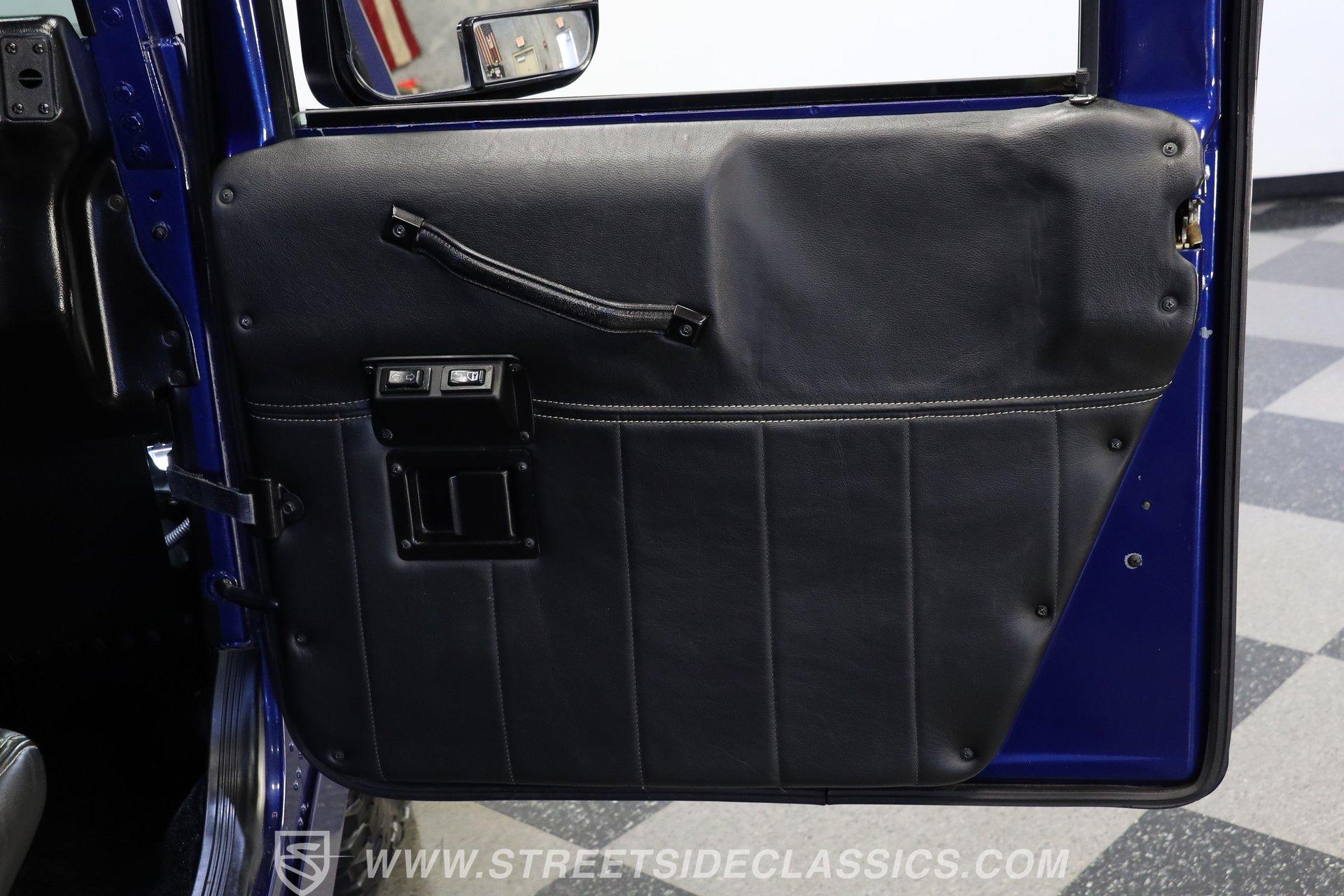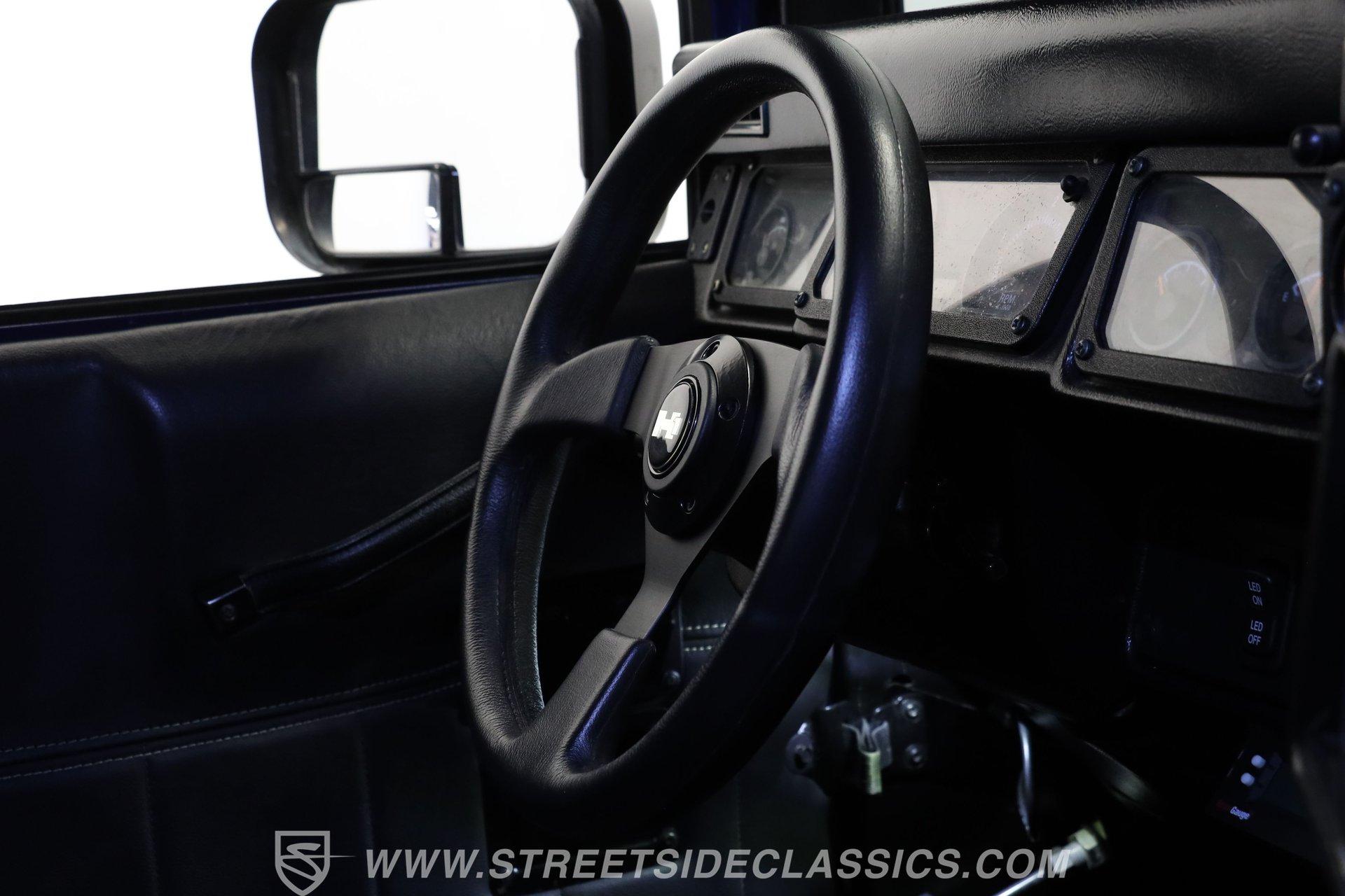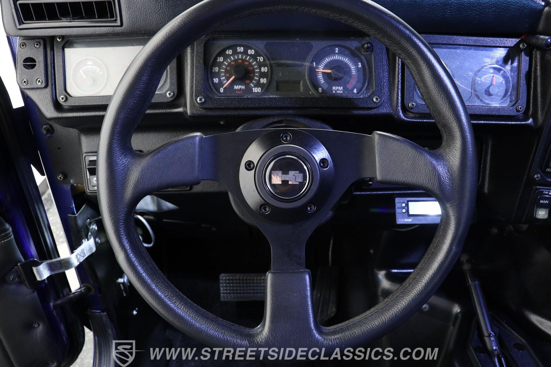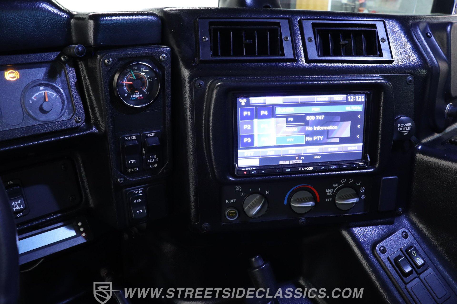 Inside, we find a relatively posh interior for a Hummer. A large center console separates a pair of high-back leather bucket seats, while a three-spoke power-assisted wheel sits ahead of a Spartan two-pod gauge cluster featuring a 100-mph speedometer and 4,000-rpm tachometer. Power windows and cruise control make life a bit easier, while the upgraded Kenwood AM/FM/AUX touchscreen head unit offers satellite and Bluetooth connectivity to provide far more soundtrack options than the unit it replaces.