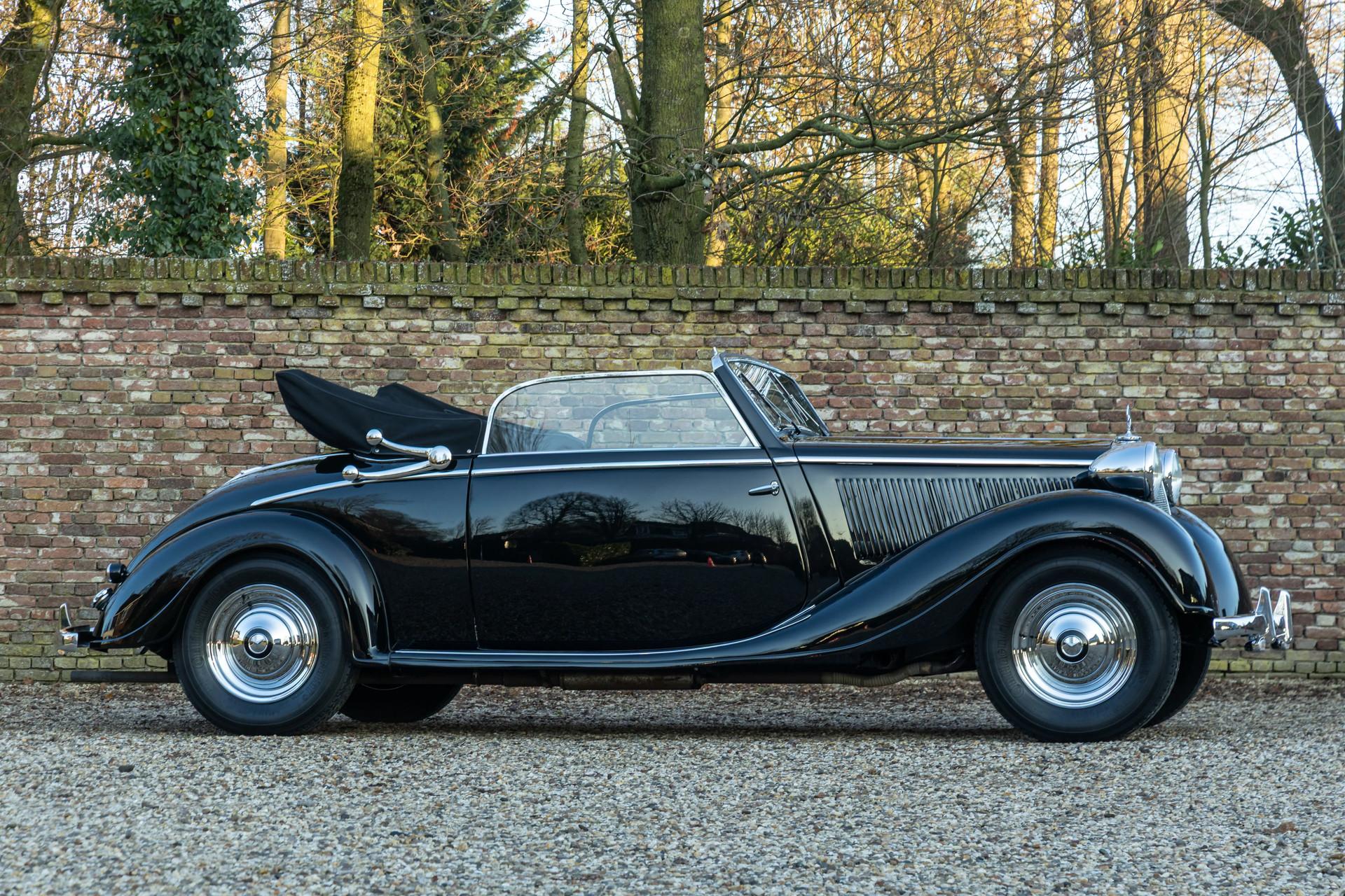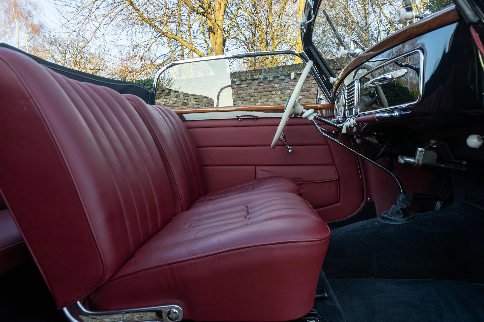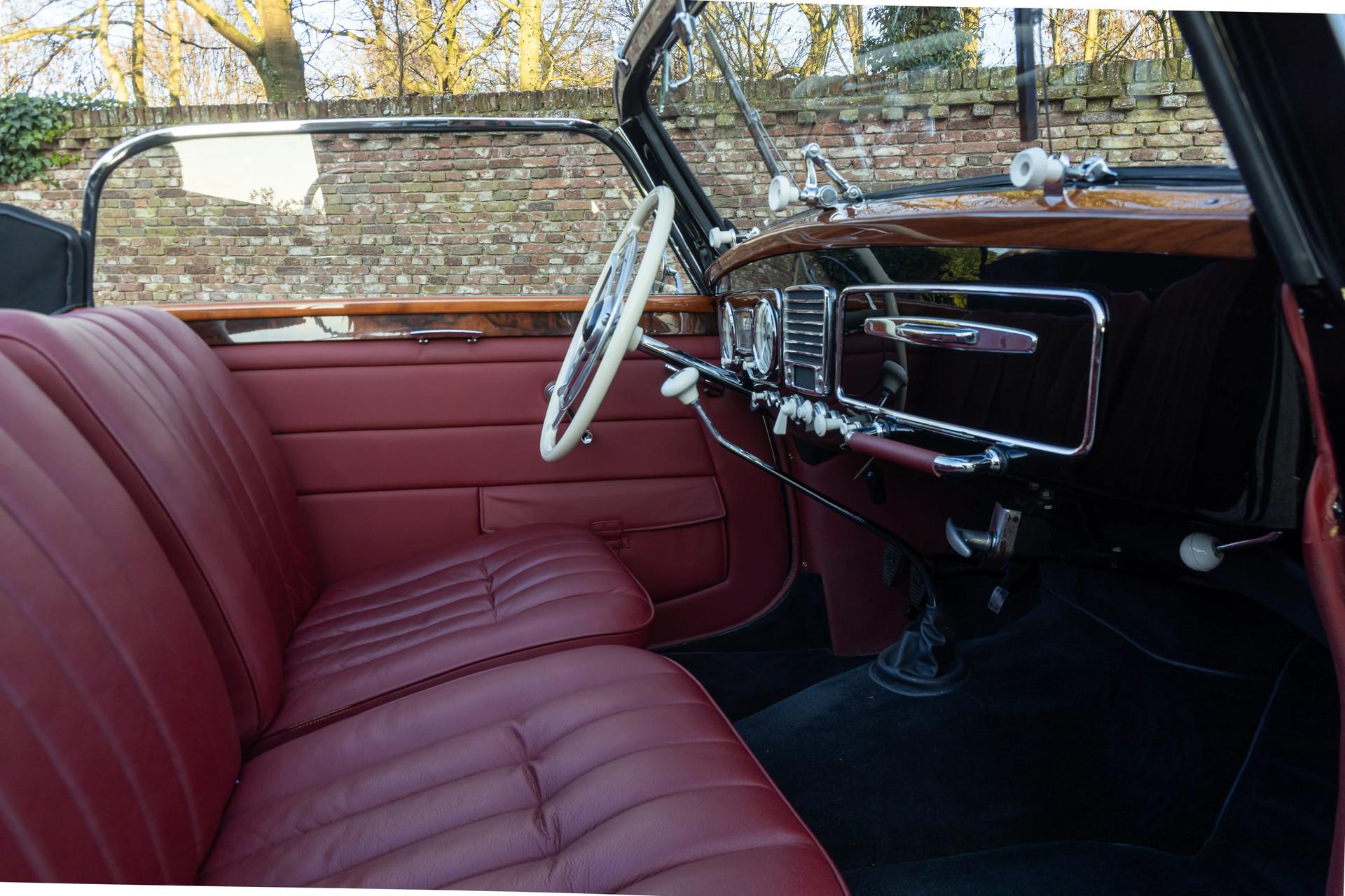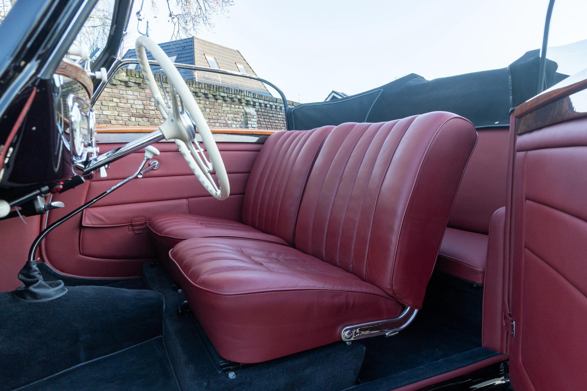 This 230A Cabriolet is finished in a deep black paintwork that beautifully accentuates the coachwork lines, giving the impression that the car has driven straight out of a pre-war motion picture. Paired with a striking red leather interior, the overall presentation is exceptionally elegant. What makes this cabriolet particularly special is its distinctive body design: far from a commonplace sight, it is a variant with its own character and presence, clearly setting it apart from the more familiar open models of the era.