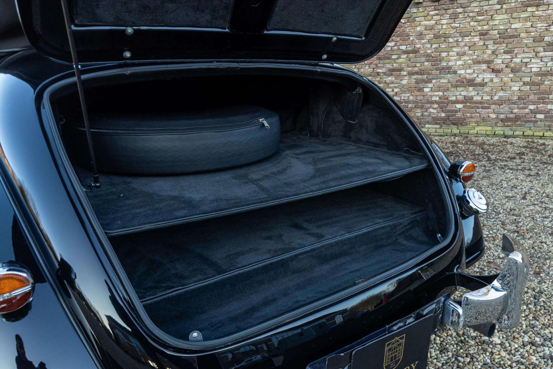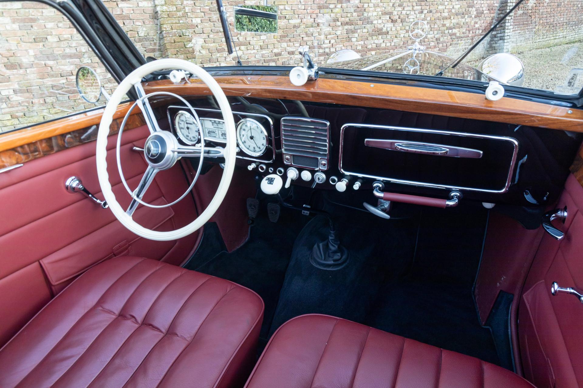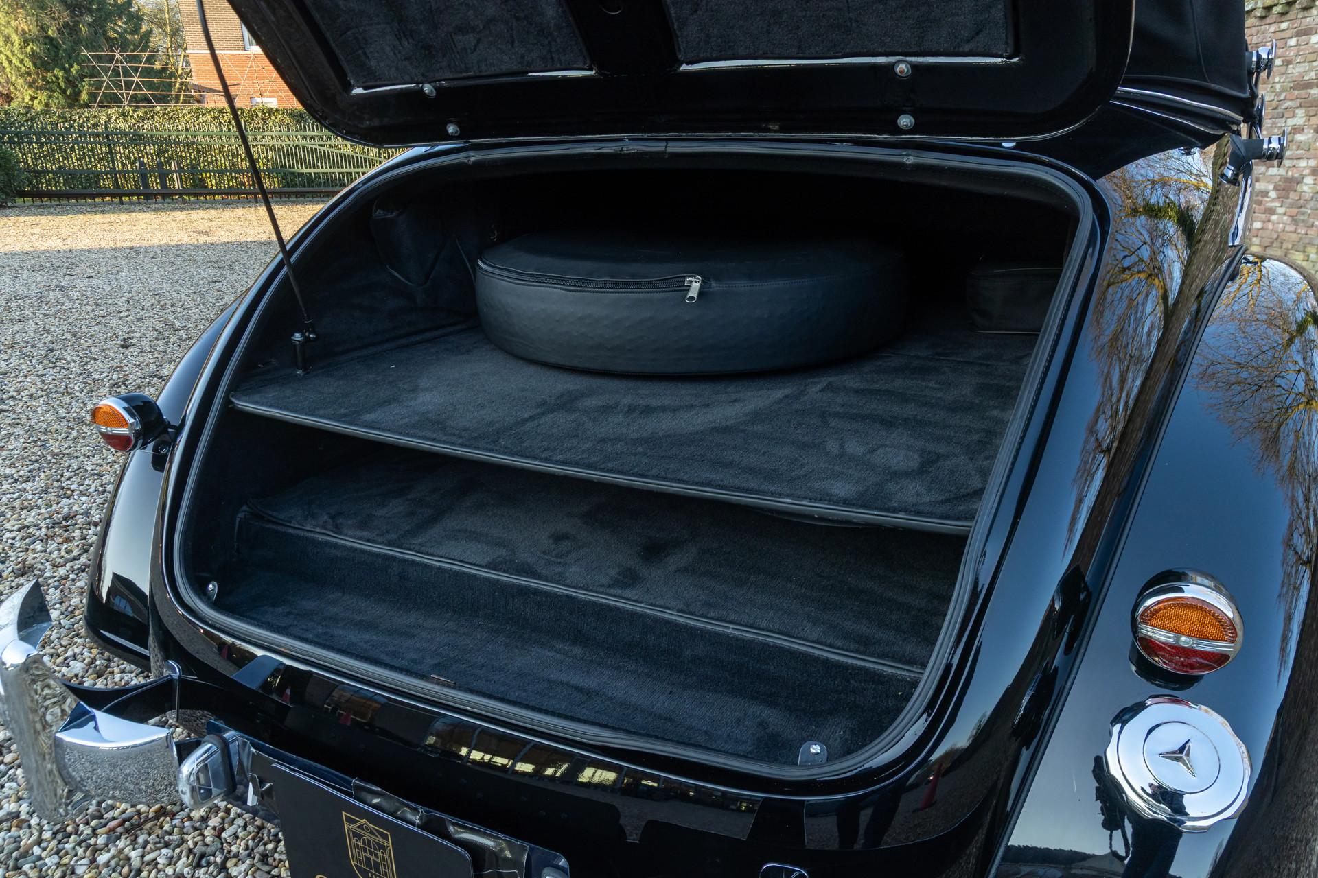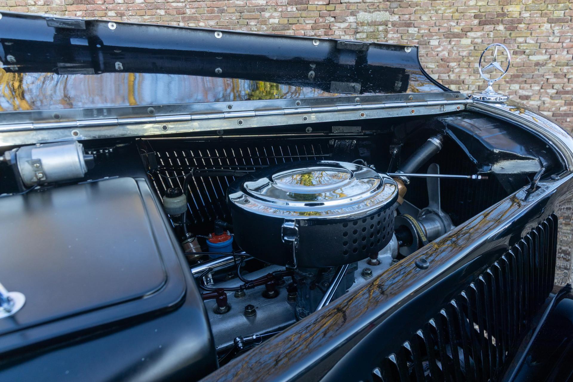 This 230A Cabriolet is finished in a deep black paintwork that beautifully accentuates the coachwork lines, giving the impression that the car has driven straight out of a pre-war motion picture. Paired with a striking red leather interior, the overall presentation is exceptionally elegant. What makes this cabriolet particularly special is its distinctive body design: far from a commonplace sight, it is a variant with its own character and presence, clearly setting it apart from the more familiar open models of the era.
