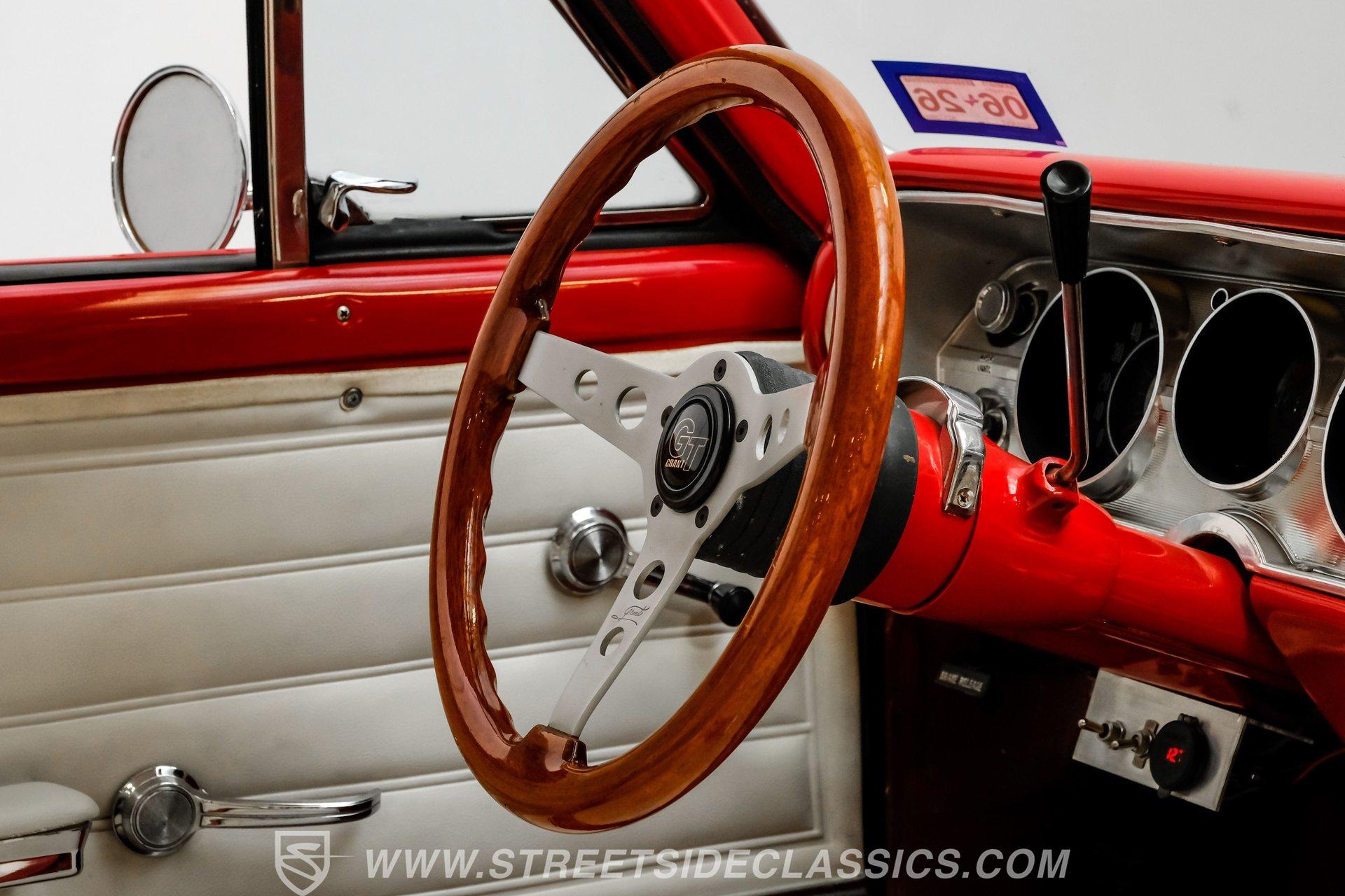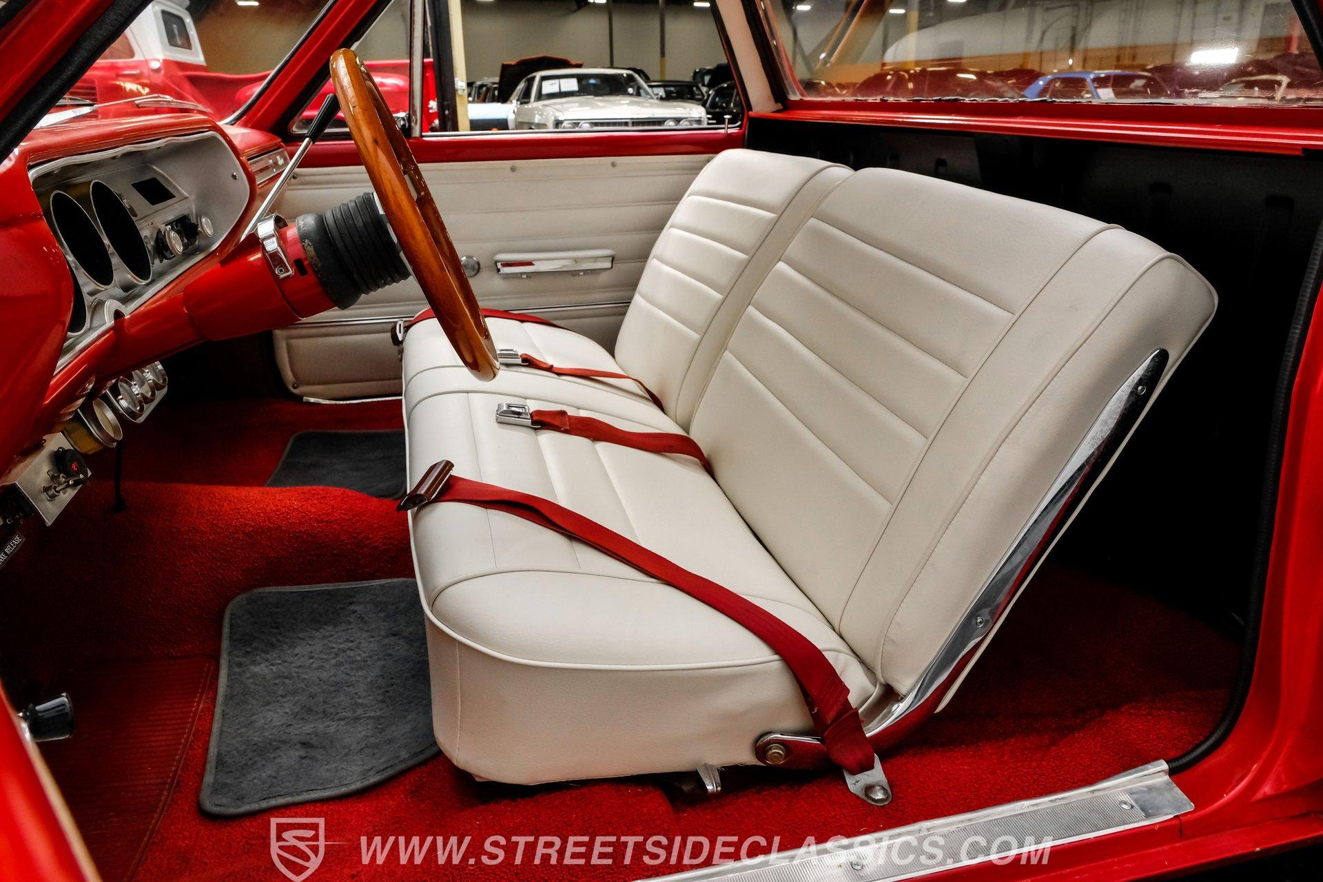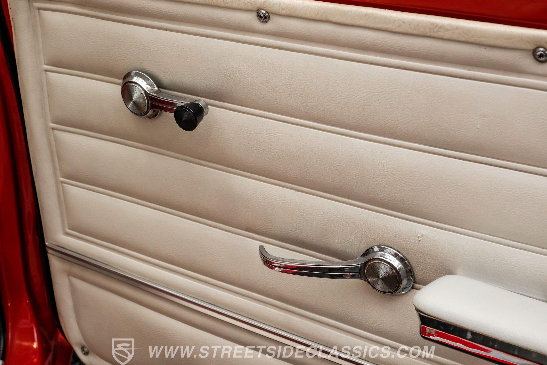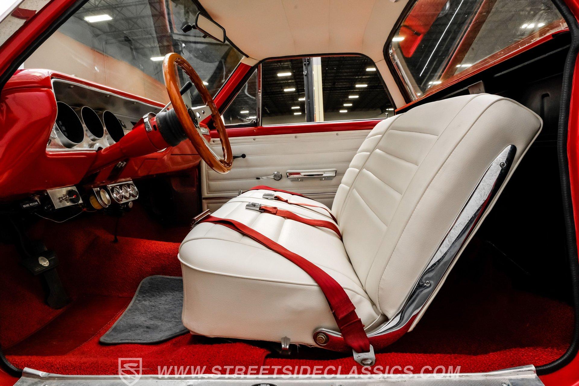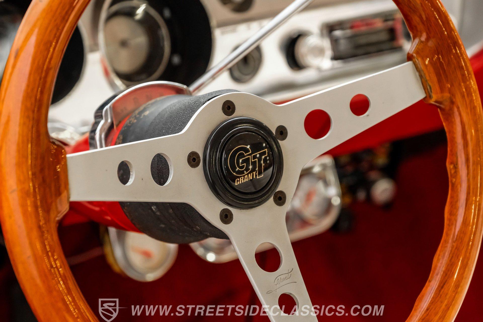 Step inside and you'll find a tastefully refreshed interior that blends classic charm with thoughtful updates. The white vinyl bench seat, complemented by bold red seatbelts and matching white door panels, creates a striking contrast against the red carpet and painted dash. A wood-rim Grant GT steering wheel adds a sporty touch, while under-dash auxiliary gauges and a retro-style radio (on display) echo the car's vintage roots. The headliner and door panels are clean and inviting, making this cabin as comfortable as it is stylish.