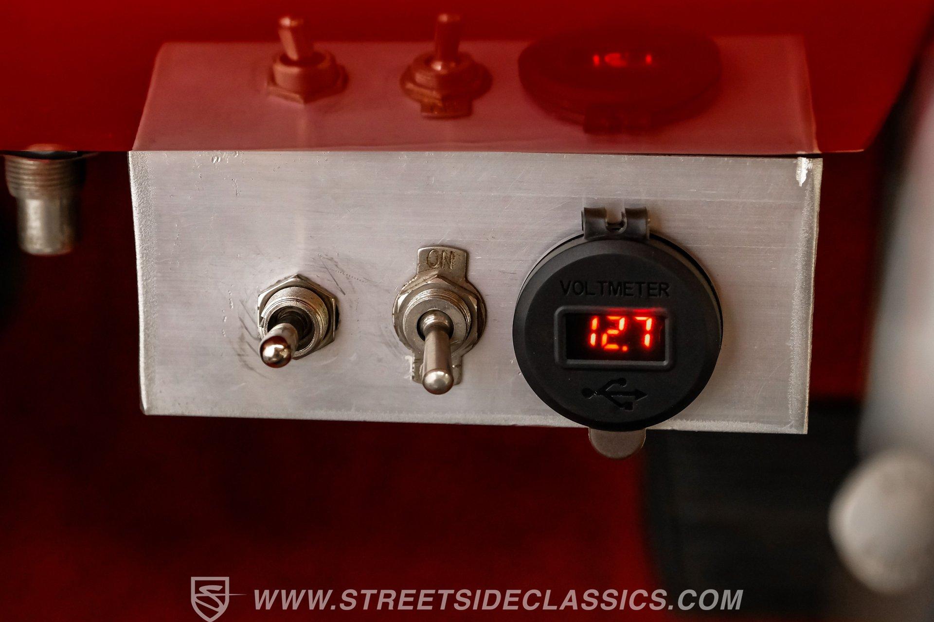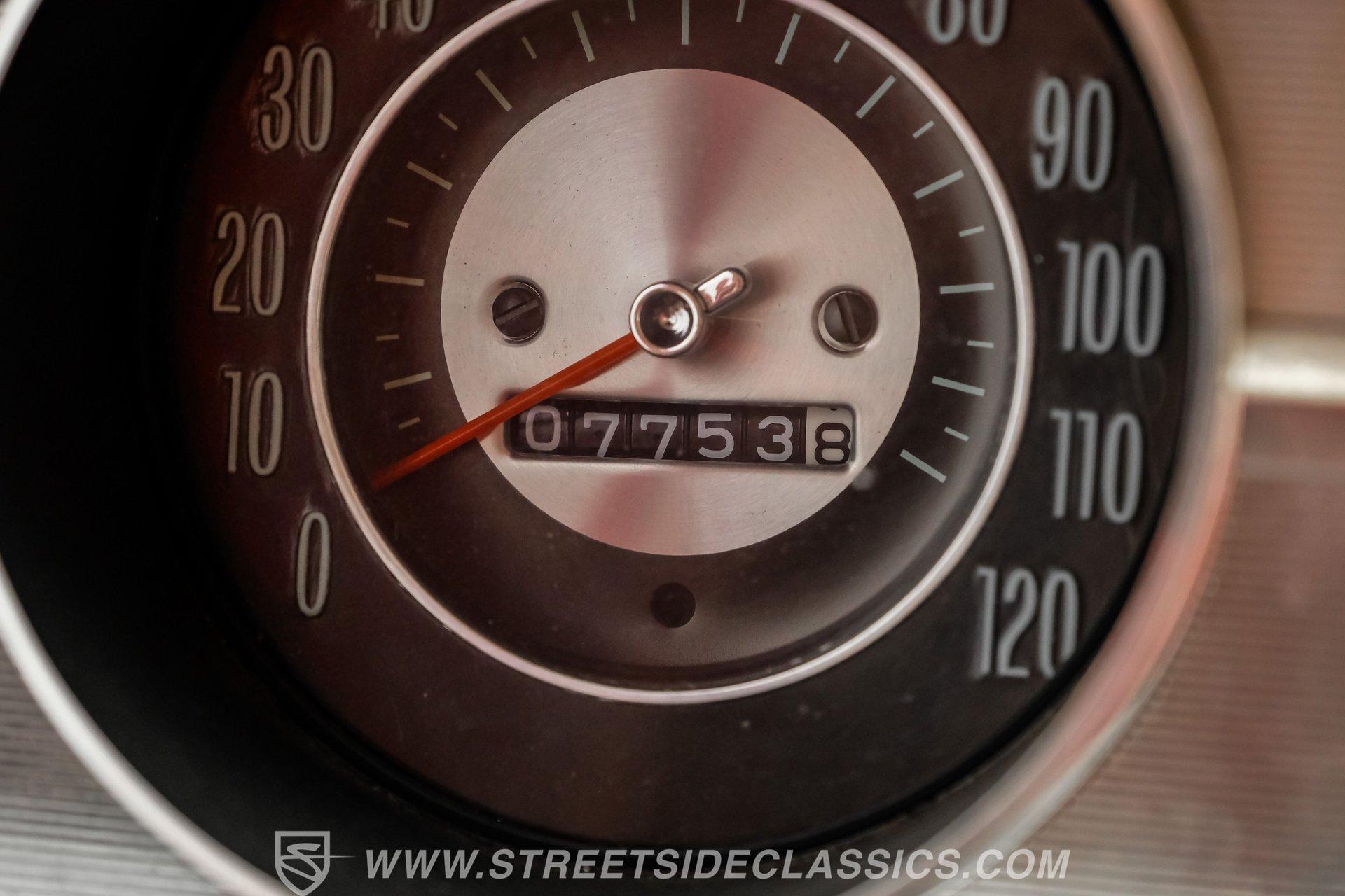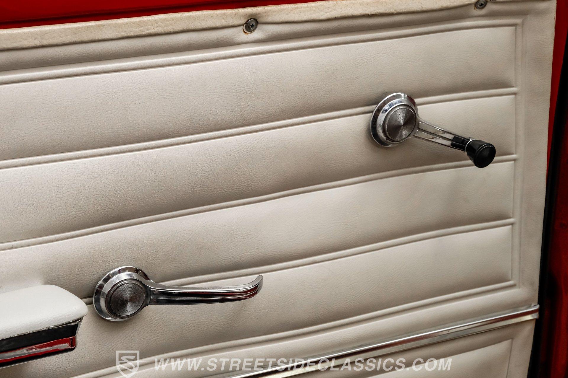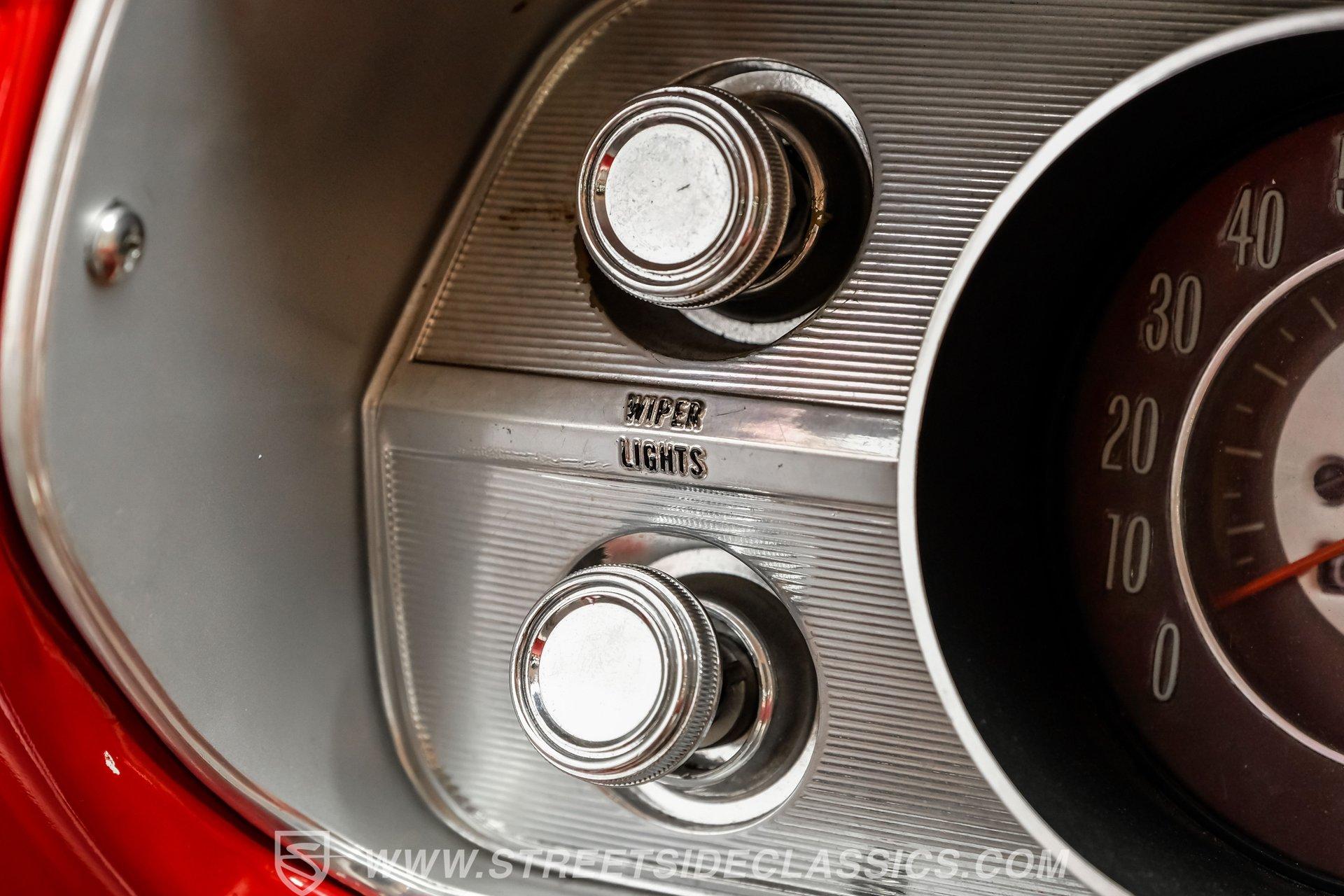 Step inside and you'll find a tastefully refreshed interior that blends classic charm with thoughtful updates. The white vinyl bench seat, complemented by bold red seatbelts and matching white door panels, creates a striking contrast against the red carpet and painted dash. A wood-rim Grant GT steering wheel adds a sporty touch, while under-dash auxiliary gauges and a retro-style radio (on display) echo the car's vintage roots. The headliner and door panels are clean and inviting, making this cabin as comfortable as it is stylish.