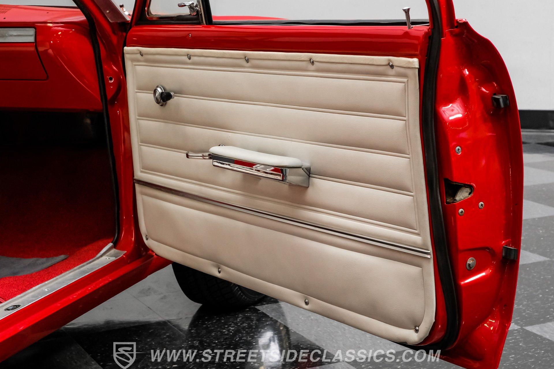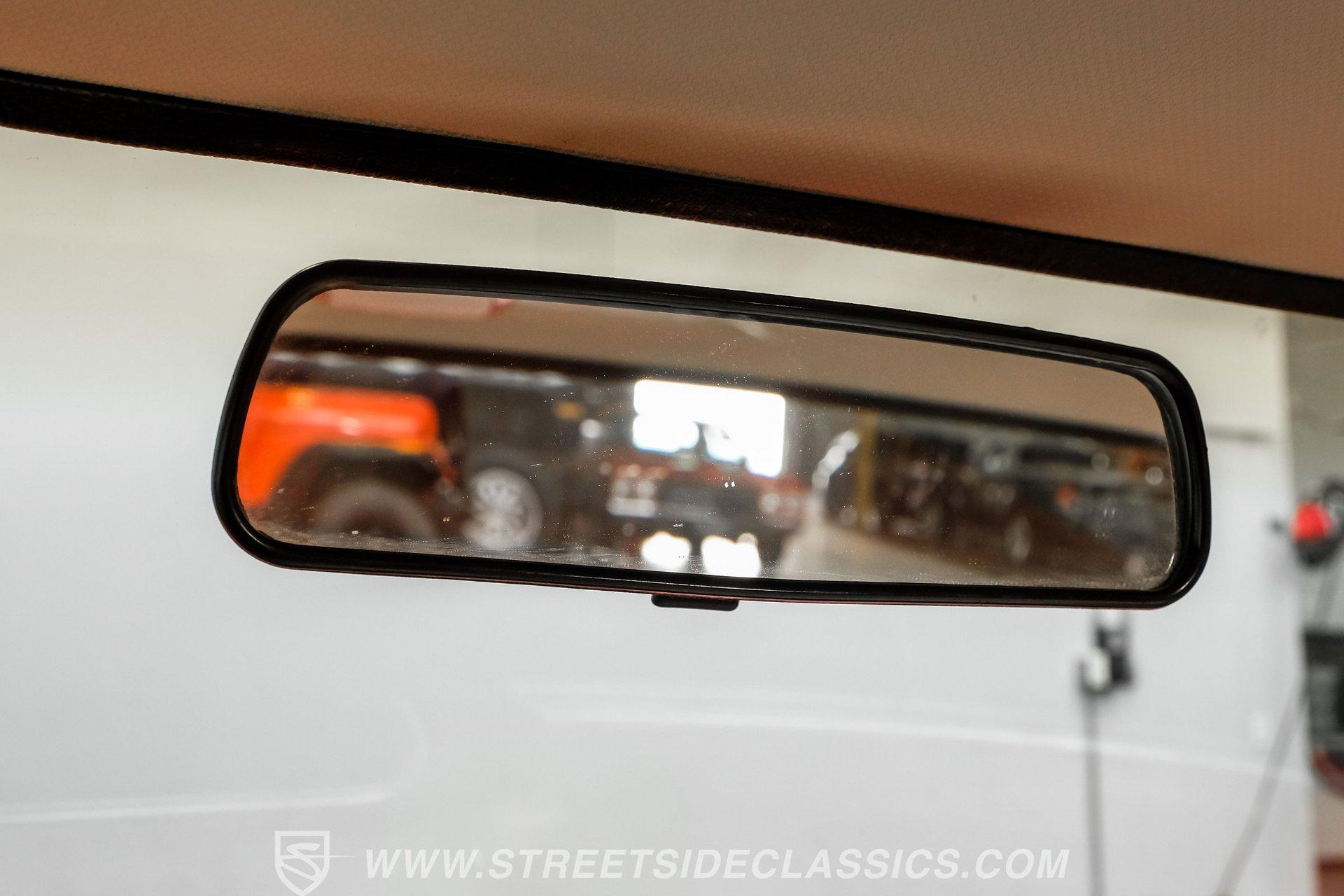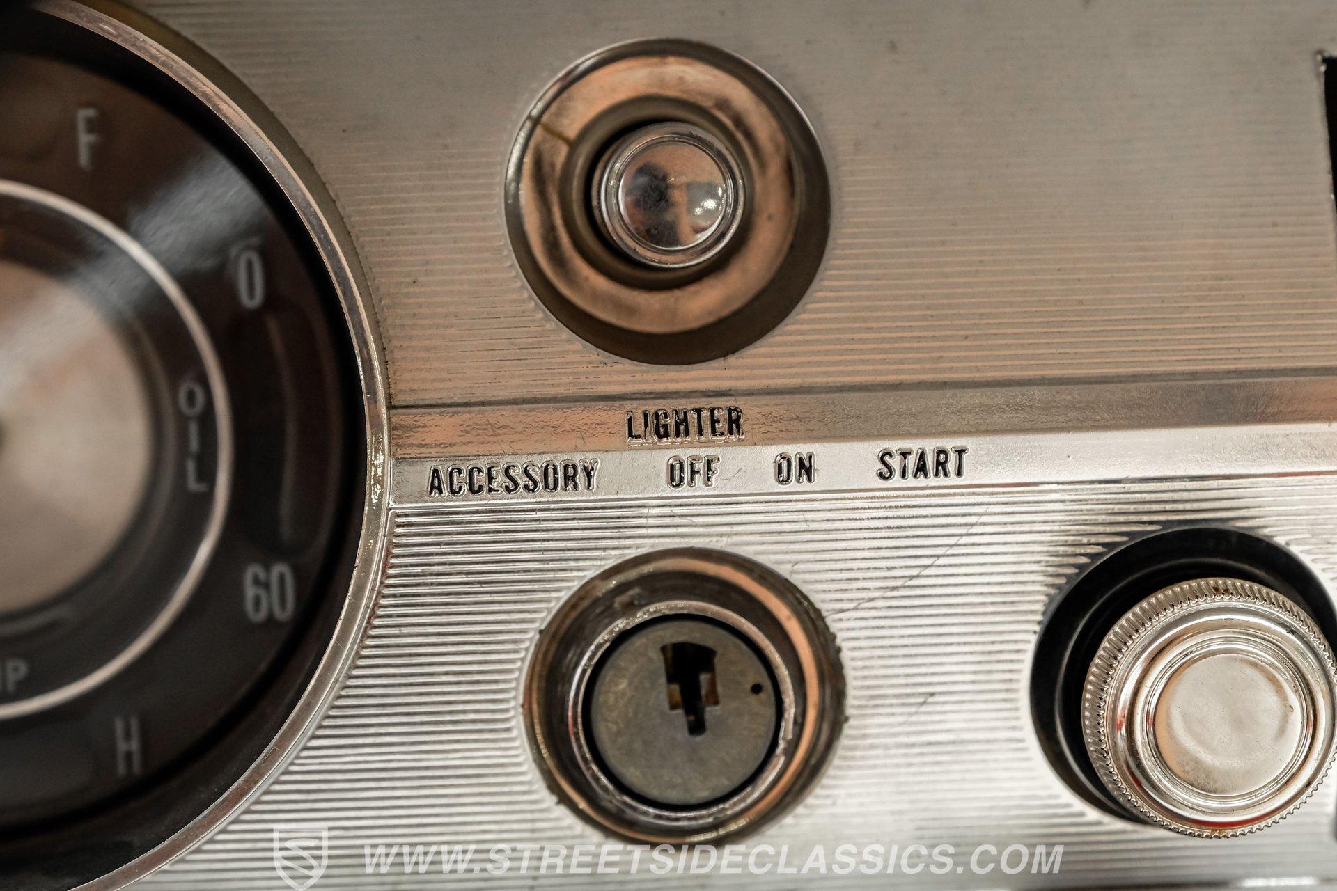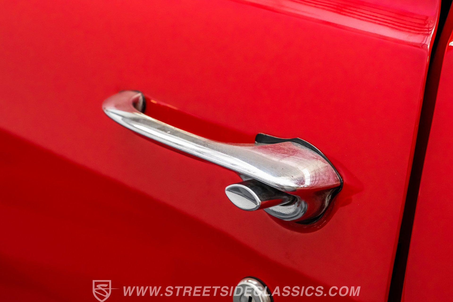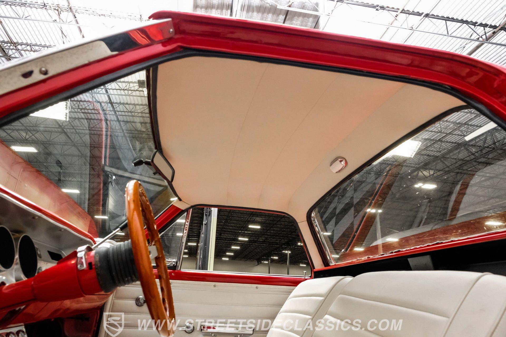 Step inside and you'll find a tastefully refreshed interior that blends classic charm with thoughtful updates. The white vinyl bench seat, complemented by bold red seatbelts and matching white door panels, creates a striking contrast against the red carpet and painted dash. A wood-rim Grant GT steering wheel adds a sporty touch, while under-dash auxiliary gauges and a retro-style radio (on display) echo the car's vintage roots. The headliner and door panels are clean and inviting, making this cabin as comfortable as it is stylish.
