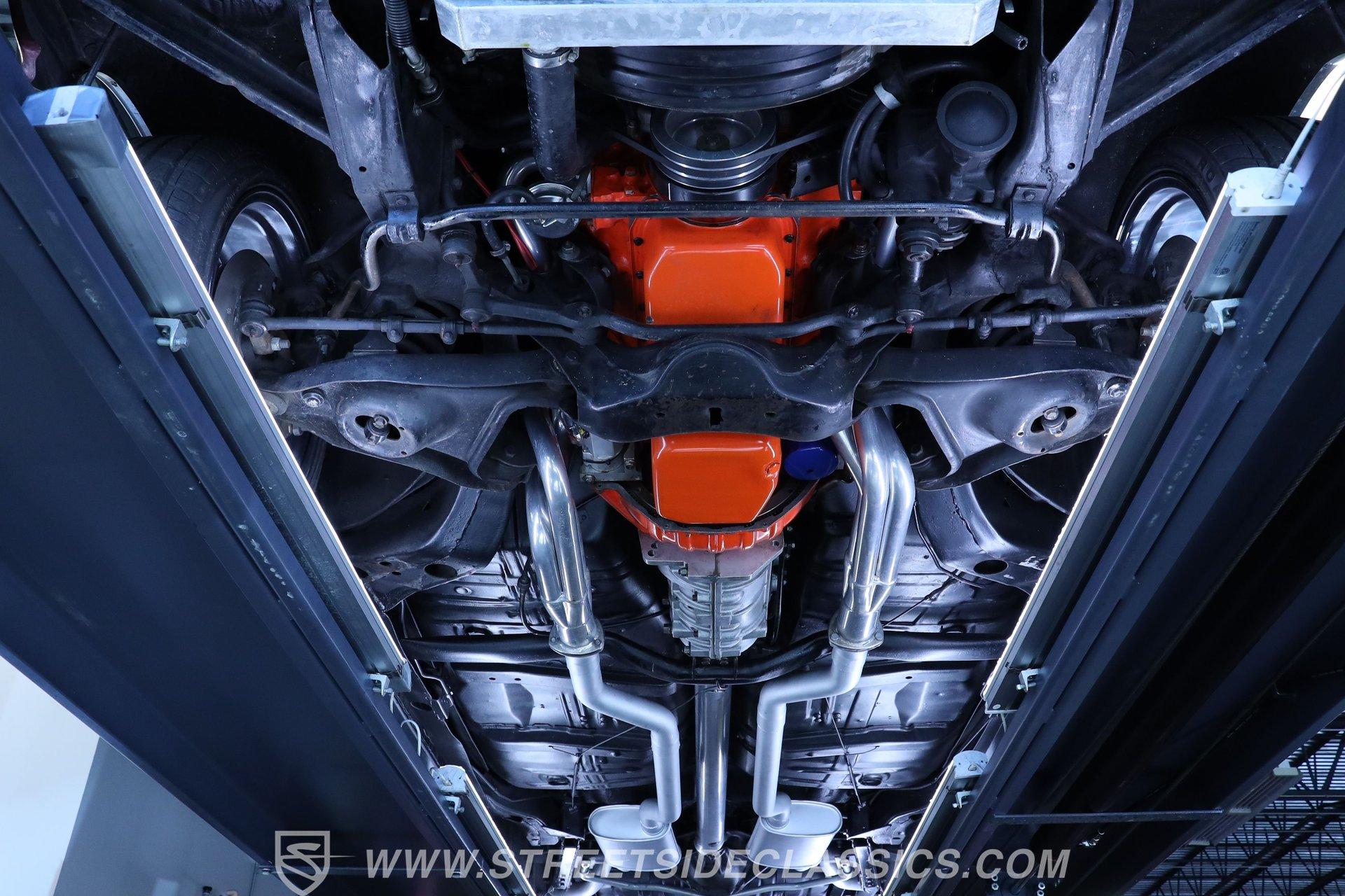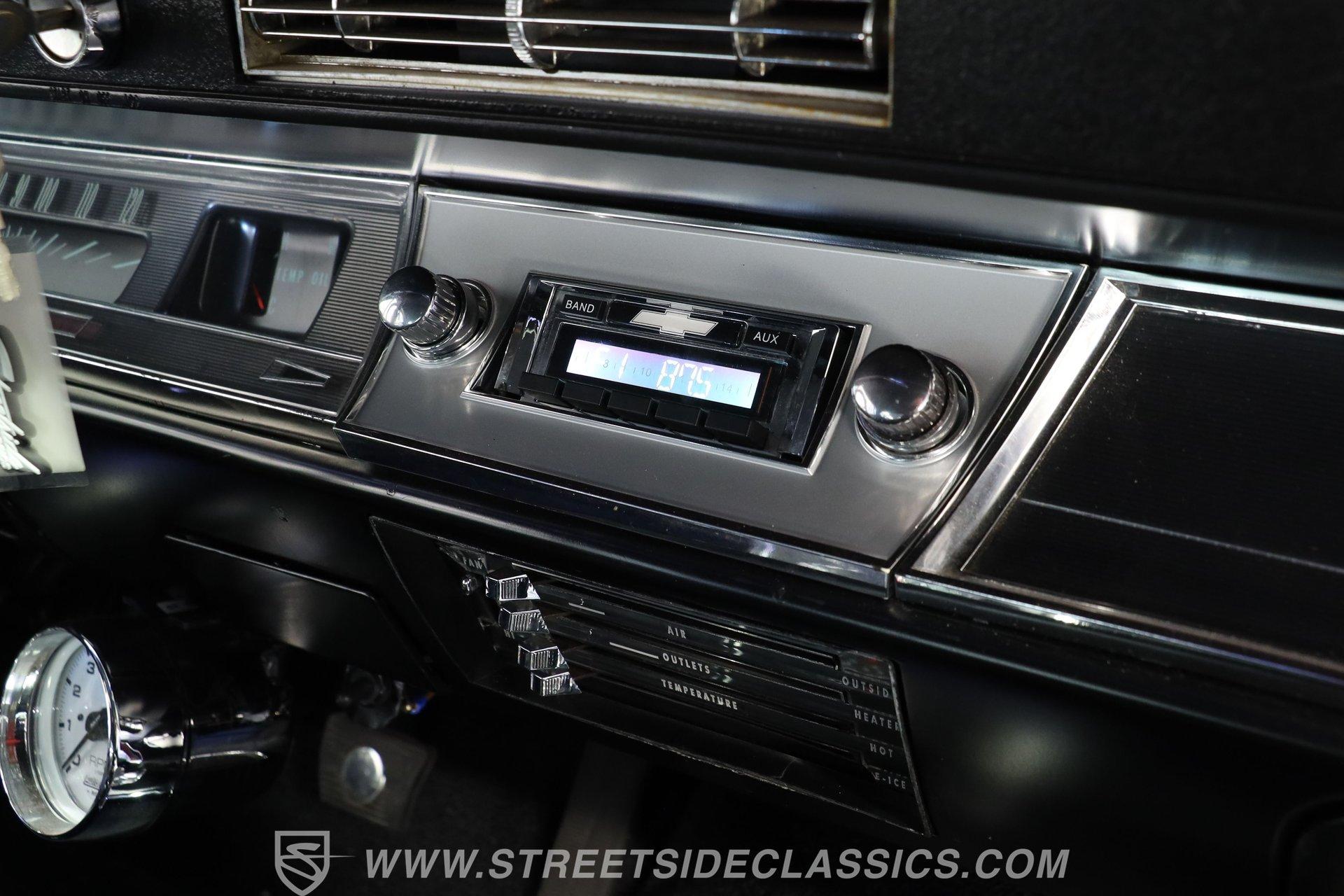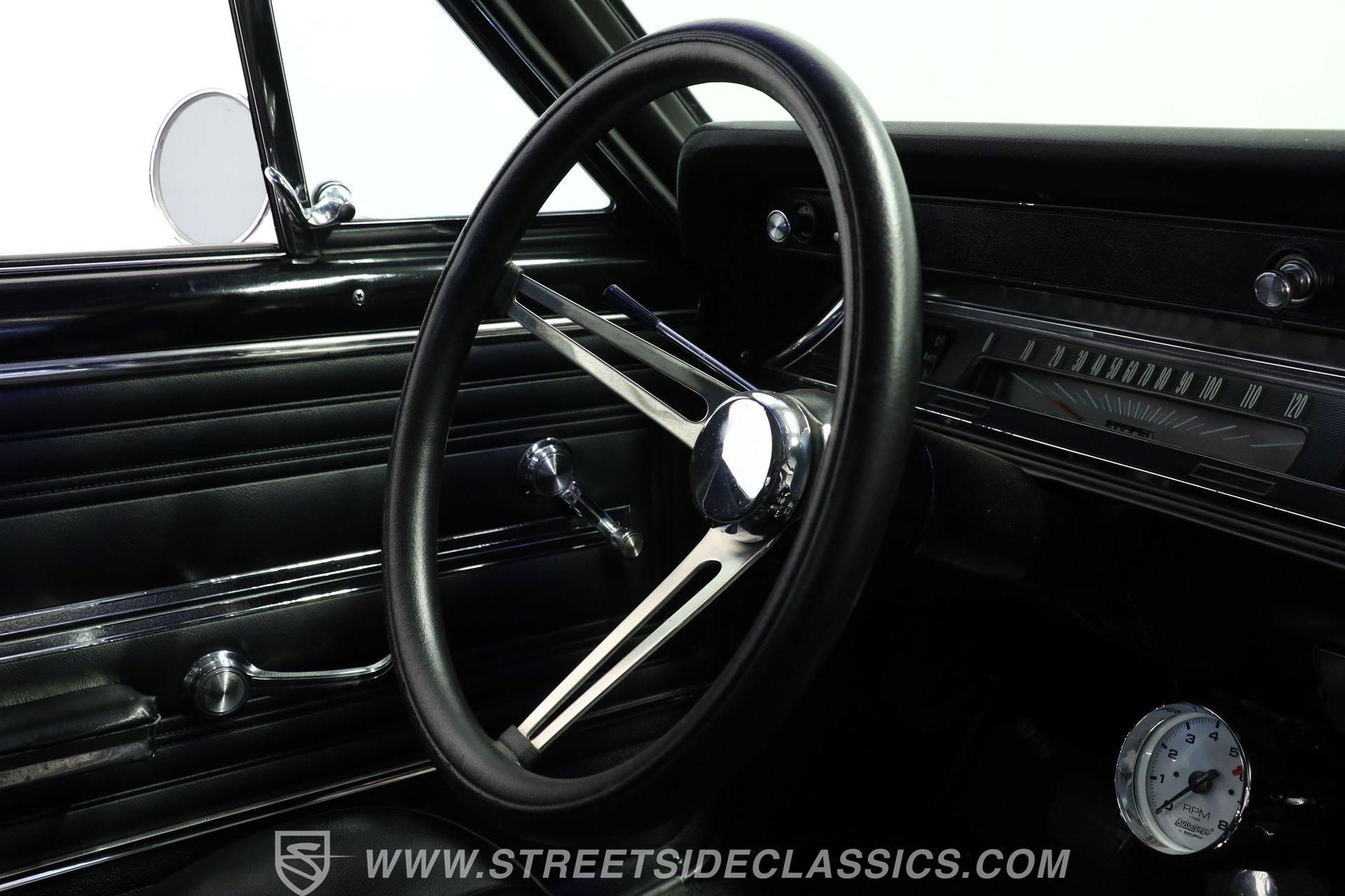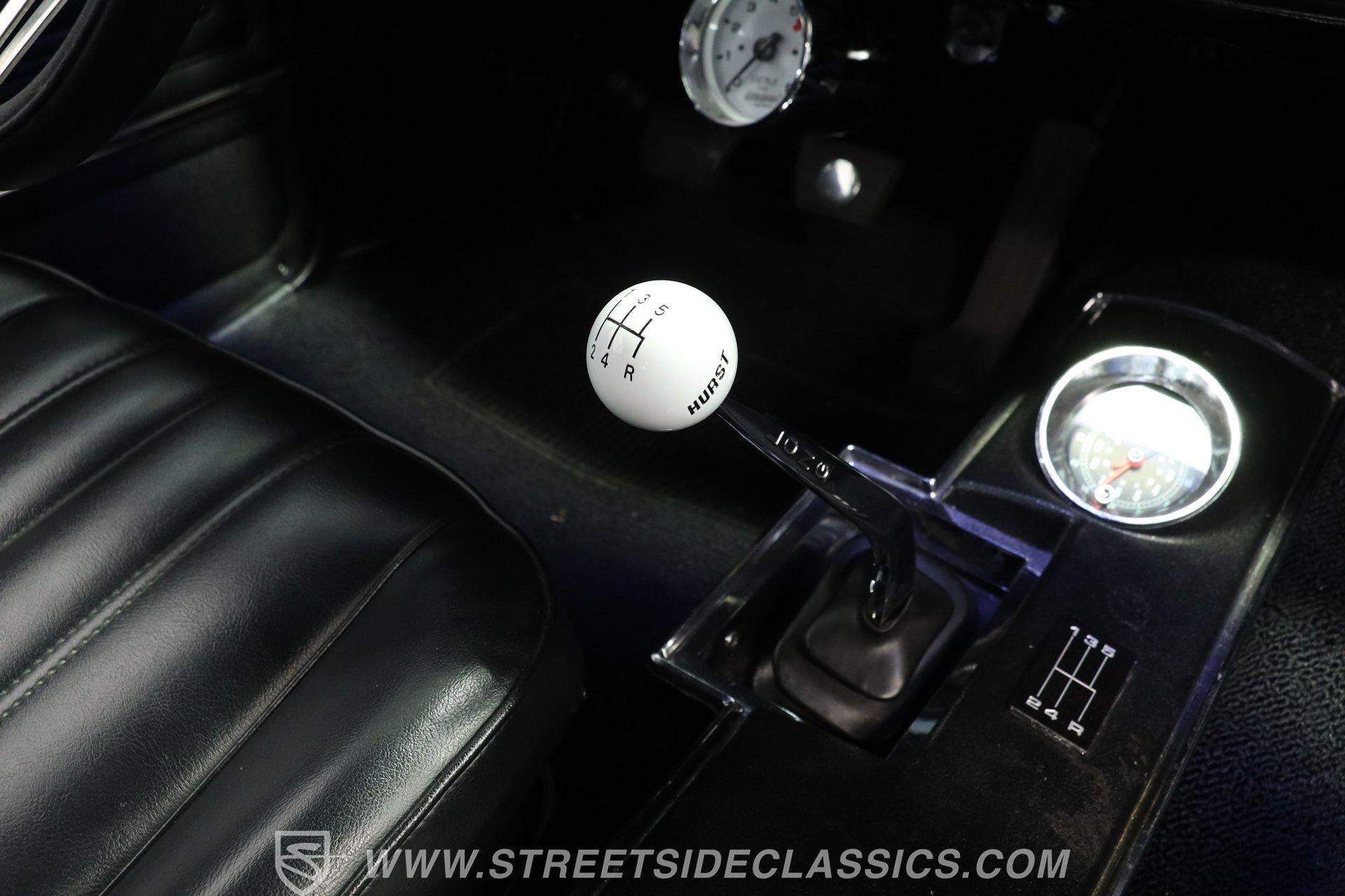 Step inside and discover a cabin that balances vintage style with comfort. The black vinyl seats are in excellent condition, inviting you to settle in for the ride. Both the door panels and headliner look fresh and crisp, while the dashboard maintains its classic appeal with only the most subtle signs of age. The center console features a chrome Hurst shifter, and a retro sound radio with modern touches ensures you enjoy every mile with your favorite tunes. An aftermarket tachometer sits neatly under the dash, ready for spirited drives.