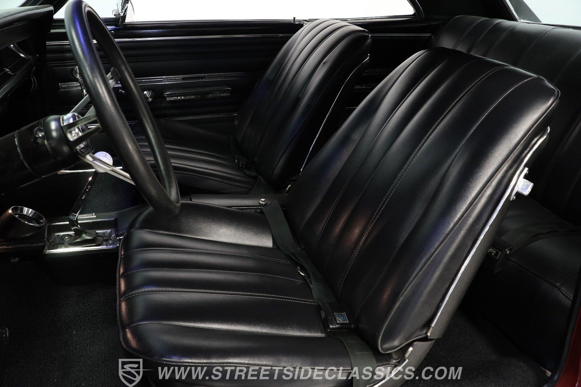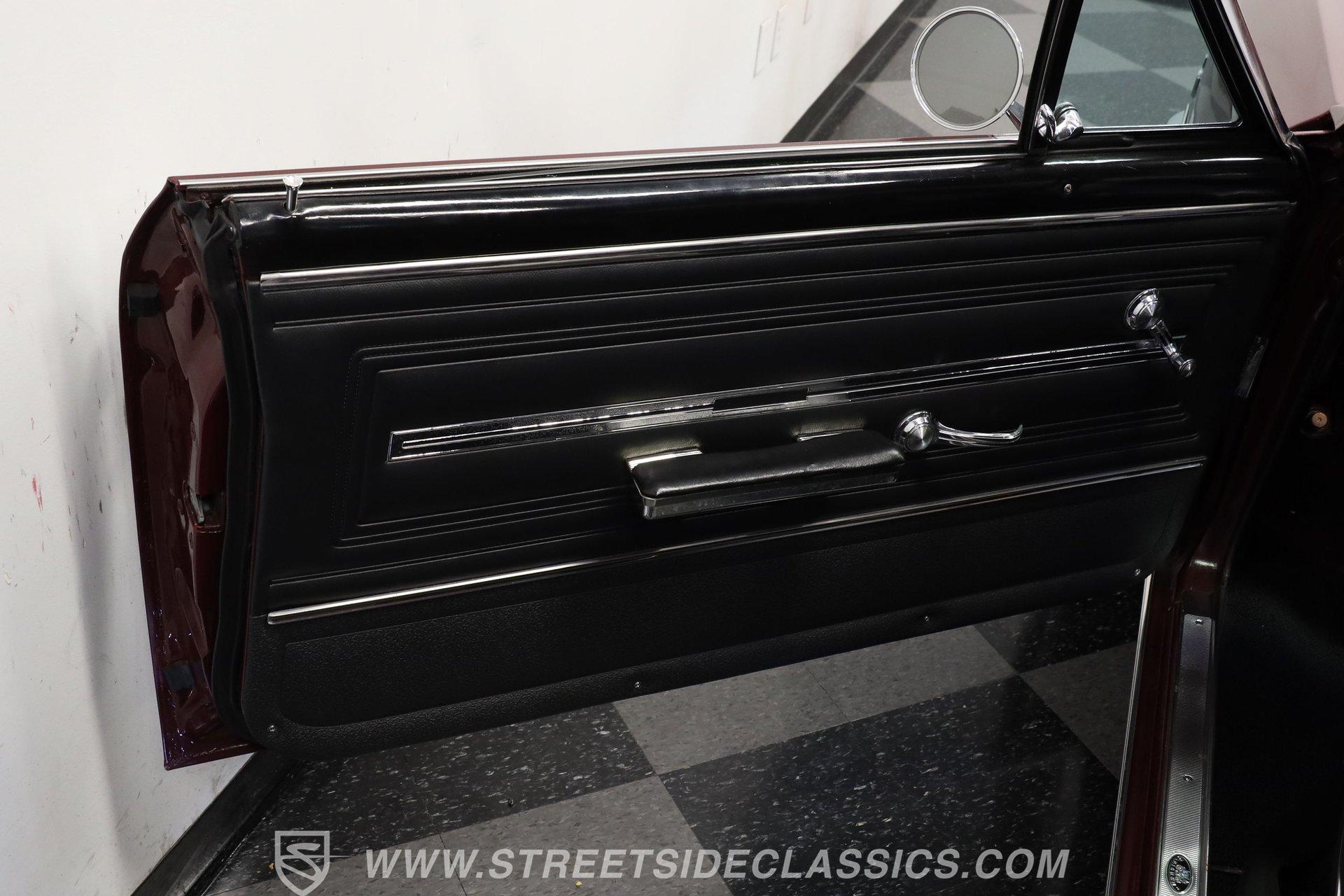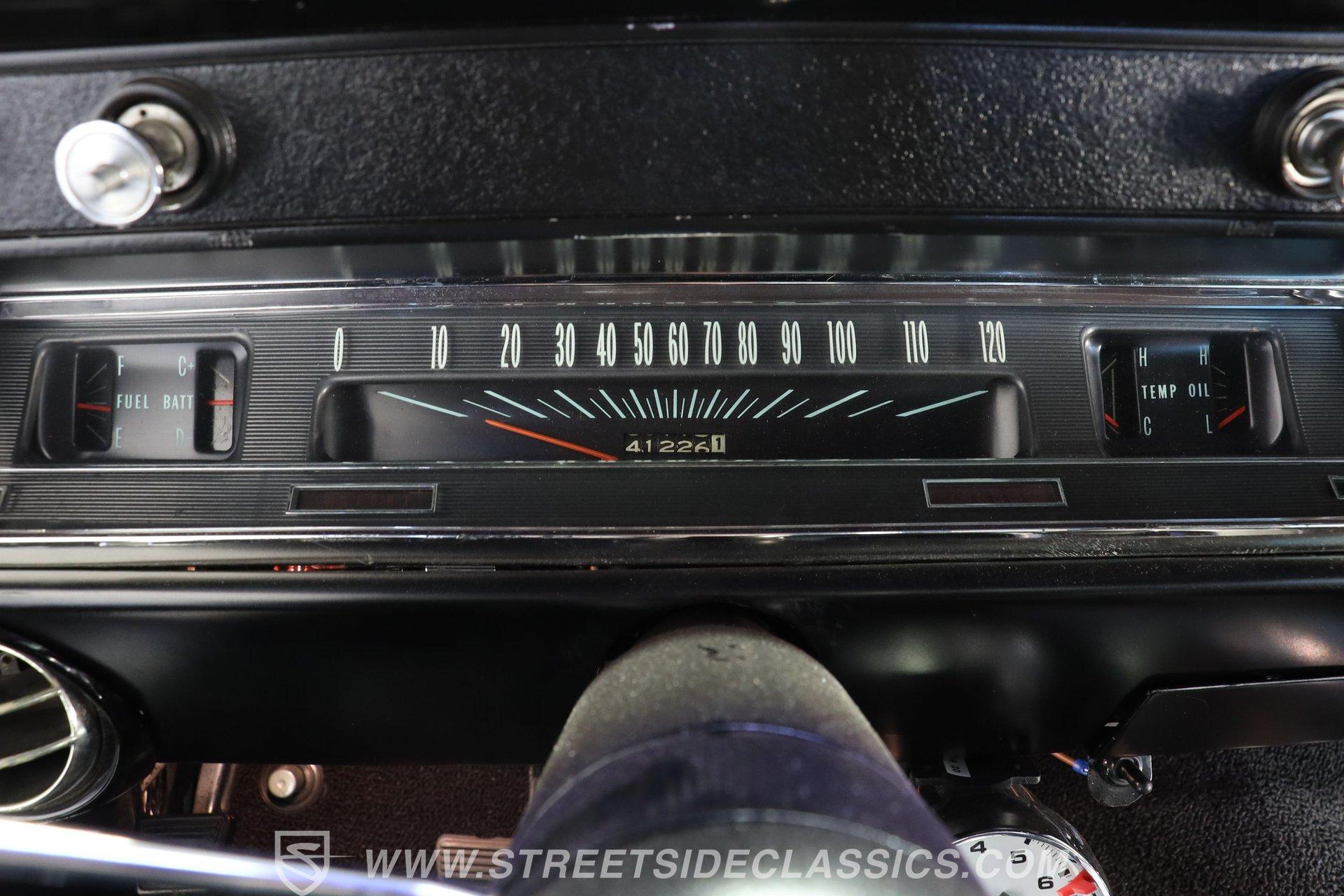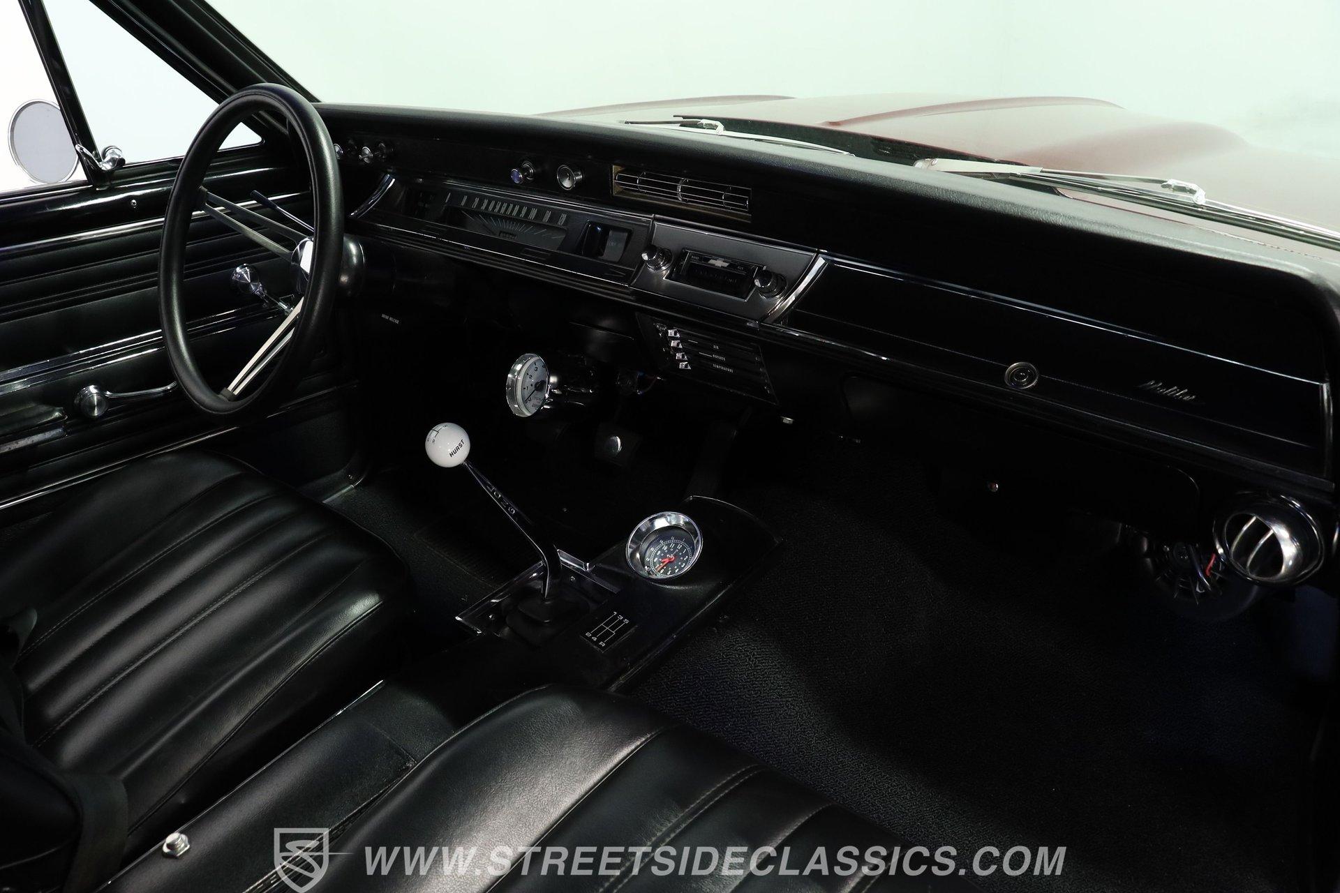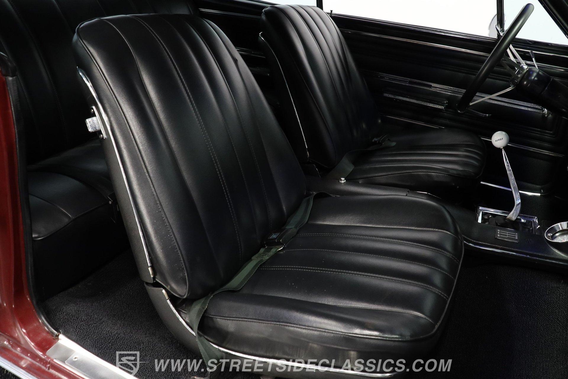 Step inside and discover a cabin that balances vintage style with comfort. The black vinyl seats are in excellent condition, inviting you to settle in for the ride. Both the door panels and headliner look fresh and crisp, while the dashboard maintains its classic appeal with only the most subtle signs of age. The center console features a chrome Hurst shifter, and a retro sound radio with modern touches ensures you enjoy every mile with your favorite tunes. An aftermarket tachometer sits neatly under the dash, ready for spirited drives.