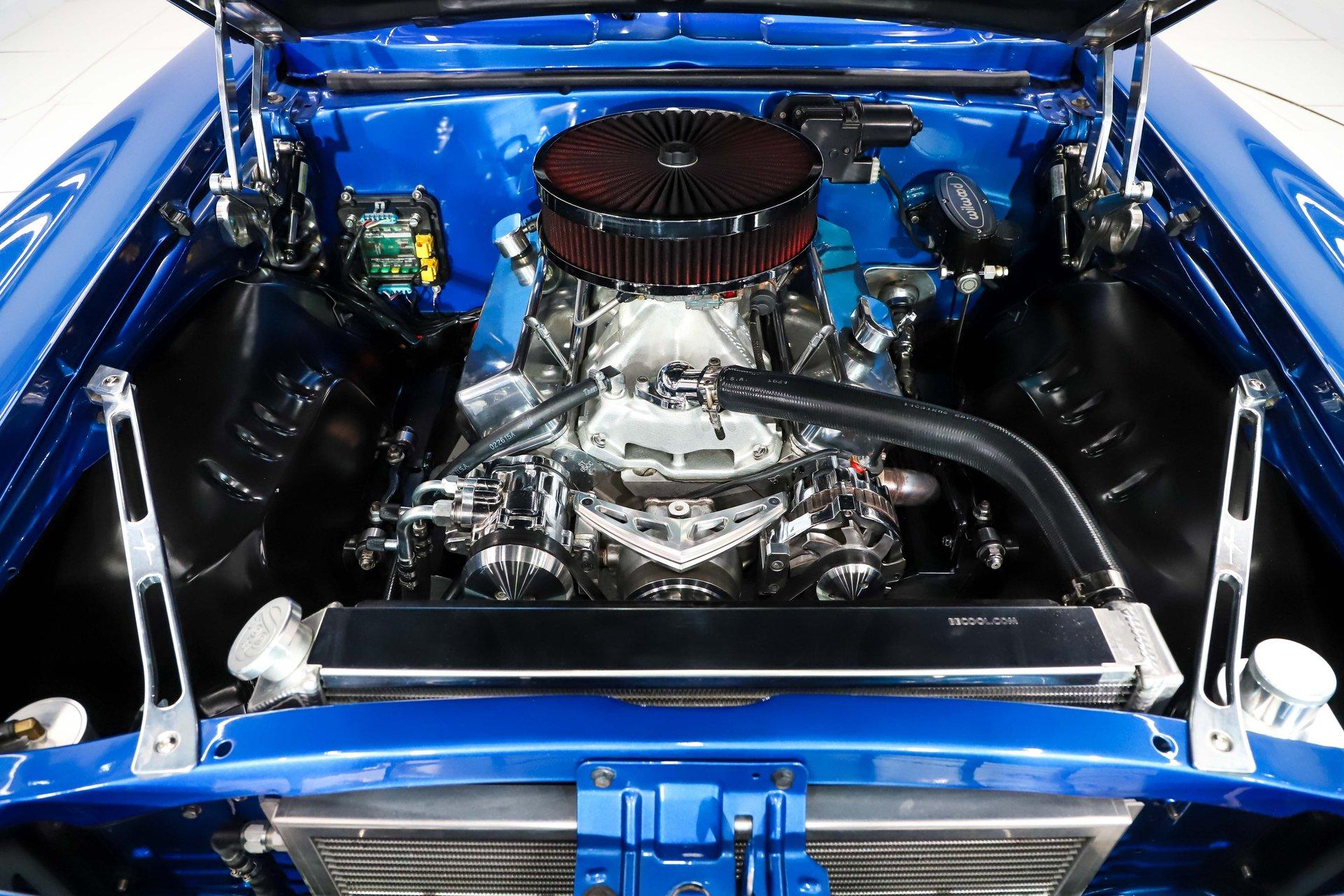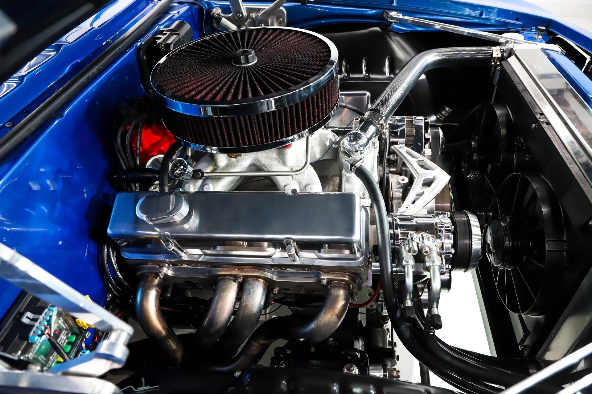 ENGINE COMPARTMENT: Power comes from a MAS Performance 427 cubic-inch crate small-block producing an impressive 600 horsepower and 580 lb-ft of torque (over $11,000 invested). Built on a World aluminum block, it's packed with premium internals including an Eagle stroker crank, Eagle rods, Mahle pistons, and a custom roller cam. Airflow is handled by AFR aluminum heads topped with an Edelbrock intake and a Quick Fuel 850 carburetor, while an MSD ignition system ensures strong, reliable spark. Custom headers complete the performance package. The engine bay itself is fully detailed and show-ready. The firewall has been smoothed and painted to match the exterior, complemented by billet hood hinges and fender supports. The front of the engine is dressed with March billet brackets and pulleys driving a serpentine belt system, along with a polished A/C compressor, alternator, and modern power steering unit. Braking is upgraded with a Wilwood master cylinder. Cooling is handled by a Be Cool aluminum radiator with dual electric fans and a polished overflow tank. Additional refinements include a Selecta-Speed wiper system and extensive polished components throughout, resulting in an engine compartment that is as visually striking as it is powerful.