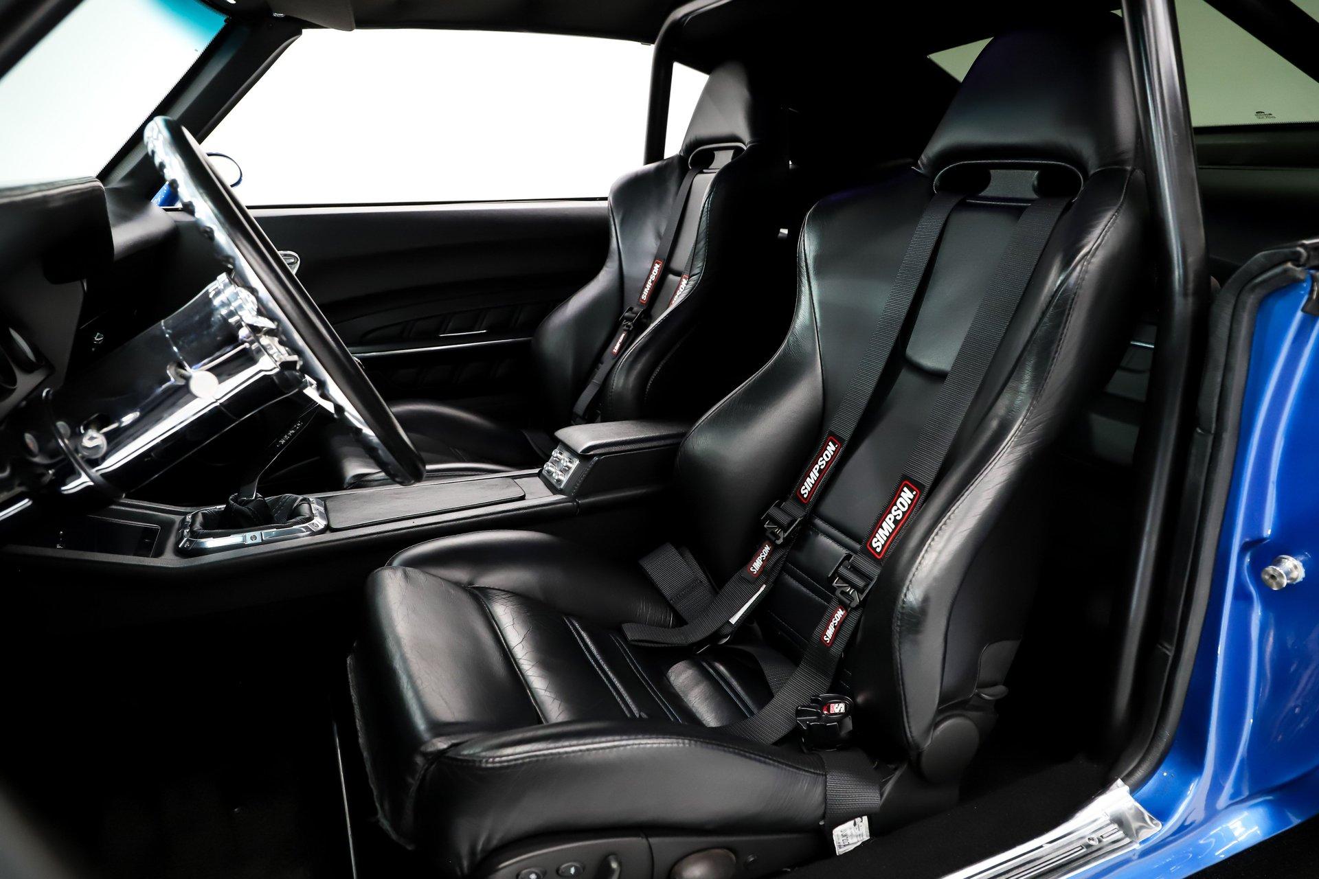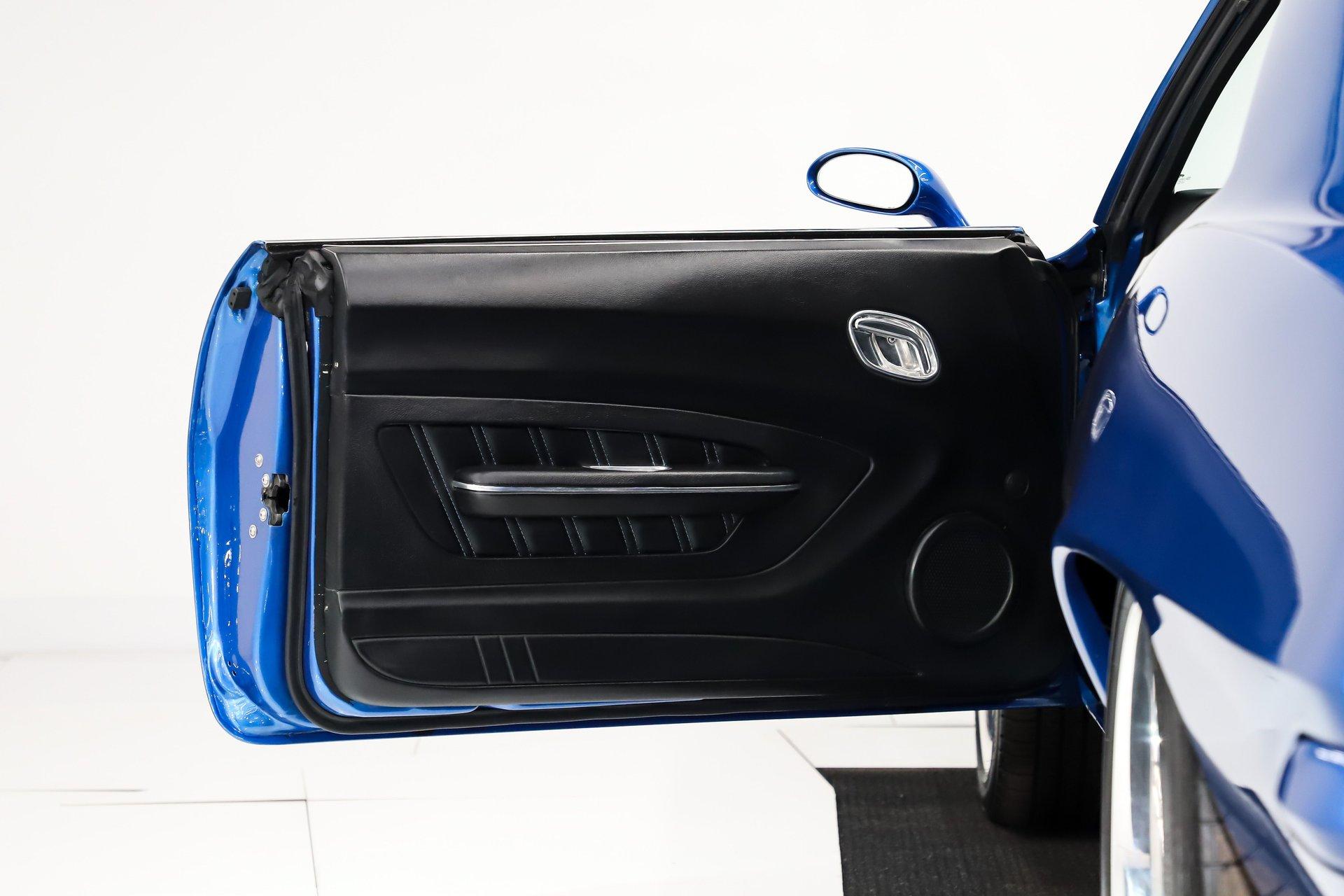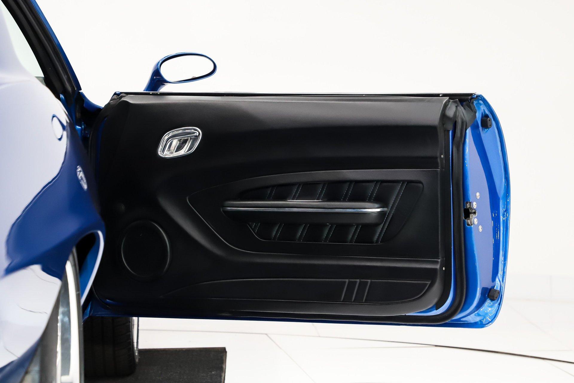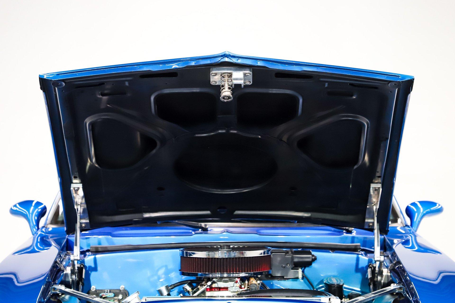 EXTERIOR: This car features subtle yet extensive body modifications that create an exceptionally clean, modernized appearance while preserving its classic lines. Seams have been filled and smoothed, while exterior trim, marker lights, and emblems were removed for an uninterrupted, streamlined look. The rain gutters have been shaved, door handles eliminated in favor of remote entry, and the rear lower corners of the doors rounded for a softer, more refined profile. Both bumpers have been smoothed and tucked tightly to the body, the cowl vent has been filled, and even the jambs have been finished smooth - details that reflect a tremendous amount of craftsmanship. Custom mirrors, a cowl hood, and a rear spoiler add just the right amount of attitude. The stunning custom-mixed blue pearl paint is polished to a mirror finish and comes with the documented paint formula. All glass has been replaced with flush-mounted smoked pieces, further enhancing the sleek appearance. The stance is dramatic thanks to highly polished, staggered Budnik wheels wrapped in Michelin Pilot Sport tires - 18×8 up front and an enormous 20×12 in the rear. Modern lighting upgrades complete the package, including electric headlight doors that open and close quickly, Halo running lights in the lower valance, and LED sequential taillights housed in billet bezels for a contemporary finishing touch. Subtle but extensive body modifications.