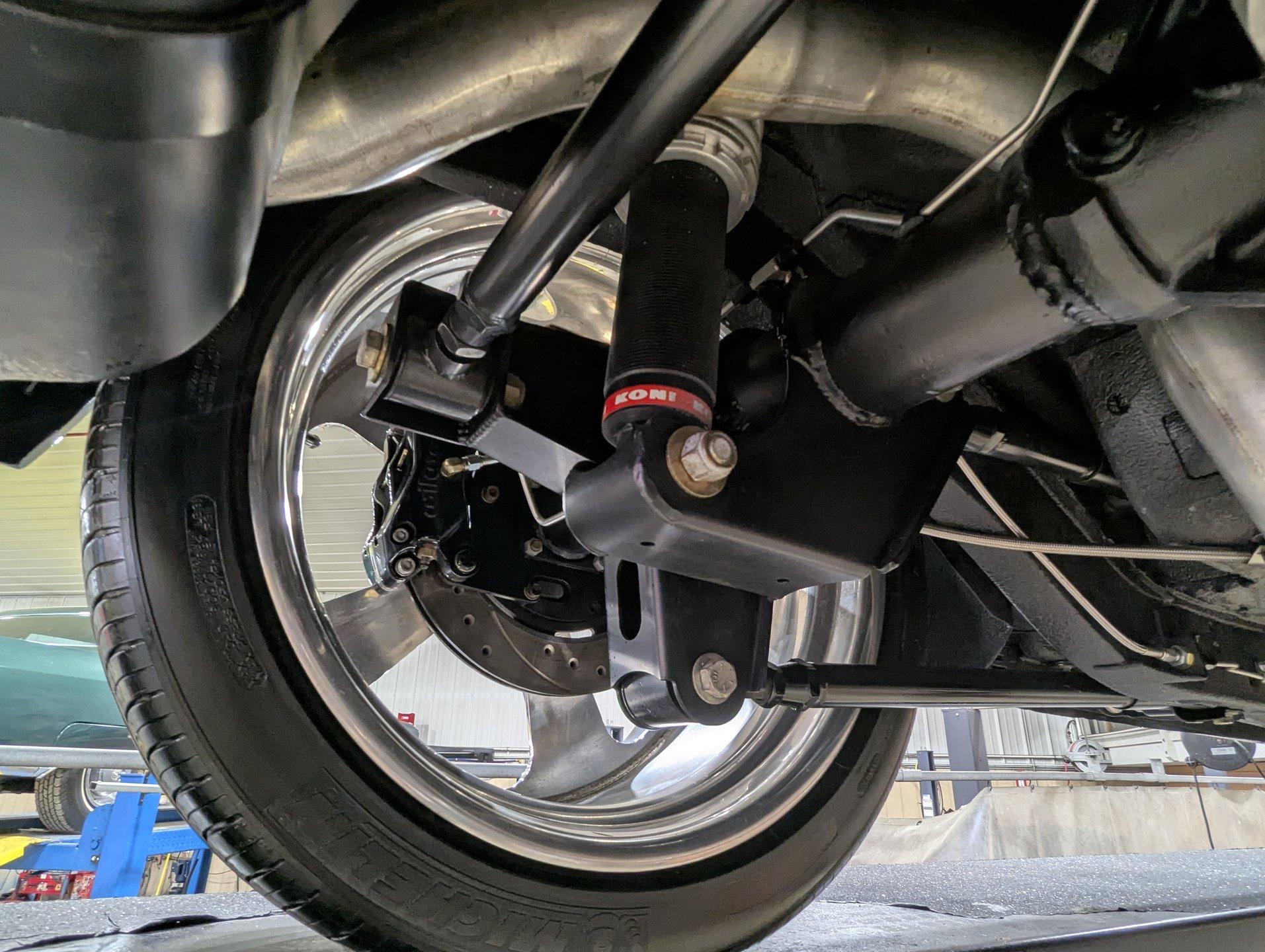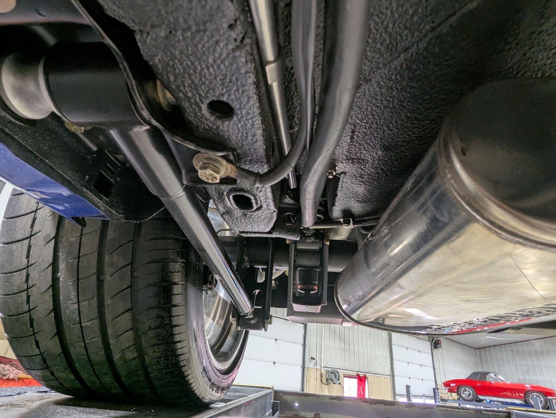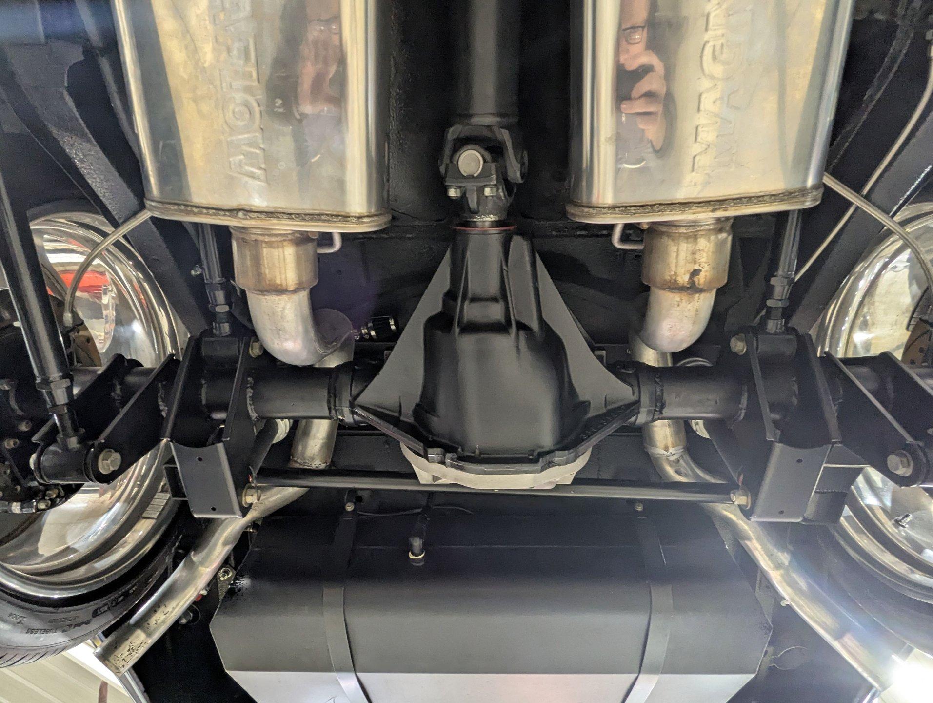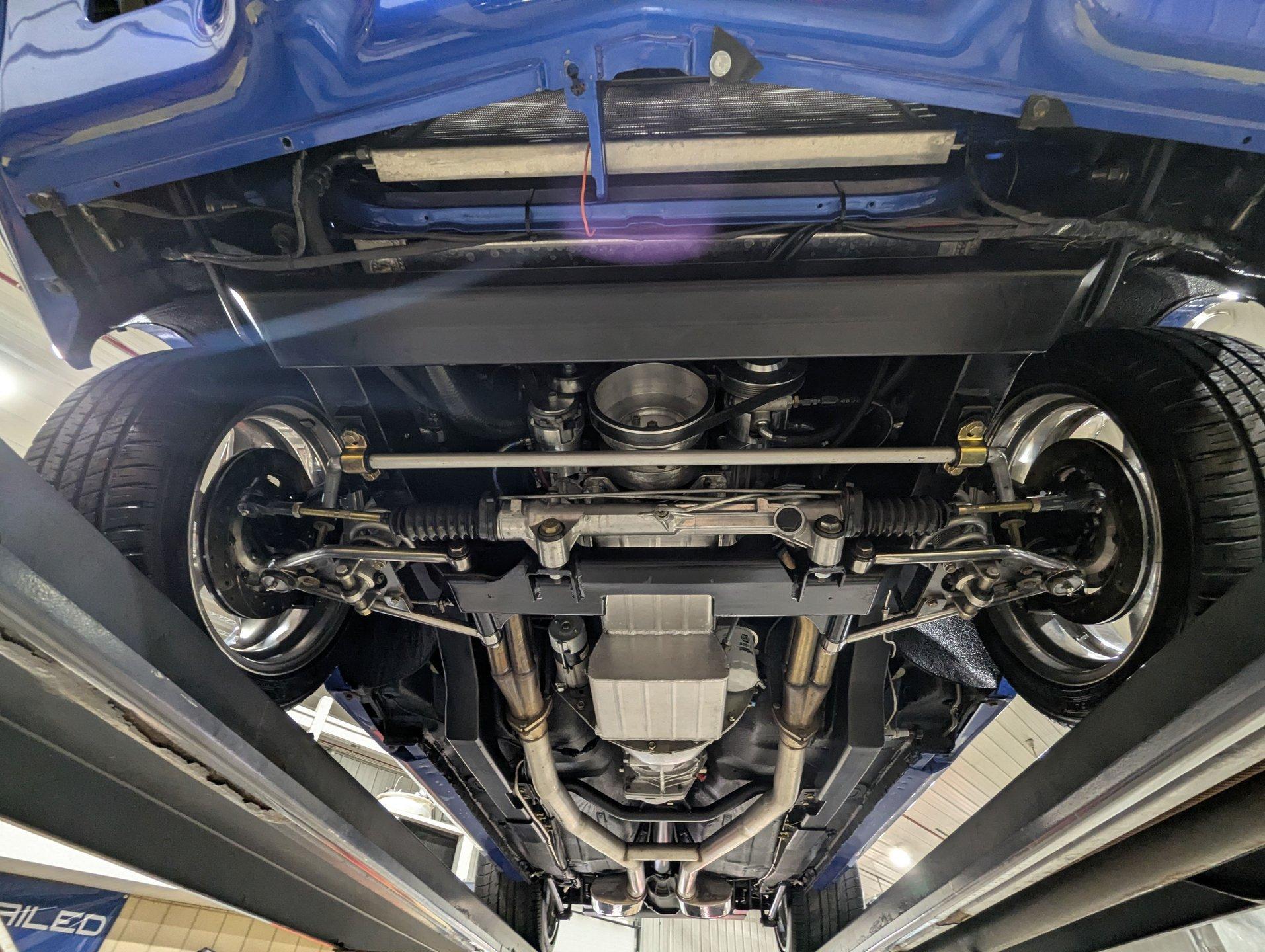 UNDERSIDE: This Camaro is built for both performance and precision, starting with a new Tremec TKO600 5-speed transmission, mounted on a TKO crossmember, with a McLeod flywheel and hydraulic dual-disc clutch. Power flows through a 3-inch driveshaft with custom u-joints to a Diffworks 12-bolt rear end featuring a 3.73 Positraction gearset and aluminum cover. The fuel system is fully custom, including a narrowed stainless fuel tank, while remote battery terminals add convenience. The suspension is fully modernized and highly adjustable. Up front, a Fatman subframe houses tubular control arms and QA1 gas-adjustable shocks, paired with precise rack-and-pinion steering. Out back, a Detroit Speed Quadralink setup uses Koni coil-over gas shocks, relocated upper and lower tubular control arms, and mini-tubs to accommodate the super-wide rear tires. The front and rear are tied together with Detroit Speed frame connectors, countersunk into the floors and fully welded for rigidity, and the frame rails have been modified for the wide stance. Stopping power is extreme with a premium custom brake system: up front, DynaPro 6-piston billet calipers clamp on 12-inch drilled and slotted rotors, while the rear features 4-piston calipers with matching drilled and slotted rotors. The exhaust is fully stainless with Magnaflow mufflers, completing a drivetrain and chassis setup that's built for serious performance and show-quality precision.