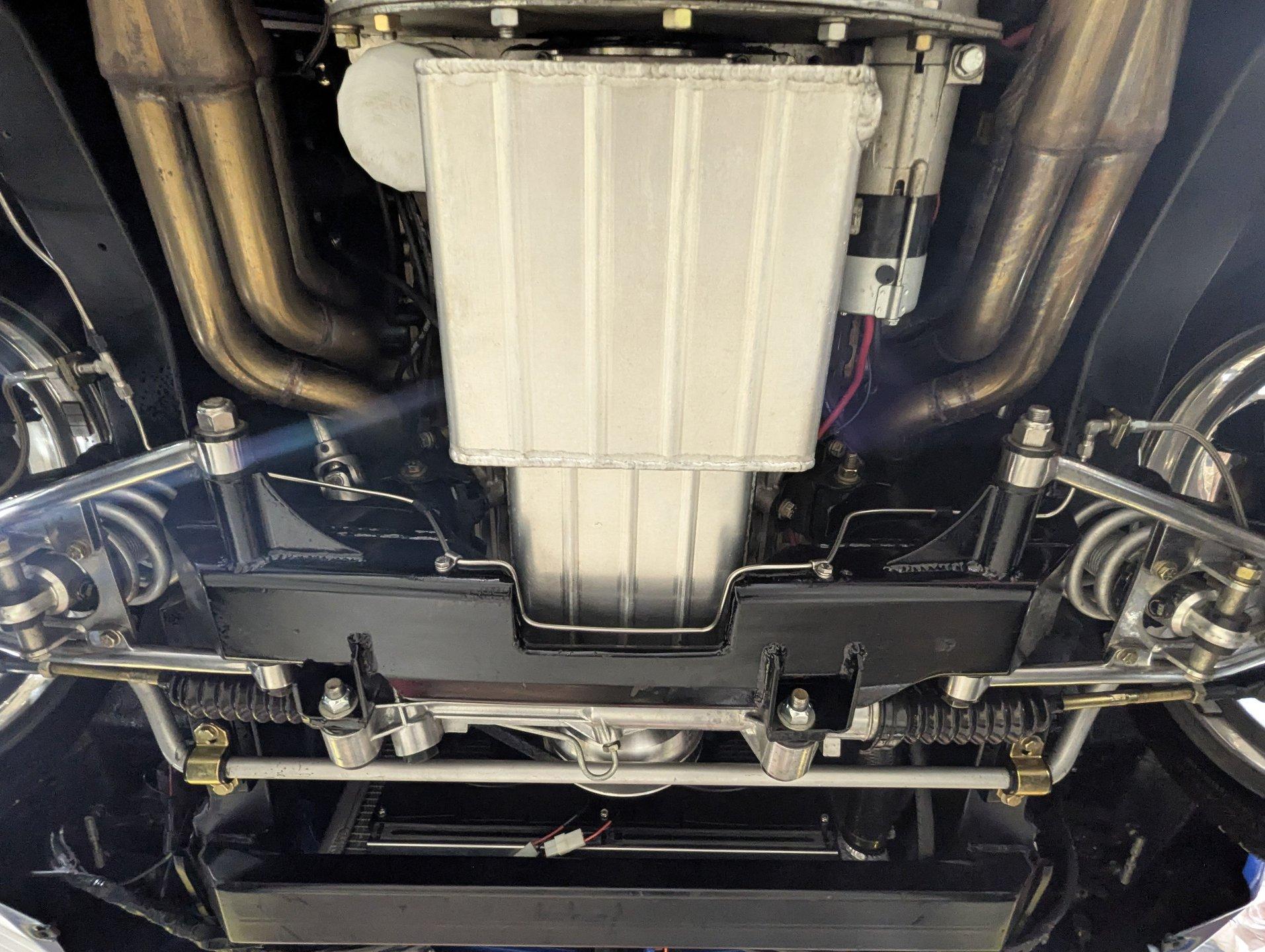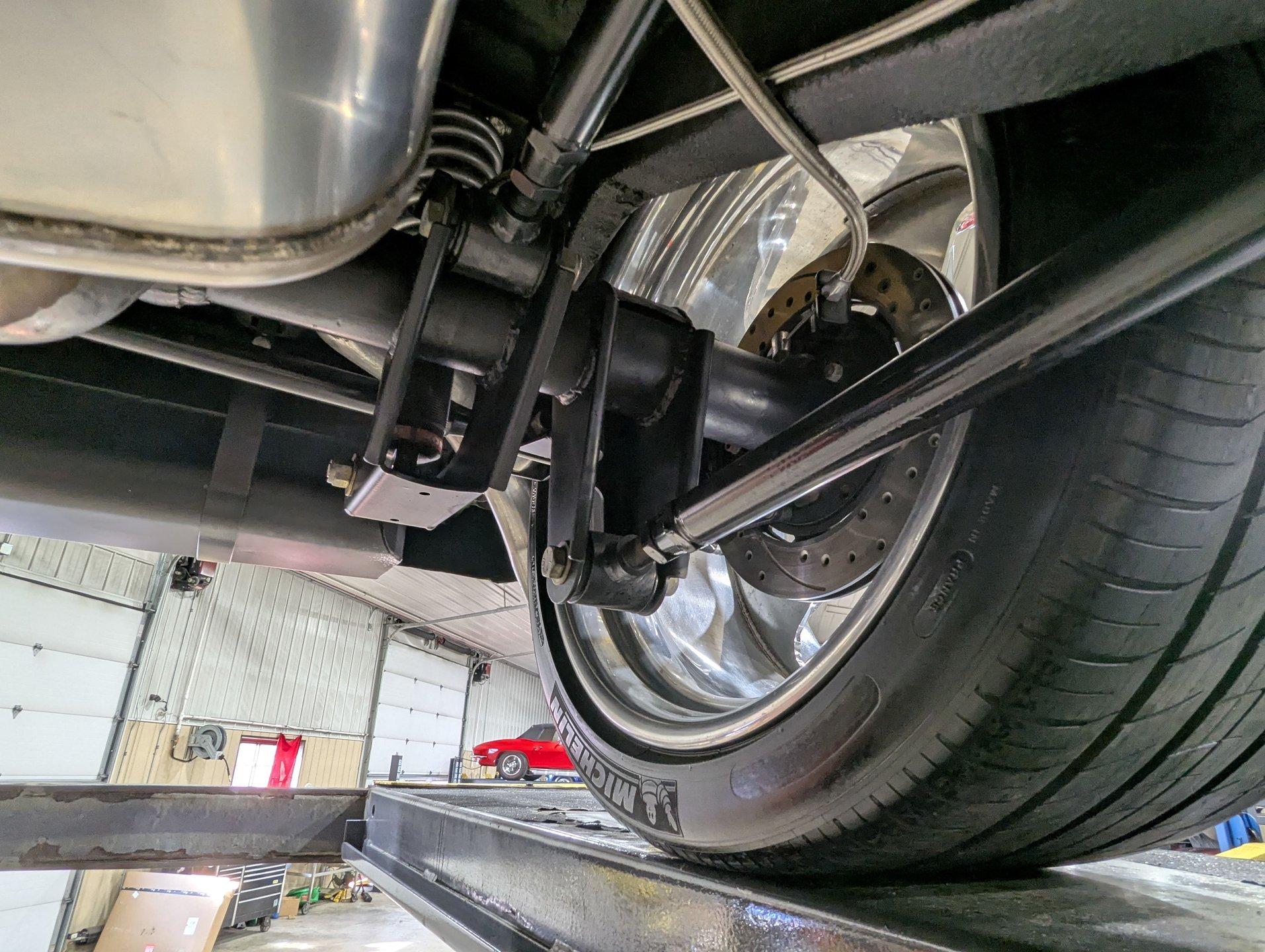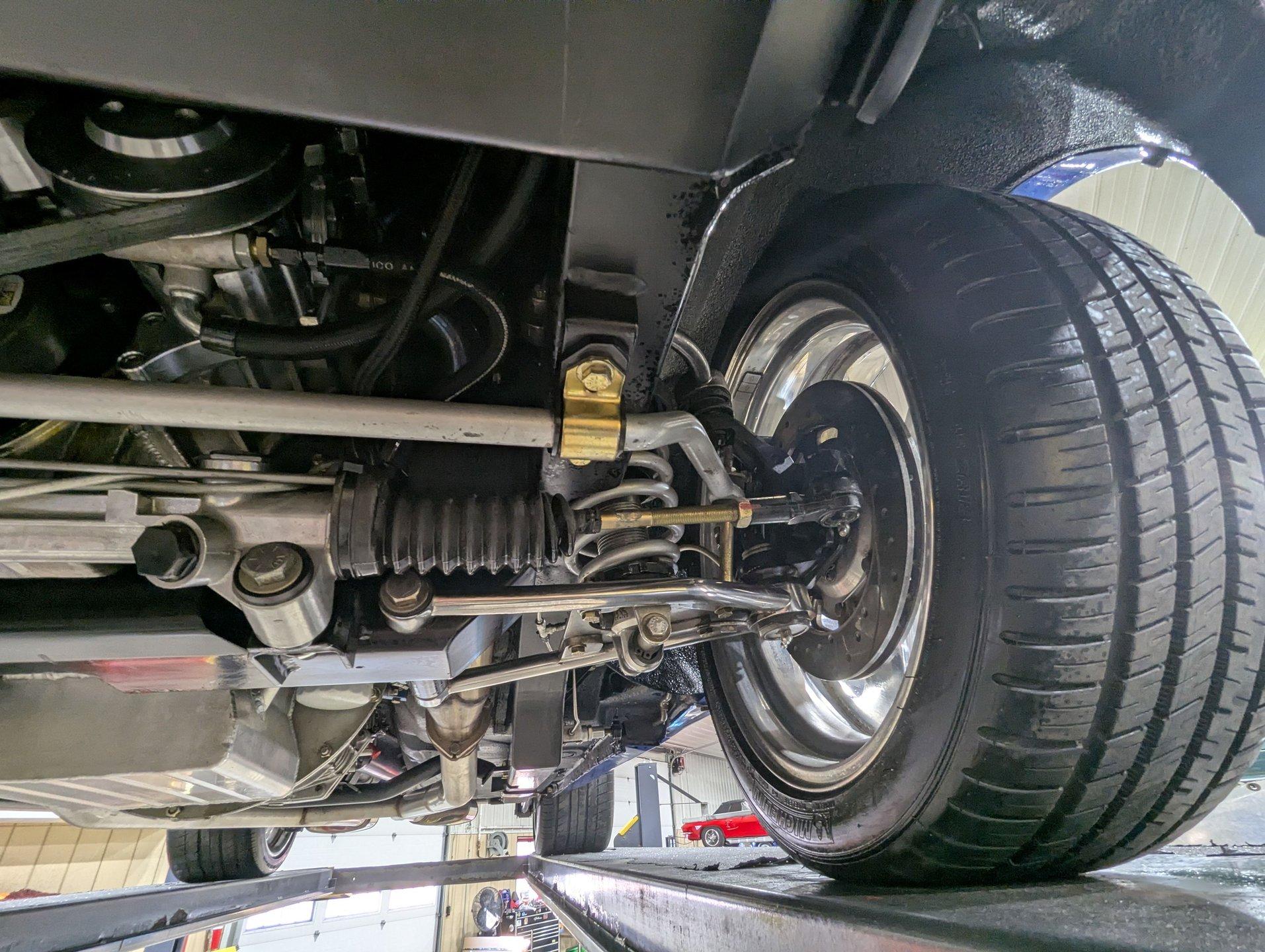 UNDERSIDE: This Camaro is built for both performance and precision, starting with a new Tremec TKO600 5-speed transmission, mounted on a TKO crossmember, with a McLeod flywheel and hydraulic dual-disc clutch. Power flows through a 3-inch driveshaft with custom u-joints to a Diffworks 12-bolt rear end featuring a 3.73 Positraction gearset and aluminum cover. The fuel system is fully custom, including a narrowed stainless fuel tank, while remote battery terminals add convenience. The suspension is fully modernized and highly adjustable. Up front, a Fatman subframe houses tubular control arms and QA1 gas-adjustable shocks, paired with precise rack-and-pinion steering. Out back, a Detroit Speed Quadralink setup uses Koni coil-over gas shocks, relocated upper and lower tubular control arms, and mini-tubs to accommodate the super-wide rear tires. The front and rear are tied together with Detroit Speed frame connectors, countersunk into the floors and fully welded for rigidity, and the frame rails have been modified for the wide stance. Stopping power is extreme with a premium custom brake system: up front, DynaPro 6-piston billet calipers clamp on 12-inch drilled and slotted rotors, while the rear features 4-piston calipers with matching drilled and slotted rotors. The exhaust is fully stainless with Magnaflow mufflers, completing a drivetrain and chassis setup that's built for serious performance and show-quality precision.