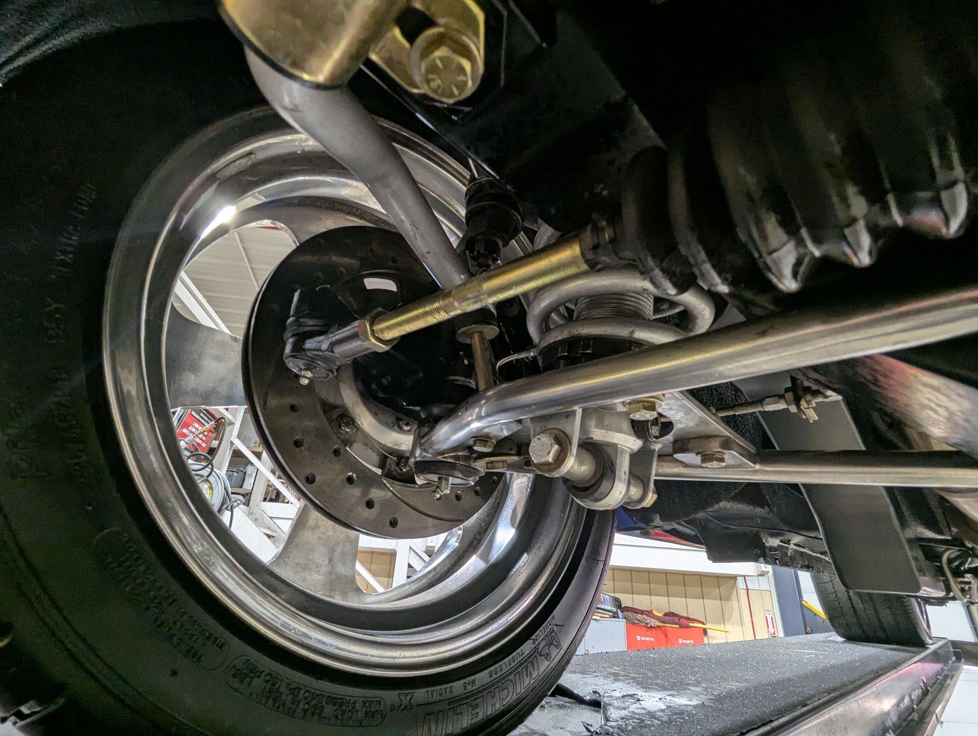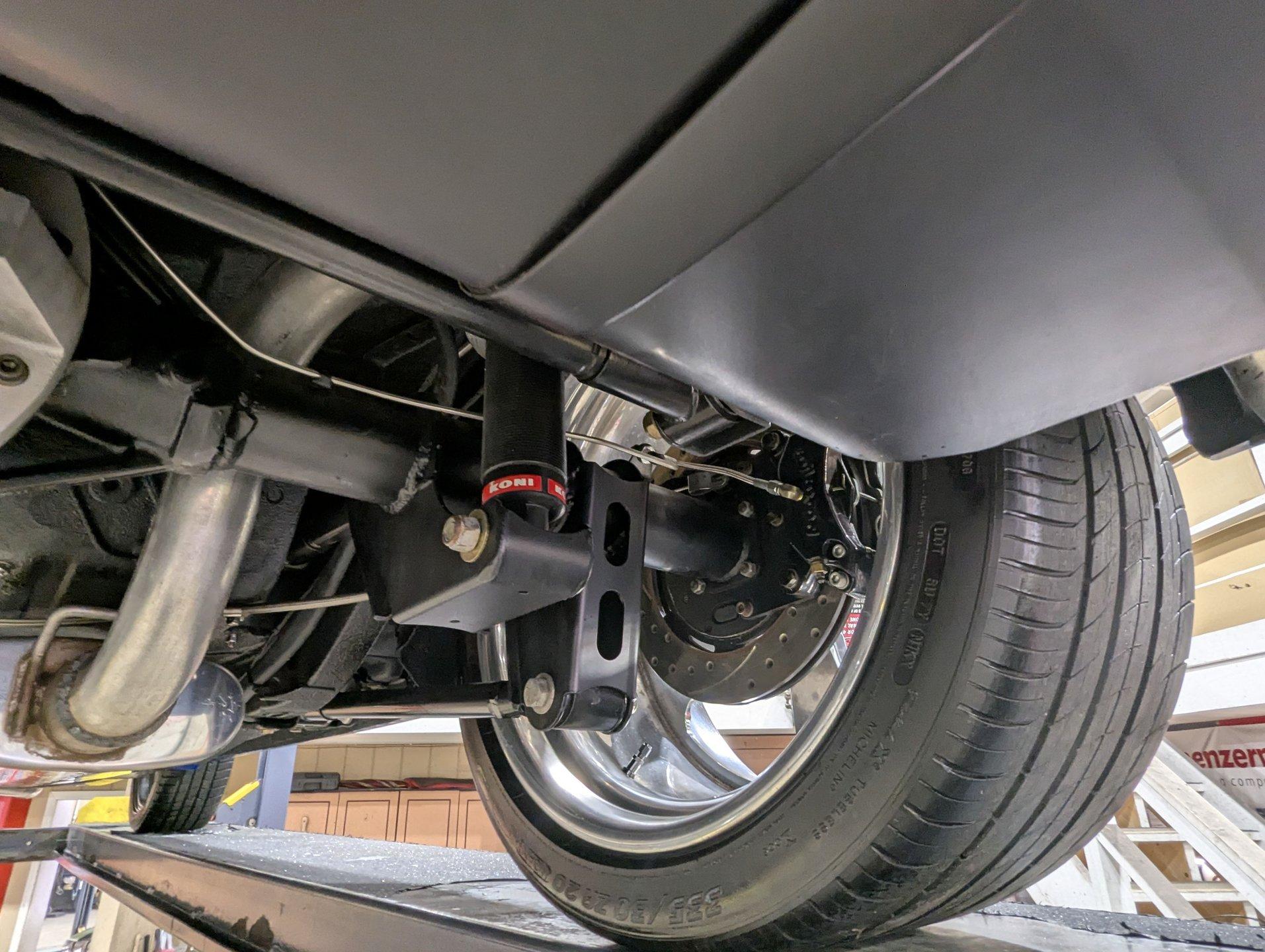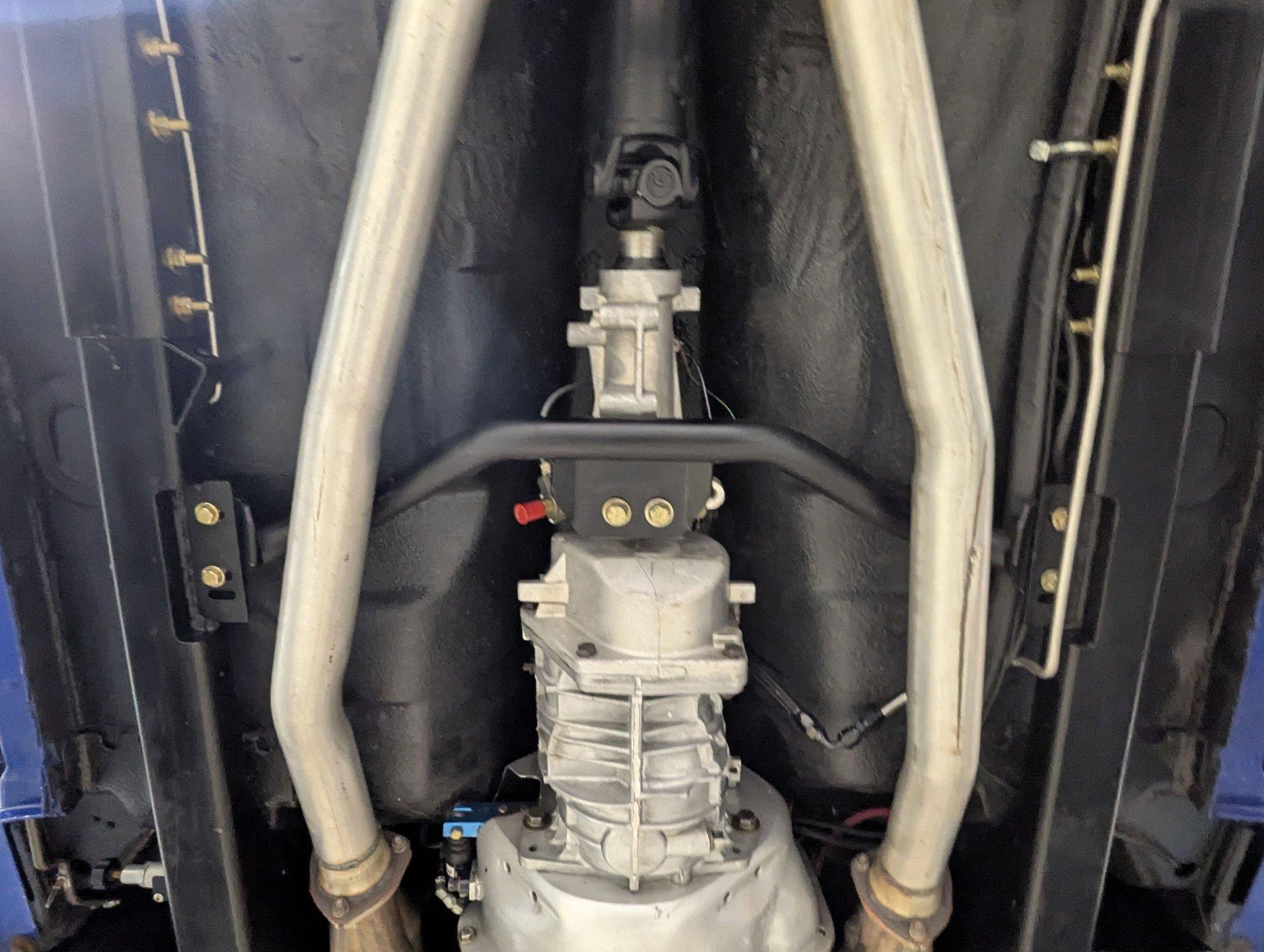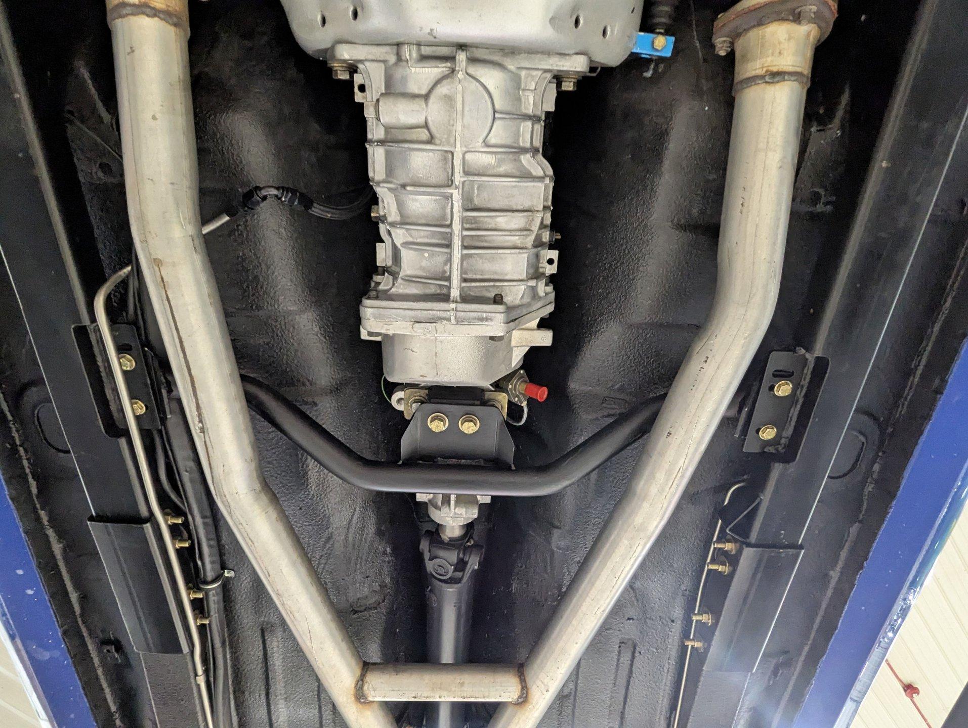 UNDERSIDE: This Camaro is built for both performance and precision, starting with a new Tremec TKO600 5-speed transmission, mounted on a TKO crossmember, with a McLeod flywheel and hydraulic dual-disc clutch. Power flows through a 3-inch driveshaft with custom u-joints to a Diffworks 12-bolt rear end featuring a 3.73 Positraction gearset and aluminum cover. The fuel system is fully custom, including a narrowed stainless fuel tank, while remote battery terminals add convenience. The suspension is fully modernized and highly adjustable. Up front, a Fatman subframe houses tubular control arms and QA1 gas-adjustable shocks, paired with precise rack-and-pinion steering. Out back, a Detroit Speed Quadralink setup uses Koni coil-over gas shocks, relocated upper and lower tubular control arms, and mini-tubs to accommodate the super-wide rear tires. The front and rear are tied together with Detroit Speed frame connectors, countersunk into the floors and fully welded for rigidity, and the frame rails have been modified for the wide stance. Stopping power is extreme with a premium custom brake system: up front, DynaPro 6-piston billet calipers clamp on 12-inch drilled and slotted rotors, while the rear features 4-piston calipers with matching drilled and slotted rotors. The exhaust is fully stainless with Magnaflow mufflers, completing a drivetrain and chassis setup that's built for serious performance and show-quality precision.