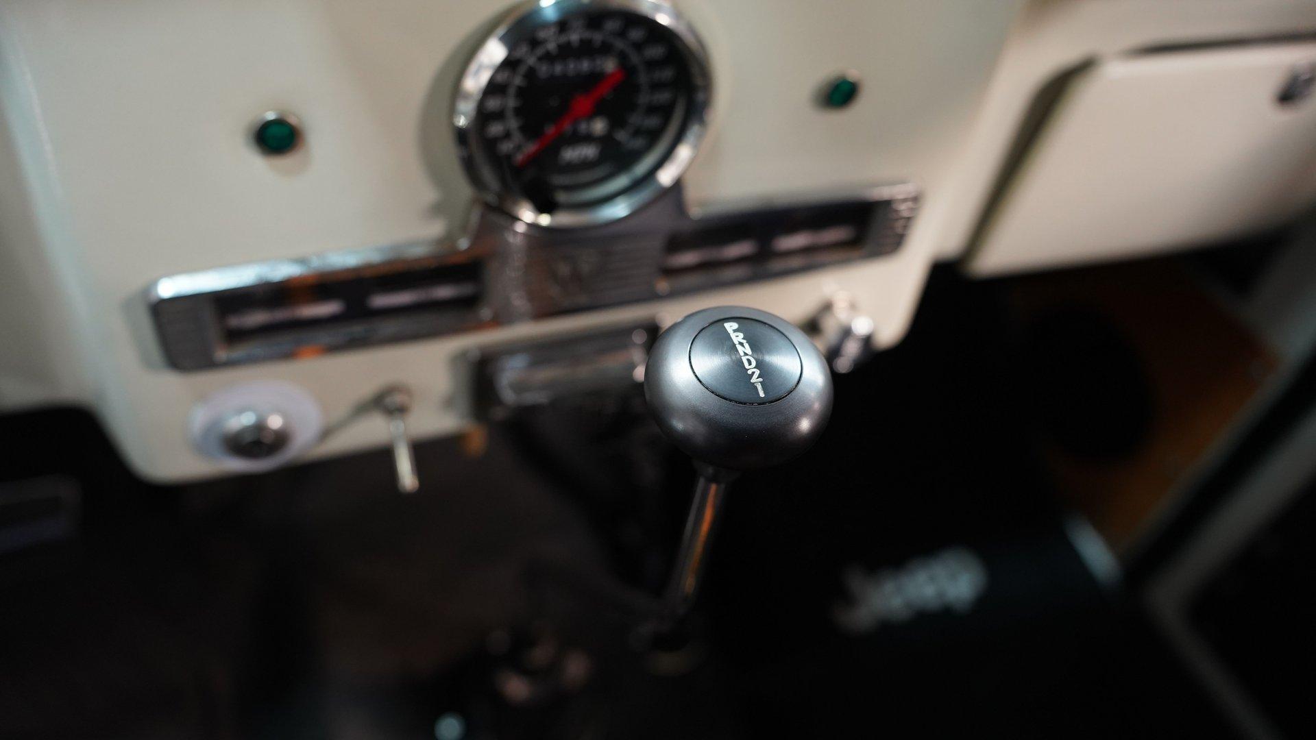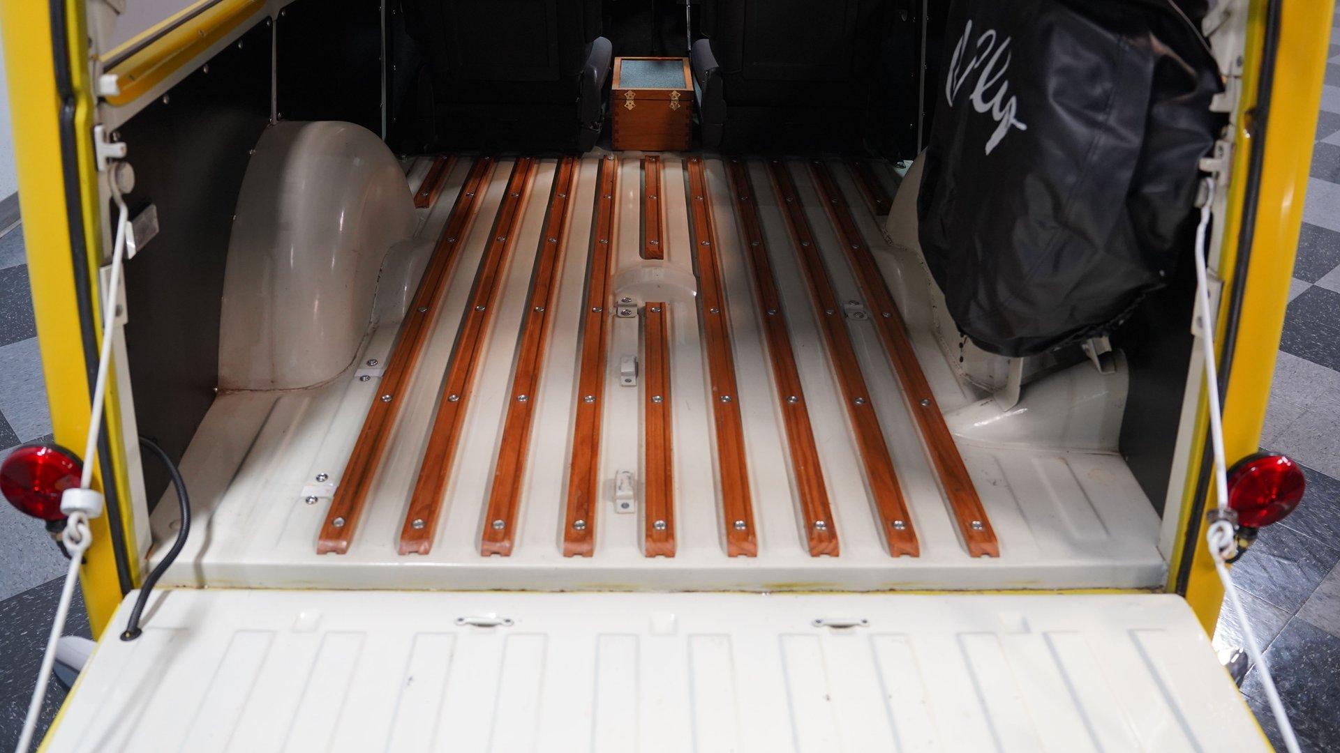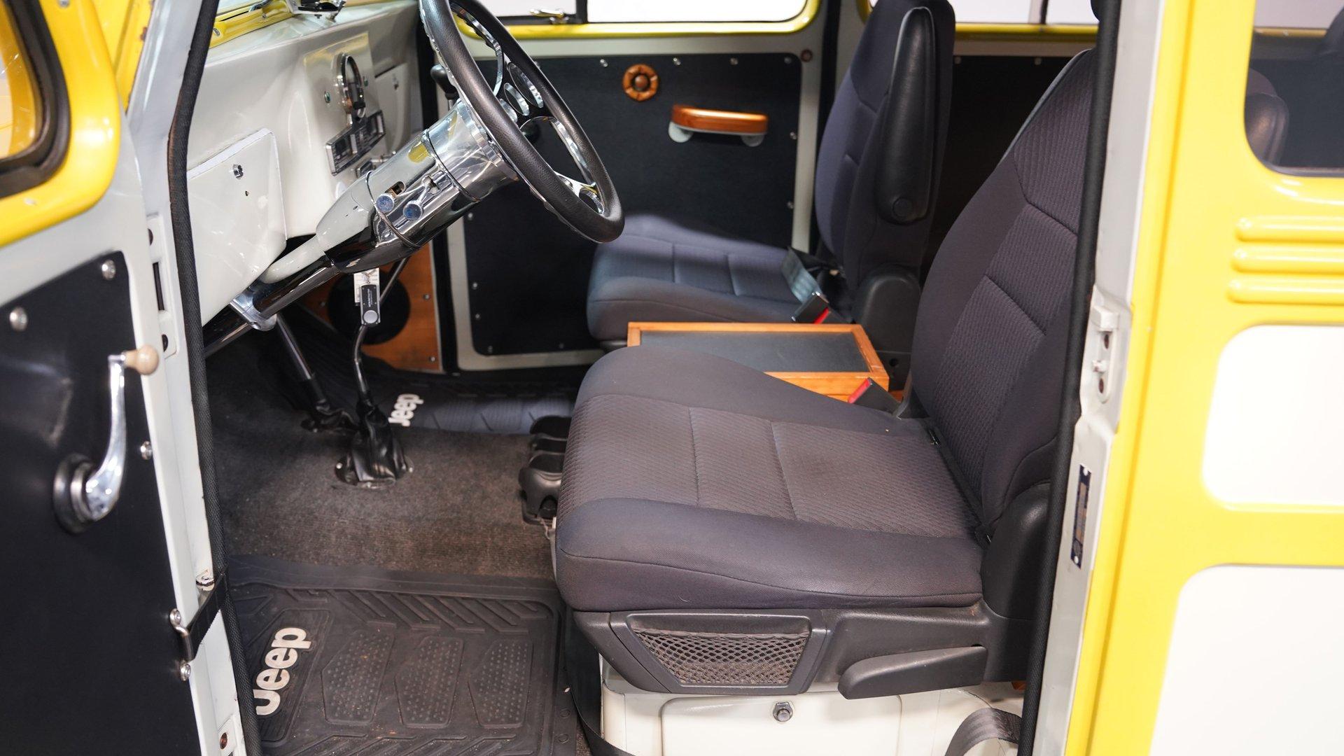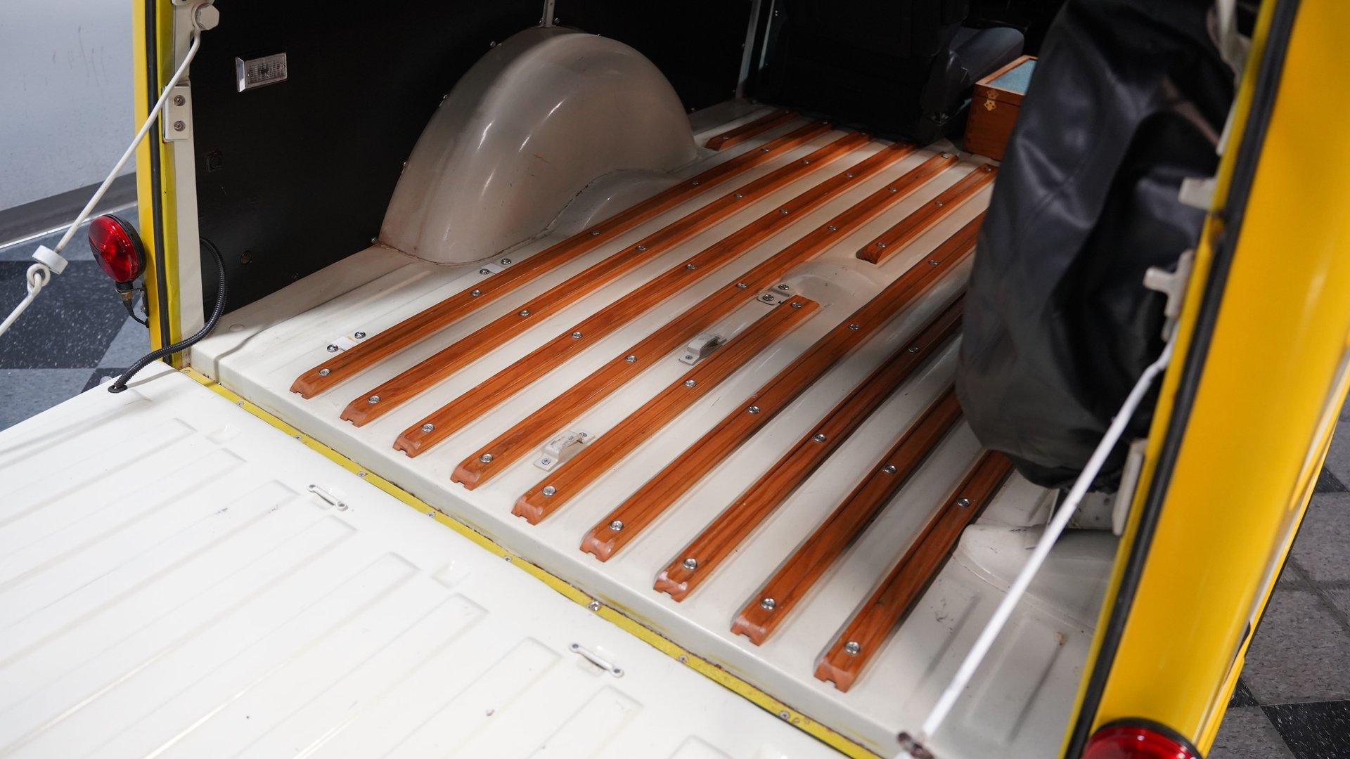 The white and black cabin offers a utilitarian edge with enough upgrades to handle long treks and weekend hauls. Modern bucket seats flank a custom center console, while the polished wood rear flooring brings in a touch of vintage cabin craftsmanship. A tilt steering column with a custom wheel gives the driver a confident grip, and an RPM tach keeps things in check. The AM/FM stereo includes CD, AUX, and USB hookups, ideal for keeping the soundtrack rolling whether you're on pavement or gravel.