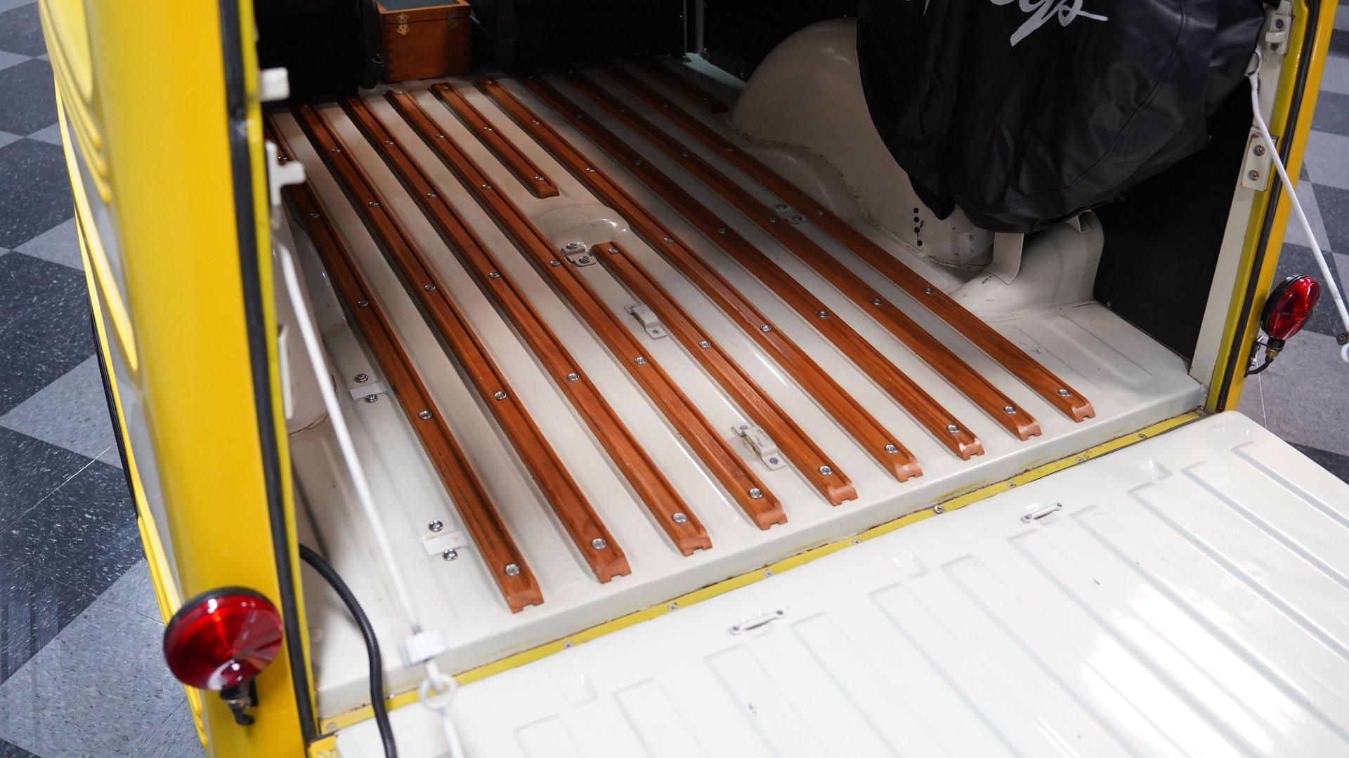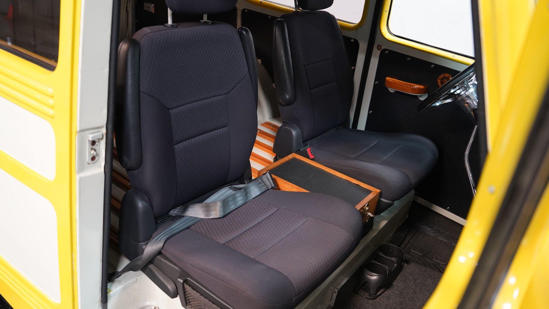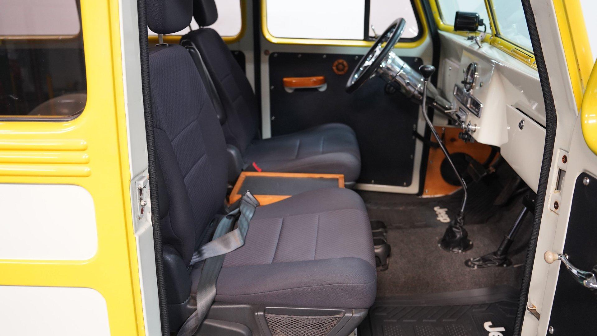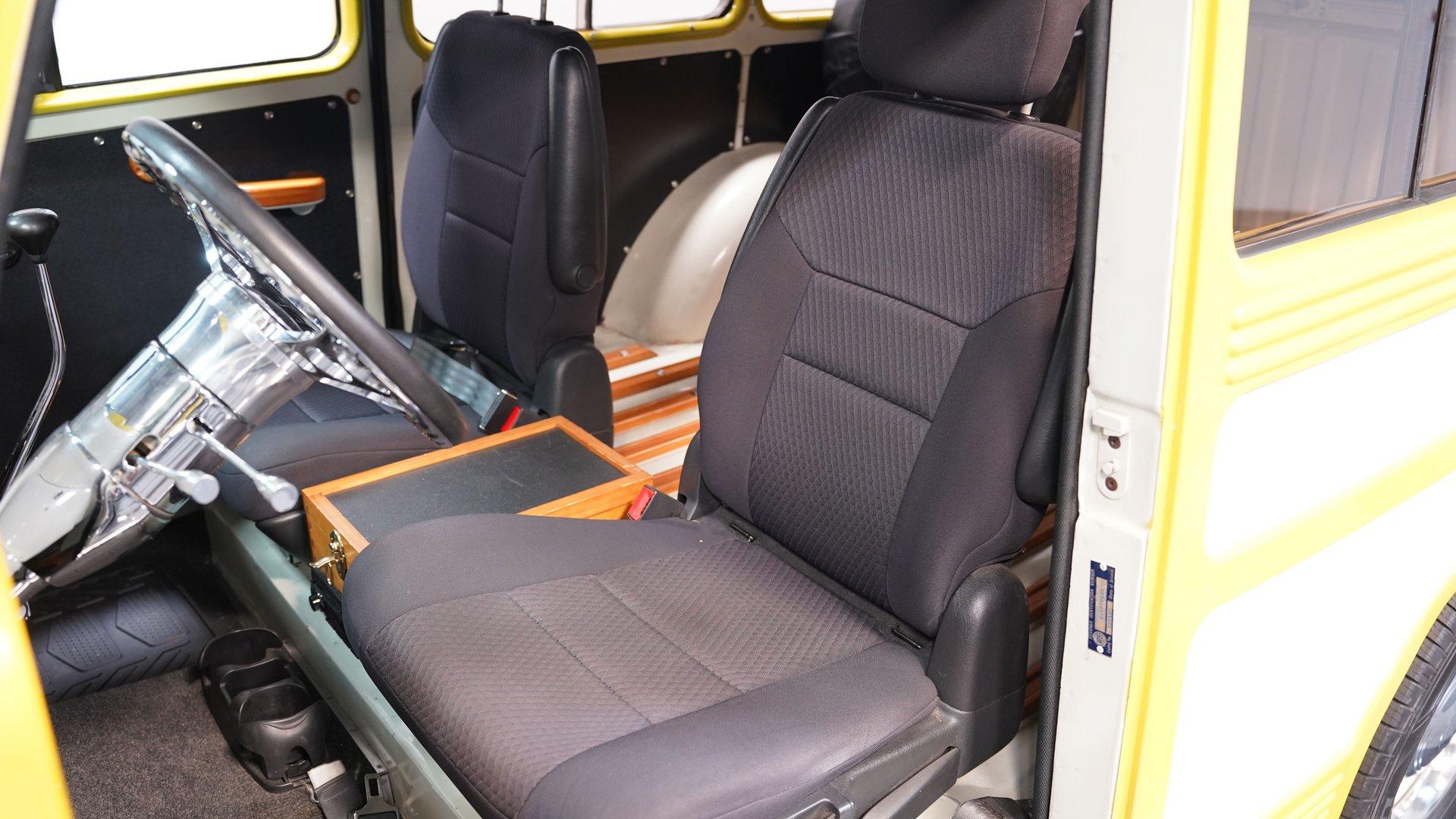 The white and black cabin offers a utilitarian edge with enough upgrades to handle long treks and weekend hauls. Modern bucket seats flank a custom center console, while the polished wood rear flooring brings in a touch of vintage cabin craftsmanship. A tilt steering column with a custom wheel gives the driver a confident grip, and an RPM tach keeps things in check. The AM/FM stereo includes CD, AUX, and USB hookups, ideal for keeping the soundtrack rolling whether you're on pavement or gravel.